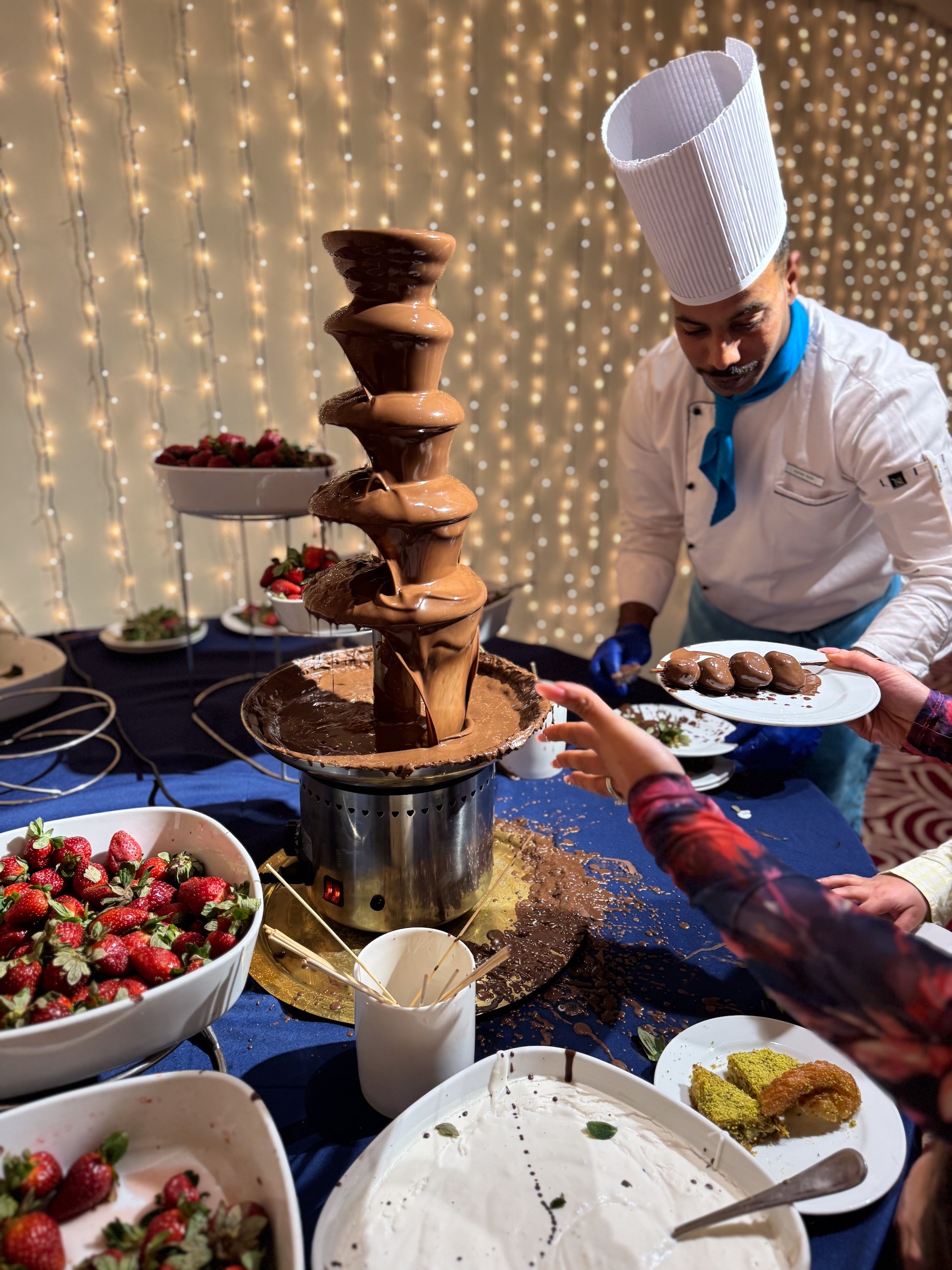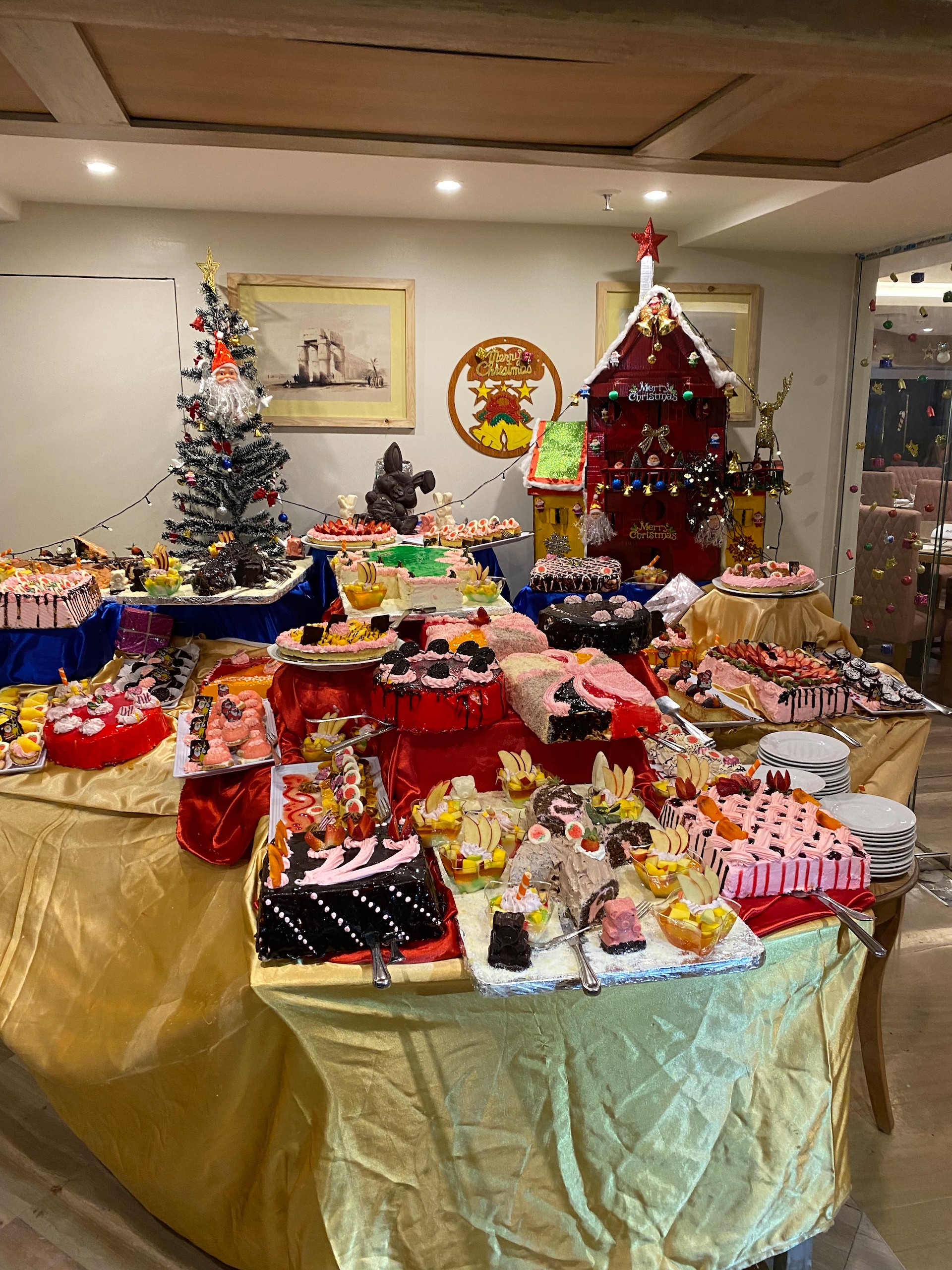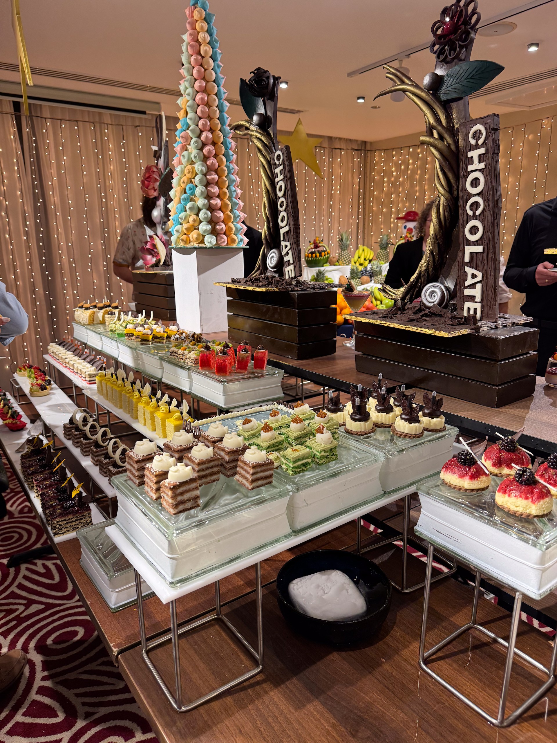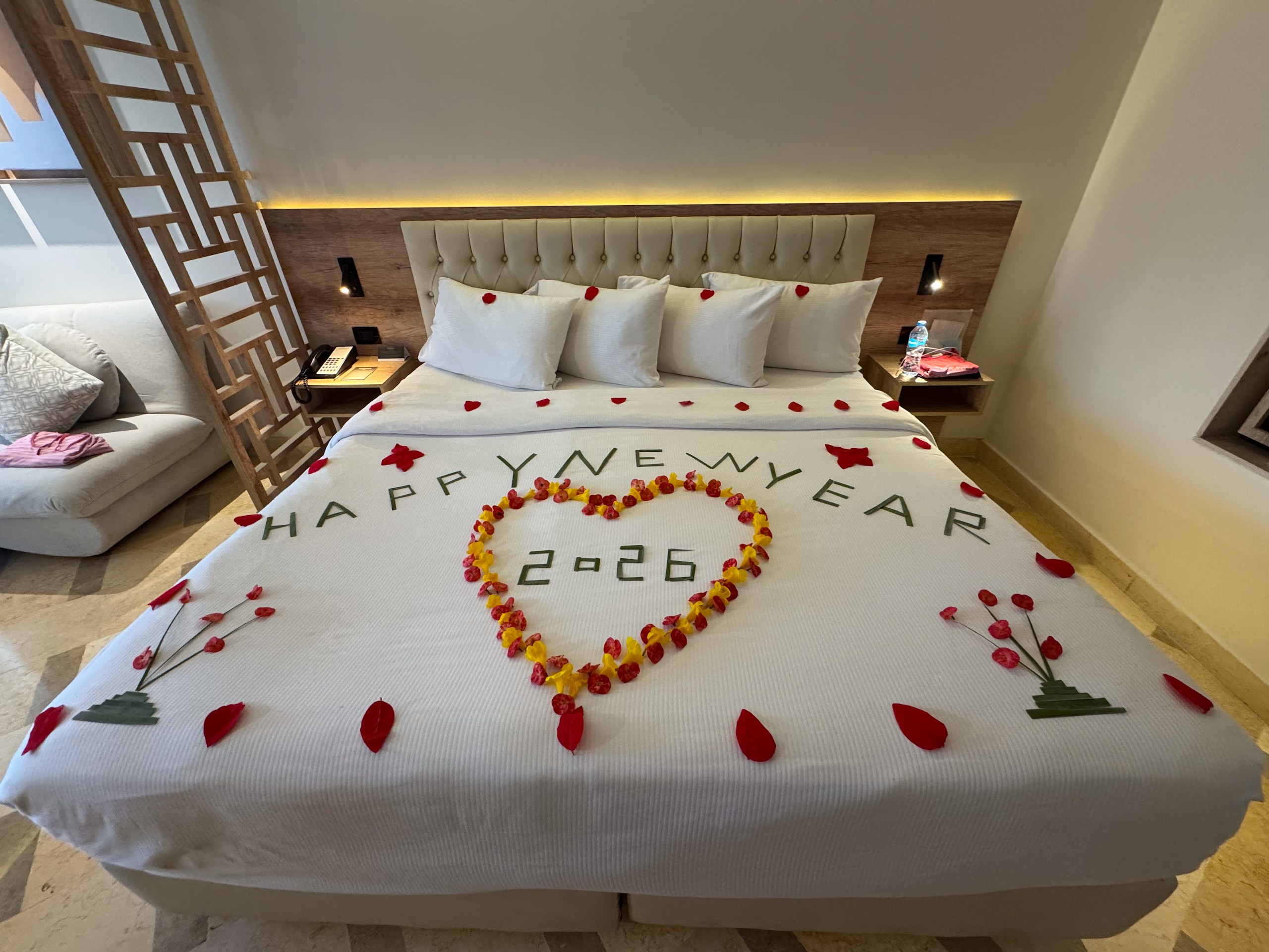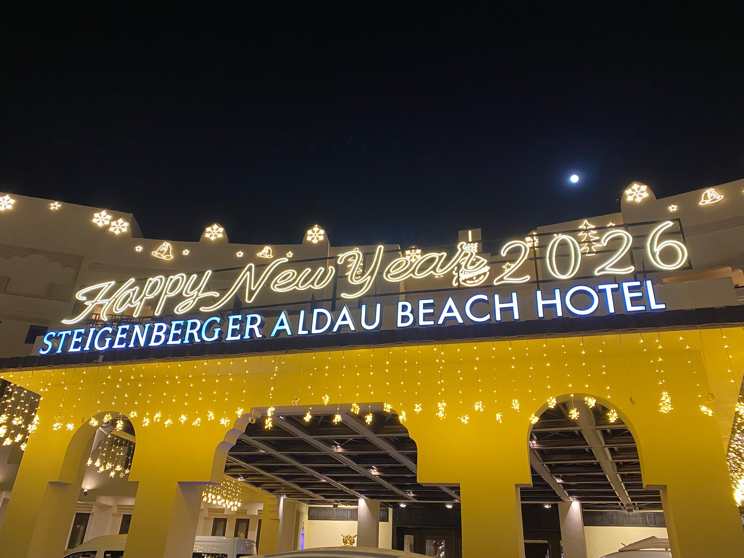 Das Buffet war gut organisiert und mehr als üppig und sehr aufwendig dekoriert. Allein der Raum für die Desserts war riesig und die Auswahl kaum zu toppen. Aber wer uns kennt, weiß, dass wir uns letzten Endes vor Mitternacht abgesetzt haben und mit unseren Freunden den Wein in Ruhe in der Bar getrunken haben. Feuerwerk gab es keines, nur ein paar Flammenspiele. In Ägypten gilt Feuerwerk als Sprengstoff und der Kauf und Besitz sind hier verboten.