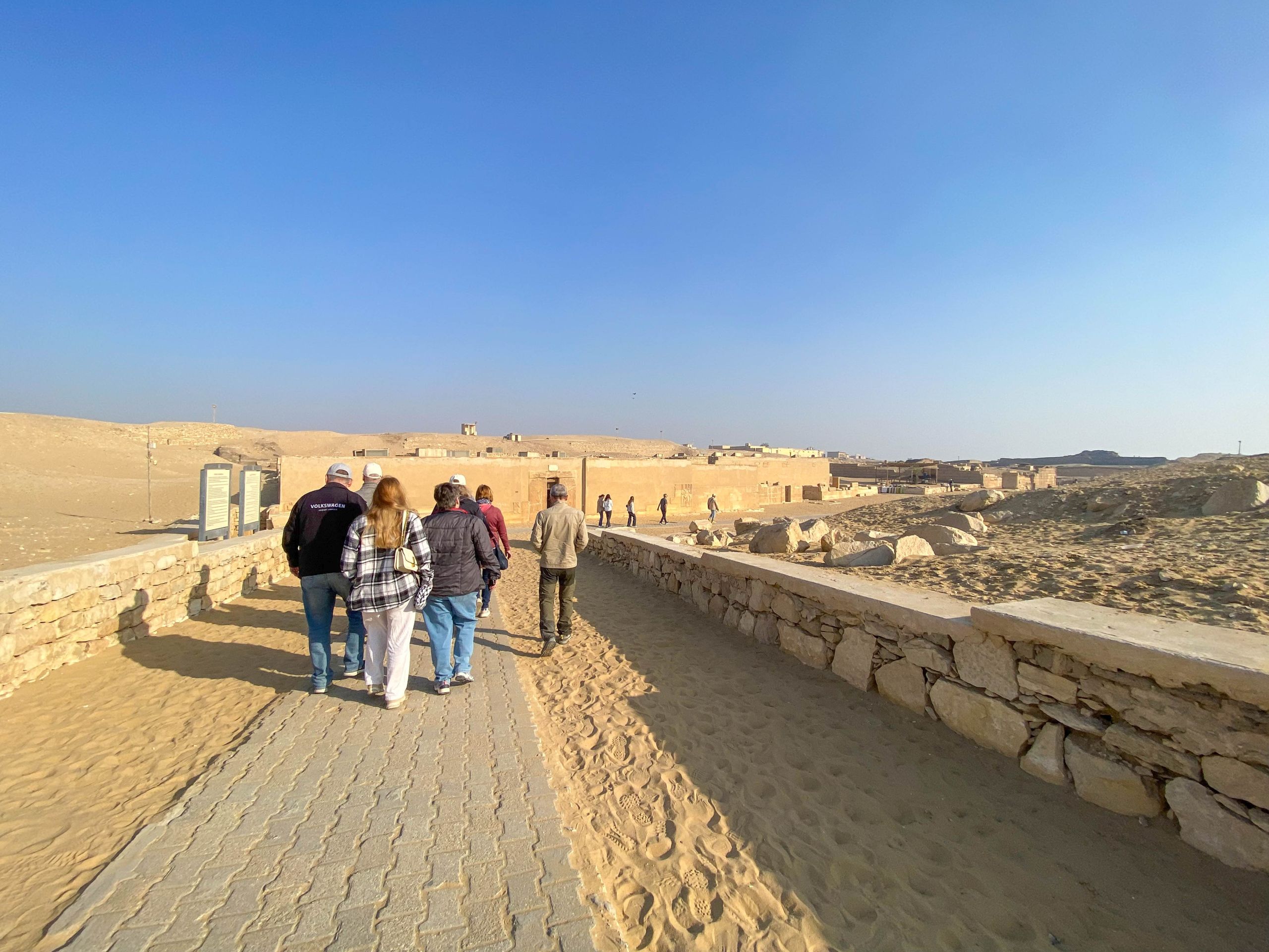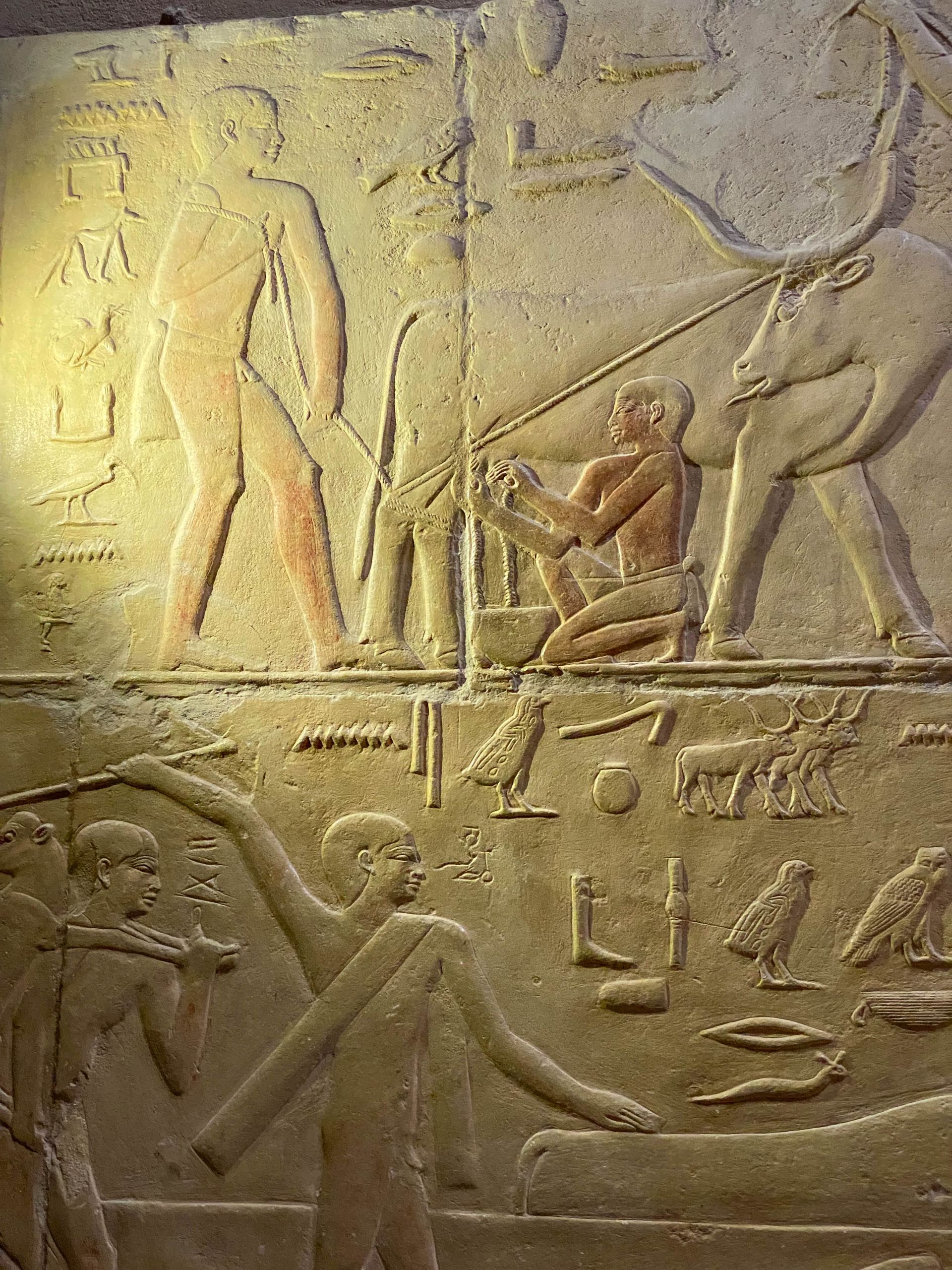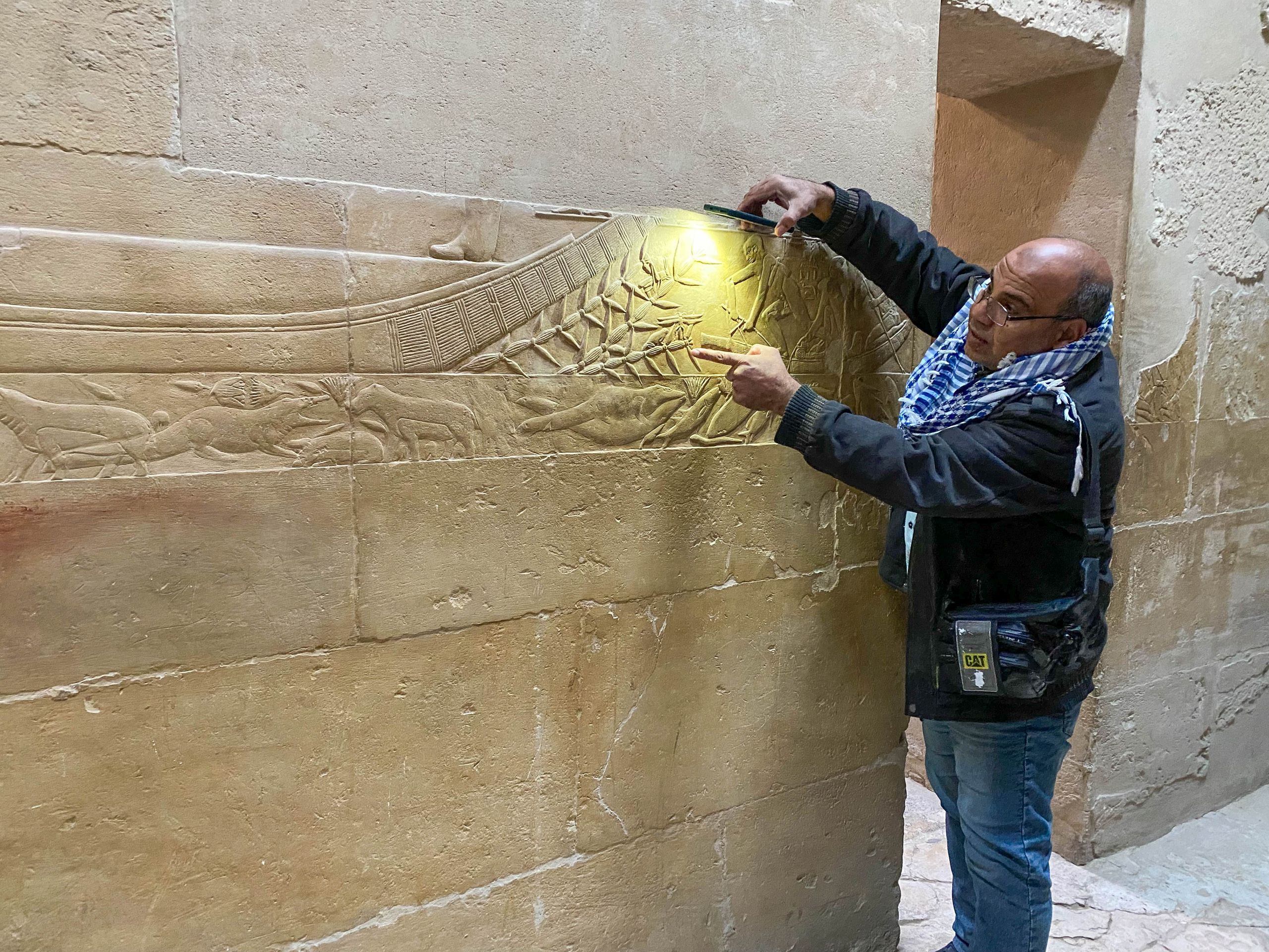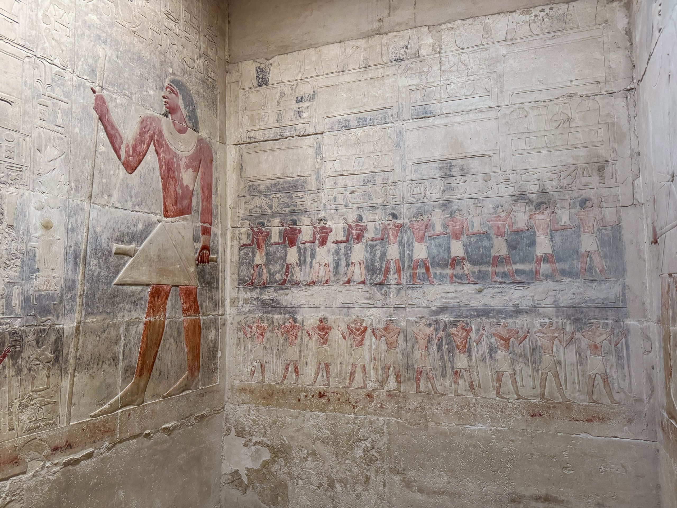 Heute geht es zuerst nach Sakkara. Hier können wir wunderschöne bis zu 5000 Jahre alte Mastabas, also Grabbauten, besichtigen. Unser Vorteil ist, dass wir in einer sehr kleinen Gruppe von neun Personen unterwegs sind und so dort hineindürfen. Die Gräber, z.B. das Grab des Ti oder des Mehu, bei denen es sich um hochrangige Grabwächter und Beamte handelt, sind mit wunderschönen Reliefs verziert, teilweise auch mit roter und blauer Farbe. Die dargestellten Szenen sind größtenteils bis ins kleinste Detail ausgearbeitet und lassen einen wirklich staunen.