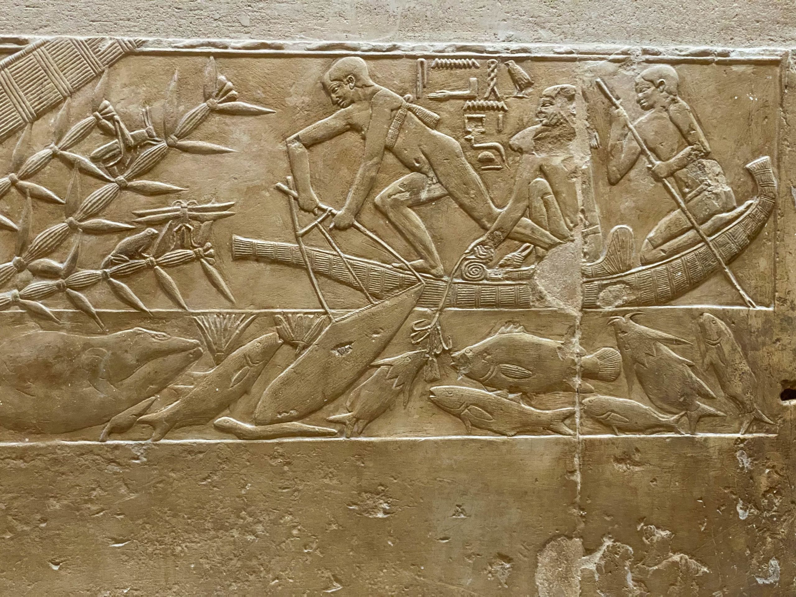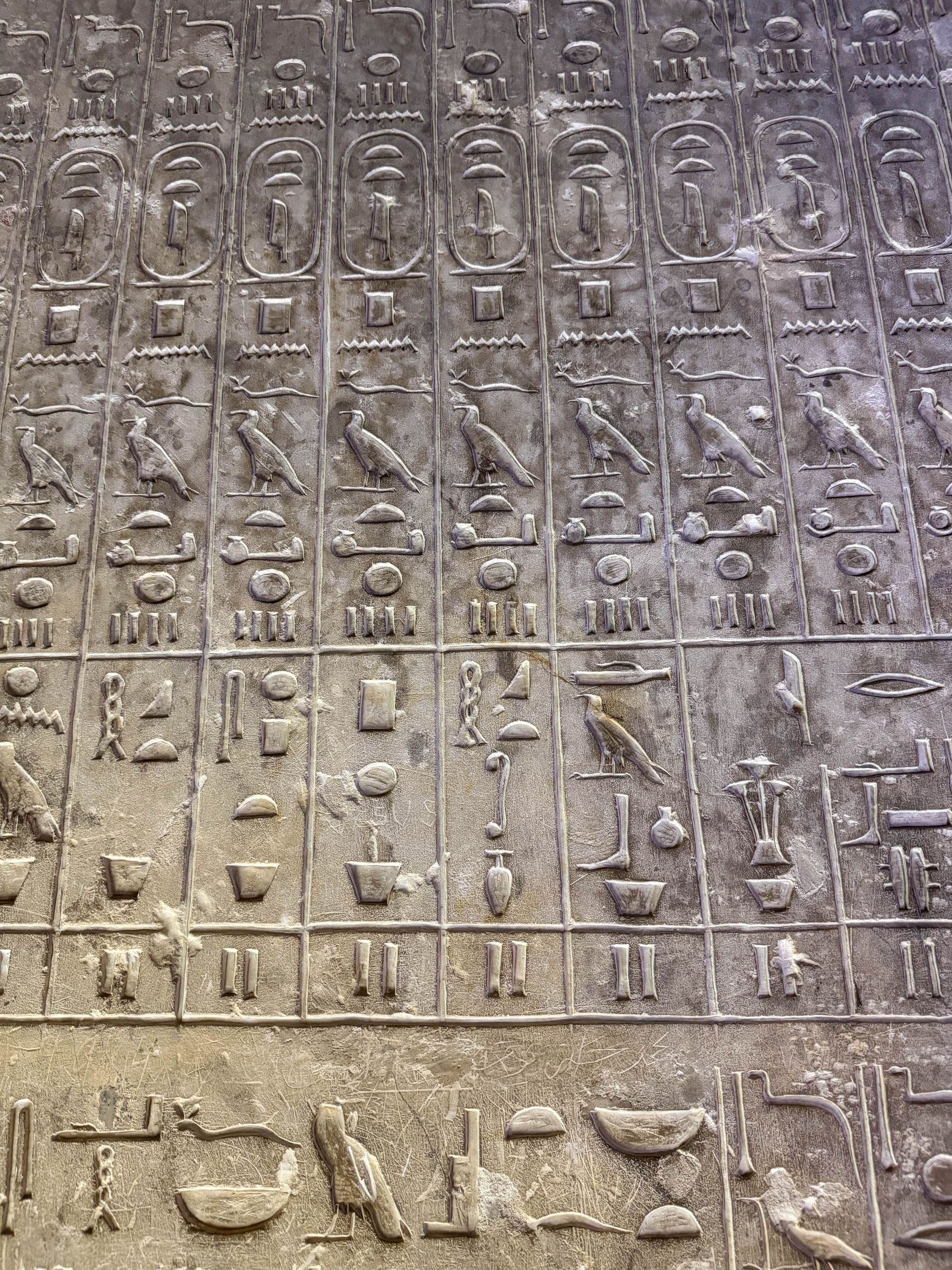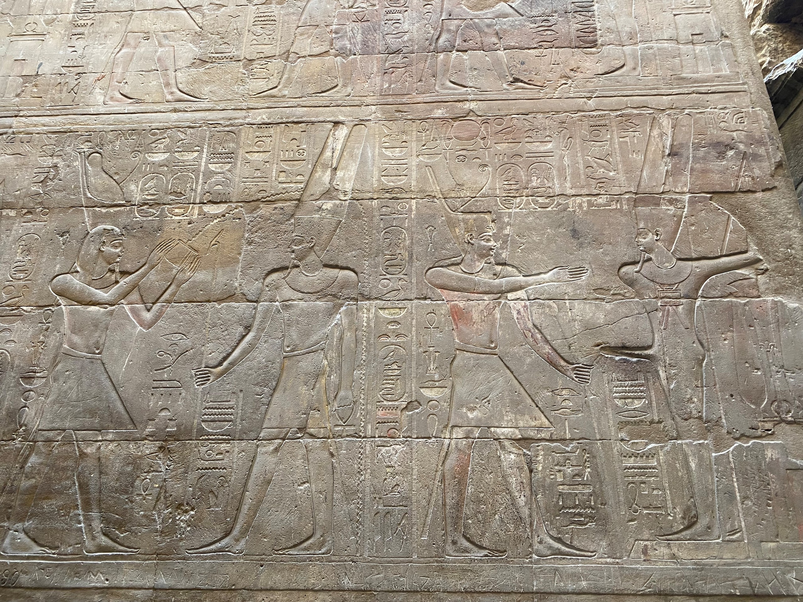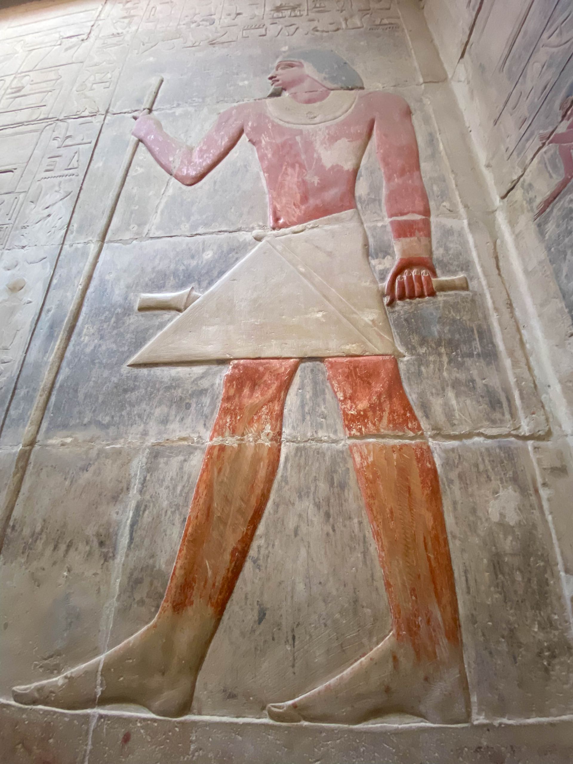 Heute geht es zuerst nach Sakkara. Hier können wir wunderschöne bis zu 5000 Jahre alte Mastabas, also Grabbauten, besichtigen. Unser Vorteil ist, dass wir in einer sehr kleinen Gruppe von neun Personen unterwegs sind und so dort hineindürfen. Die Gräber, z.B. das Grab des Ti oder des Mehu, bei denen es sich um hochrangige Grabwächter und Beamte handelt, sind mit wunderschönen Reliefs verziert, teilweise auch mit roter und blauer Farbe. Die dargestellten Szenen sind größtenteils bis ins kleinste Detail ausgearbeitet und lassen einen wirklich staunen.