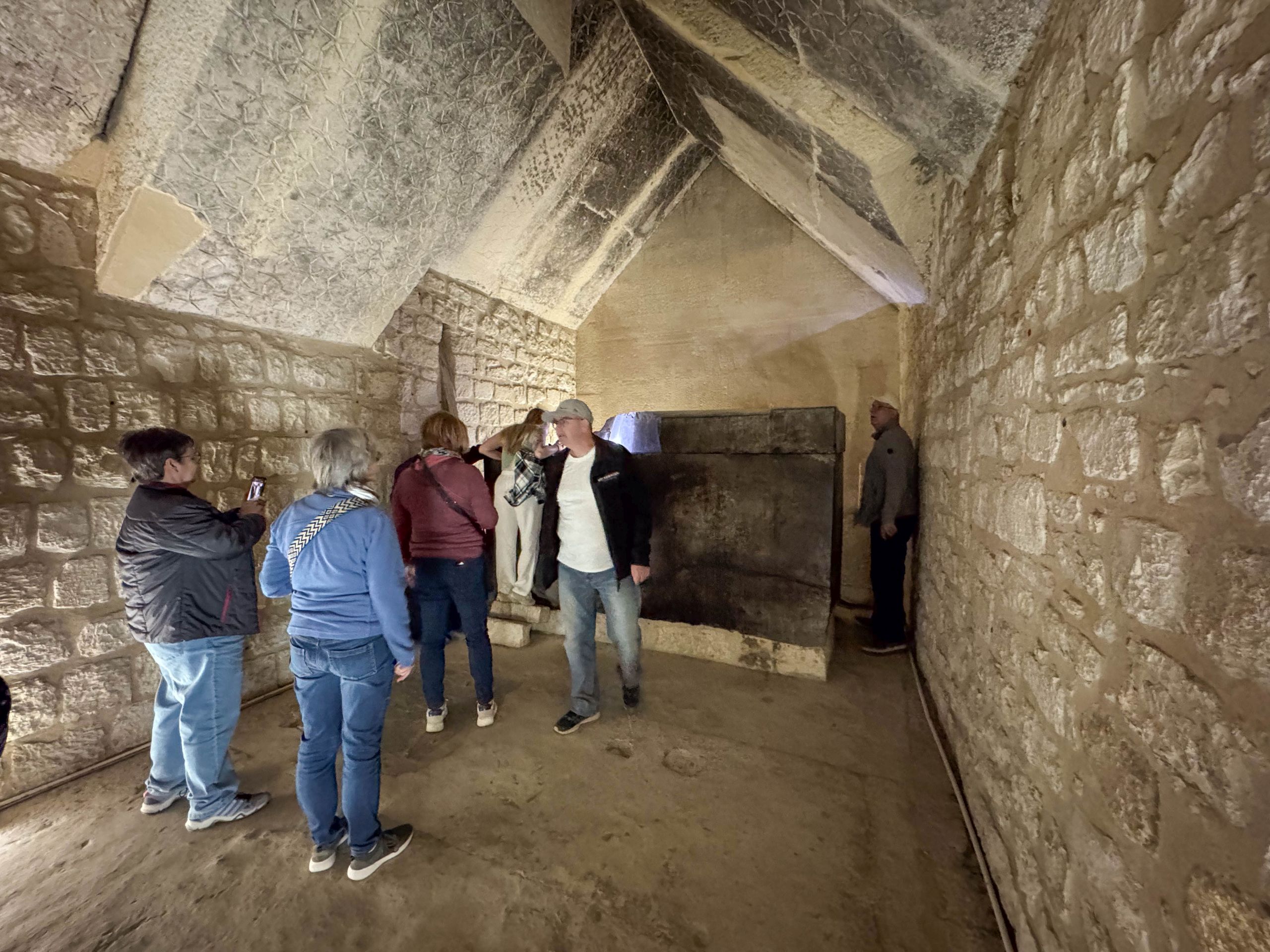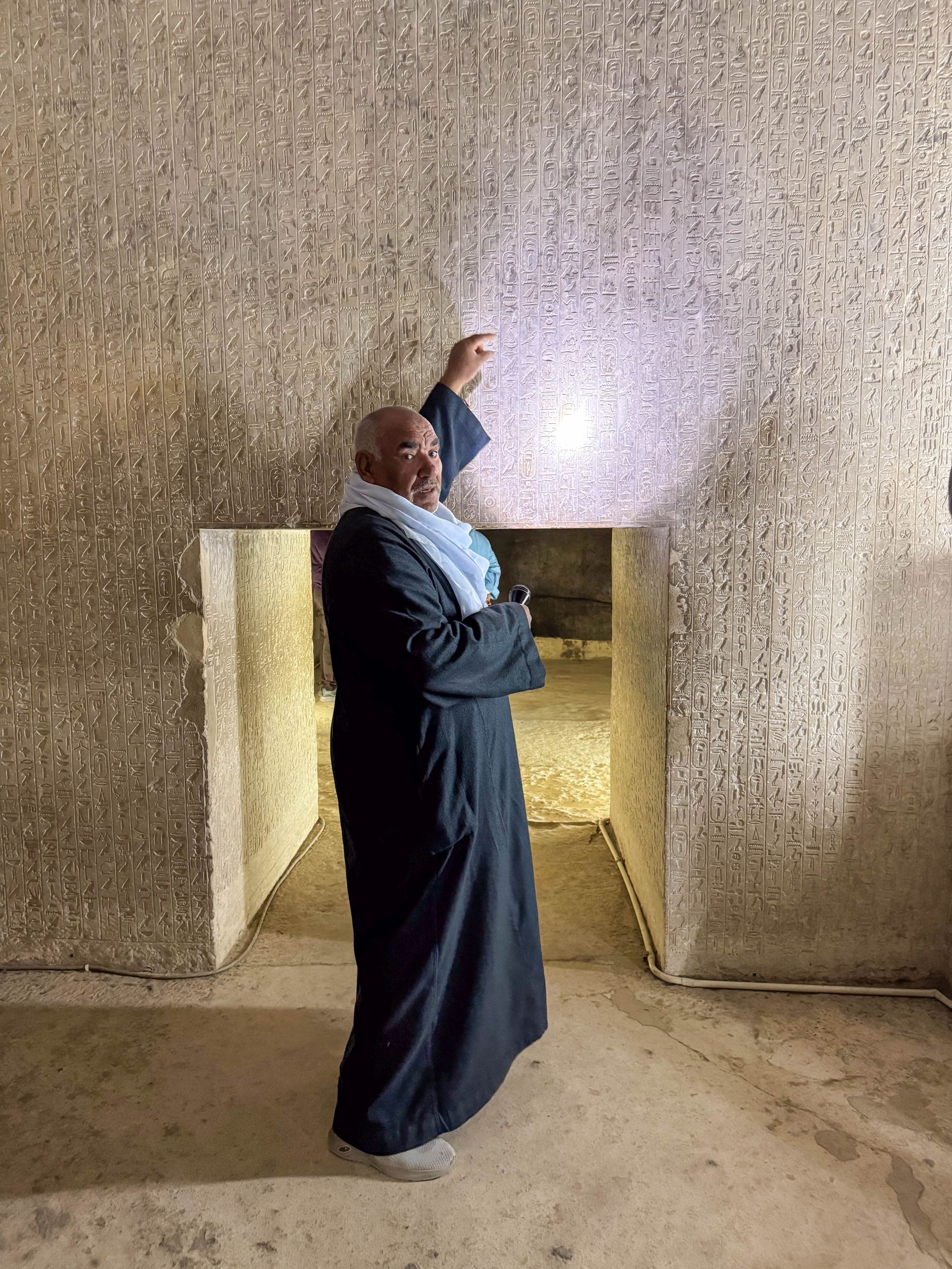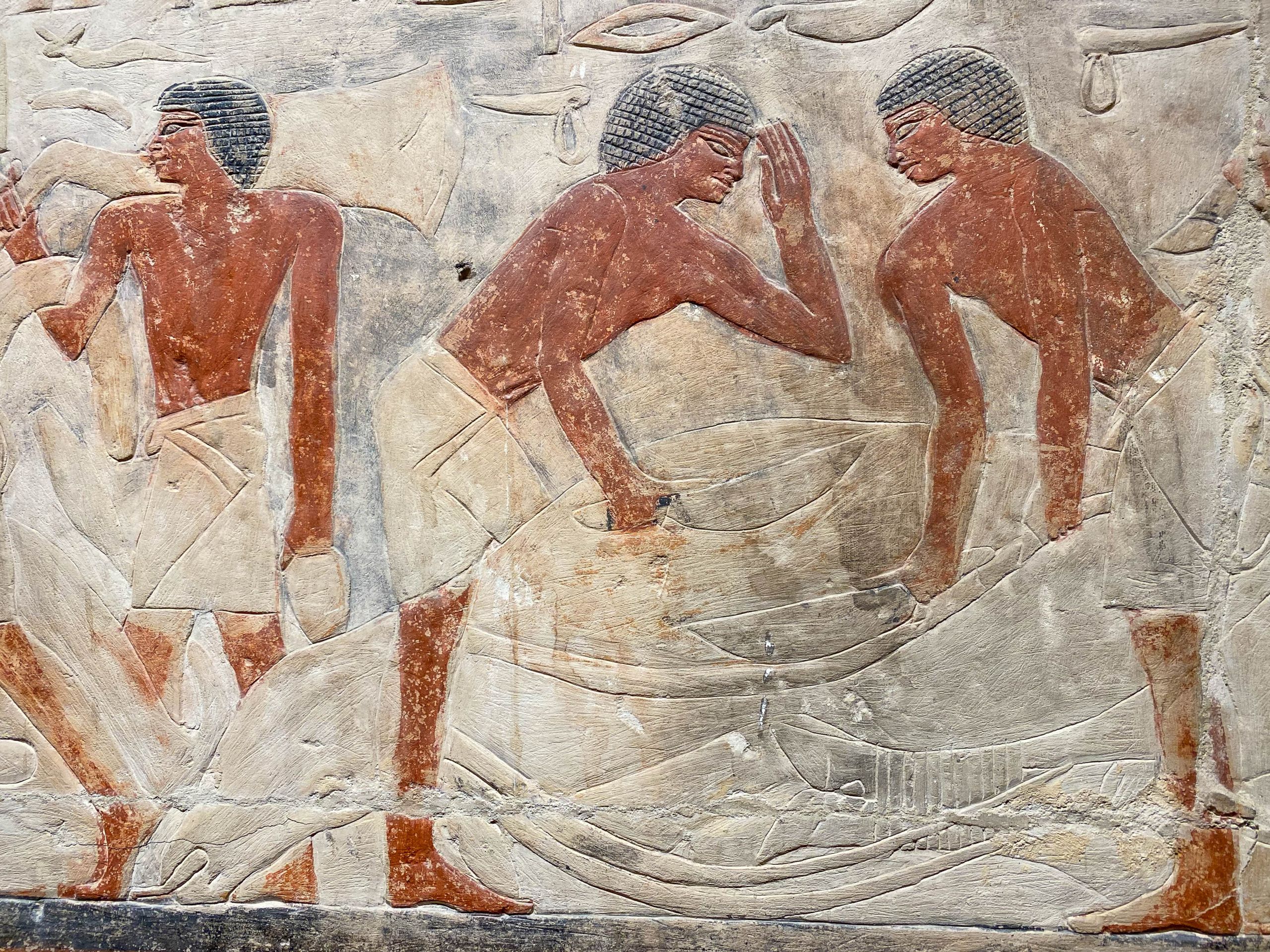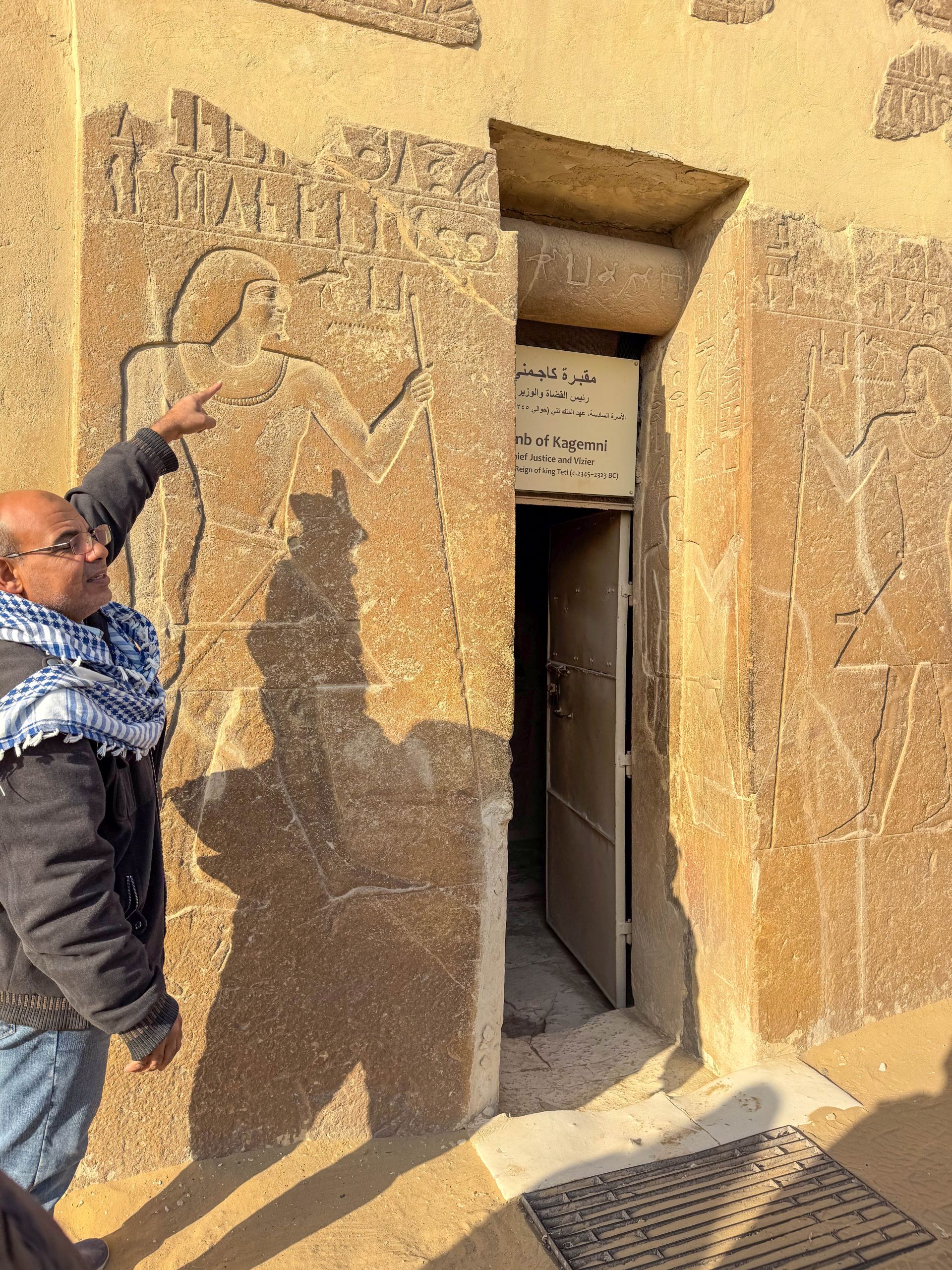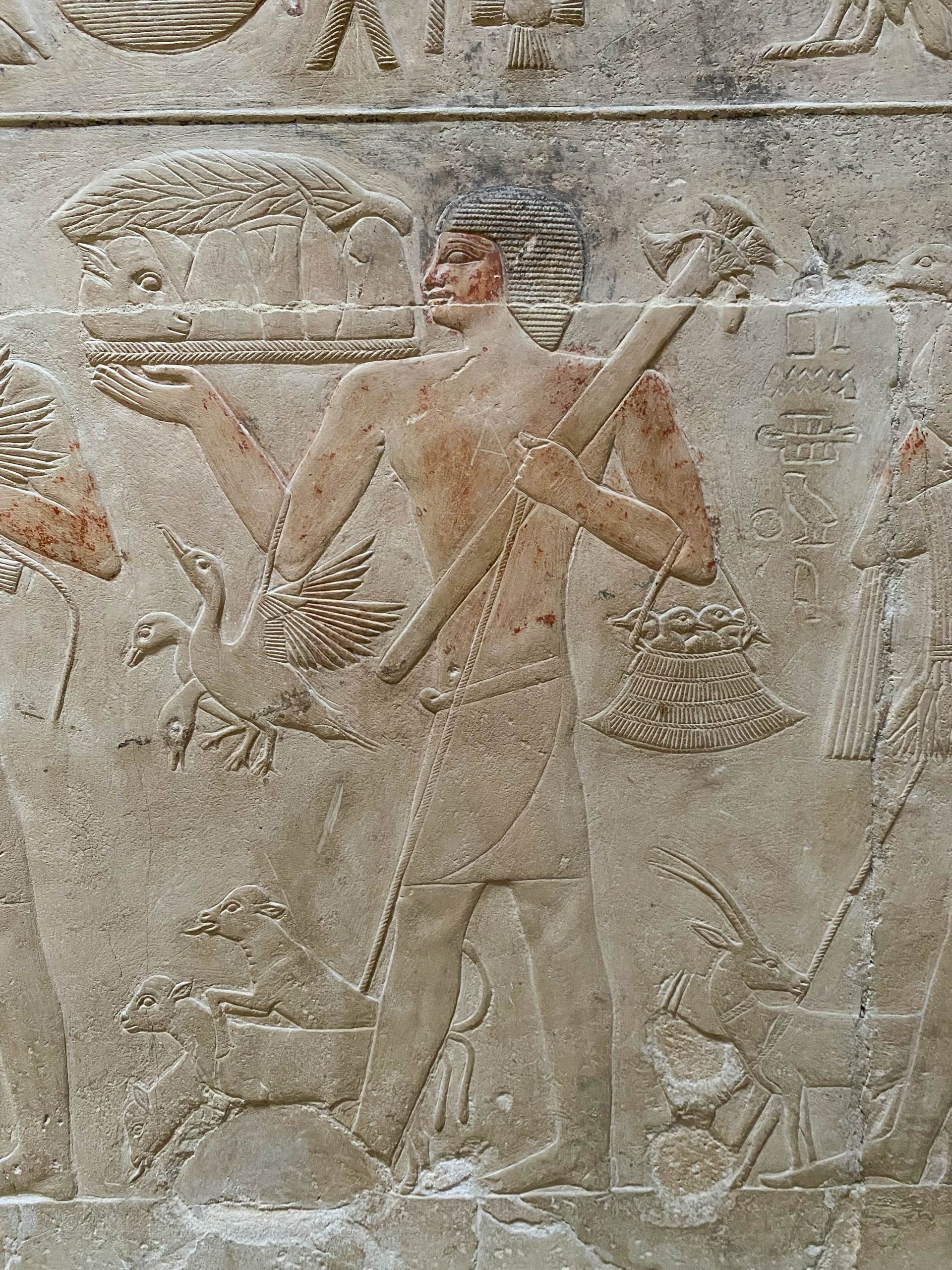 Heute geht es zuerst nach Sakkara. Hier können wir wunderschöne bis zu 5000 Jahre alte Mastabas, also Grabbauten, besichtigen. Unser Vorteil ist, dass wir in einer sehr kleinen Gruppe von neun Personen unterwegs sind und so dort hineindürfen. Die Gräber, z.B. das Grab des Ti oder des Mehu, bei denen es sich um hochrangige Grabwächter und Beamte handelt, sind mit wunderschönen Reliefs verziert, teilweise auch mit roter und blauer Farbe. Die dargestellten Szenen sind größtenteils bis ins kleinste Detail ausgearbeitet und lassen einen wirklich staunen.