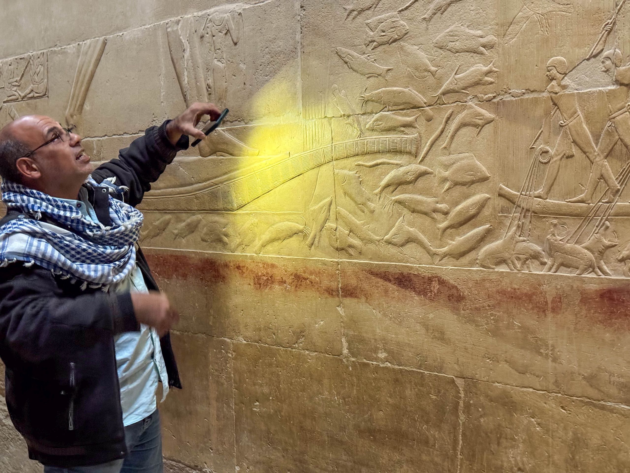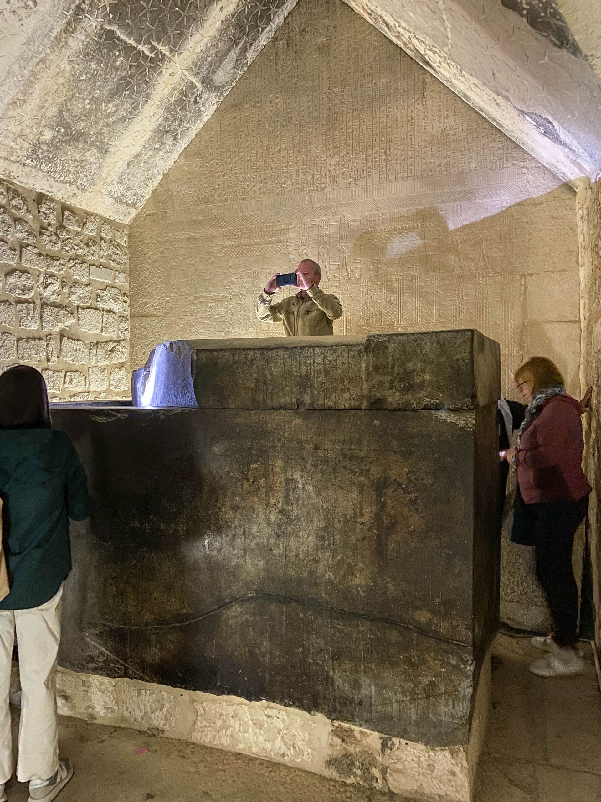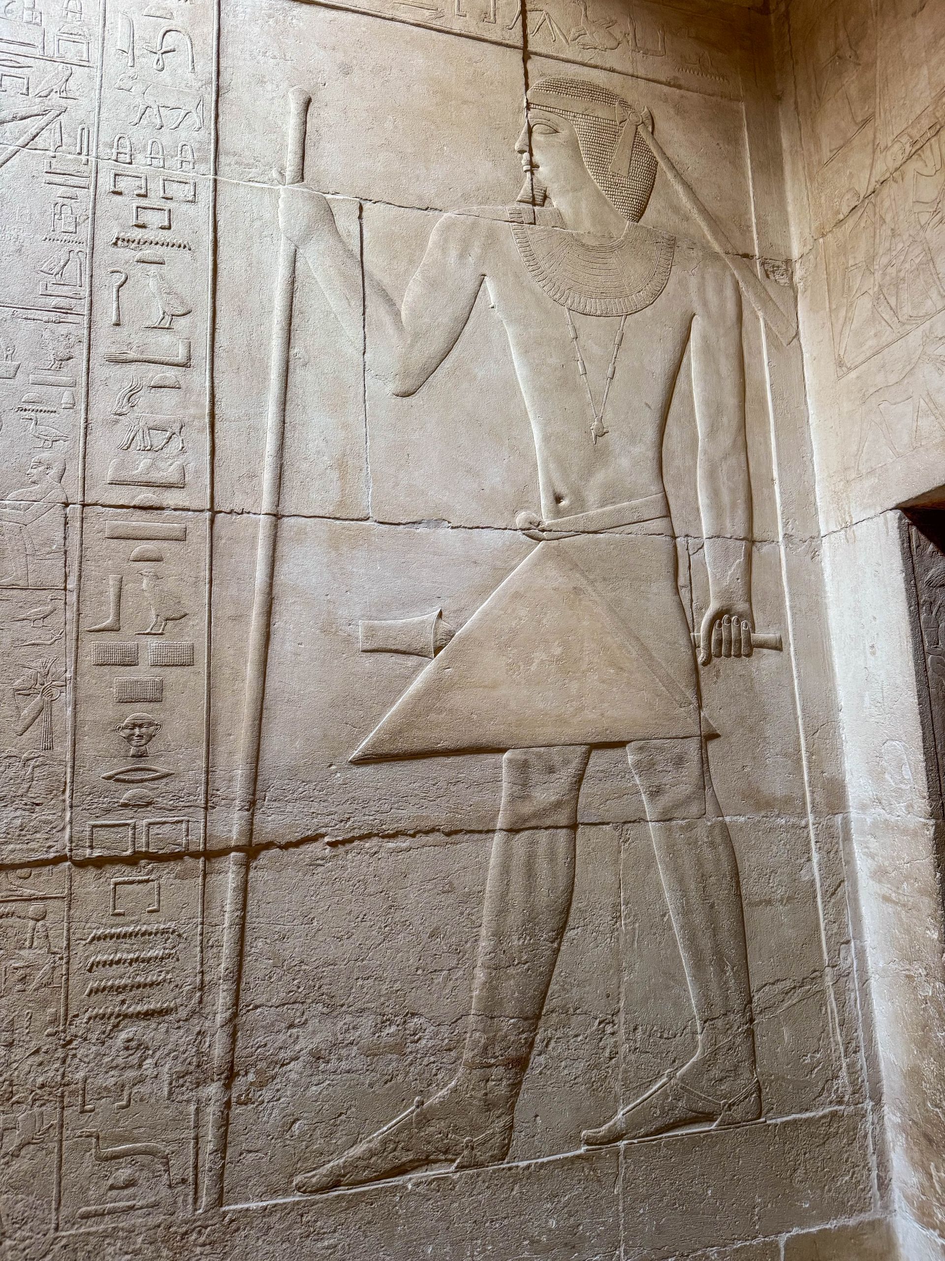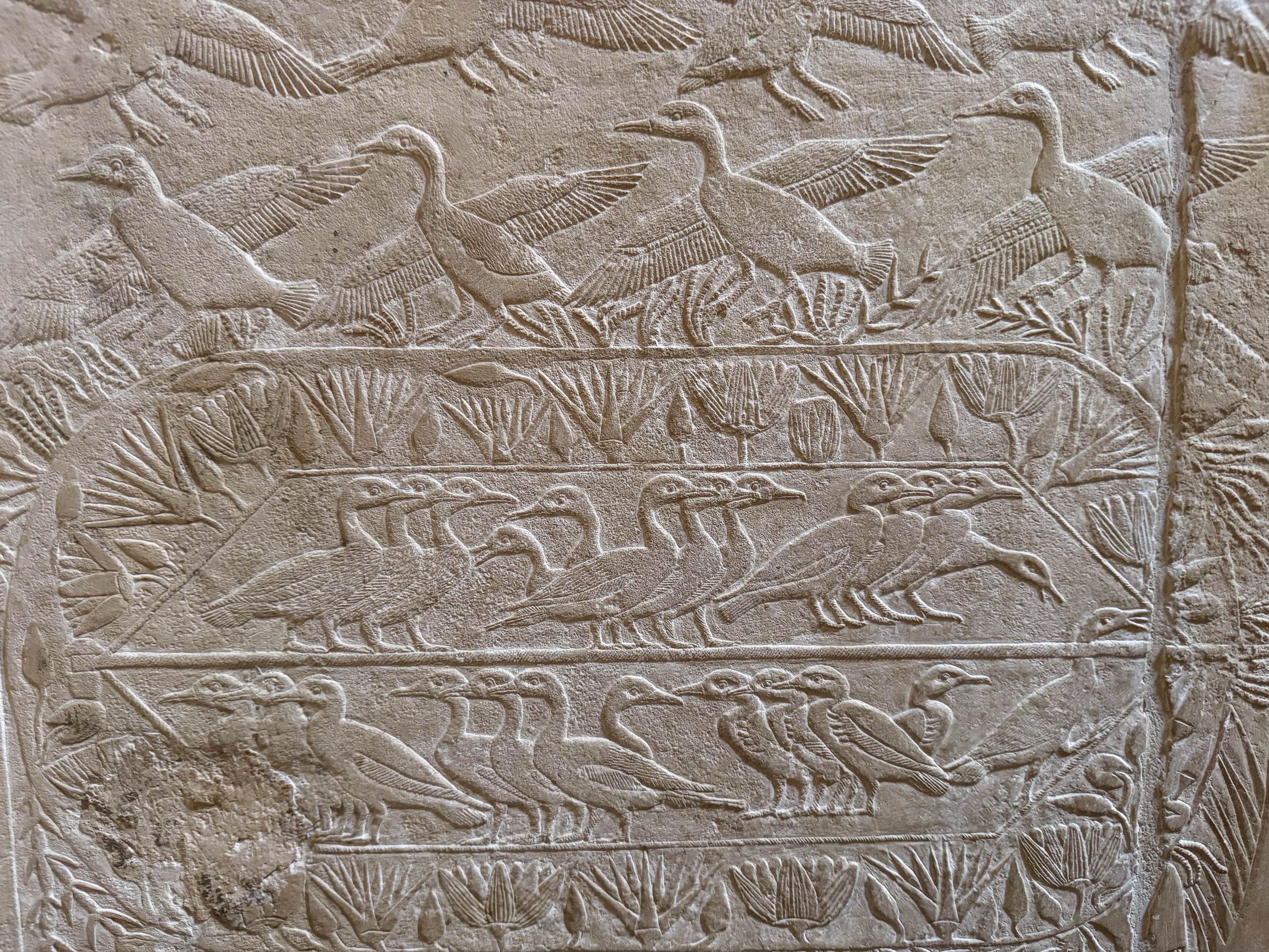 Heute geht es zuerst nach Sakkara. Hier können wir wunderschöne bis zu 5000 Jahre alte Mastabas, also Grabbauten, besichtigen. Unser Vorteil ist, dass wir in einer sehr kleinen Gruppe von neun Personen unterwegs sind und so dort hineindürfen. Die Gräber, z.B. das Grab des Ti oder des Mehu, bei denen es sich um hochrangige Grabwächter und Beamte handelt, sind mit wunderschönen Reliefs verziert, teilweise auch mit roter und blauer Farbe. Die dargestellten Szenen sind größtenteils bis ins kleinste Detail ausgearbeitet und lassen einen wirklich staunen.