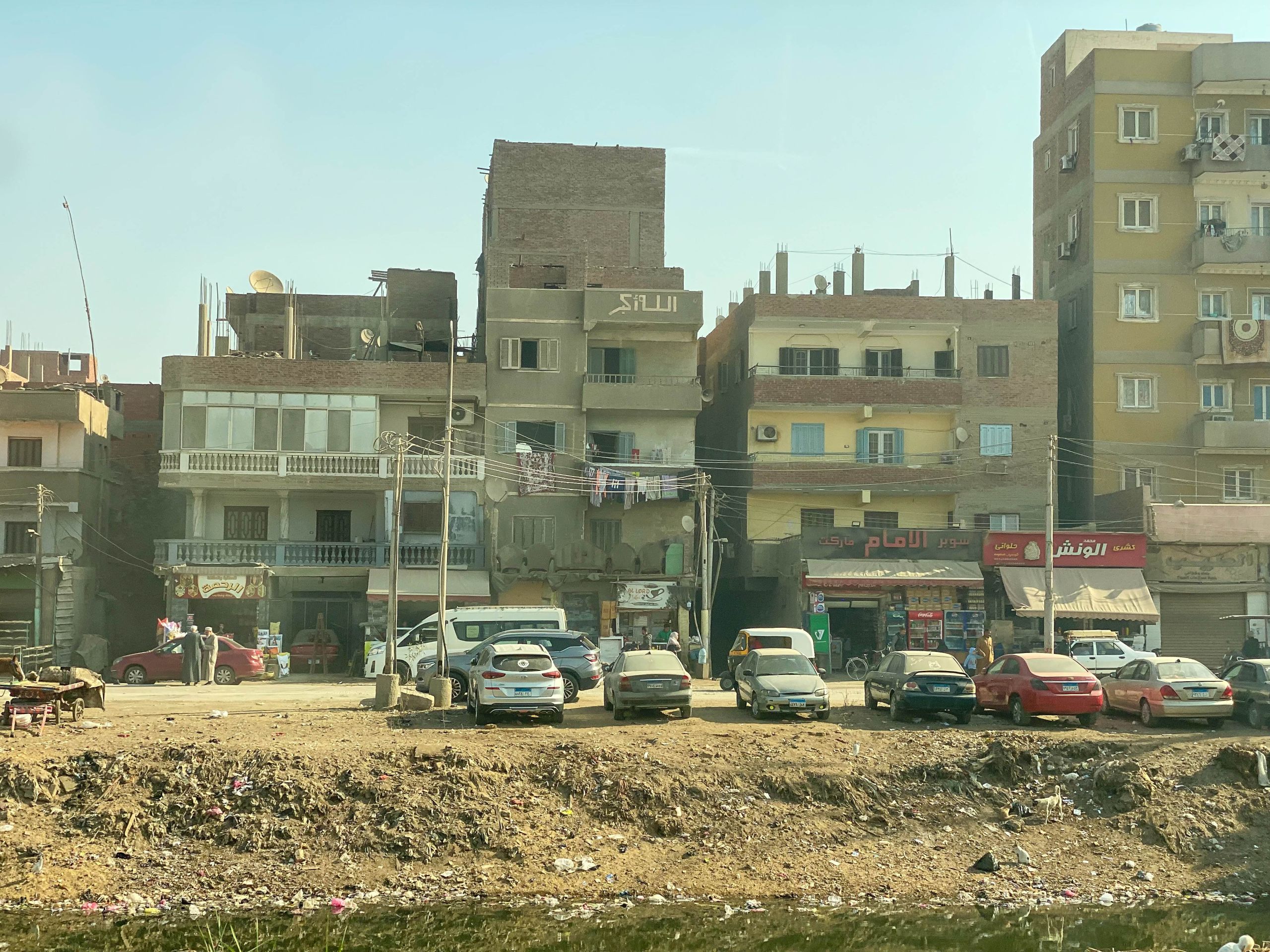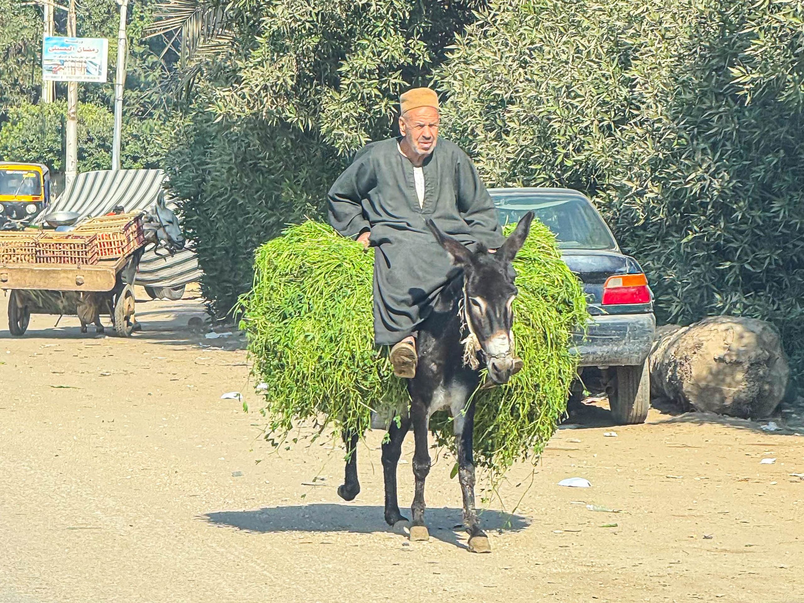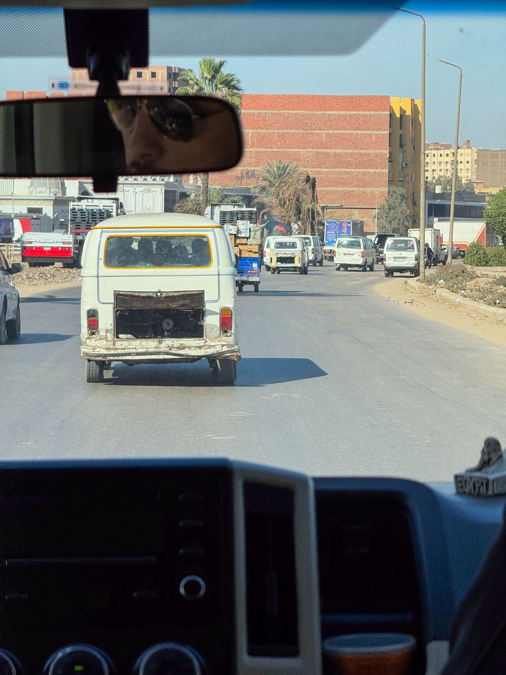 Wir fahren wieder durch die Stadt Mit Rahina Richtung Kairo. Die Busfahrten mit dem Reiseveranstalter machen immer besonders viel Spass, da man auf der Strasse die tollsten Dinge entdeckt. 95 Prozent aller Autos sind mindestens zerbeult, wenn nicht sogar durchgerostet, mit Personen vollgestopft und vieles mehr. Mopeds voll beladen, Helm tragen ist eher die Ausnahme. Wir sollten uns im Bus auch nicht anschnallen. TÜV gibts auch nicht. Unser Reiseleiter Ali erzählt uns auch sehr viel über Land und Leuten, was die Tour wirklich zu einem Erlebnis macht.