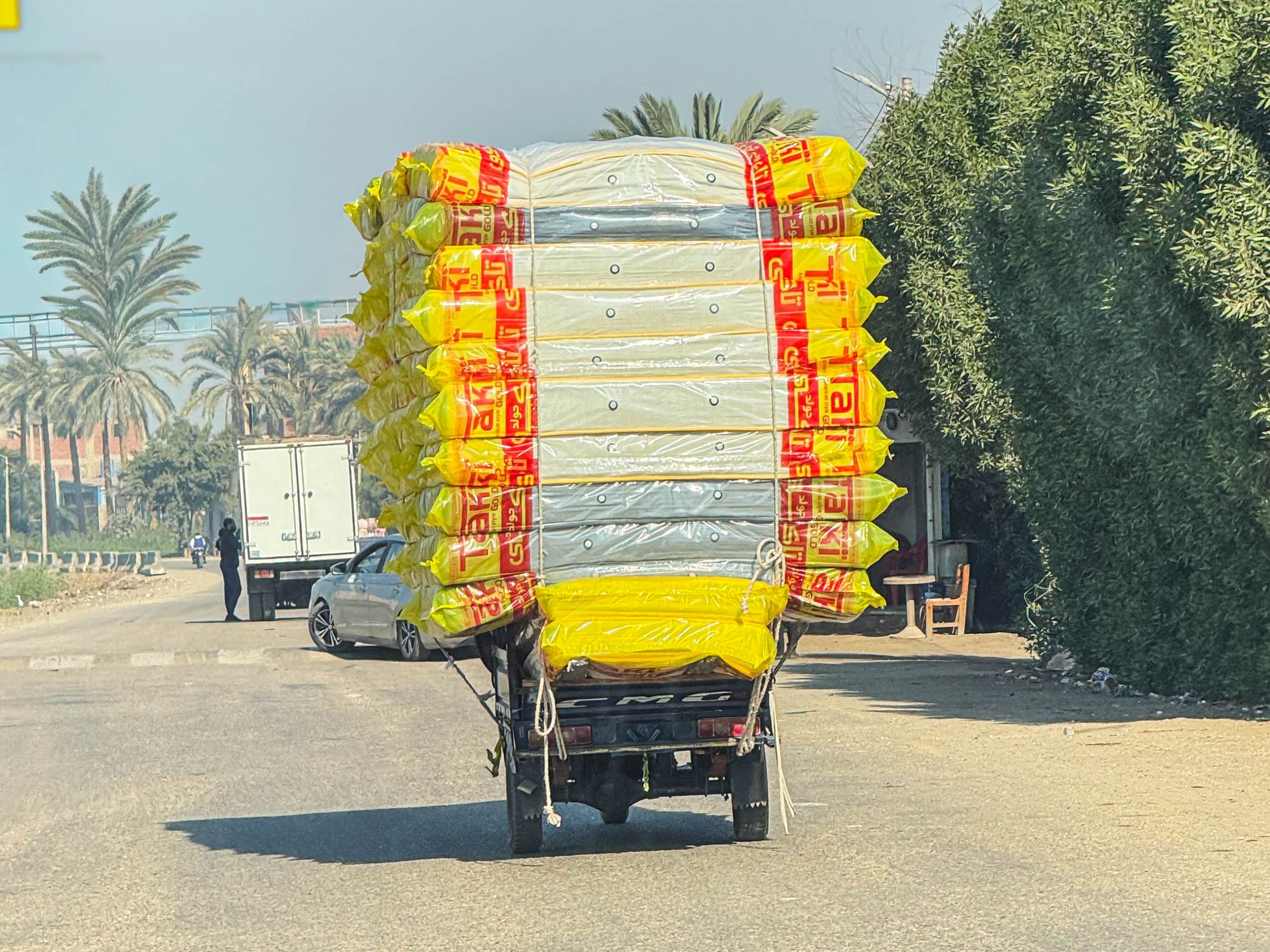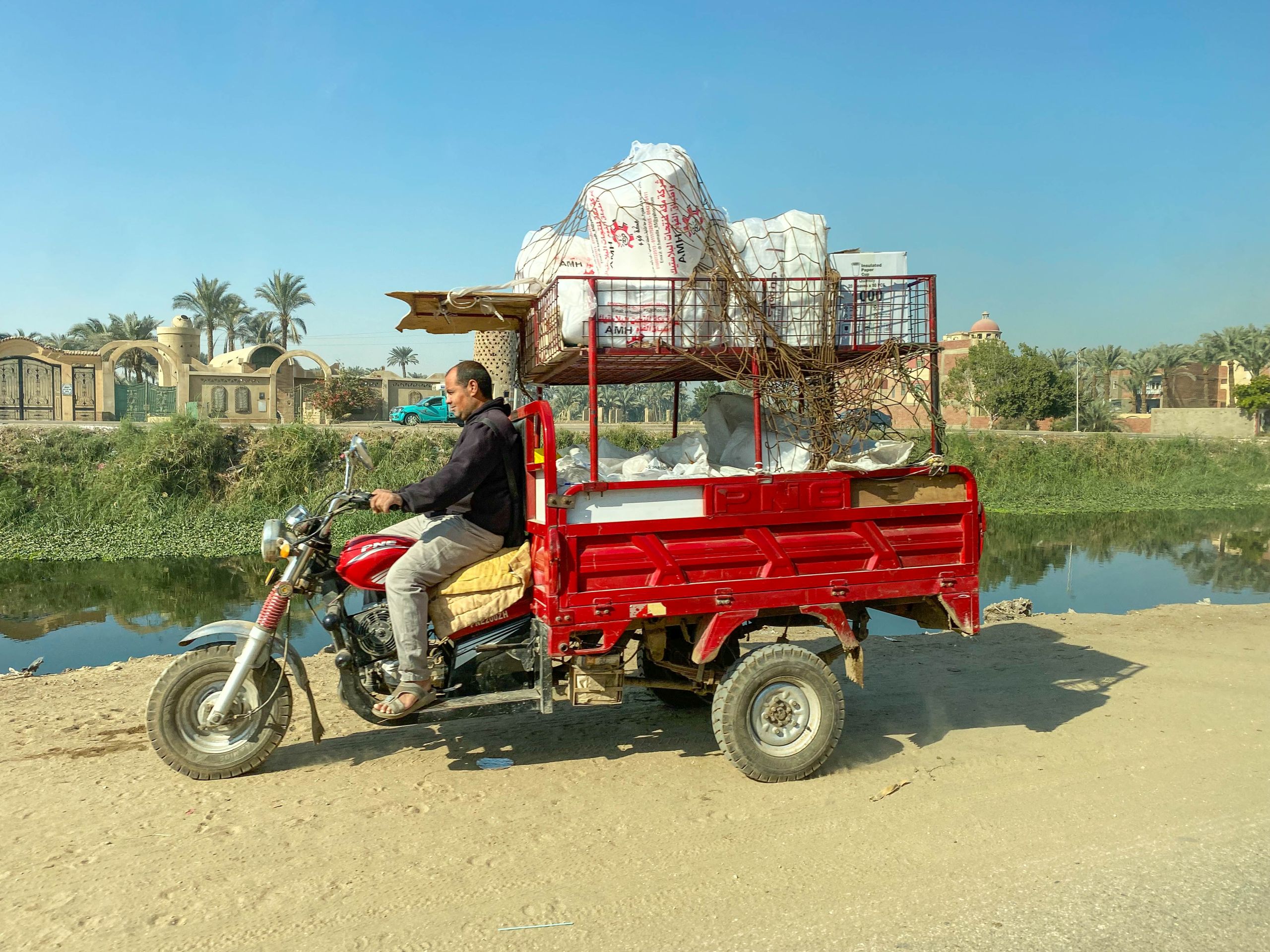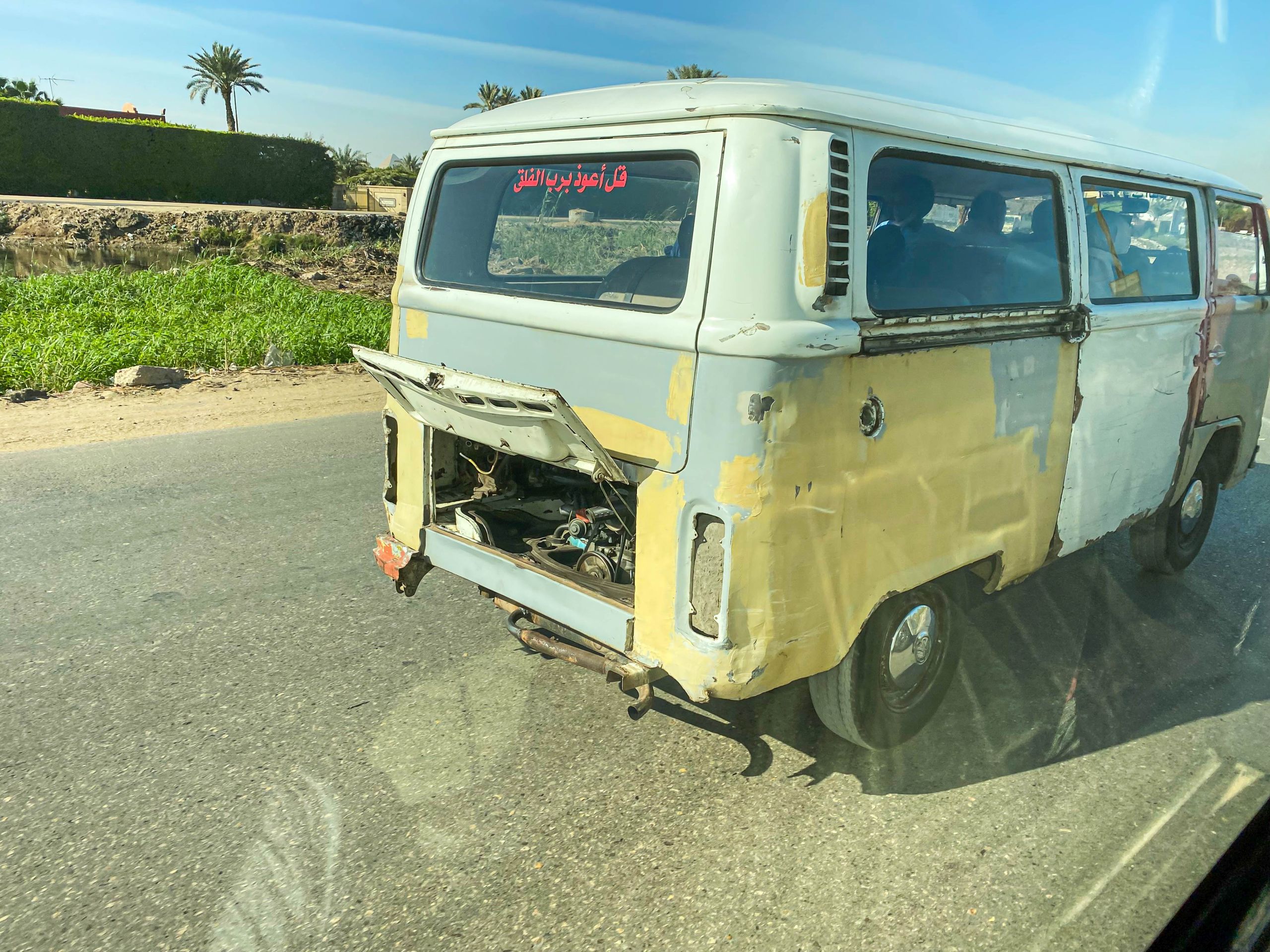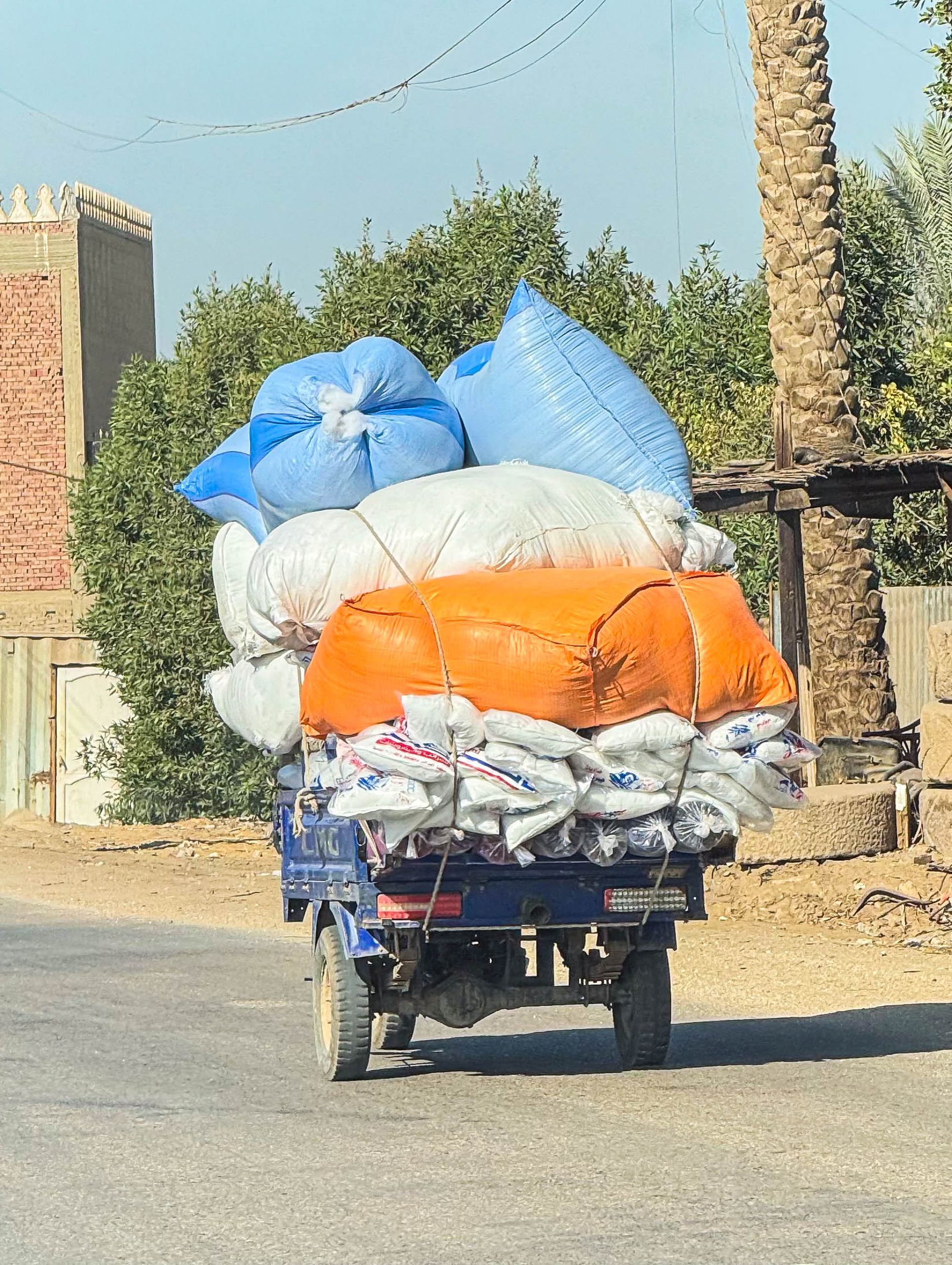 Wir fahren wieder durch die Stadt Mit Rahina Richtung Kairo. Die Busfahrten mit dem Reiseveranstalter machen immer besonders viel Spass, da man auf der Strasse die tollsten Dinge entdeckt. 95 Prozent aller Autos sind mindestens zerbeult, wenn nicht sogar durchgerostet, mit Personen vollgestopft und vieles mehr. Mopeds voll beladen, Helm tragen ist eher die Ausnahme. Wir sollten uns im Bus auch nicht anschnallen. TÜV gibts auch nicht. Unser Reiseleiter Ali erzählt uns auch sehr viel über Land und Leuten, was die Tour wirklich zu einem Erlebnis macht.