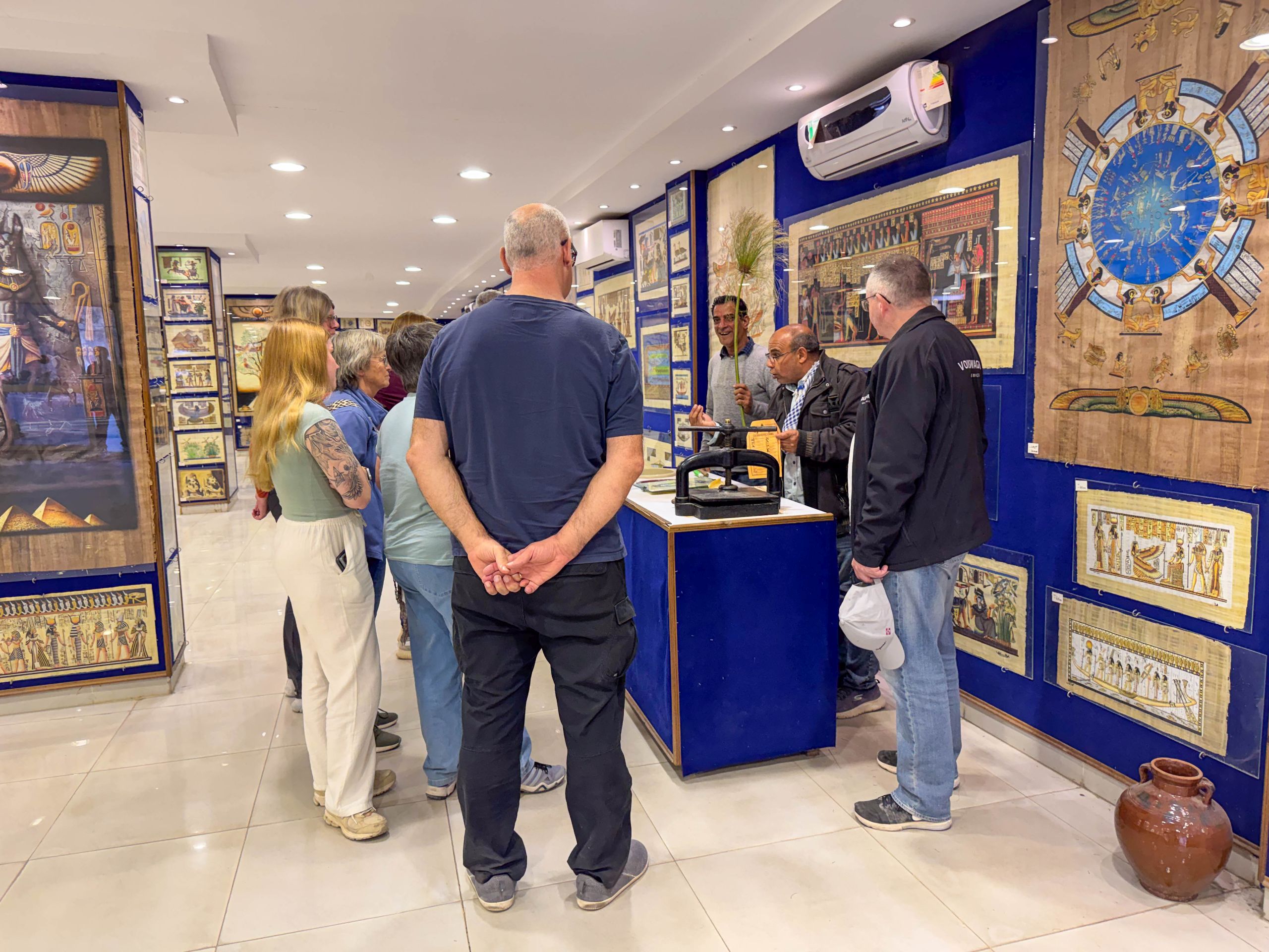 Jetzt geht es aufs Land zu einem Lokal, in dem einige Mitreisende sich mit diversen Speisen sattessen. Gerd und ich beschränken uns auf ein Getränk und etwas Fladenbrot, da wir noch keinen richtigen Hunger haben. Nach dem Essen werden wir noch zu einer Papyrusfabrik kutschiert . Man zeigt uns die Herstellung des Papyrusspapiers und hofft auf Verkauf eines der ausgestellten Bilder. Wir sind aber nicht richtig überzeugt und gehen auch hier wieder alle ohne Kauf aus dem Laden.