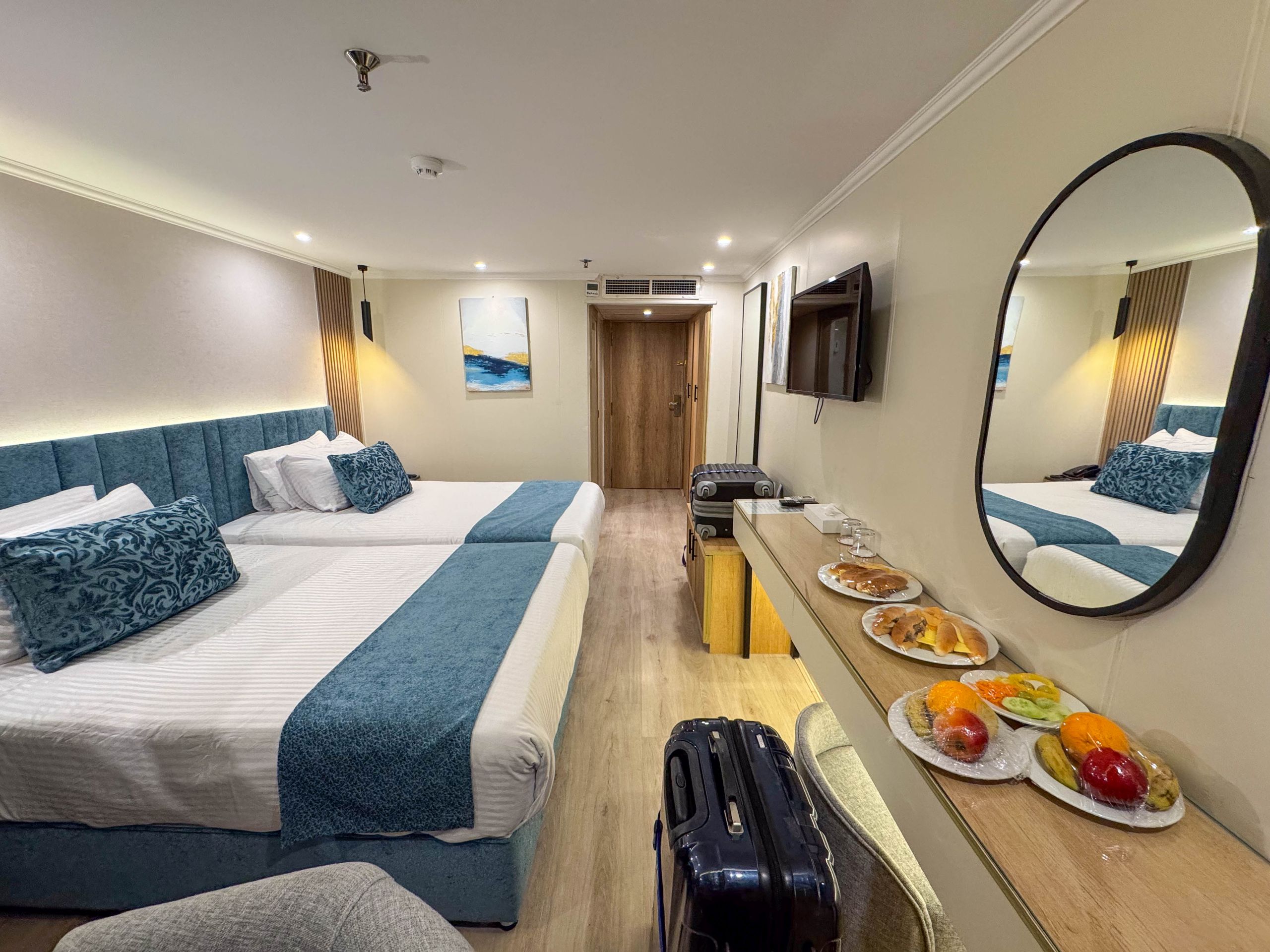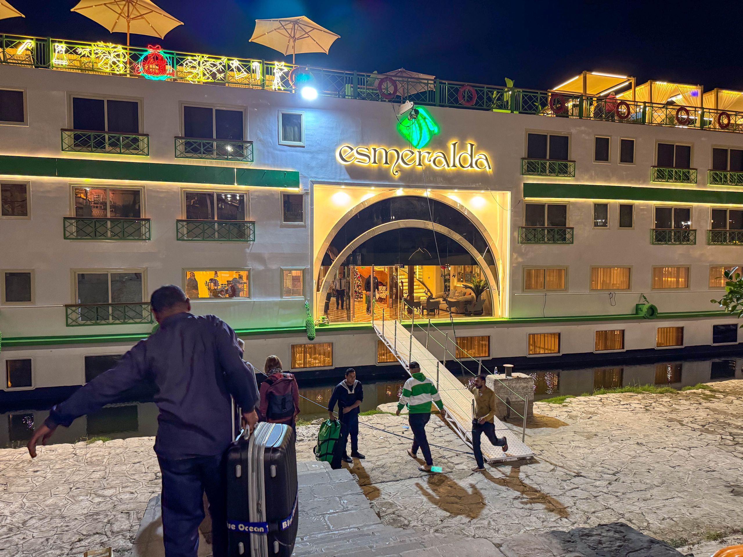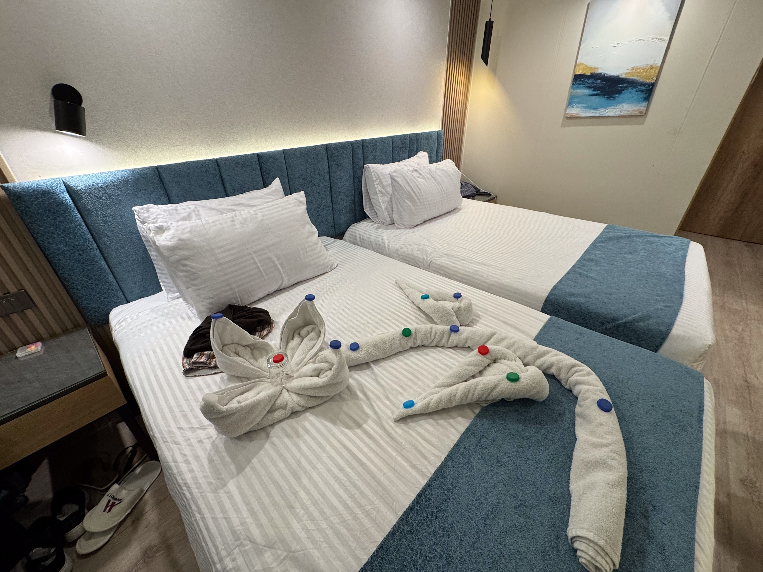 Um dann ins Schiff zu gelangen, müssen wir zunächst durch drei weitere Schiffe marschieren und erst dann hatten wir unser Ziel erreicht. Das Einchecken geht recht fix und da das Schiff nur ca. 70 Kabinen hat, waren wir schnell im Zimmer. Ich muss nicht erwähnen, dass wir für alle Strecken unterschiedlichste Kofferträger hatten, die auch alle einzeln Bakschisch bekommen. Man kann gar nicht genug kleine Scheine dabei haben, um alle zufrieden zu stellen. Das läppert sich über den Tag ganz gut. Muss ich ehrlich gesagt nicht haben, aber die Menschen hier leben nun mal davon.