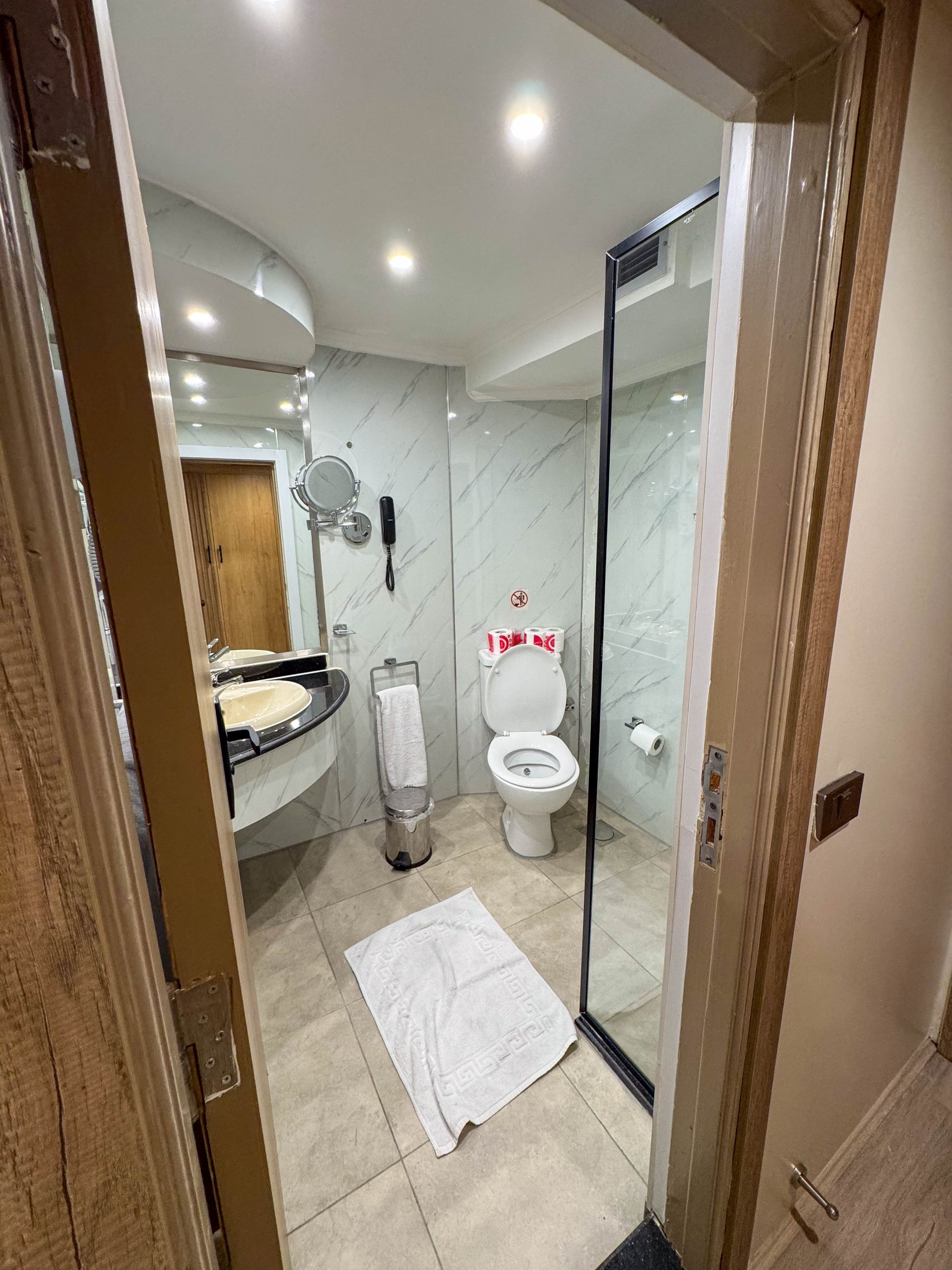 Unser Schiff hatte trotz Renovierung sicher keinen wirklichen 5-Sterne Standard, der 5-Sterne Standard liegt bestimmt 20 Jahre zurück. Das Schlimmste war das immer überflutete Bad nach jeder Dusche, da es keine Duschtasse gab. Ein mehr als dürftiges Frühstücksbuffet machte dank der Eierspeisen nach Wunsch nur dem Gerd nichts aus und eine Klimaanlage, die nur eiskalt oder aus beherrschte, wurde von uns meistens abgeschaltet.