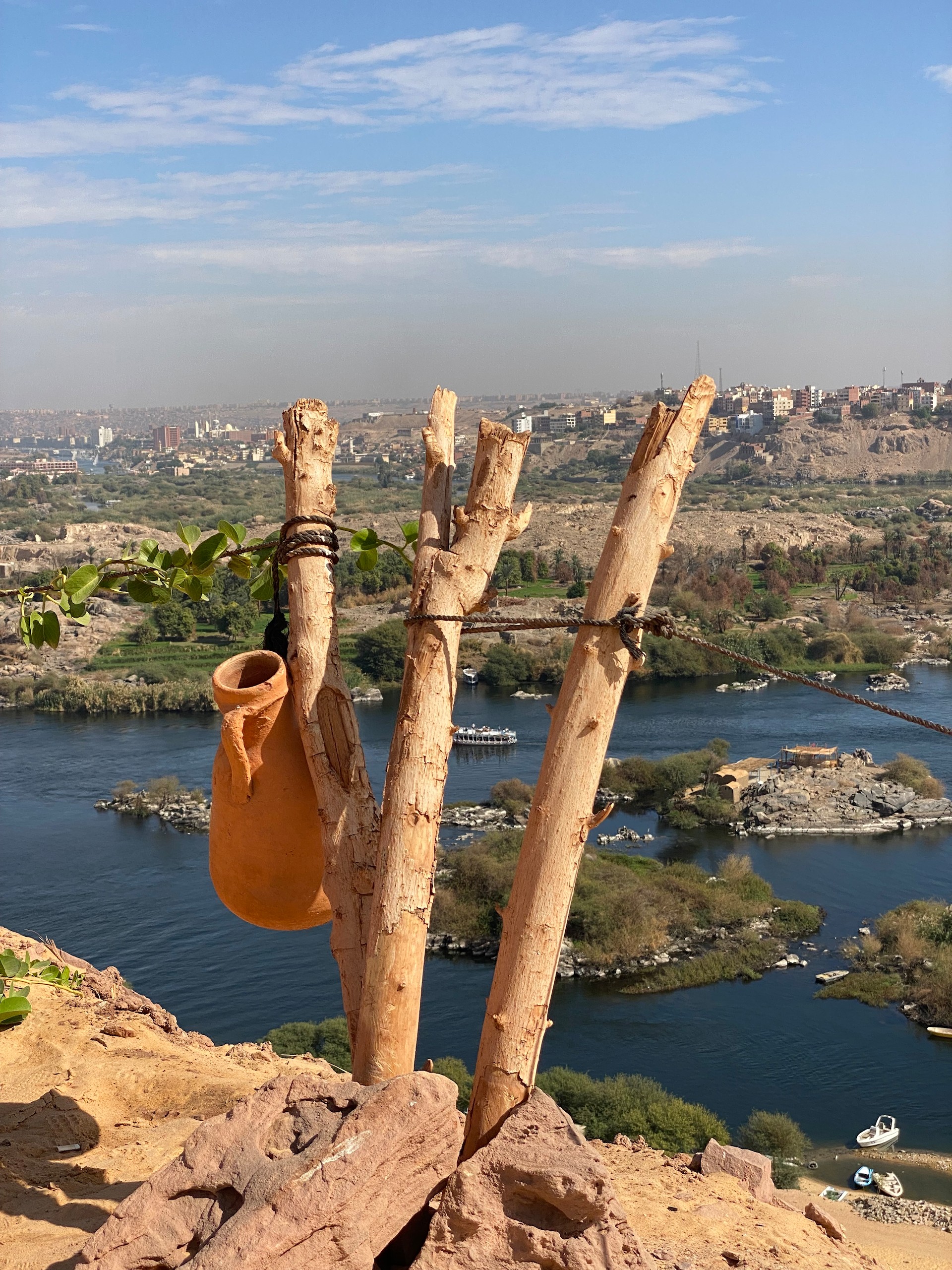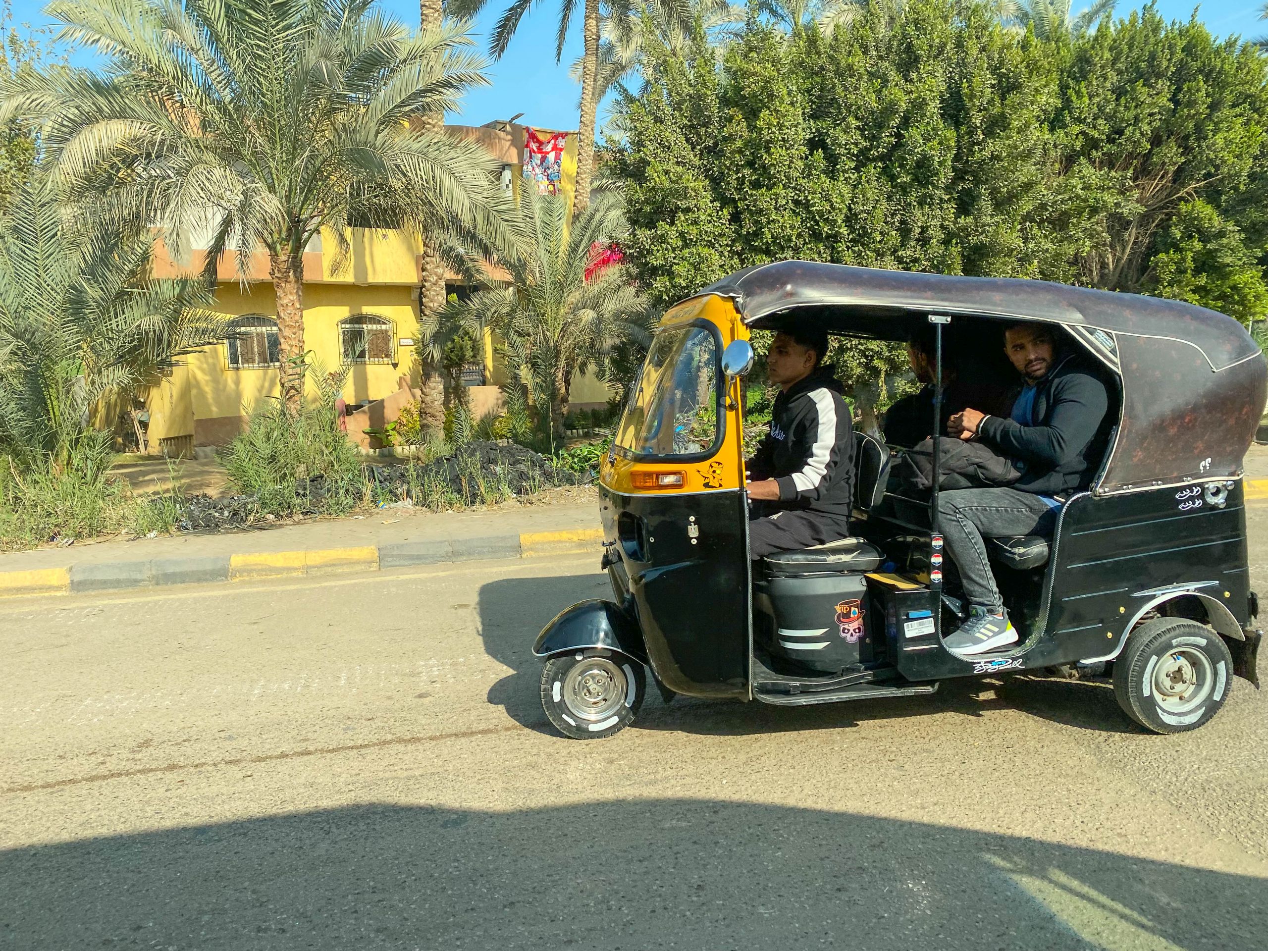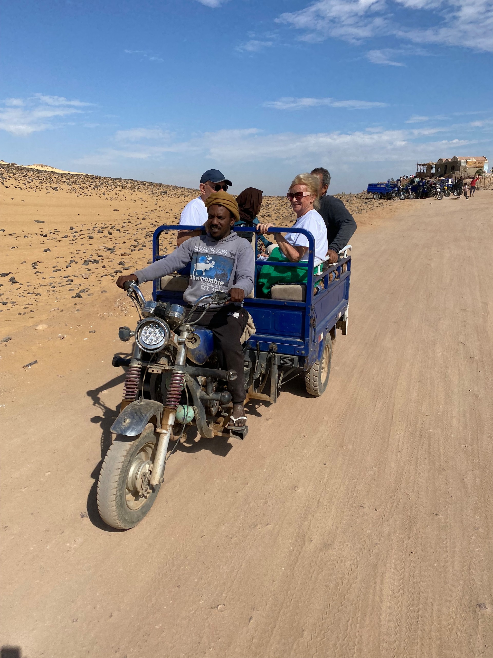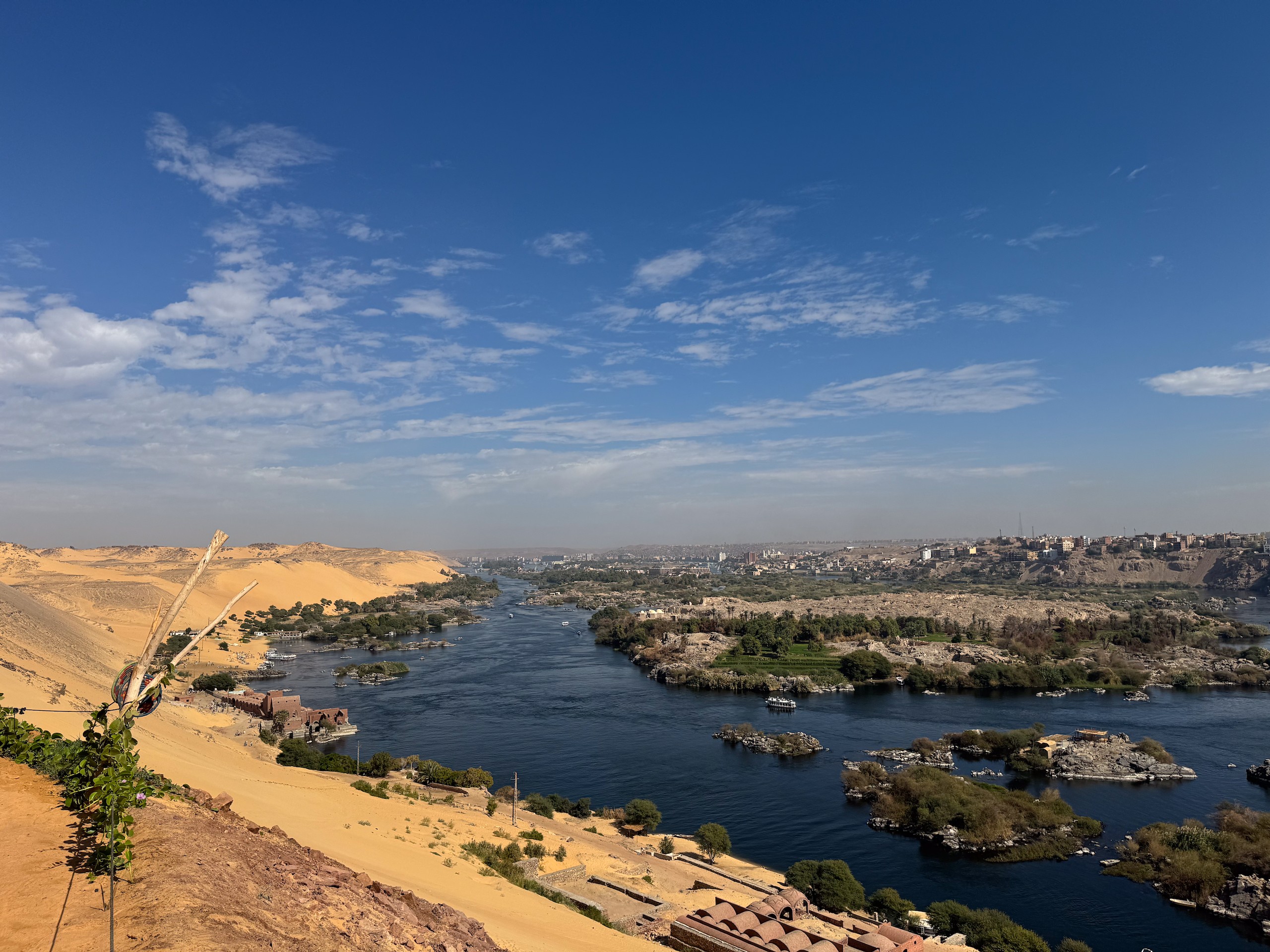 Jetzt wird es wieder spannend. Zu viert sitzen wir hinten auf einem offenen Tuktuk, welches eigentlich dreirädrige Lastenmotorräder für Passagiere sind, das wiederum von einem sehr jungen Mann gefahren wird. Mit drei Tuktuks geht es jetzt zum Aussichtspunkt AbDogo Panorama Nile View und auf der Fahrt dahin fahren die Jungs wieder halsbrecherisch um die Wette. Trotzdem sind wir heil angekommen und haben einen wunderschönen Blick auf den Nil, Assuan sowie den alten und neuen Assuanstaudamm.
