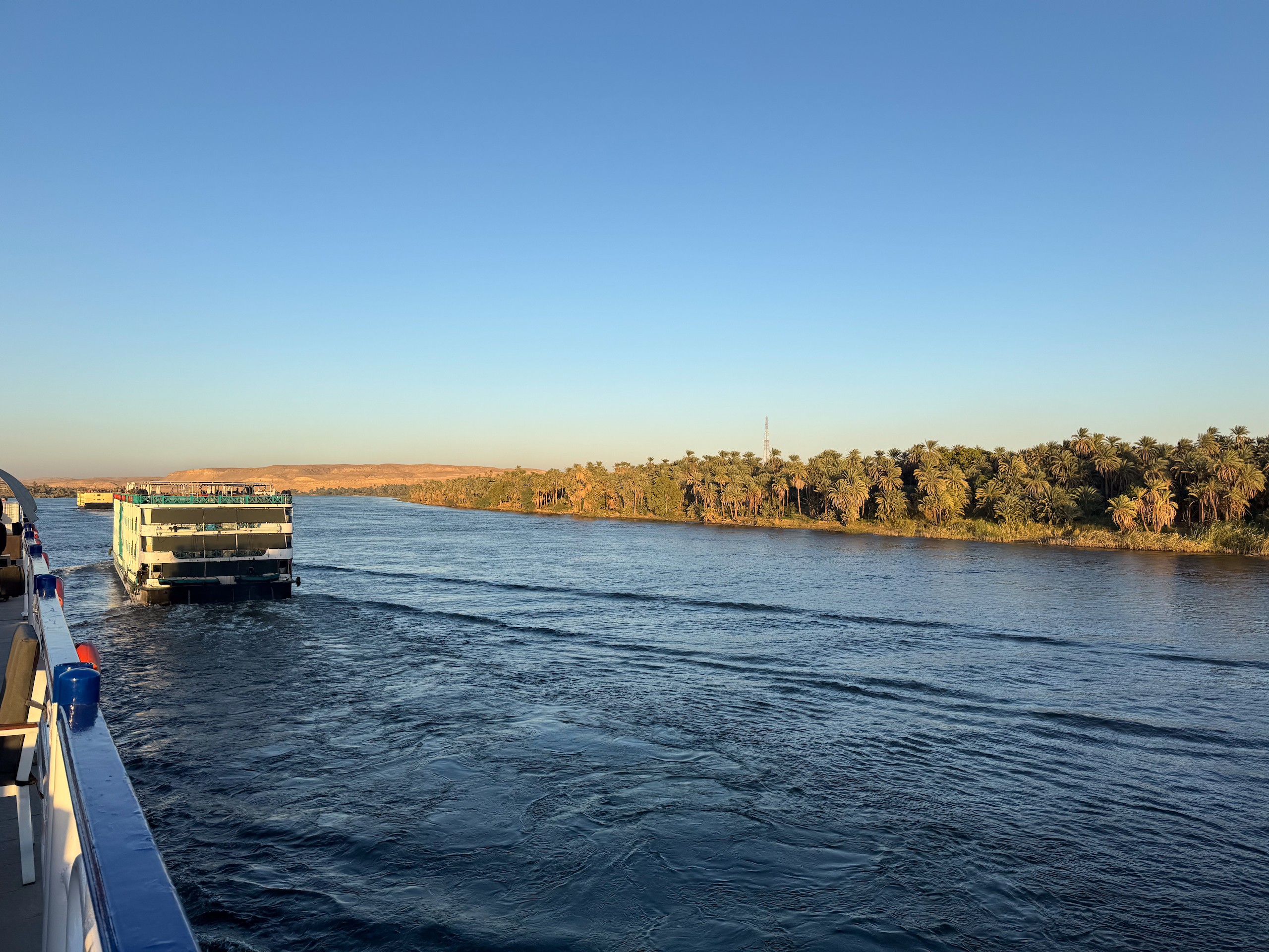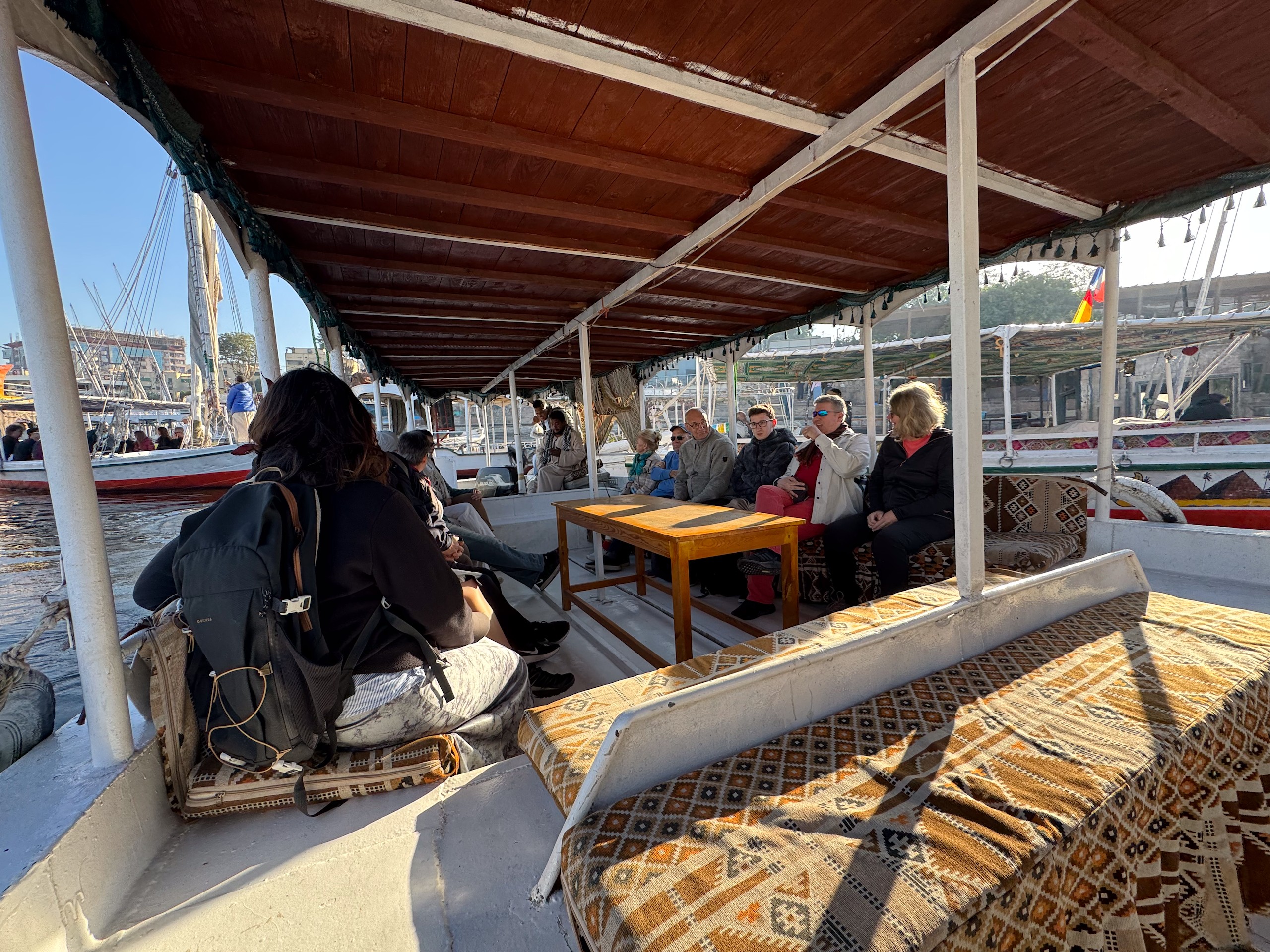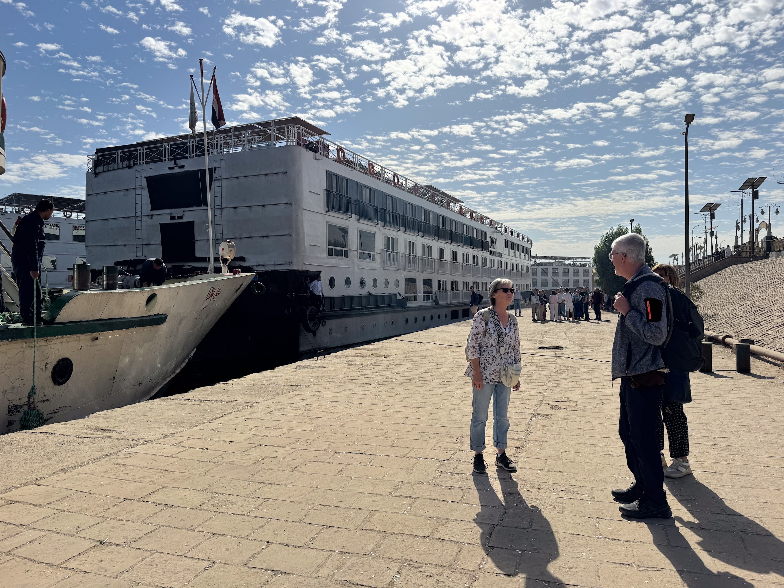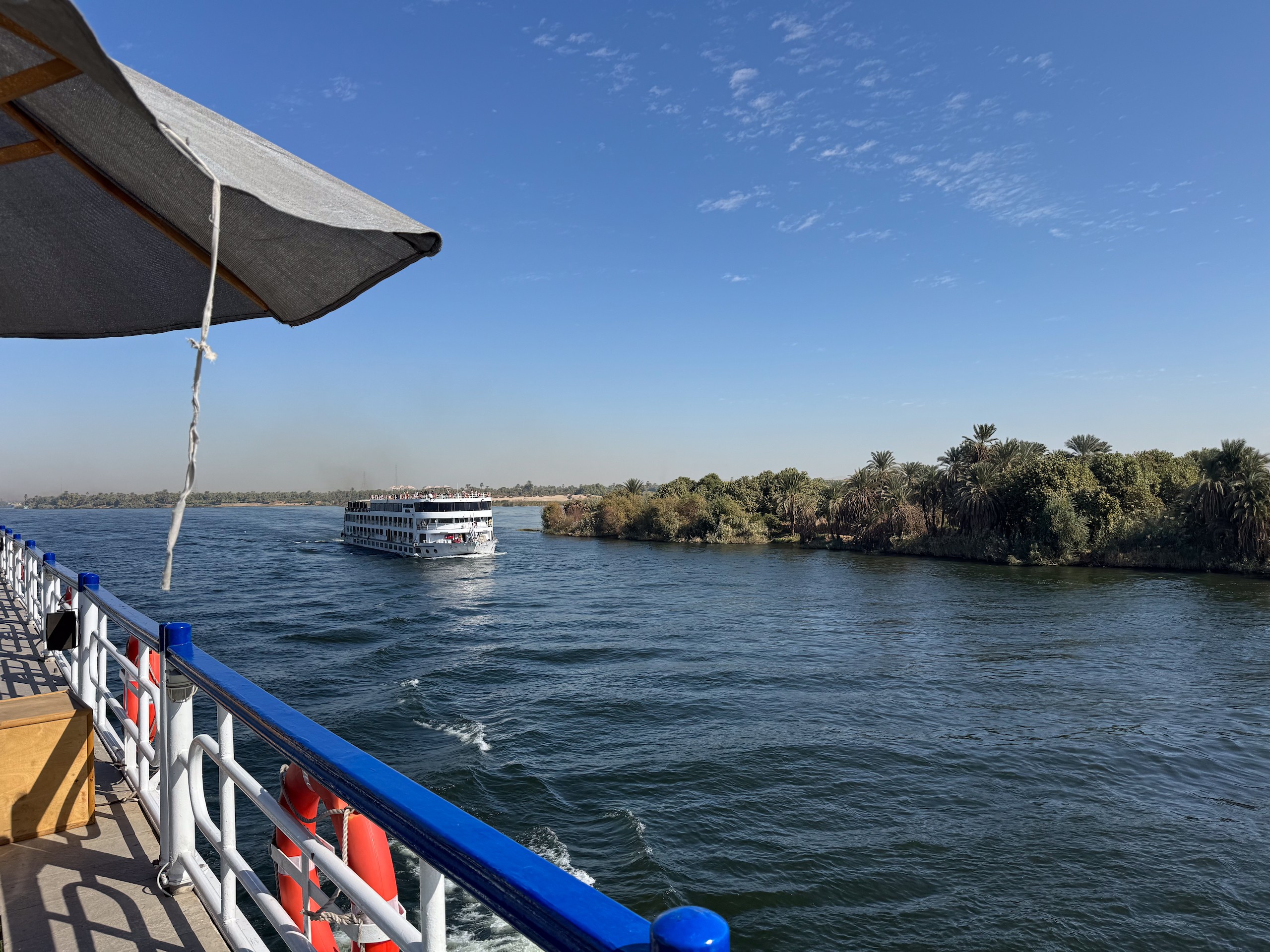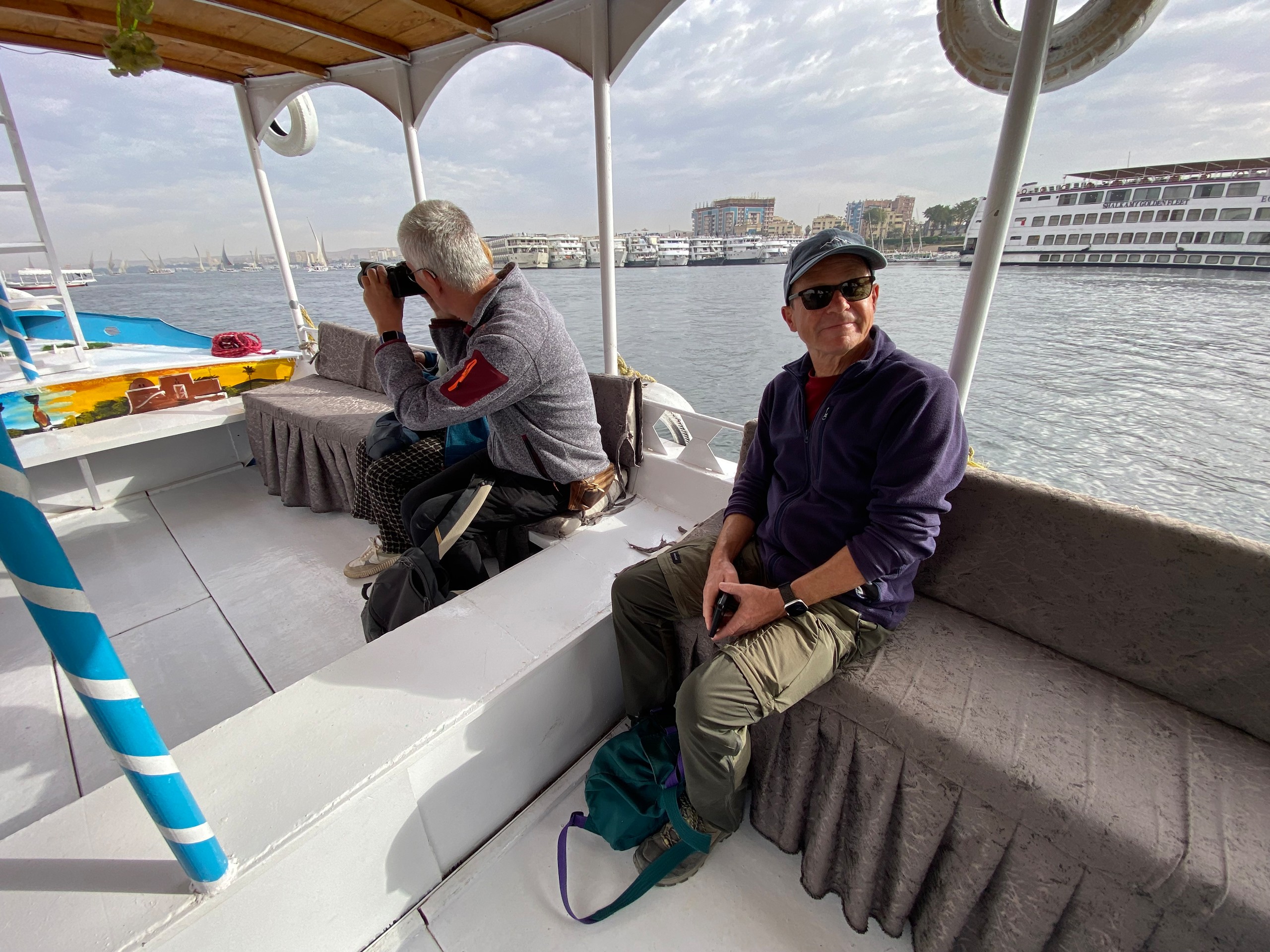 Auch die Rückfahrt ist dann wieder spannend, aber alles geht gut. Am Anleger vermissen wir zuerst unser Schiff, aber anhand des Trackers in Gerd's Koffer, stellen wir fest, dass es hier irgendwo sein muss. Am Ende sehen wir es und erreichen durch verschiedene andere Schiffe laufend unser Boot. Jetzt heisst es, die Nilkreuzfahrt auf dem Sonnendeck geniessen. Die Sonne scheint und wir lassen die Landschaft an uns vorbeiziehen. Heute Nachmittag machen wir dann noch einen weiteren Ausflug zum Tempel Kom Ombo. Aber jetzt erstmal entspannen.