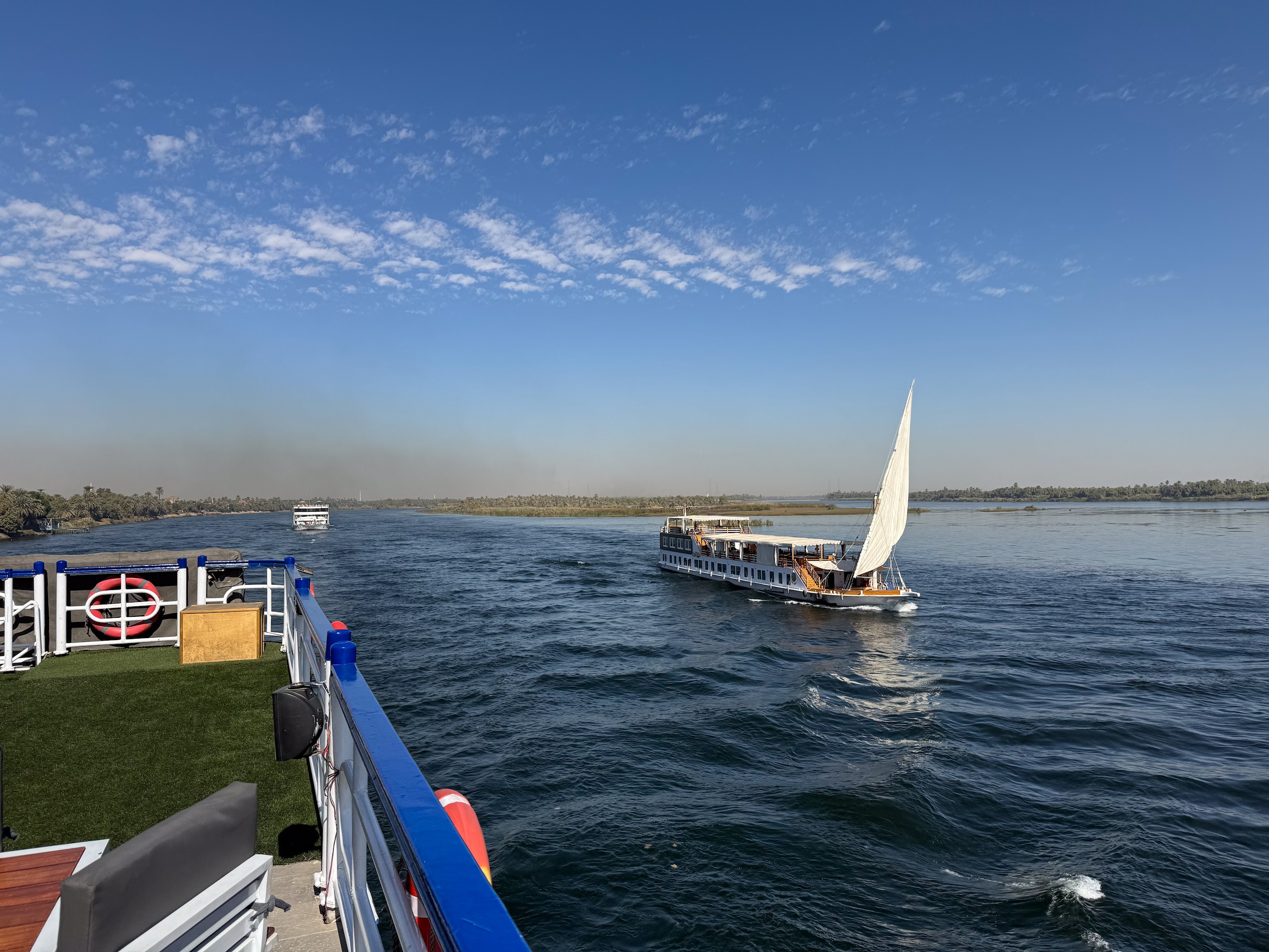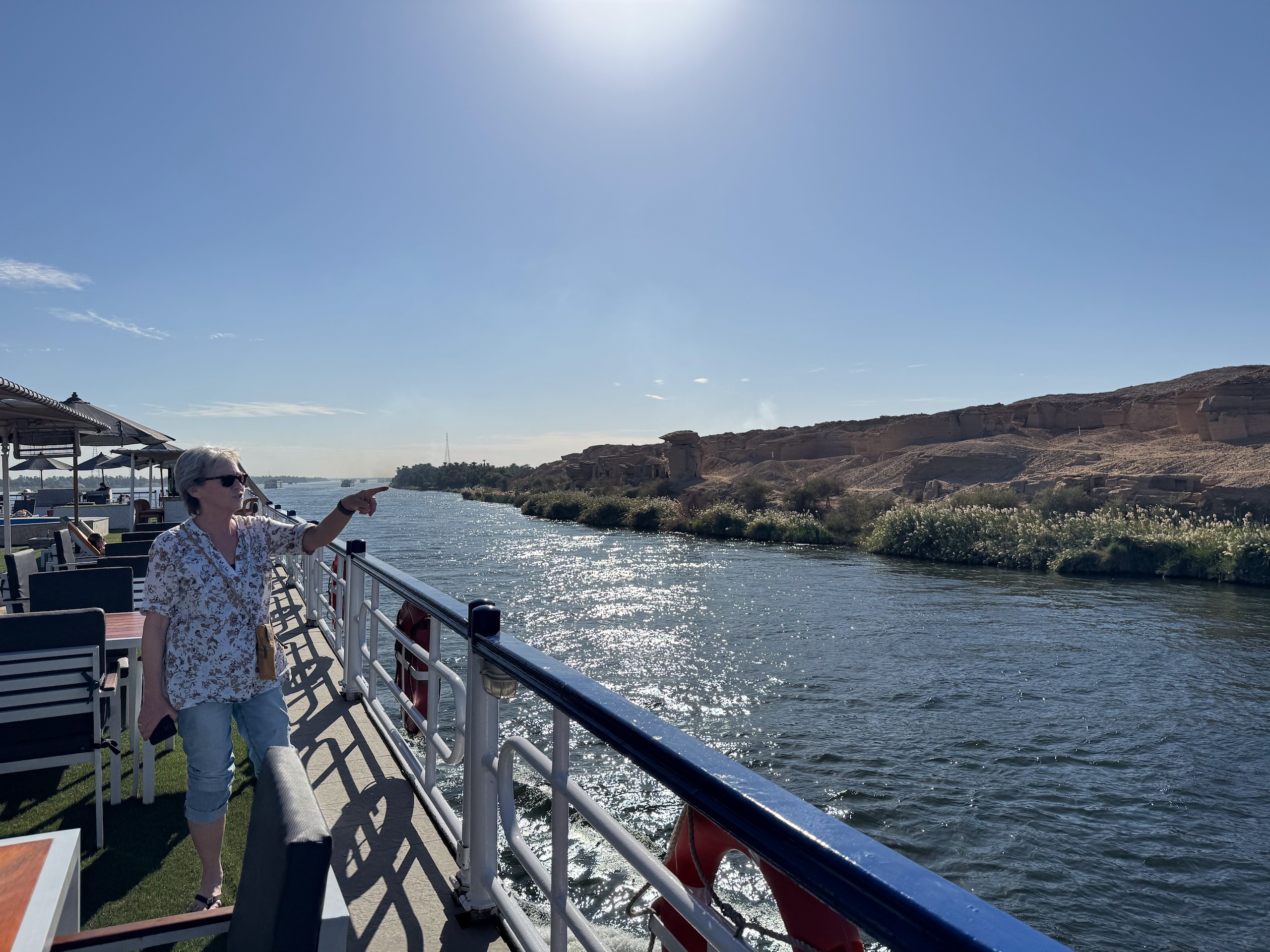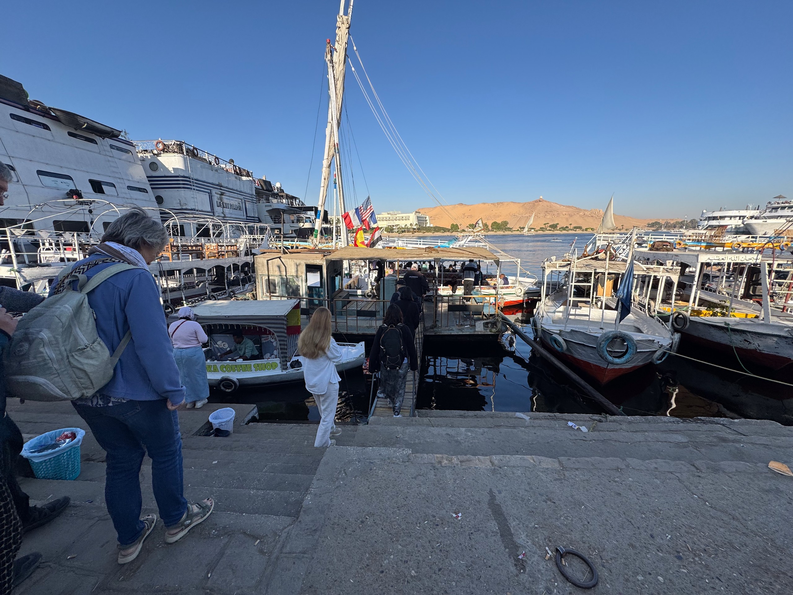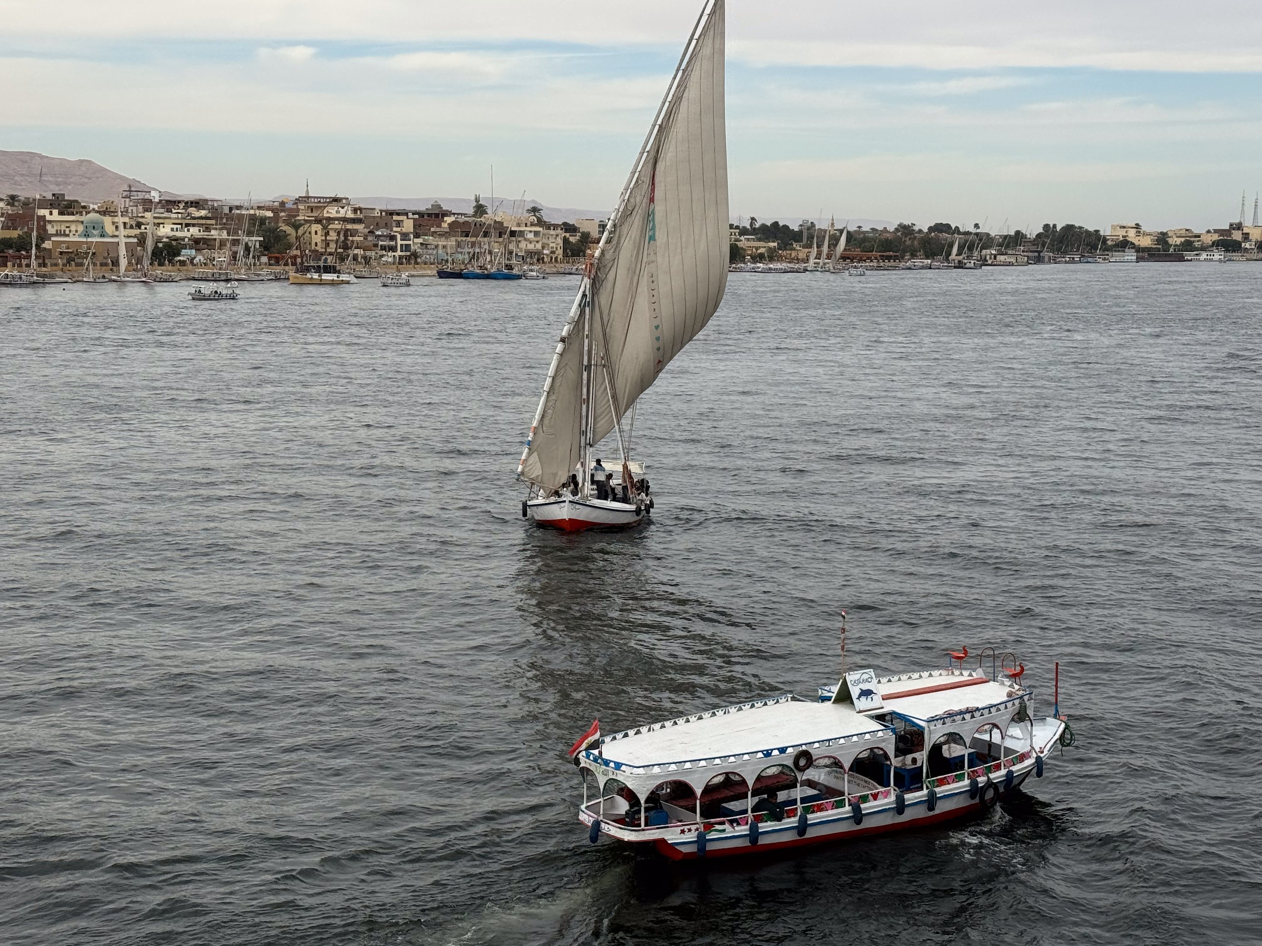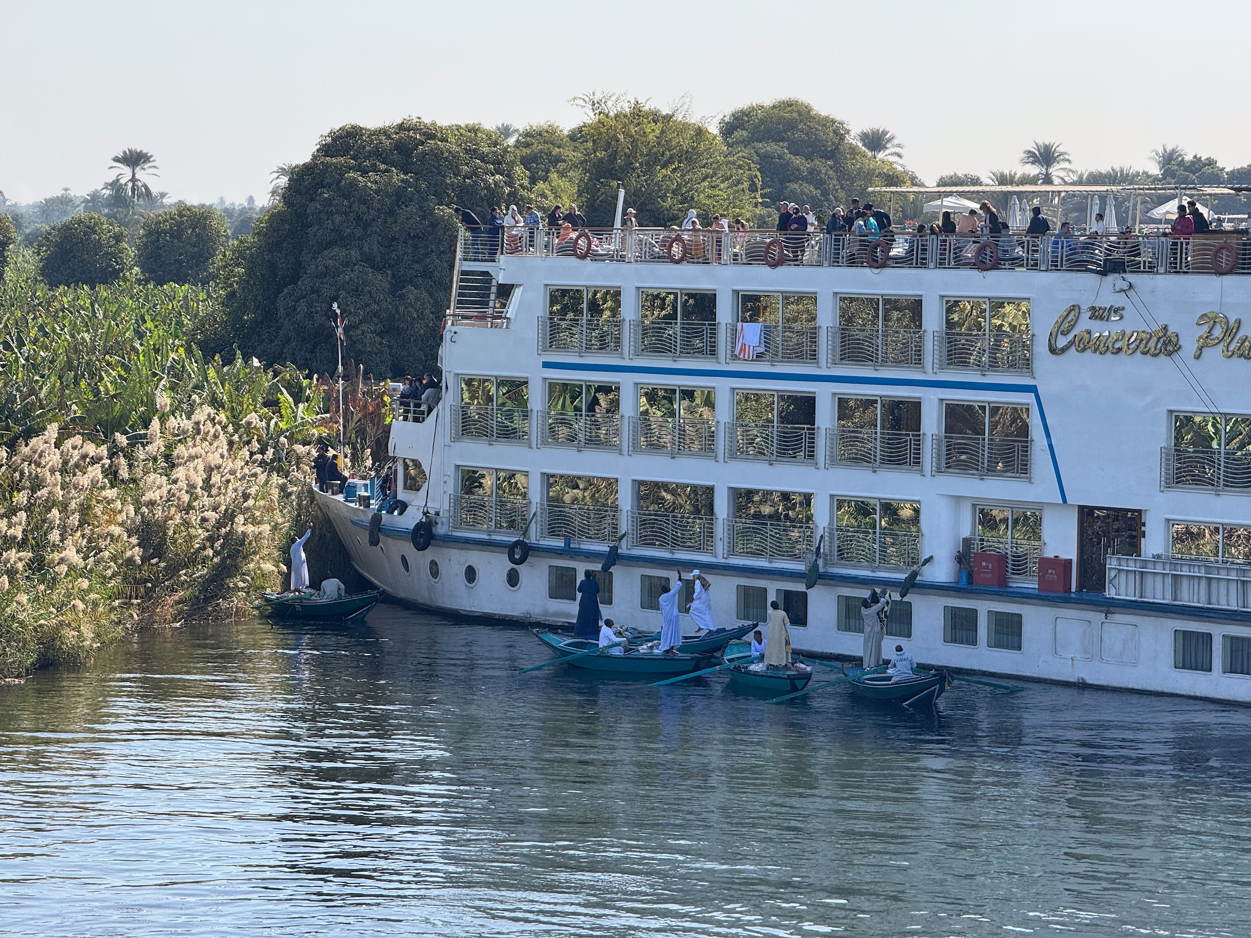 Auch die Rückfahrt ist dann wieder spannend, aber alles geht gut. Am Anleger vermissen wir zuerst unser Schiff, aber anhand des Trackers in Gerd's Koffer, stellen wir fest, dass es hier irgendwo sein muss. Am Ende sehen wir es und erreichen durch verschiedene andere Schiffe laufend unser Boot. Jetzt heisst es, die Nilkreuzfahrt auf dem Sonnendeck geniessen. Die Sonne scheint und wir lassen die Landschaft an uns vorbeiziehen. Heute Nachmittag machen wir dann noch einen weiteren Ausflug zum Tempel Kom Ombo. Aber jetzt erstmal entspannen.
