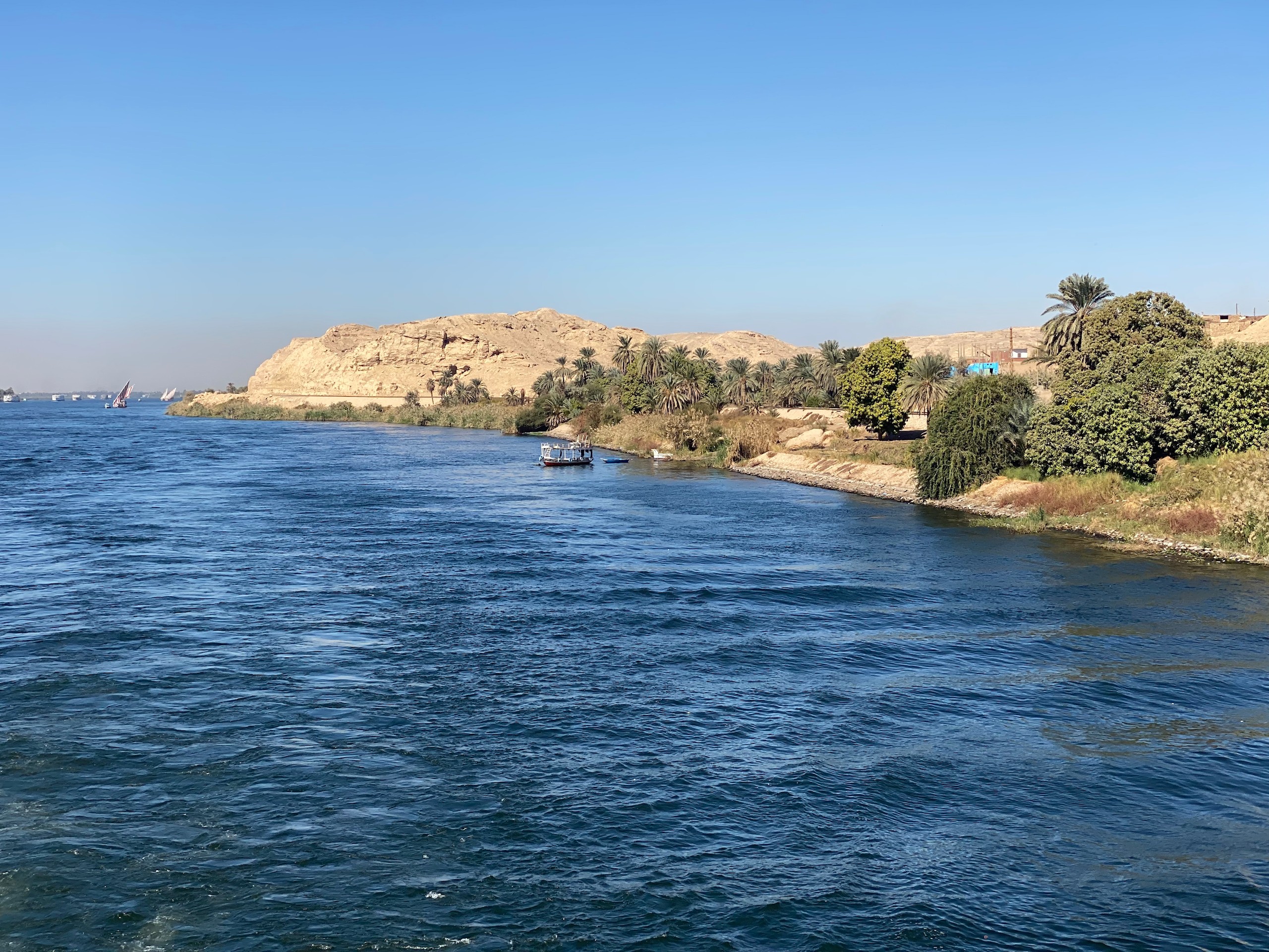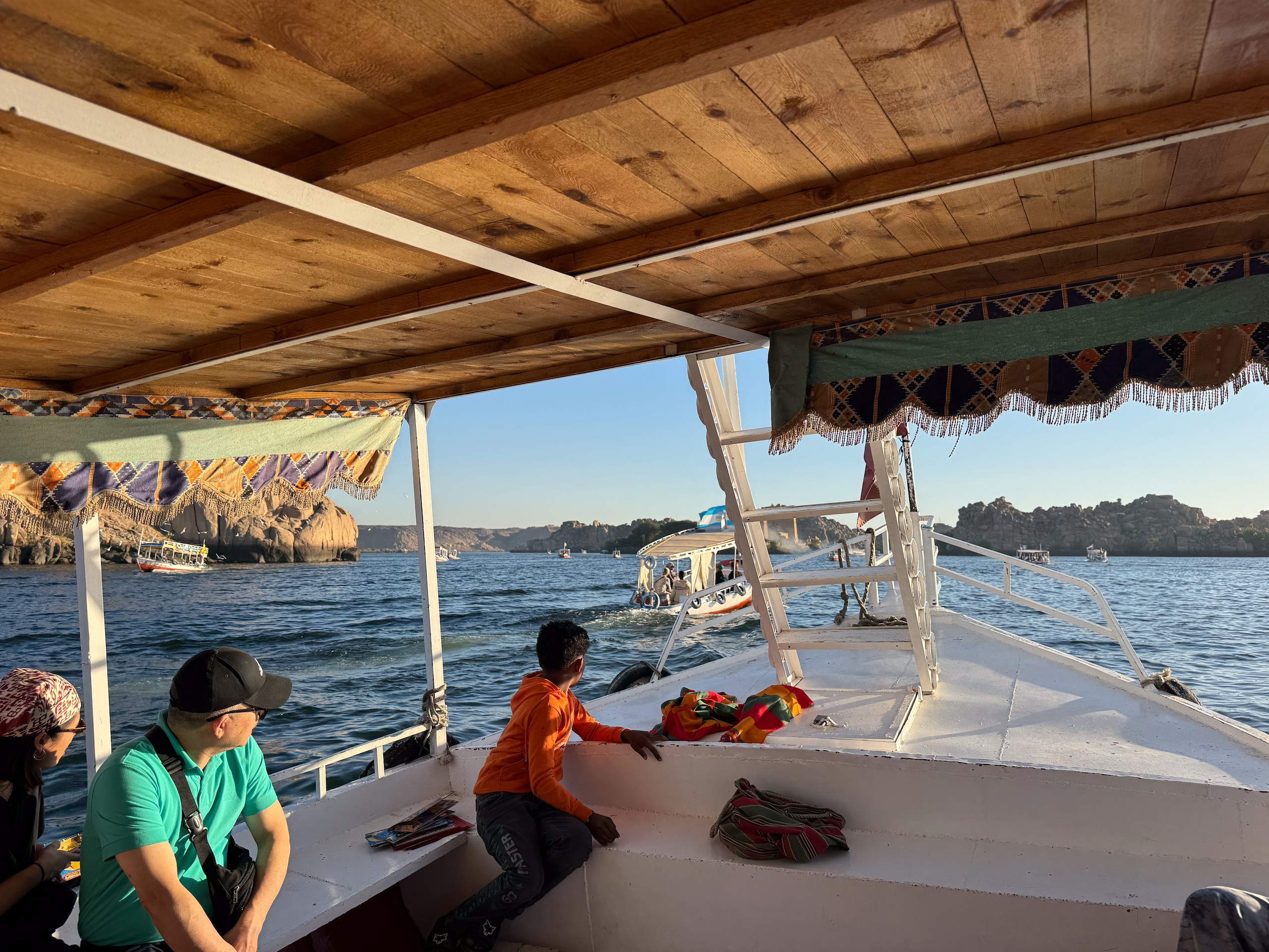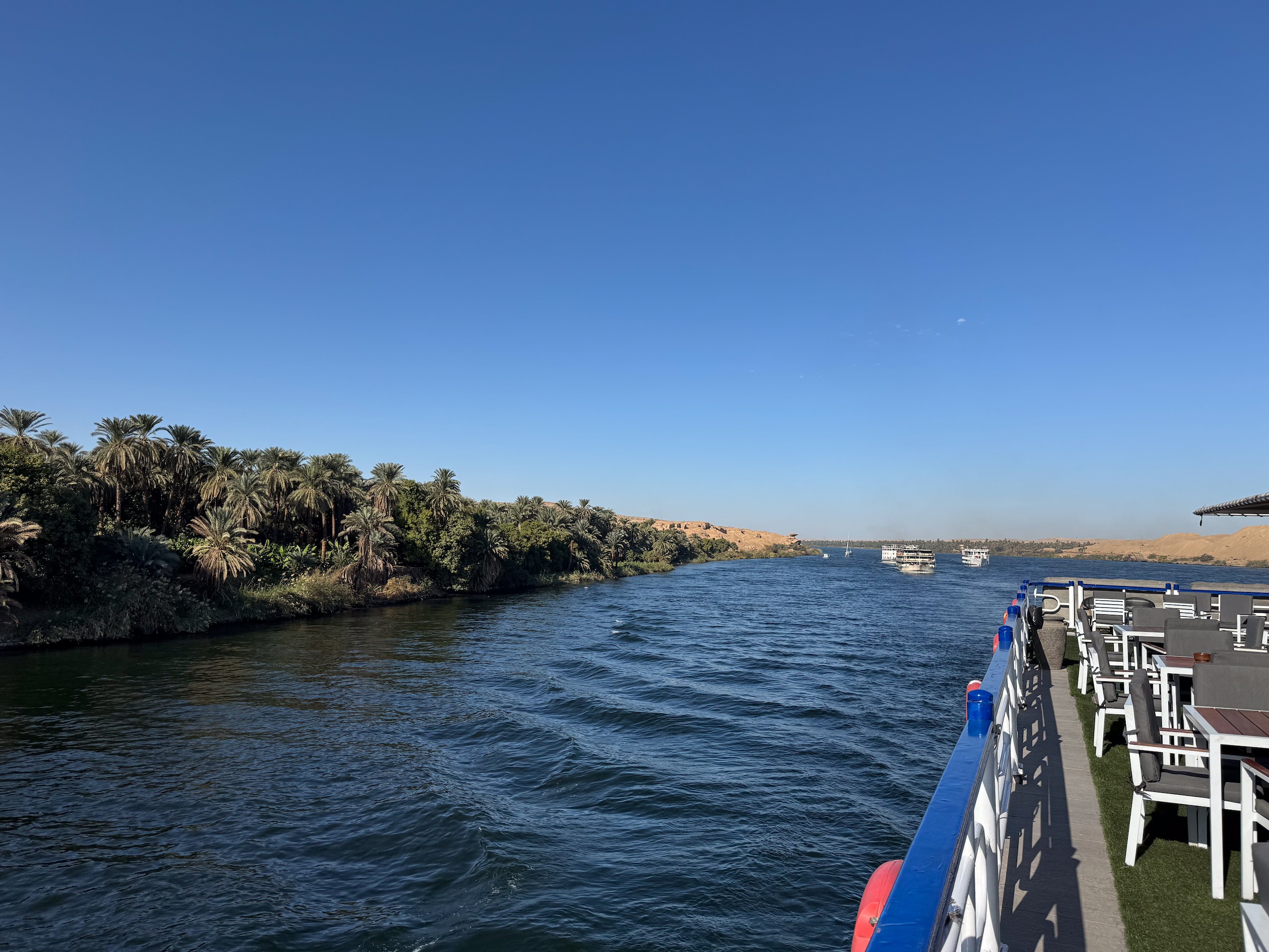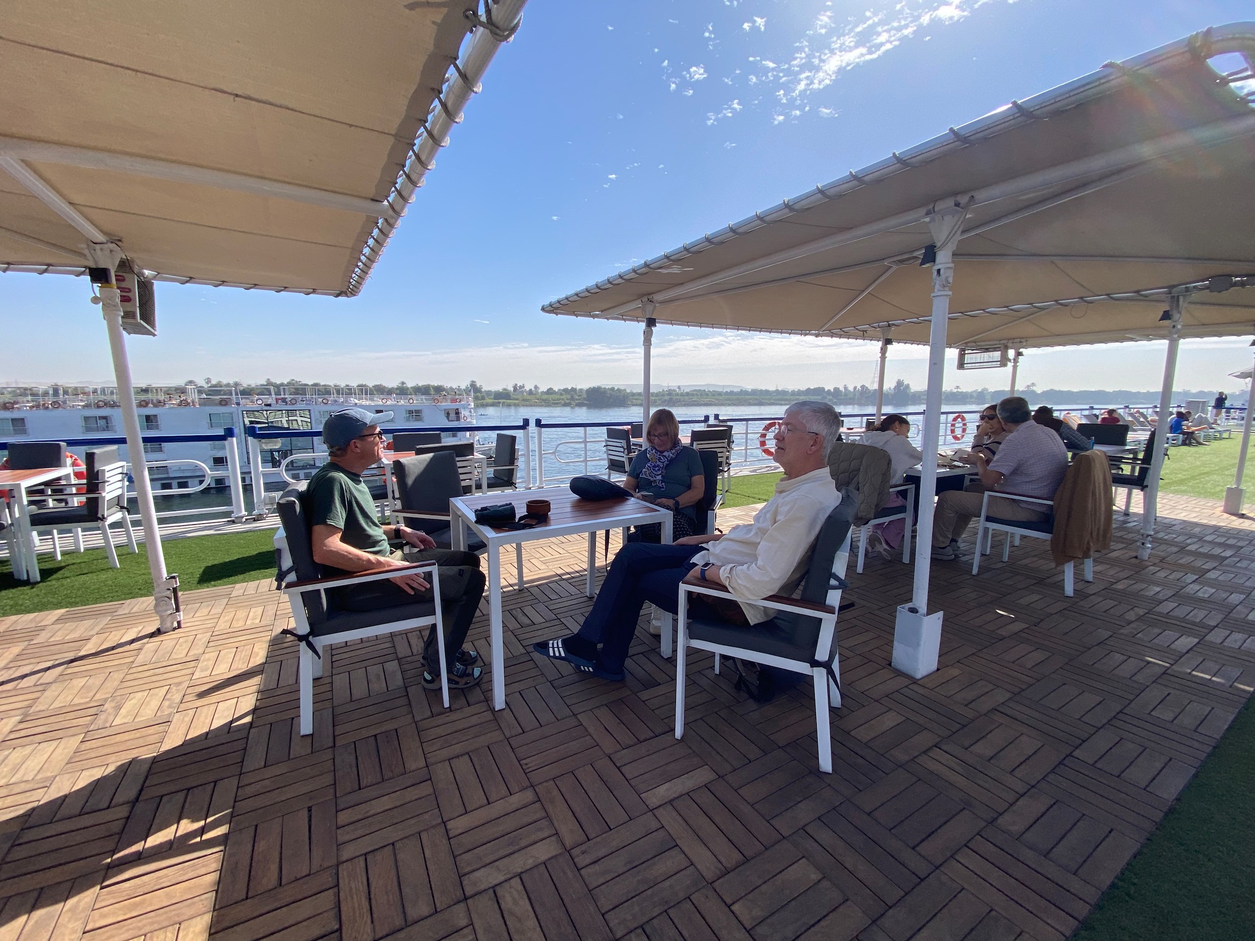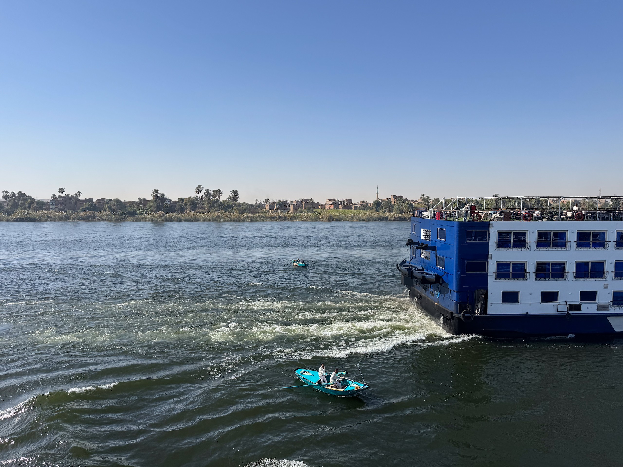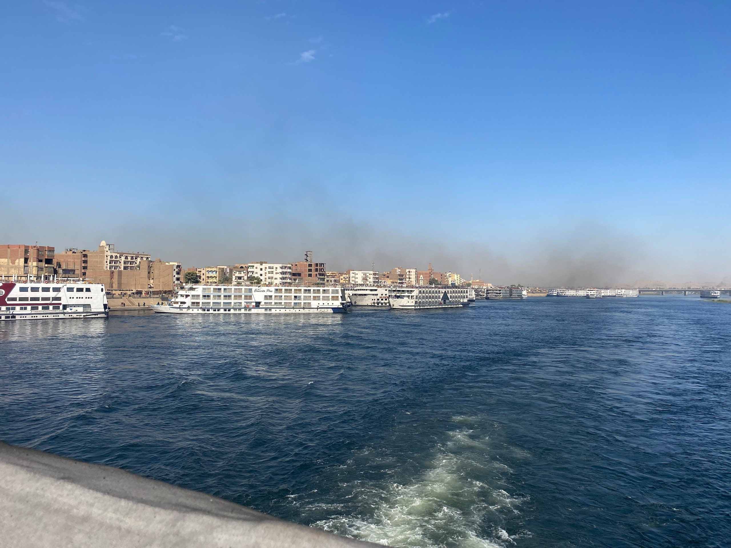 Auch die Rückfahrt ist dann wieder spannend, aber alles geht gut. Am Anleger vermissen wir zuerst unser Schiff, aber anhand des Trackers in Gerd's Koffer, stellen wir fest, dass es hier irgendwo sein muss. Am Ende sehen wir es und erreichen durch verschiedene andere Schiffe laufend unser Boot. Jetzt heisst es, die Nilkreuzfahrt auf dem Sonnendeck geniessen. Die Sonne scheint und wir lassen die Landschaft an uns vorbeiziehen. Heute Nachmittag machen wir dann noch einen weiteren Ausflug zum Tempel Kom Ombo. Aber jetzt erstmal entspannen.