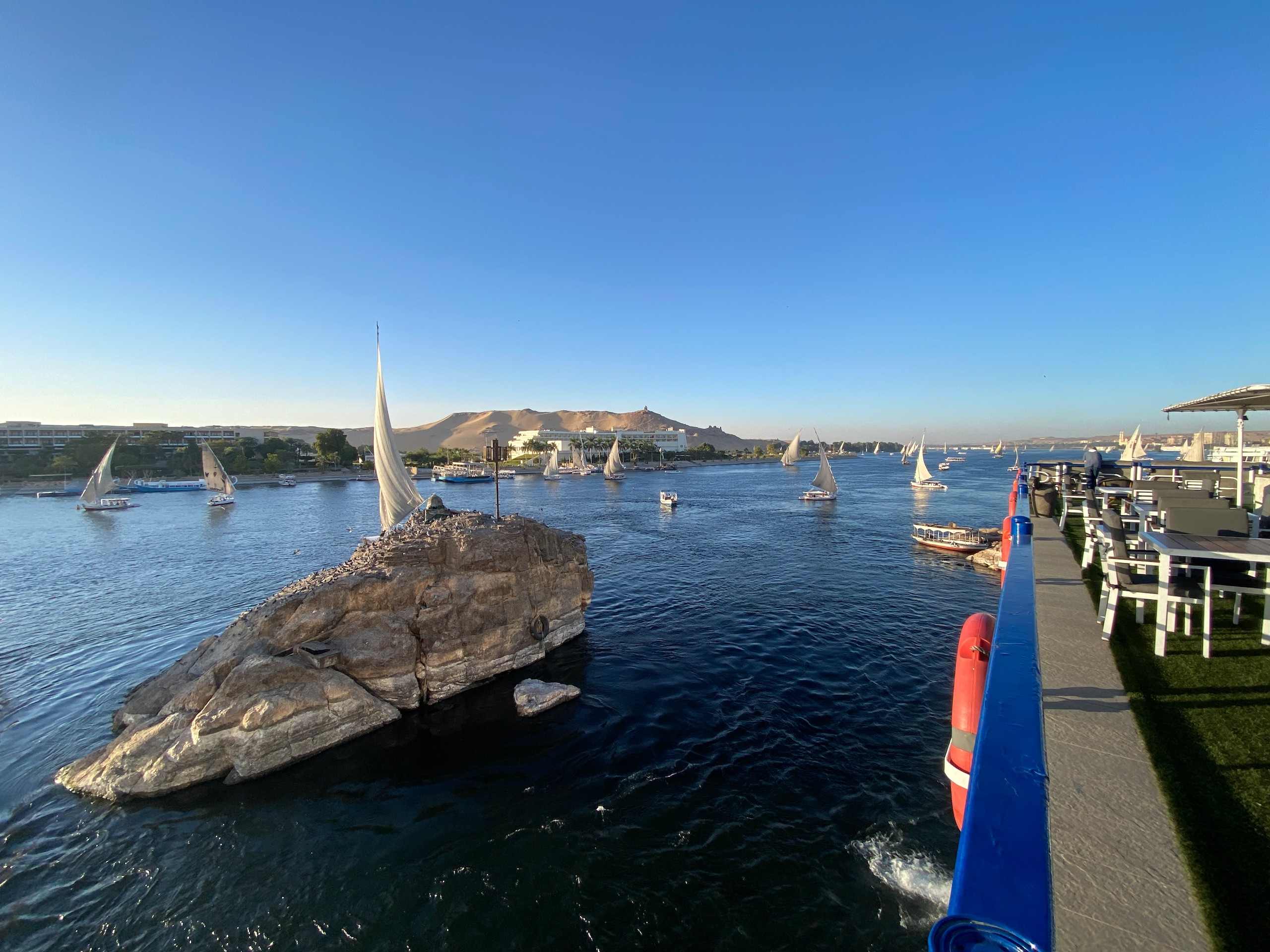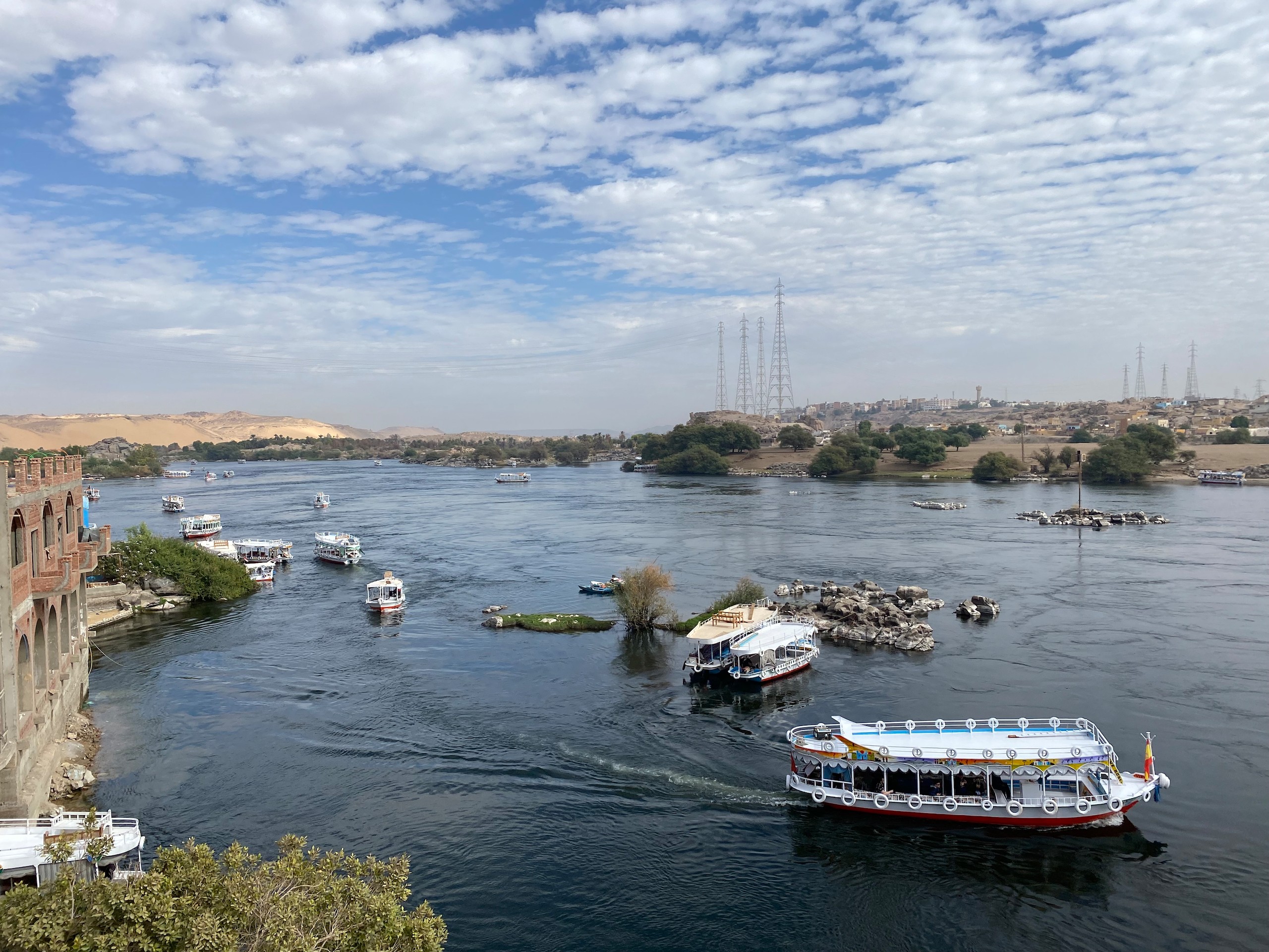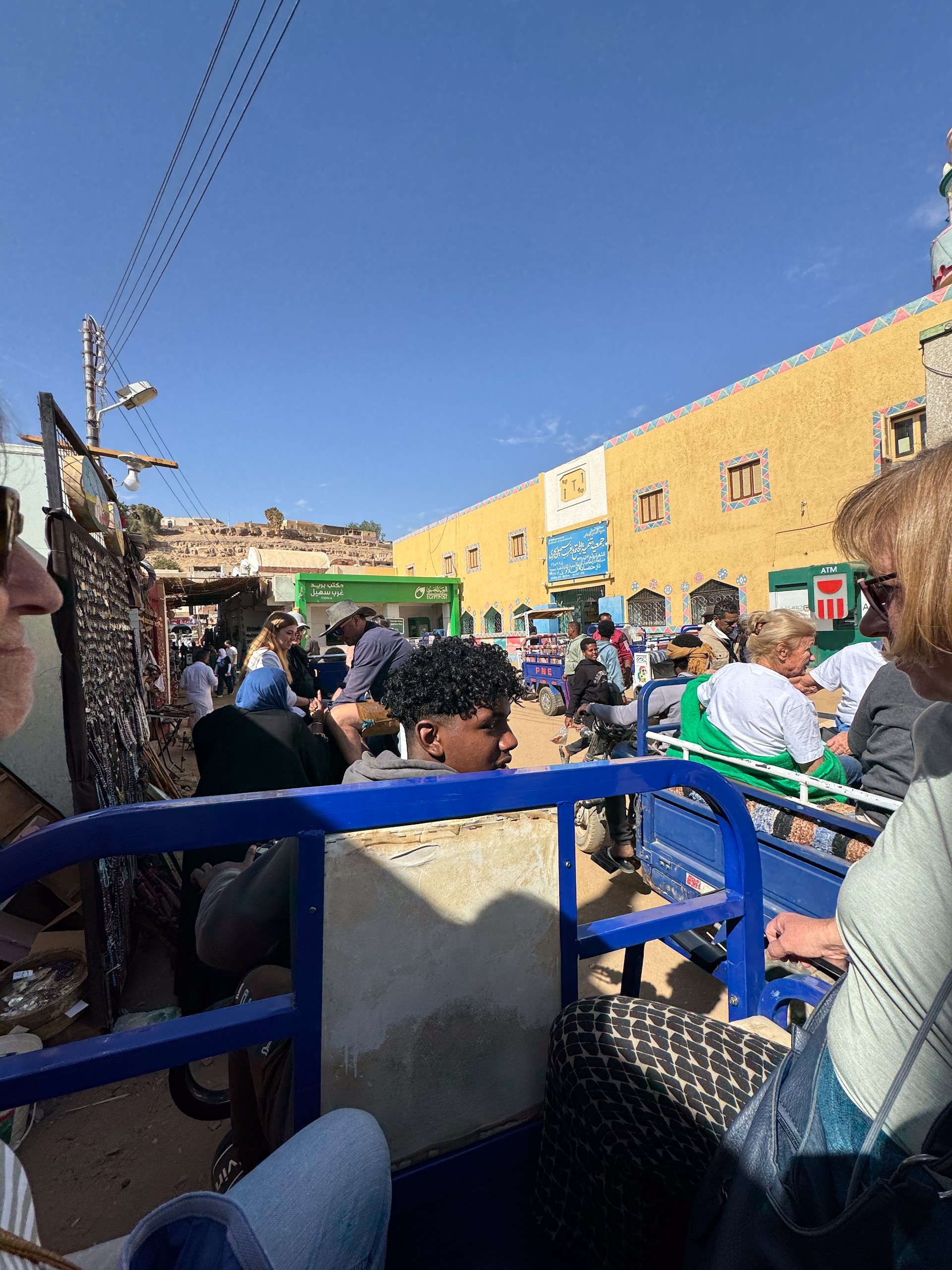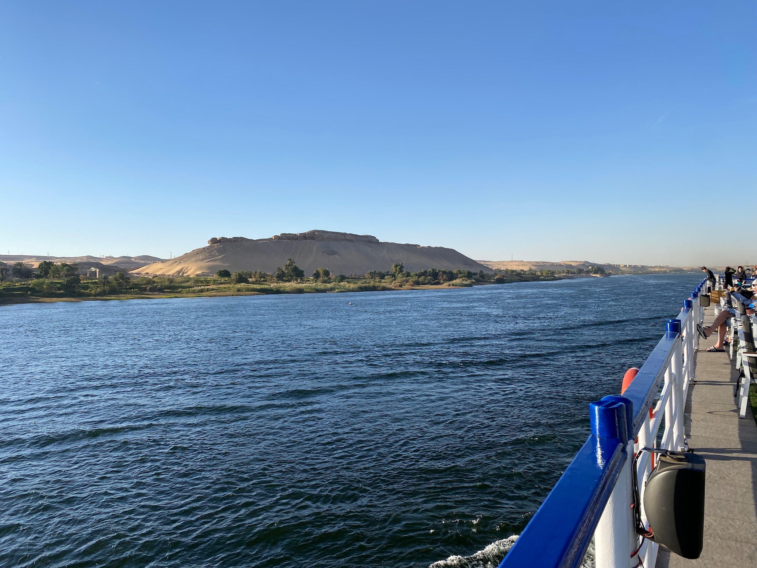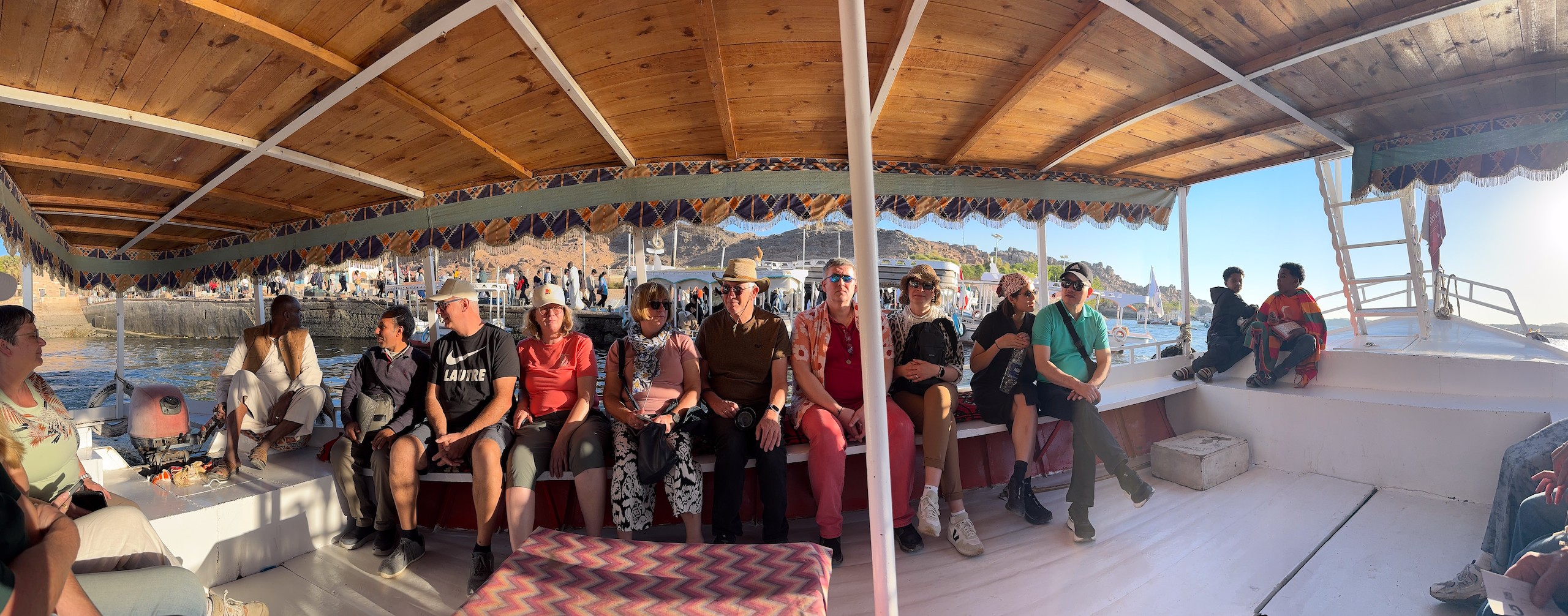 Auch die Rückfahrt ist dann wieder spannend, aber alles geht gut. Am Anleger vermissen wir zuerst unser Schiff, aber anhand des Trackers in Gerd's Koffer, stellen wir fest, dass es hier irgendwo sein muss. Am Ende sehen wir es und erreichen durch verschiedene andere Schiffe laufend unser Boot. Jetzt heisst es, die Nilkreuzfahrt auf dem Sonnendeck geniessen. Die Sonne scheint und wir lassen die Landschaft an uns vorbeiziehen. Heute Nachmittag machen wir dann noch einen weiteren Ausflug zum Tempel Kom Ombo. Aber jetzt erstmal entspannen.
