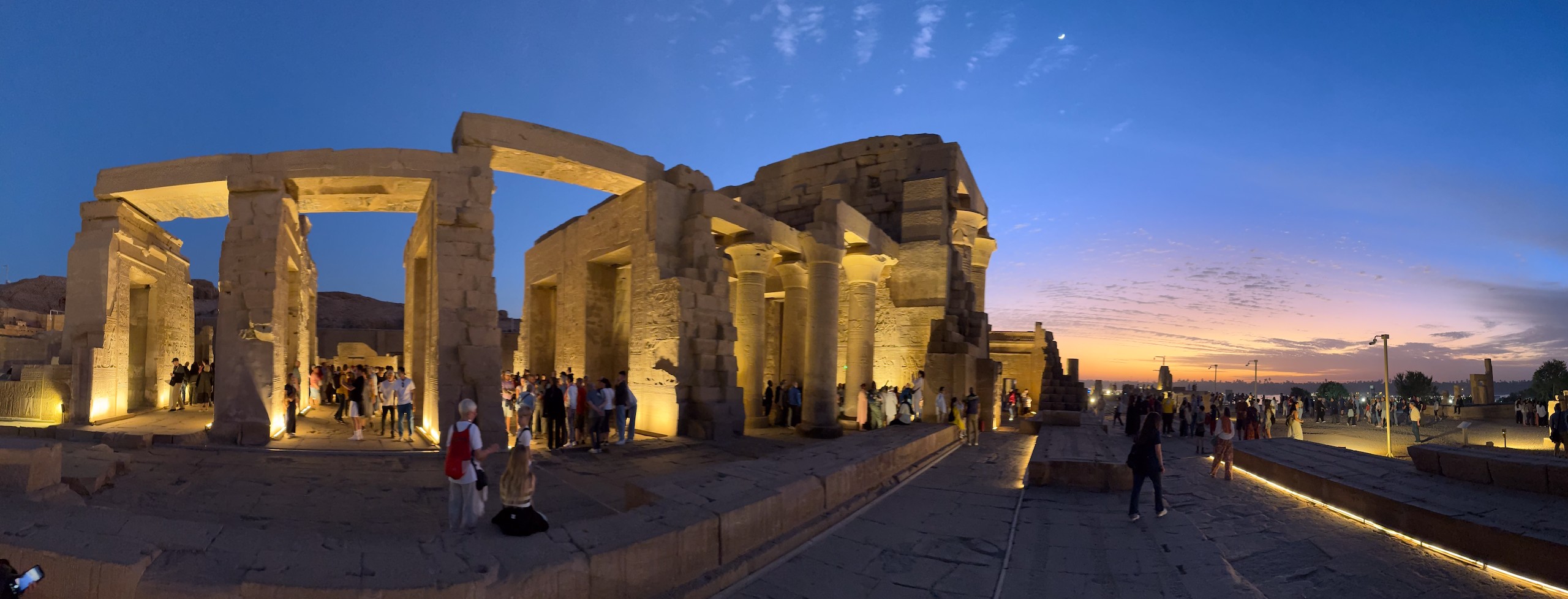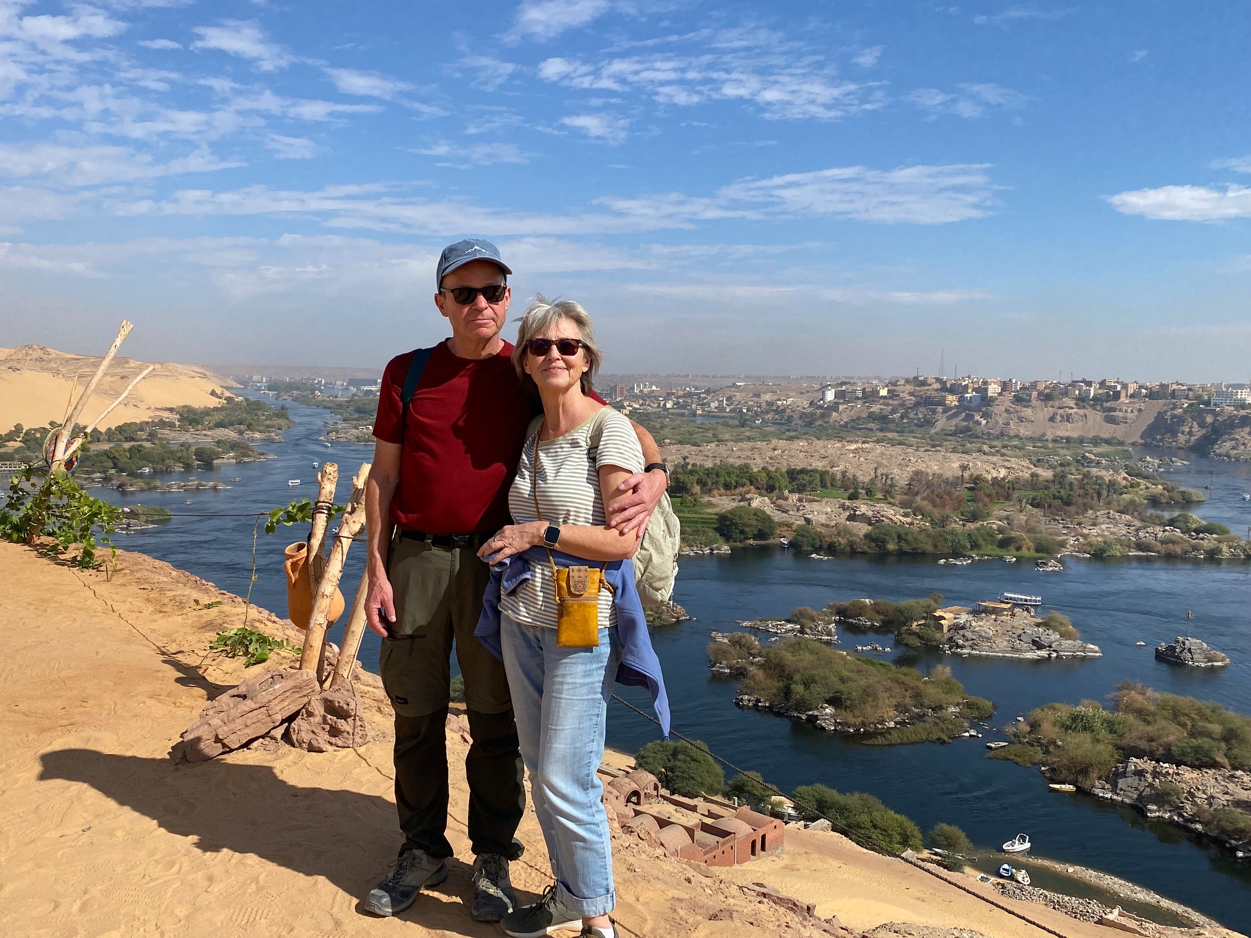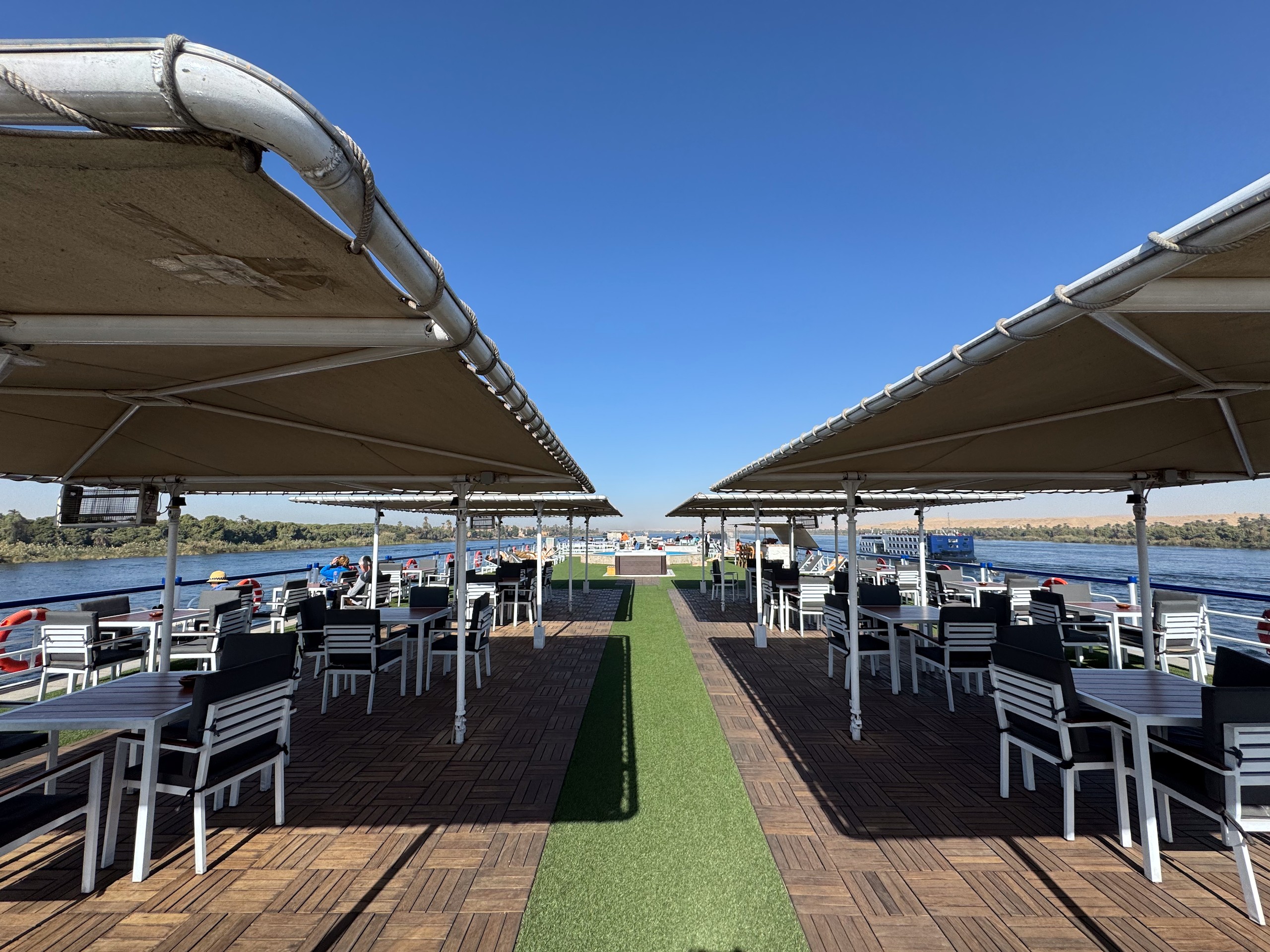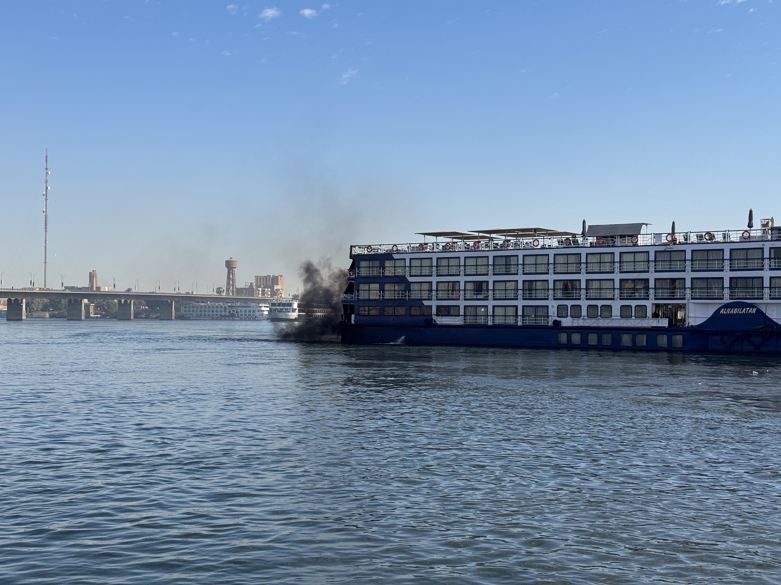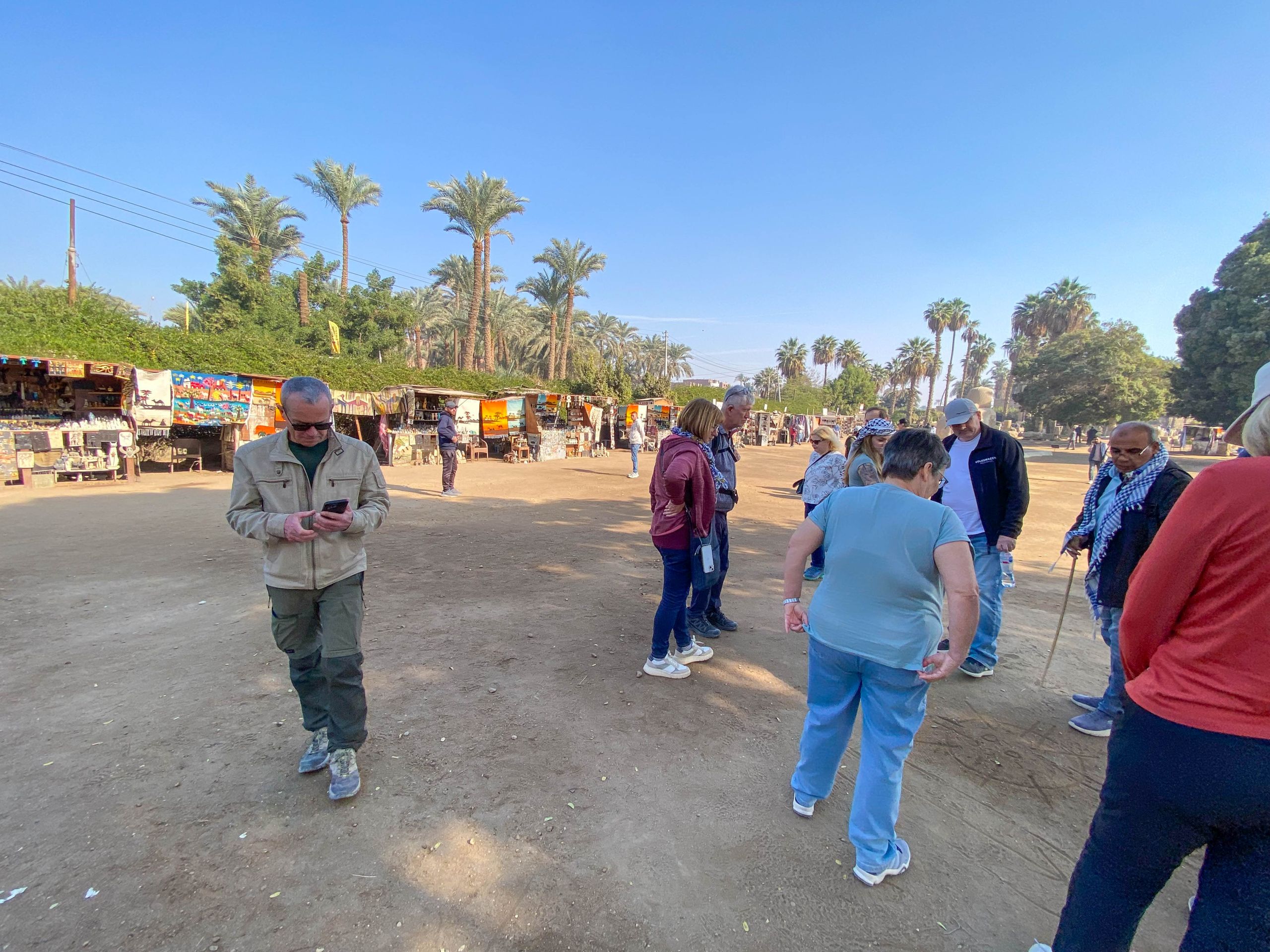 Auch die Rückfahrt ist dann wieder spannend, aber alles geht gut. Am Anleger vermissen wir zuerst unser Schiff, aber anhand des Trackers in Gerd's Koffer, stellen wir fest, dass es hier irgendwo sein muss. Am Ende sehen wir es und erreichen durch verschiedene andere Schiffe laufend unser Boot. Jetzt heisst es, die Nilkreuzfahrt auf dem Sonnendeck geniessen. Die Sonne scheint und wir lassen die Landschaft an uns vorbeiziehen. Heute Nachmittag machen wir dann noch einen weiteren Ausflug zum Tempel Kom Ombo. Aber jetzt erstmal entspannen.