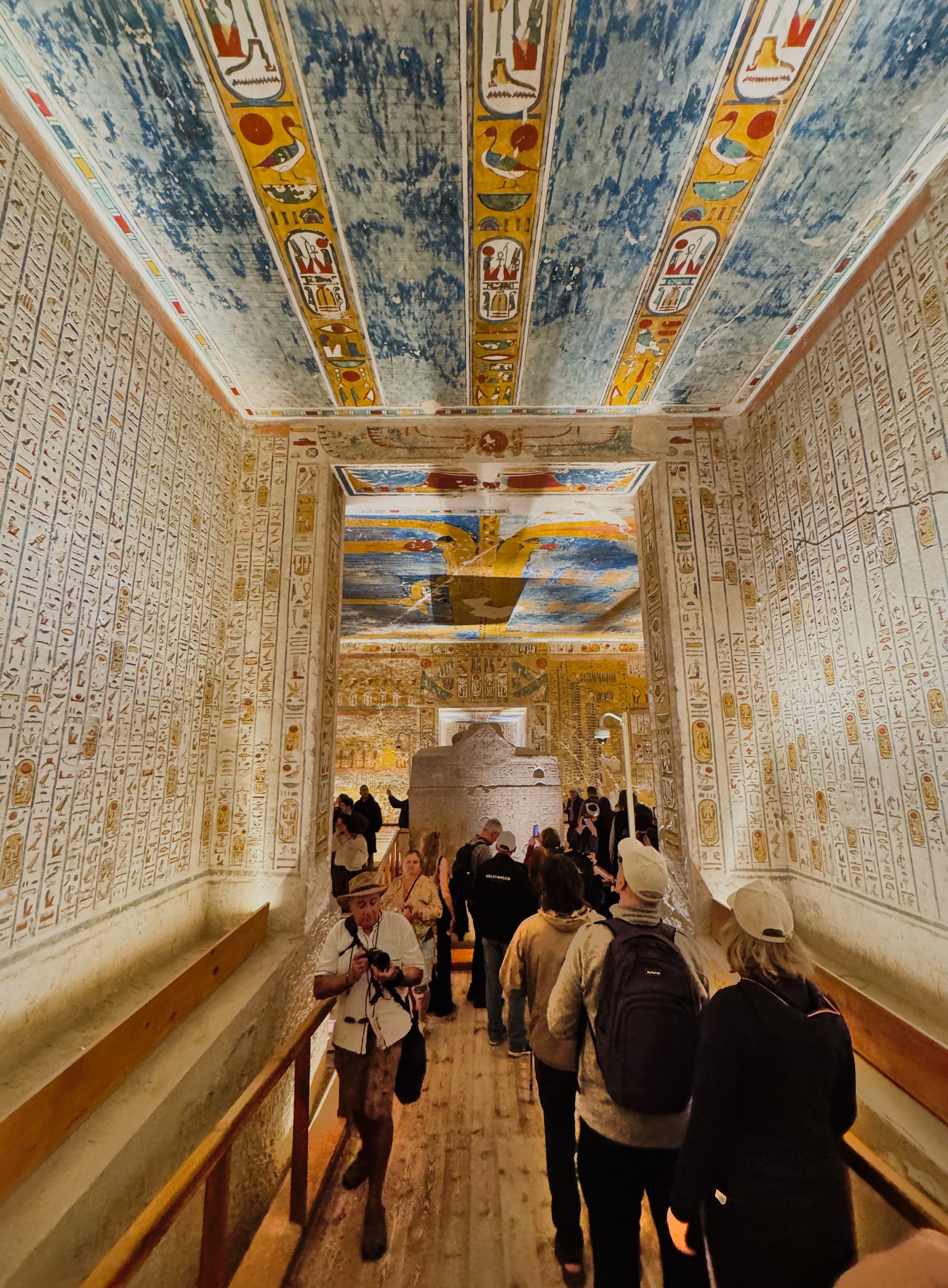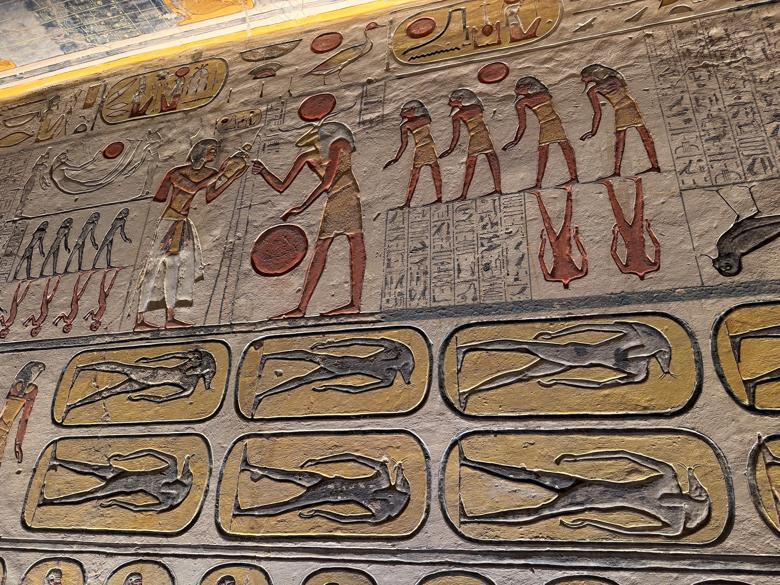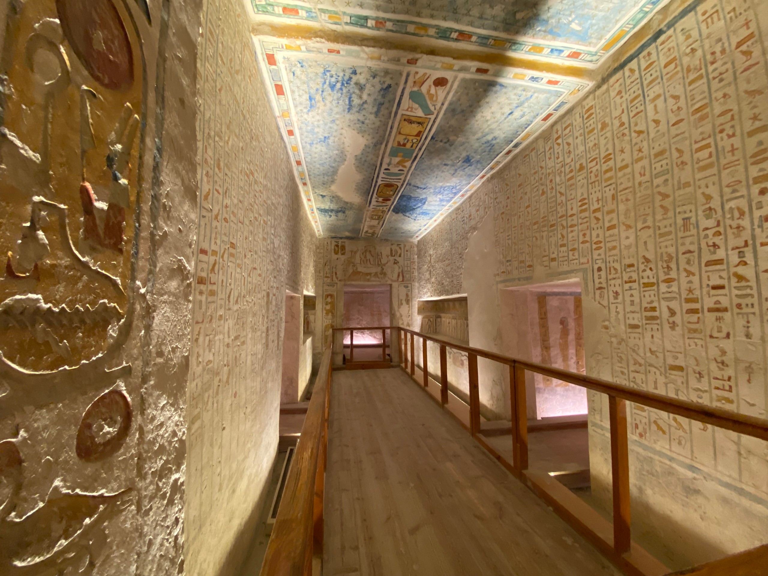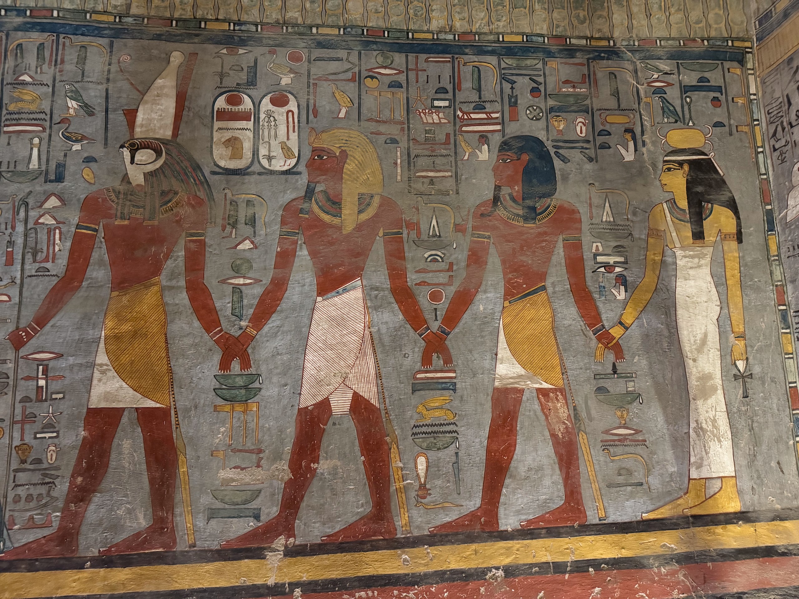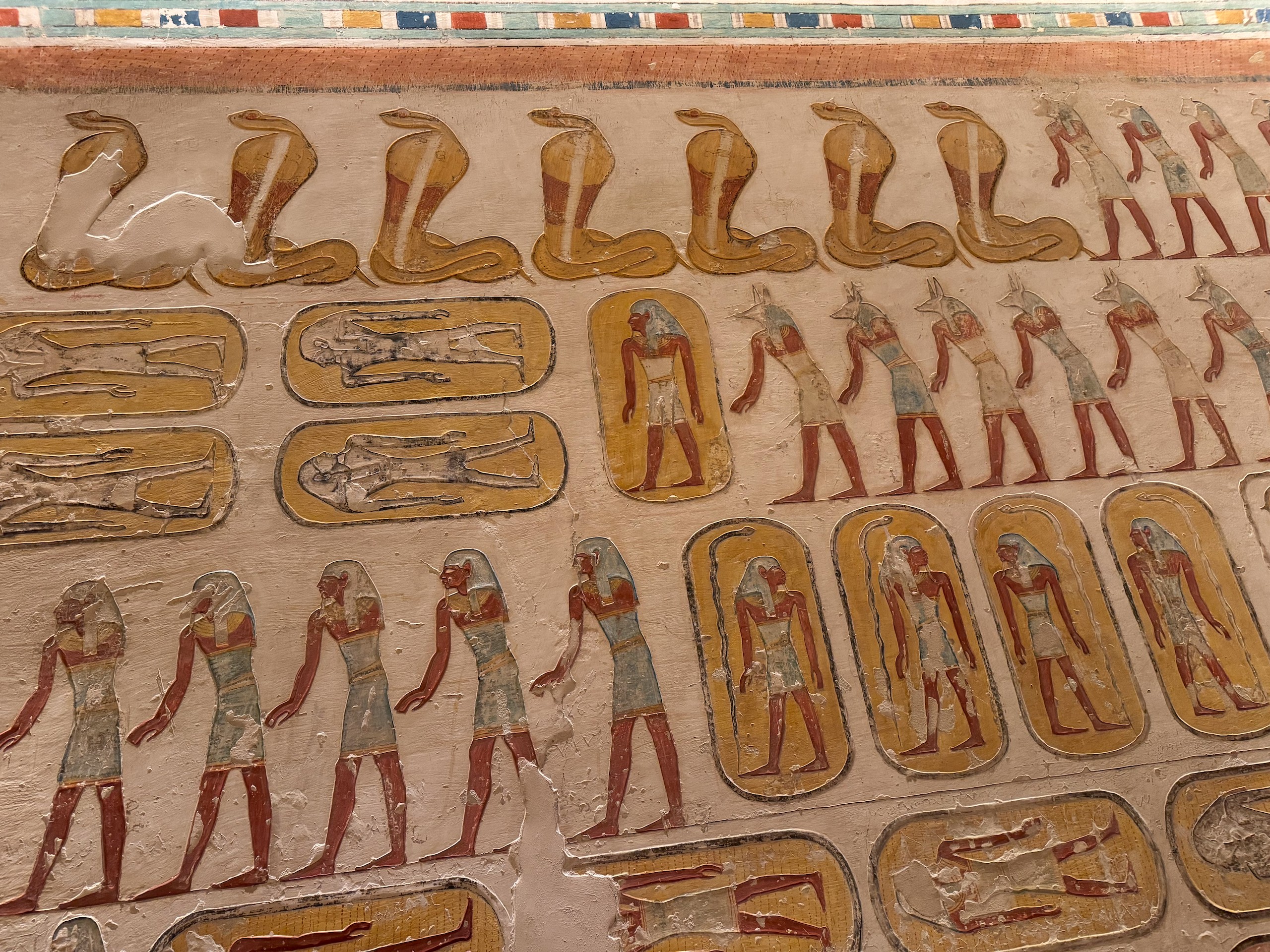 Im Tal der Könige sind aus Konservierungsgründen nie alle Gräber gleichzeitig für die Öffentlichkeit zugänglich. Es wird ein Rotationssystem genutzt, um die empfindlichen Wandmalereien vor Feuchtigkeit und Kohlendioxid zu schützen. Im Standardticket, welches wir haben, ist der Besuch von drei der acht geöffneten Gräbern inklusive. Es gibt aber auch noch weitere Gräber mit Sondergenehmigung und natürlich einer Zusatzgebühr, wie das Grab von Tutanchamun und Sethos I., welche wir aber nicht besucht haben. Die folgenden Bilder ähneln sich vielfach vielleicht und sind trotzdem nur ein Bruchteil der gemachten Aufnahmen.