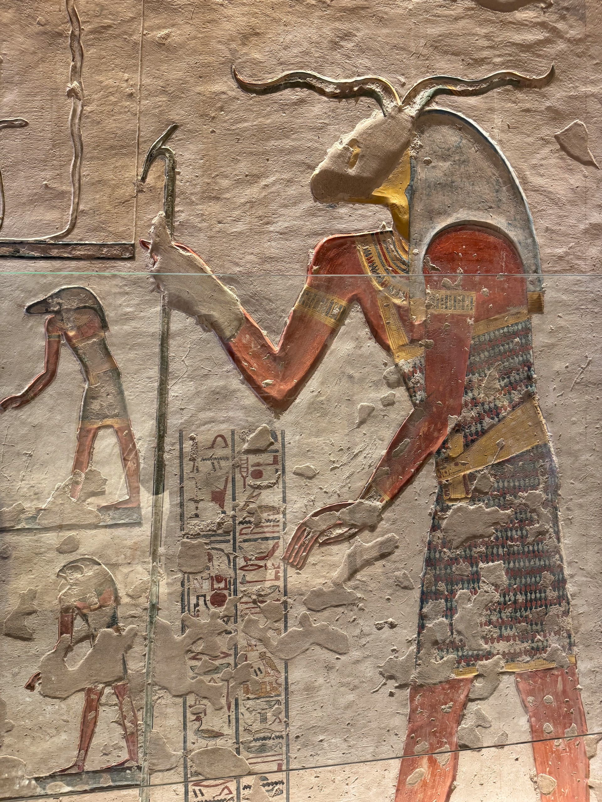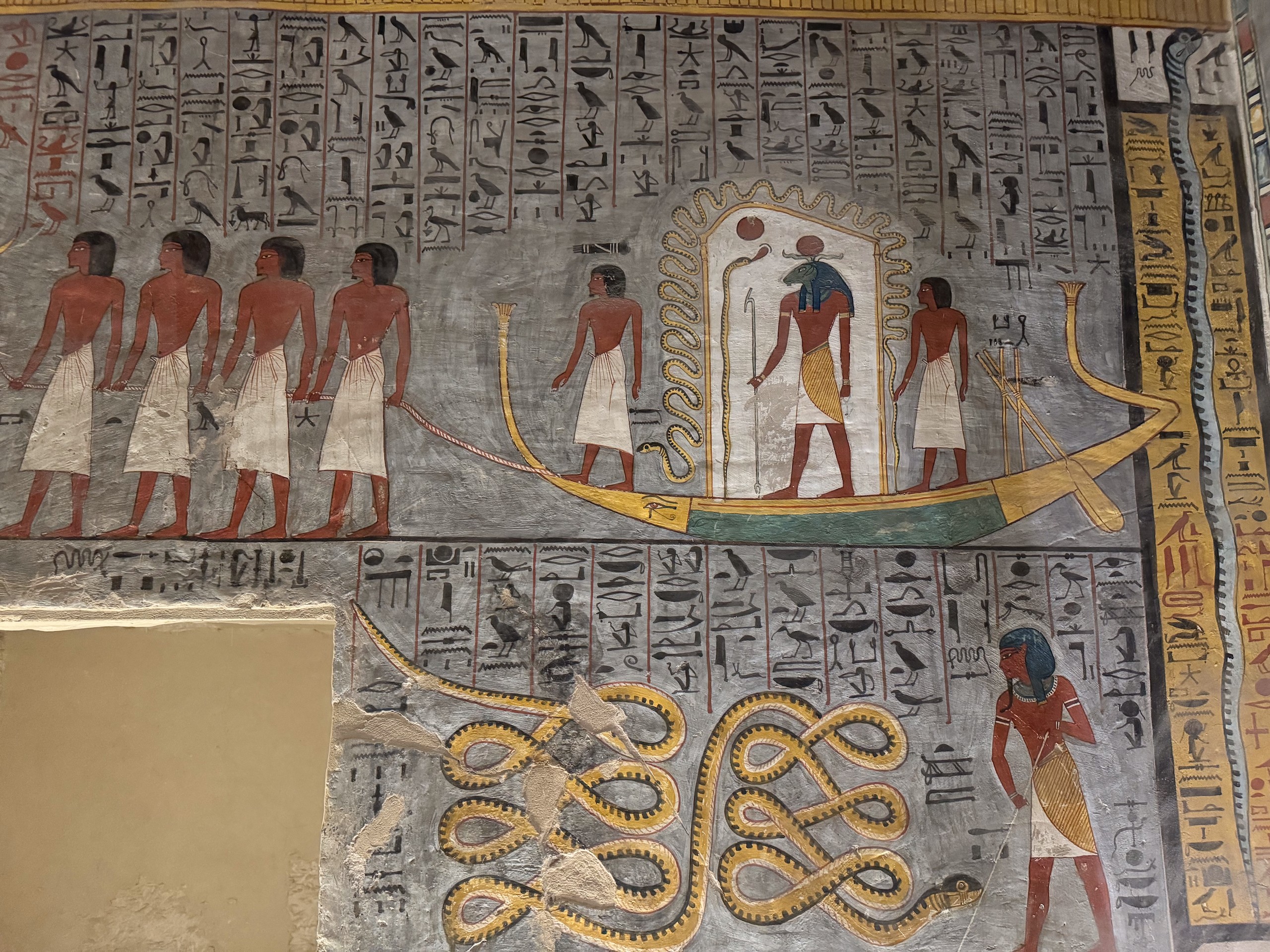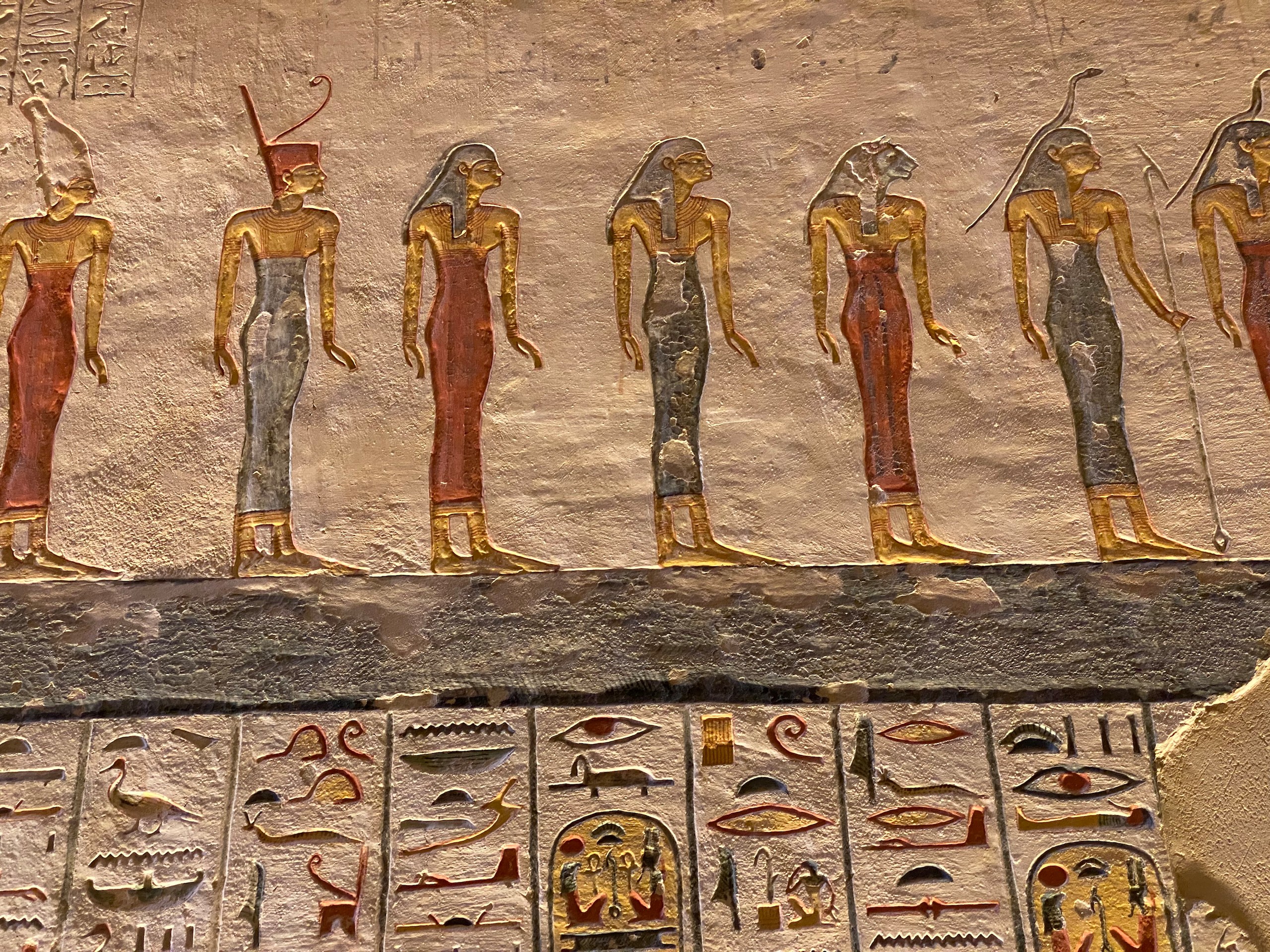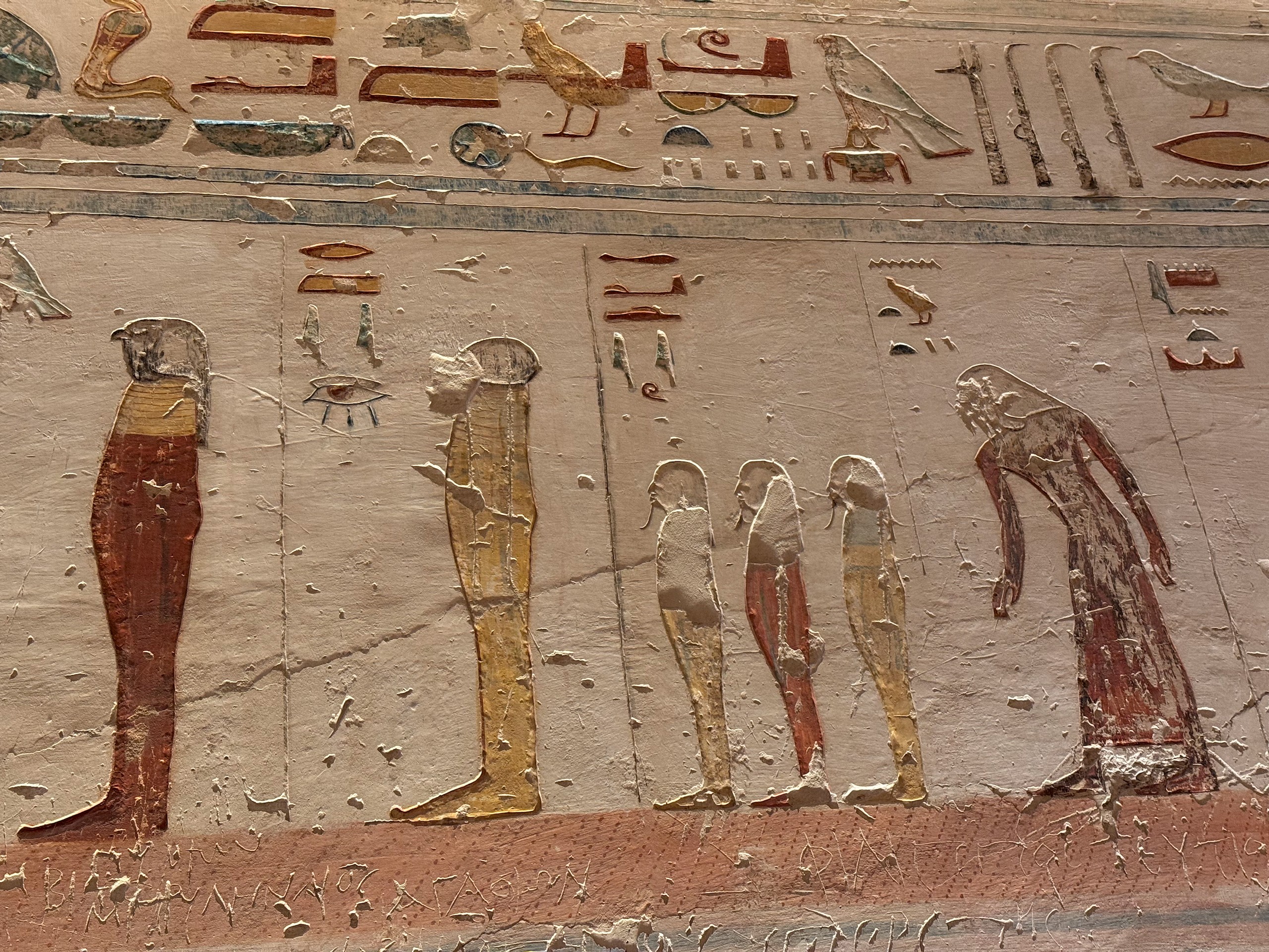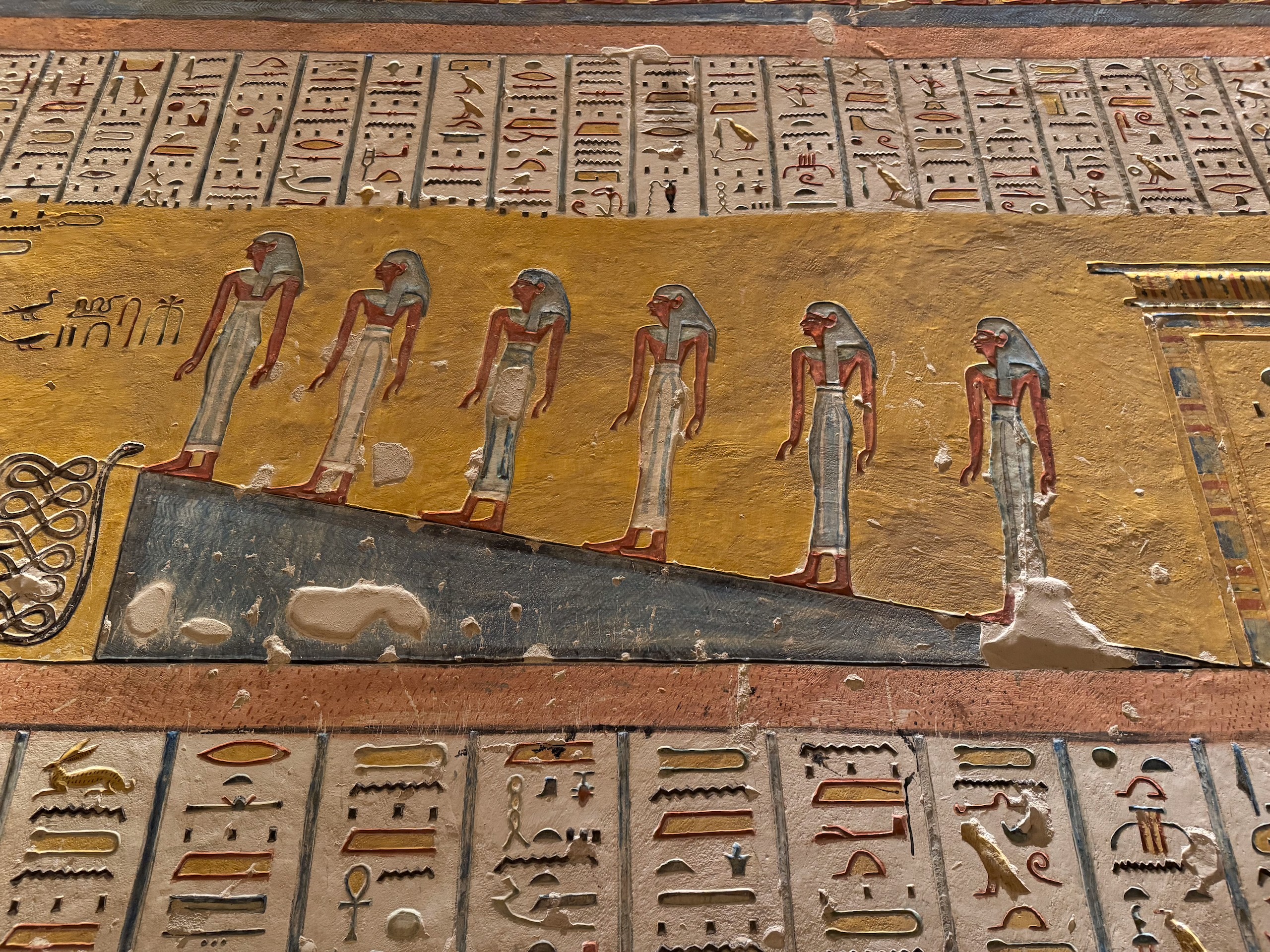 Im Tal der Könige sind aus Konservierungsgründen nie alle Gräber gleichzeitig für die Öffentlichkeit zugänglich. Es wird ein Rotationssystem genutzt, um die empfindlichen Wandmalereien vor Feuchtigkeit und Kohlendioxid zu schützen. Im Standardticket, welches wir haben, ist der Besuch von drei der acht geöffneten Gräbern inklusive. Es gibt aber auch noch weitere Gräber mit Sondergenehmigung und natürlich einer Zusatzgebühr, wie das Grab von Tutanchamun und Sethos I., welche wir aber nicht besucht haben. Die folgenden Bilder ähneln sich vielfach vielleicht und sind trotzdem nur ein Bruchteil der gemachten Aufnahmen.