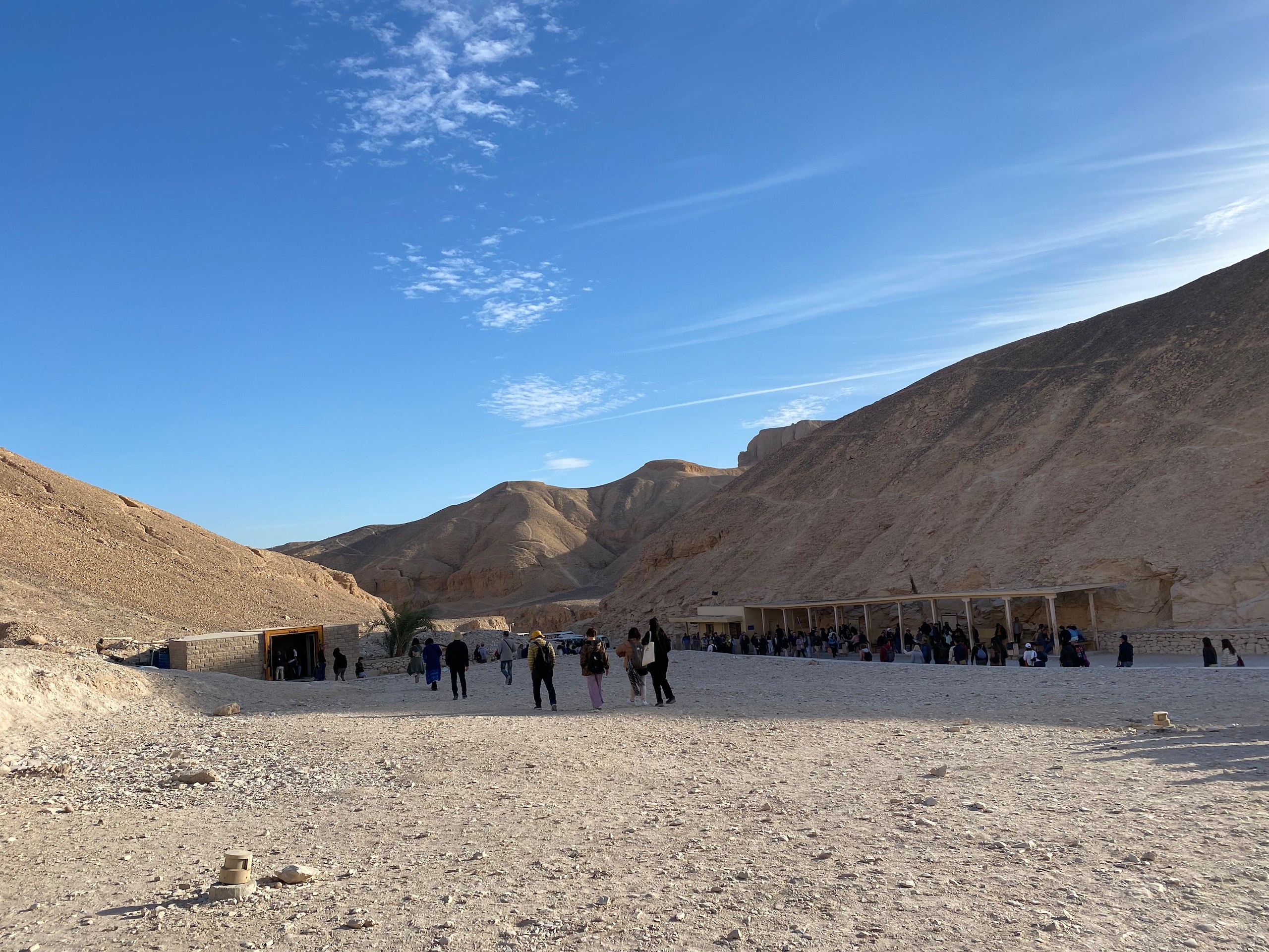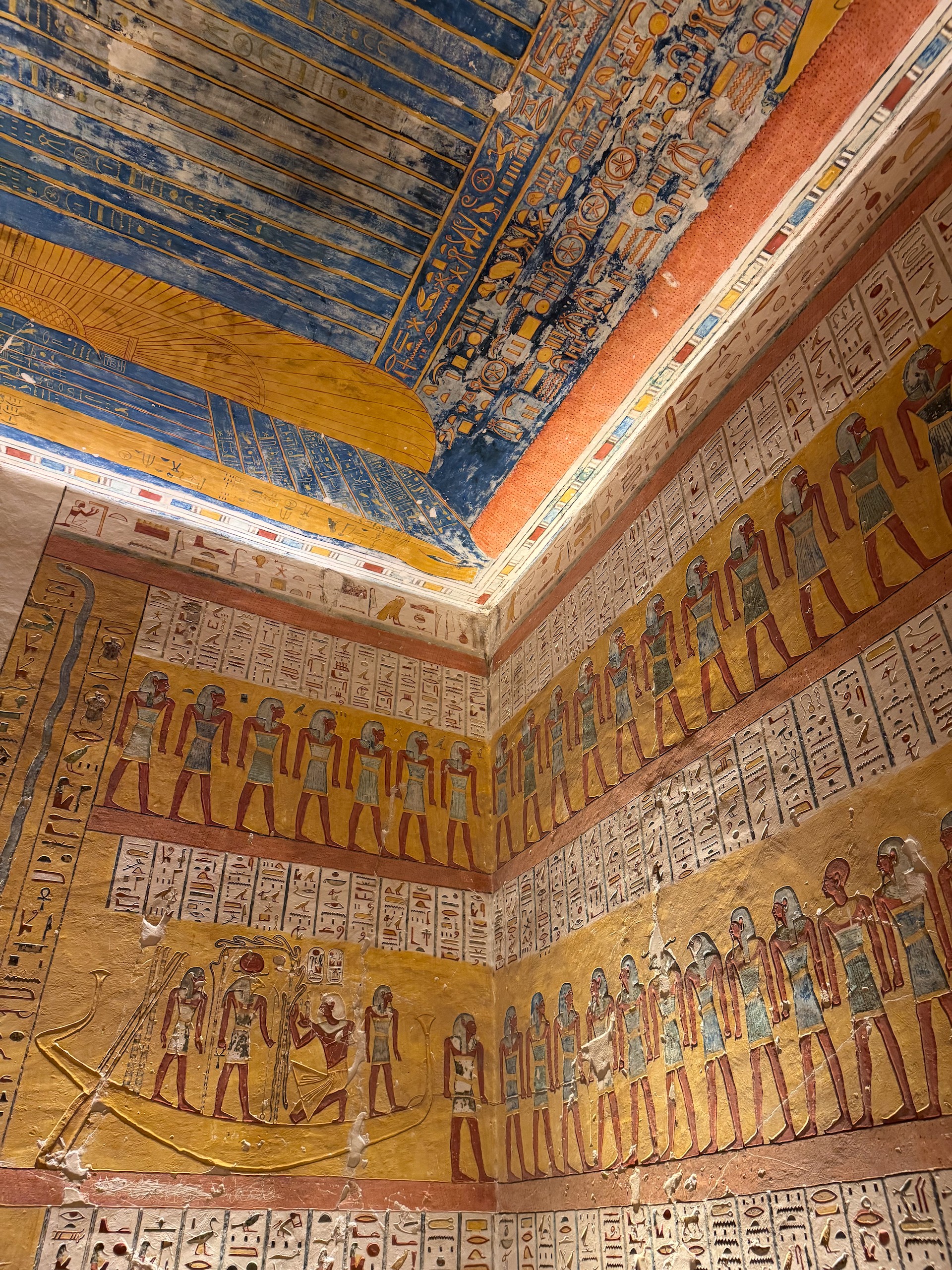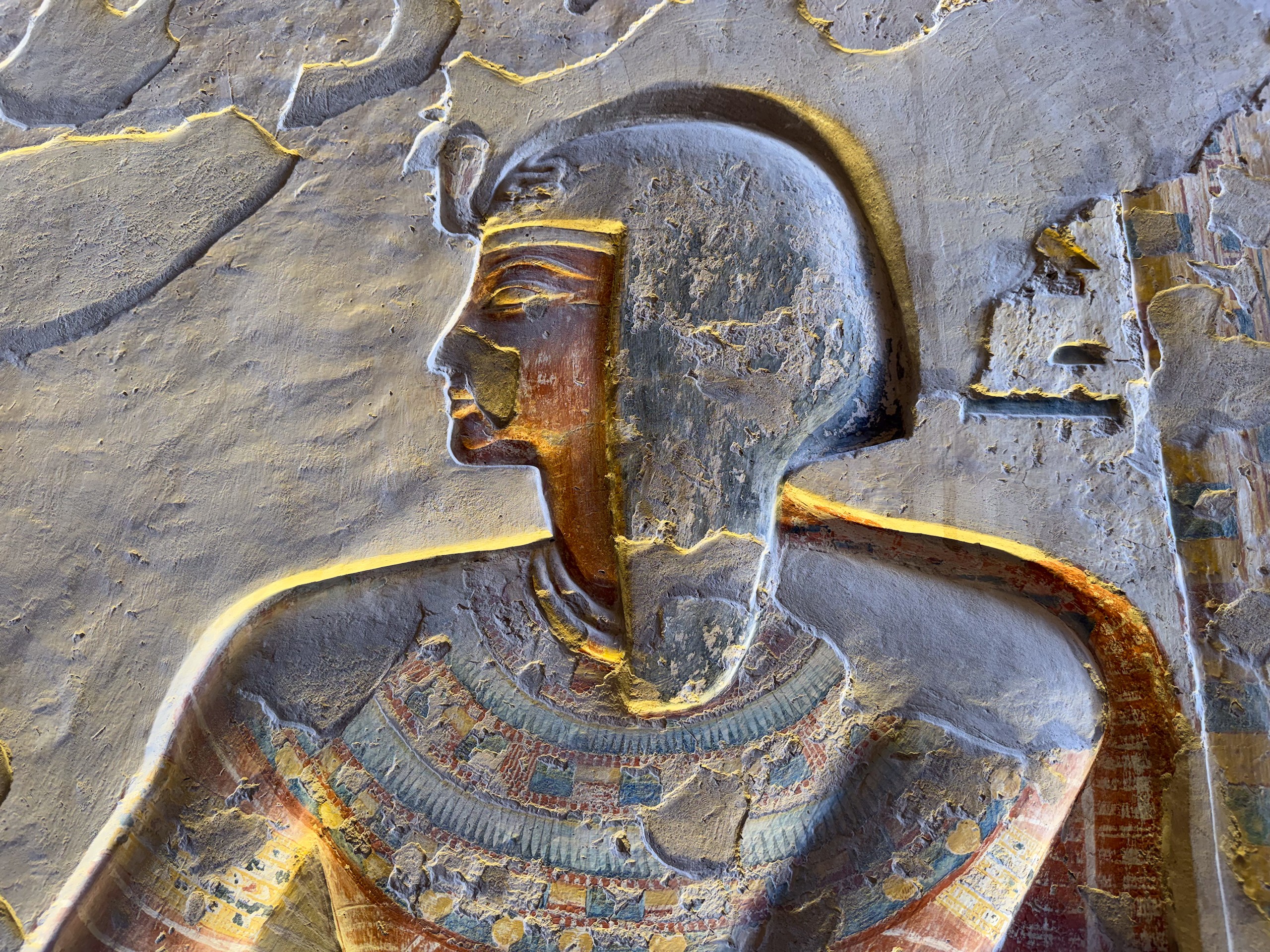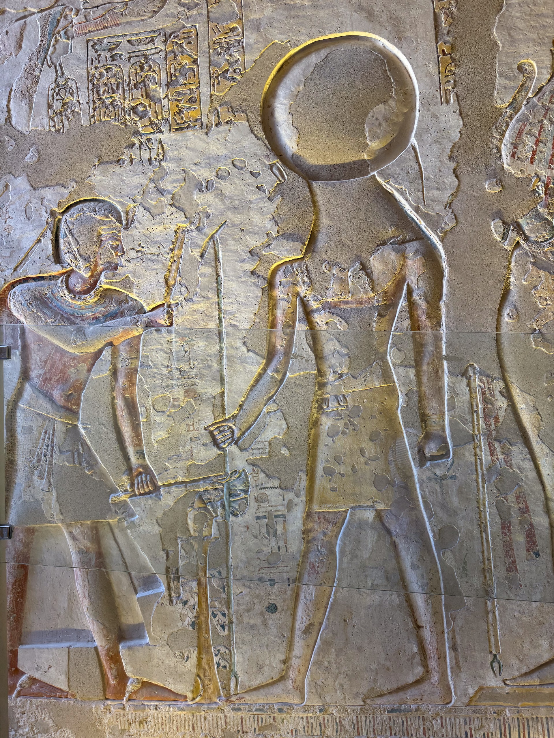 Wir können hier einige der Ruhestätten der Pharaonen des Neuen Reiches besichtigen, die wirklich wieder wunderschön gestaltet sind. Im Neuen Reich hat man keine Pyramiden mehr gebaut, zum einen waren sie zu teuer und man konnte die Gräber zu leicht erkennen und ausrauben. Hier im Tal der Könige waren die Gräber gut versteckt, wurden später aber trotzdem meistens ausgeraubt.