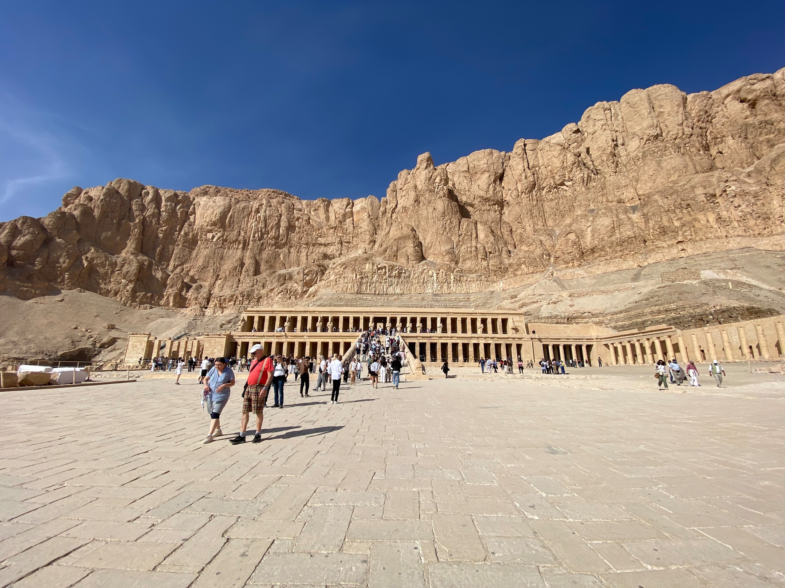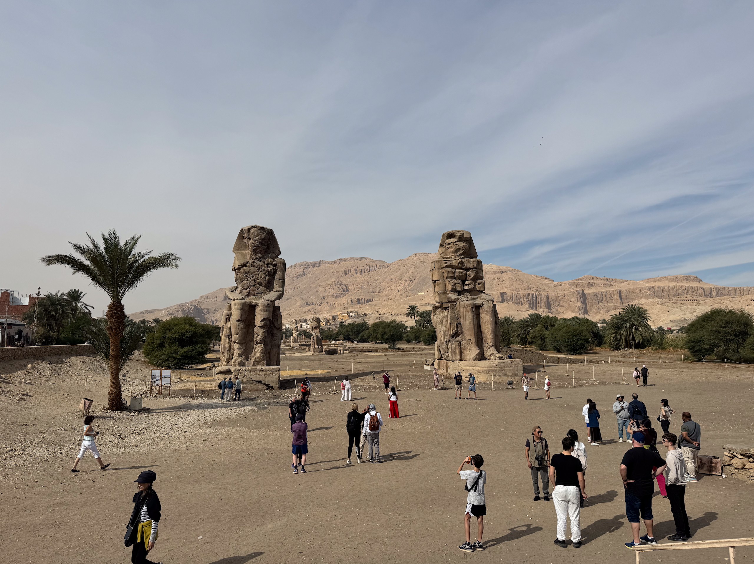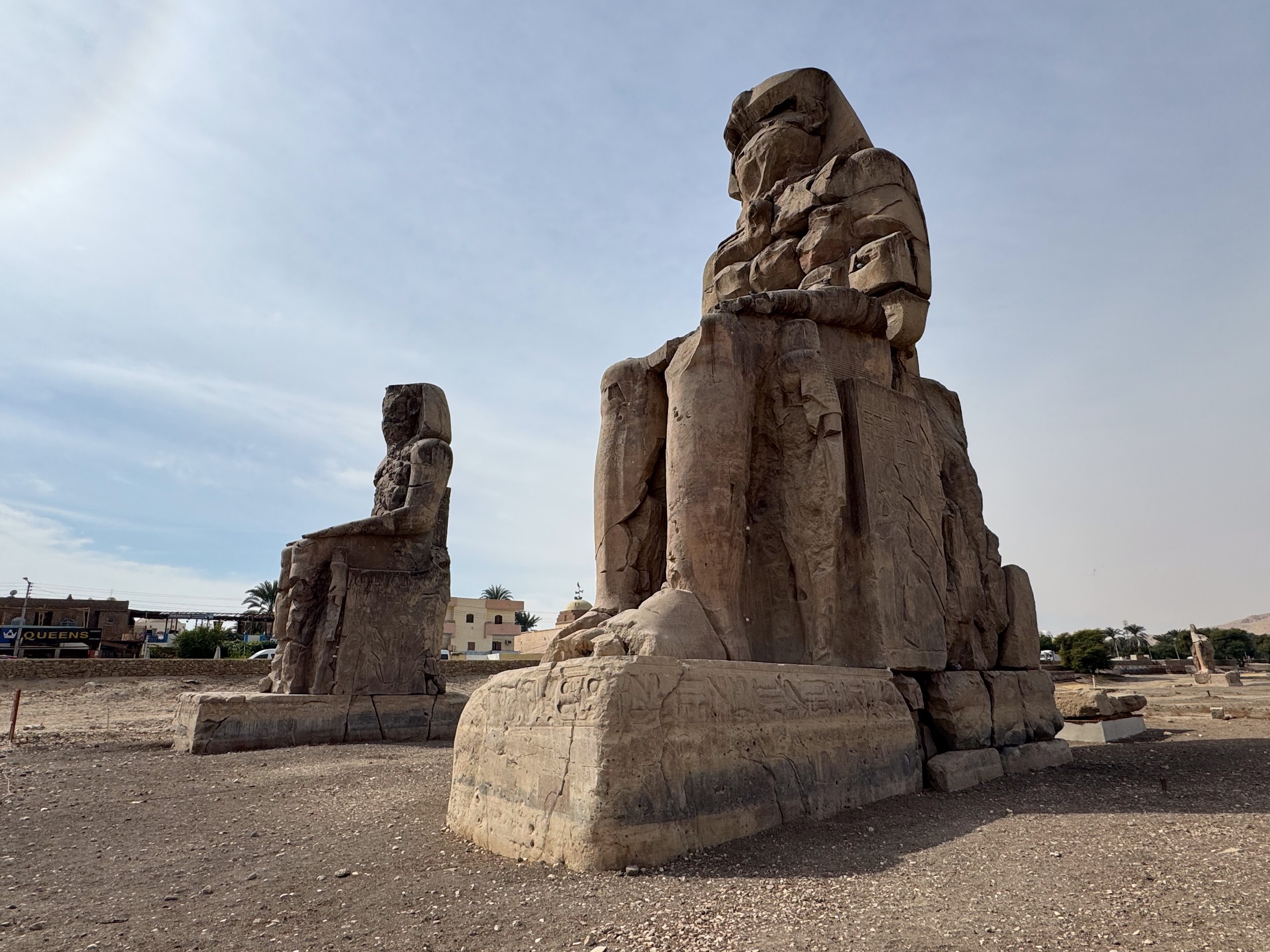 Weiter geht es zum Hatschepsut Tempel, der sehr groß und beeindruckend ist. Zumindest von aussen gefällt er uns, von innen war da nicht so viel zu sehen. Und dann diese vielen Touristen und das Schlange stehen, das nervt und wir beschränken uns mehr auf die Aussenanlage. Als nächstes geht es jetzt für einen kurzen Fotostop zu den Memnon-Kolossen, die restlichen Zeugen des größten jemals in Ägypten errichteten Totentempels, der aber durch ein Erdbeben zerstört wurde.
