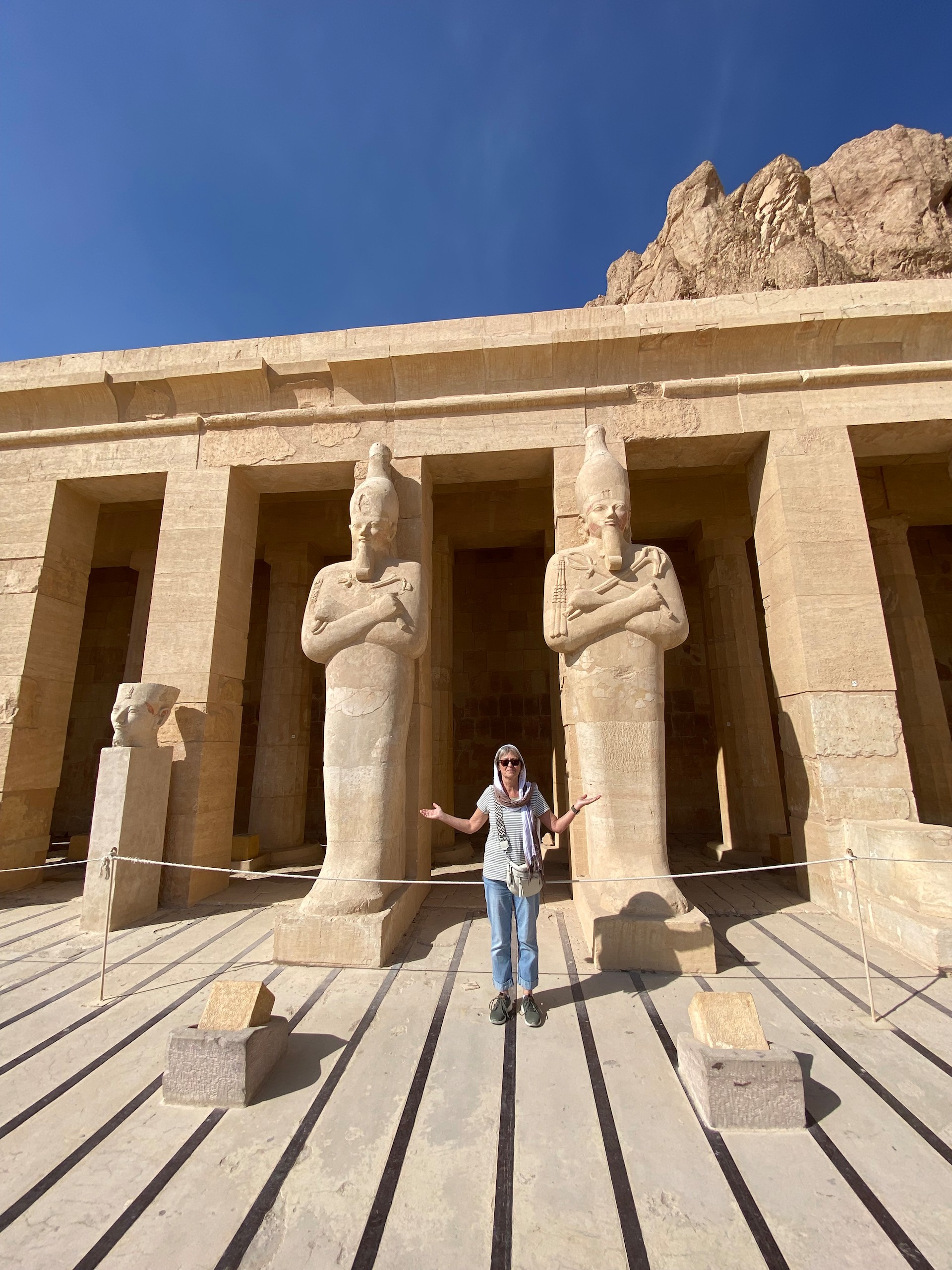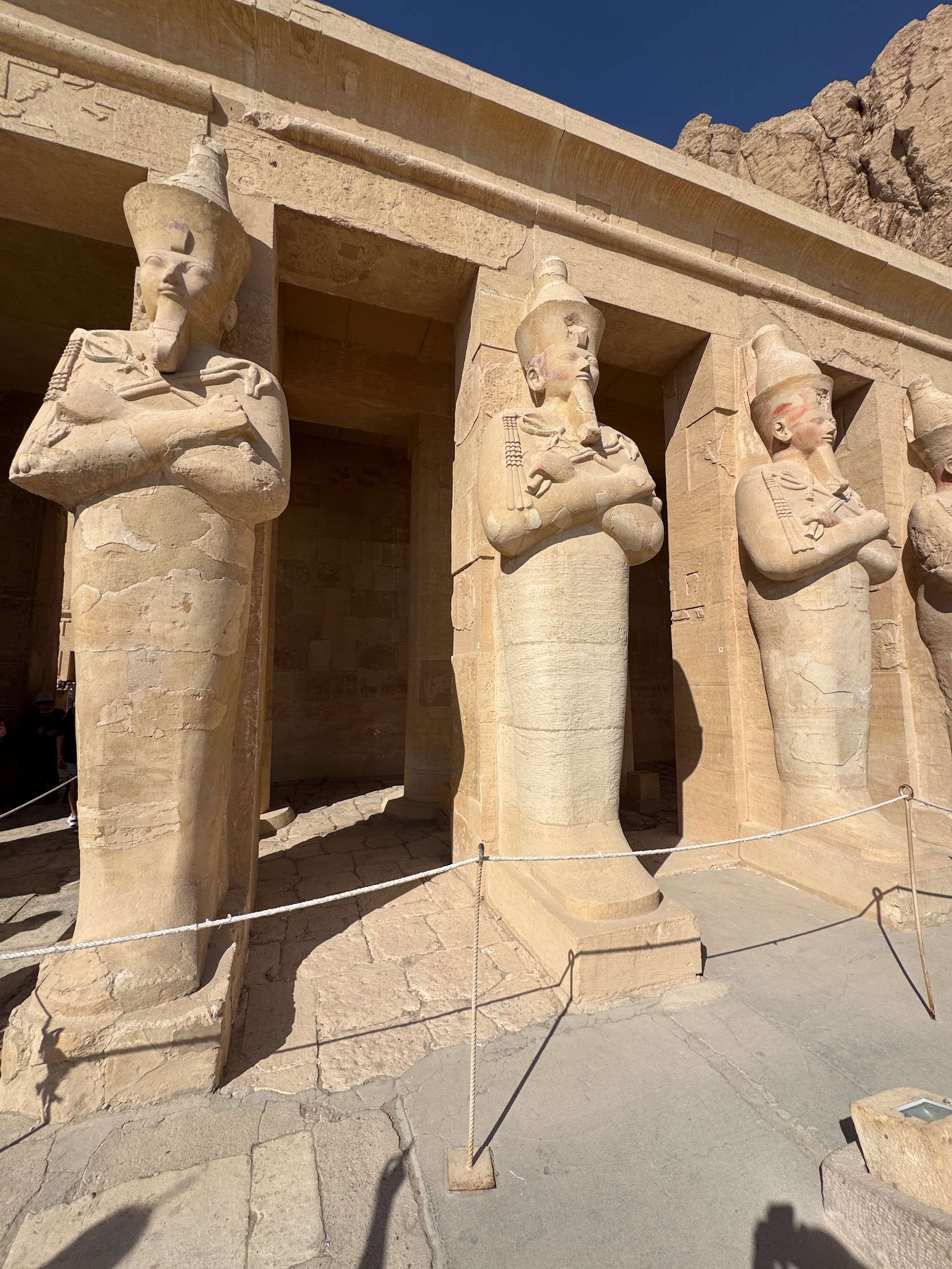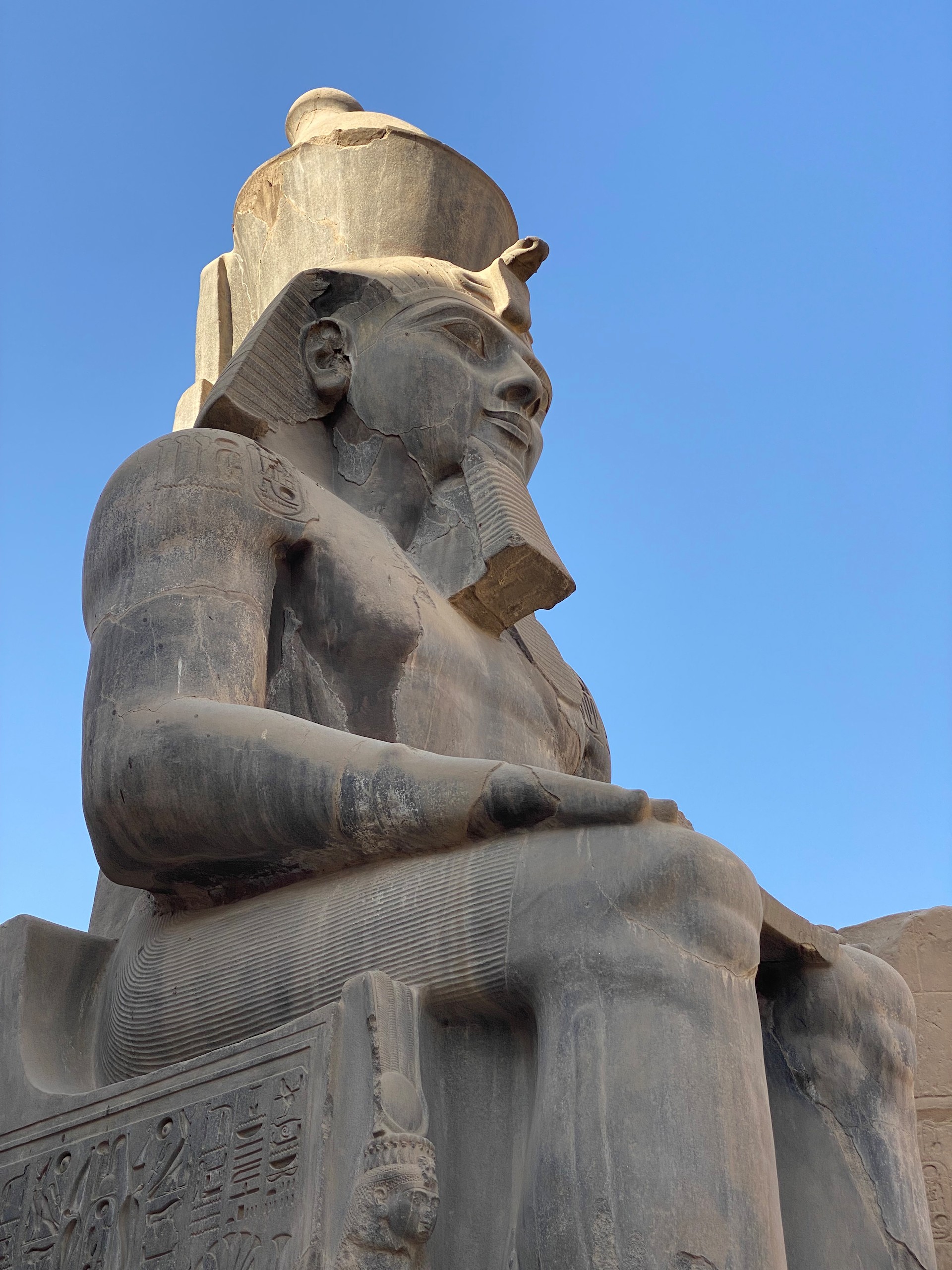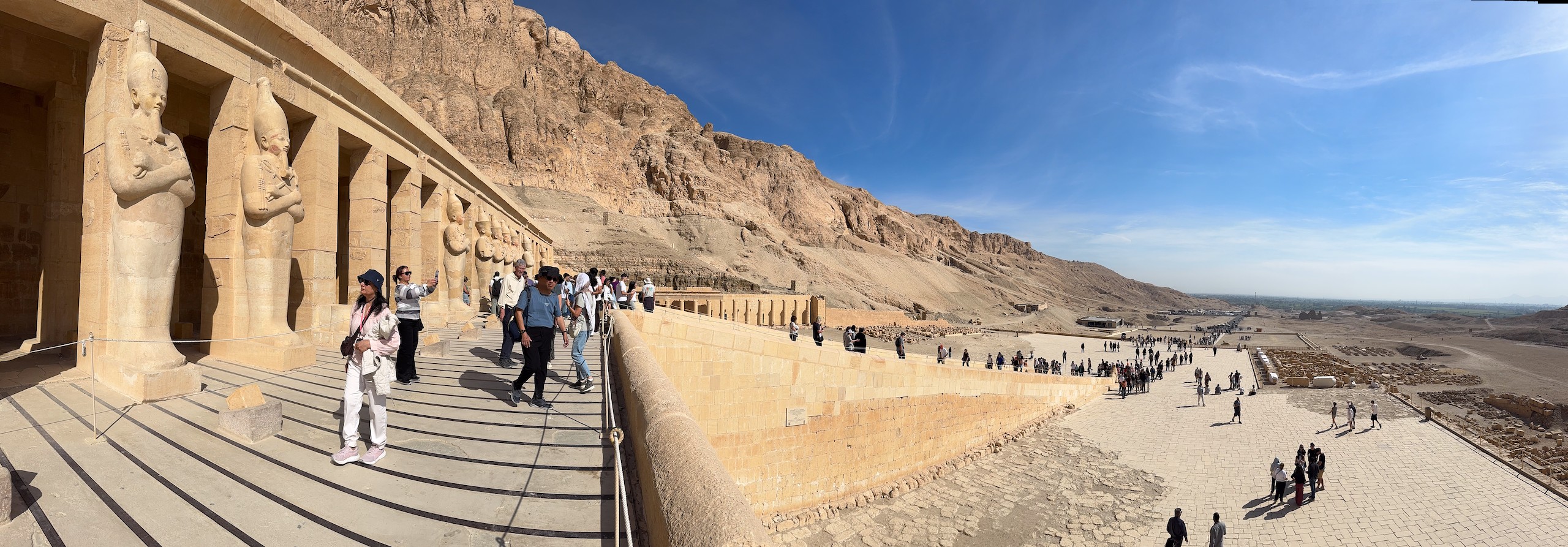 Weiter geht es zum Hatschepsut Tempel, der sehr groß und beeindruckend ist. Zumindest von aussen gefällt er uns, von innen war da nicht so viel zu sehen. Und dann diese vielen Touristen und das Schlange stehen, das nervt und wir beschränken uns mehr auf die Aussenanlage. Als nächstes geht es jetzt für einen kurzen Fotostop zu den Memnon-Kolossen, die restlichen Zeugen des größten jemals in Ägypten errichteten Totentempels, der aber durch ein Erdbeben zerstört wurde.