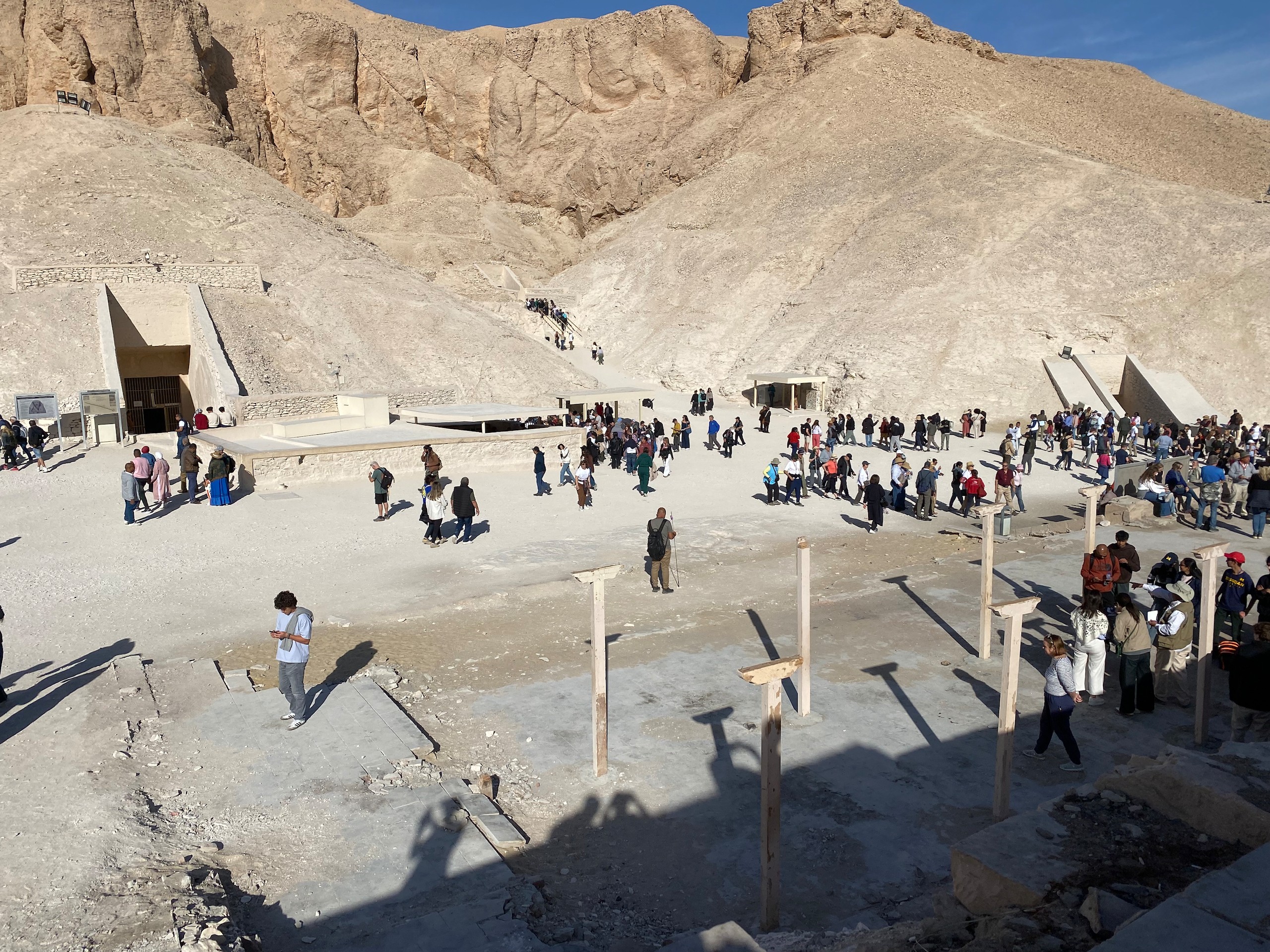 Jetzt fahren wir zunächst nach Theben West ins Tal der Könige. Hier stehen schon unglaubliche Mengen an Bussen, aber unser Reiseleiter meint, später werden es noch mehr, wenn die Ausflügler der Kreuzfahrtschiffe von Hurghada dazukommen. Übrigens, alle ankommenden Fahrzeuge werden genau von Polizisten oder Sicherheitspersonal gecheckt, teilweise mit Hunden und Spiegeln unter dem Fahrzeug und unsere Rucksäcke und Taschen werden auch überall durchleuchtet. Man hat immer Angst vor Anschlägen und die Polizei ist hier im Land auch überall präsent.