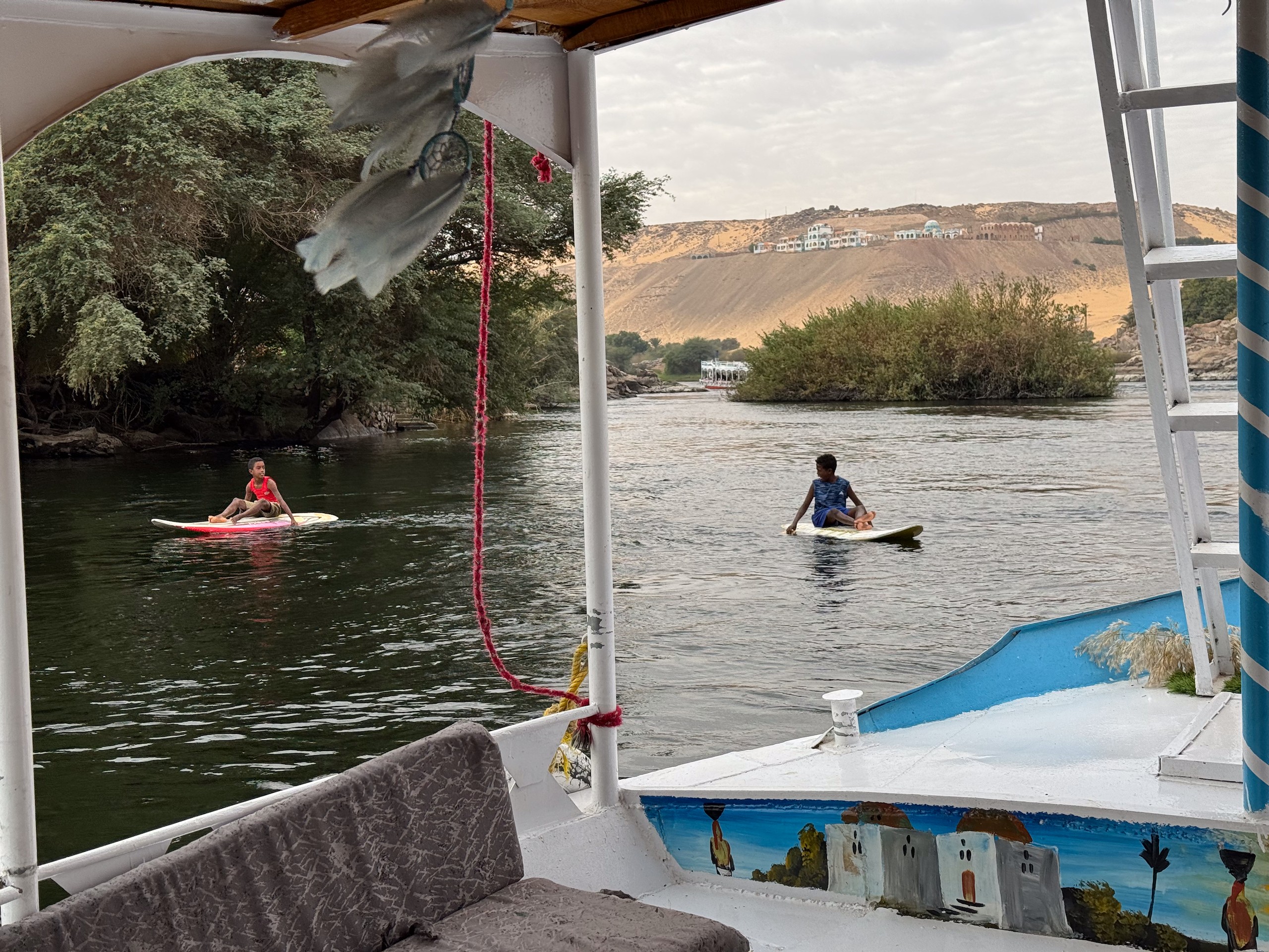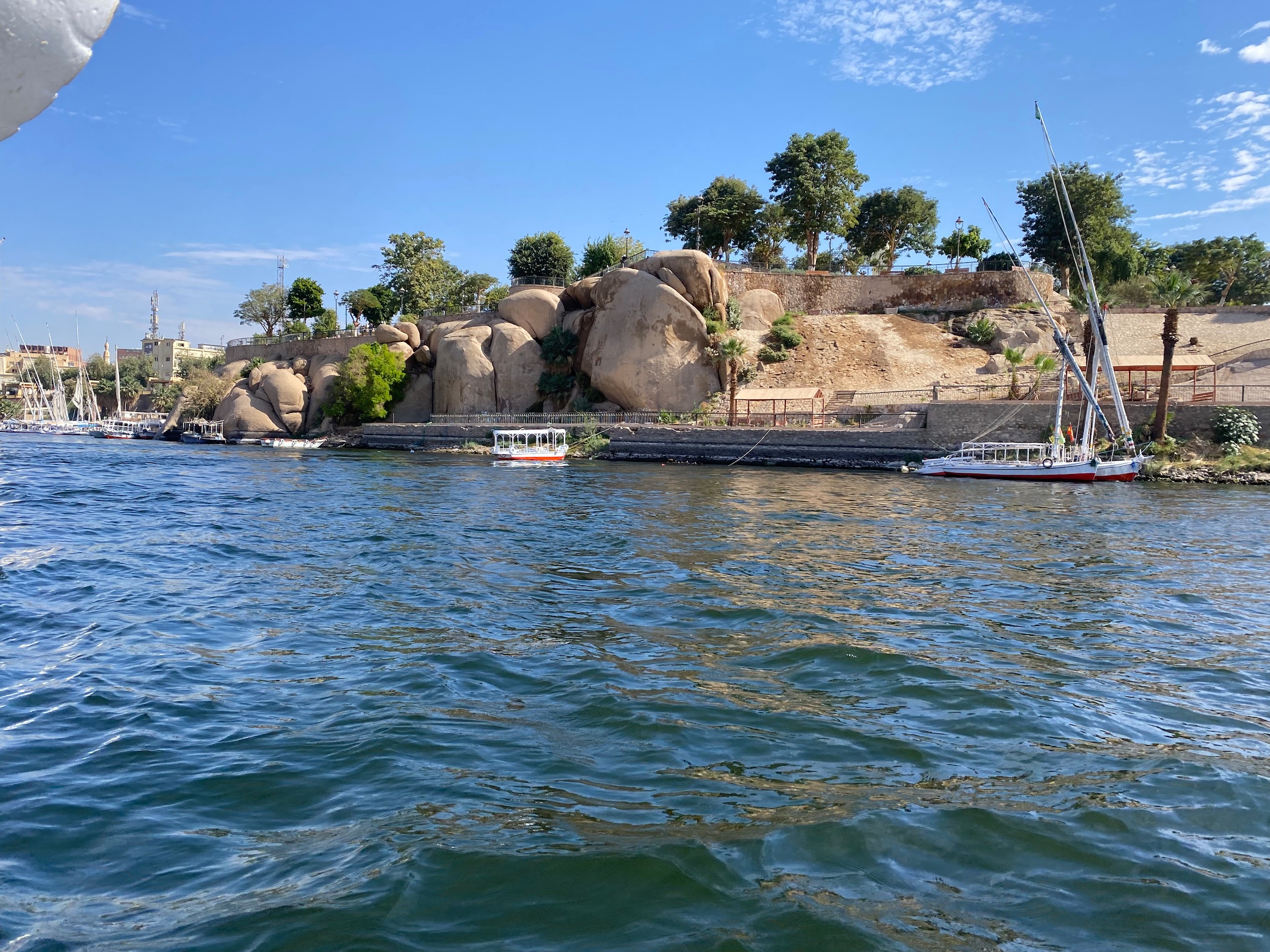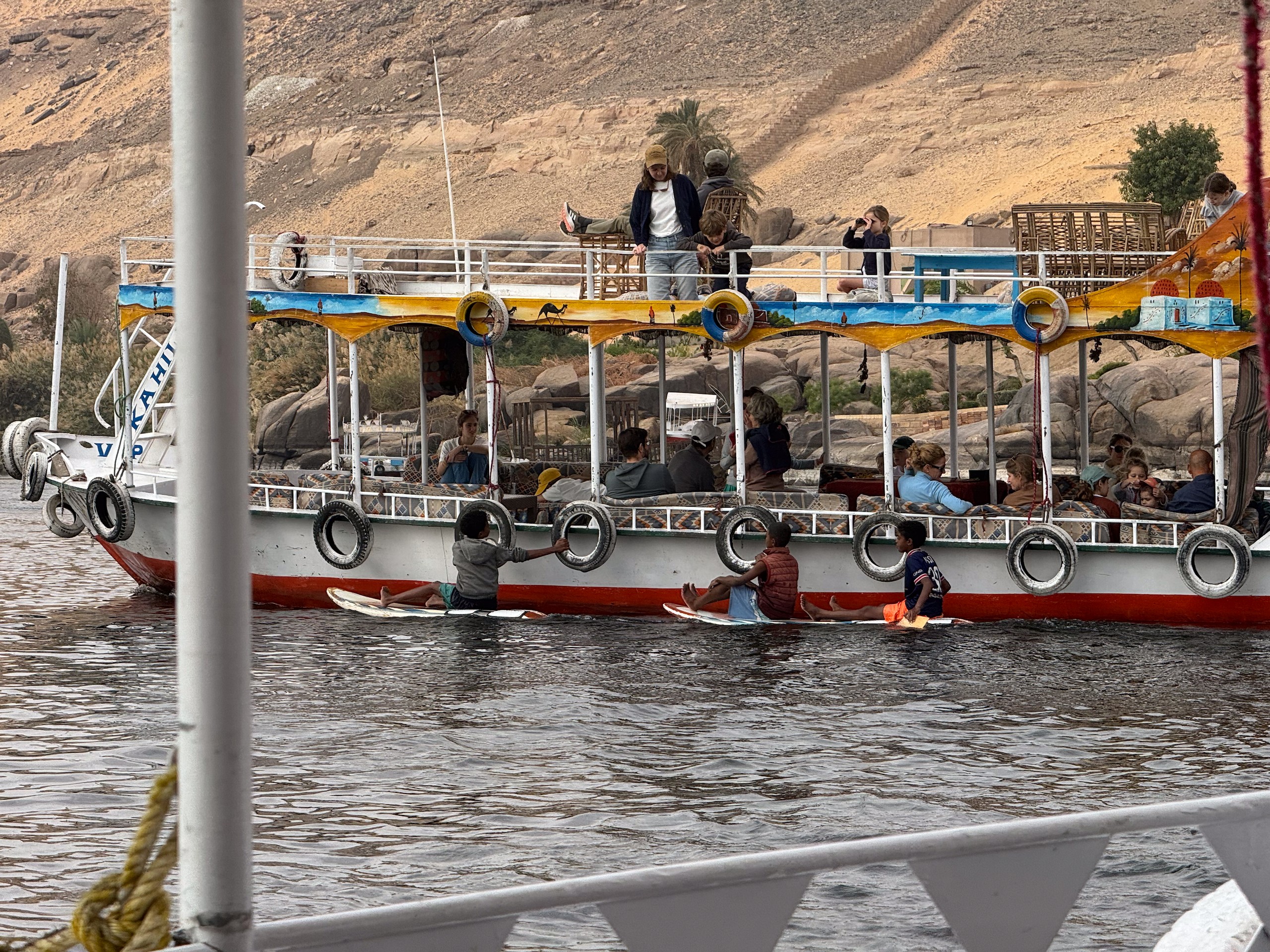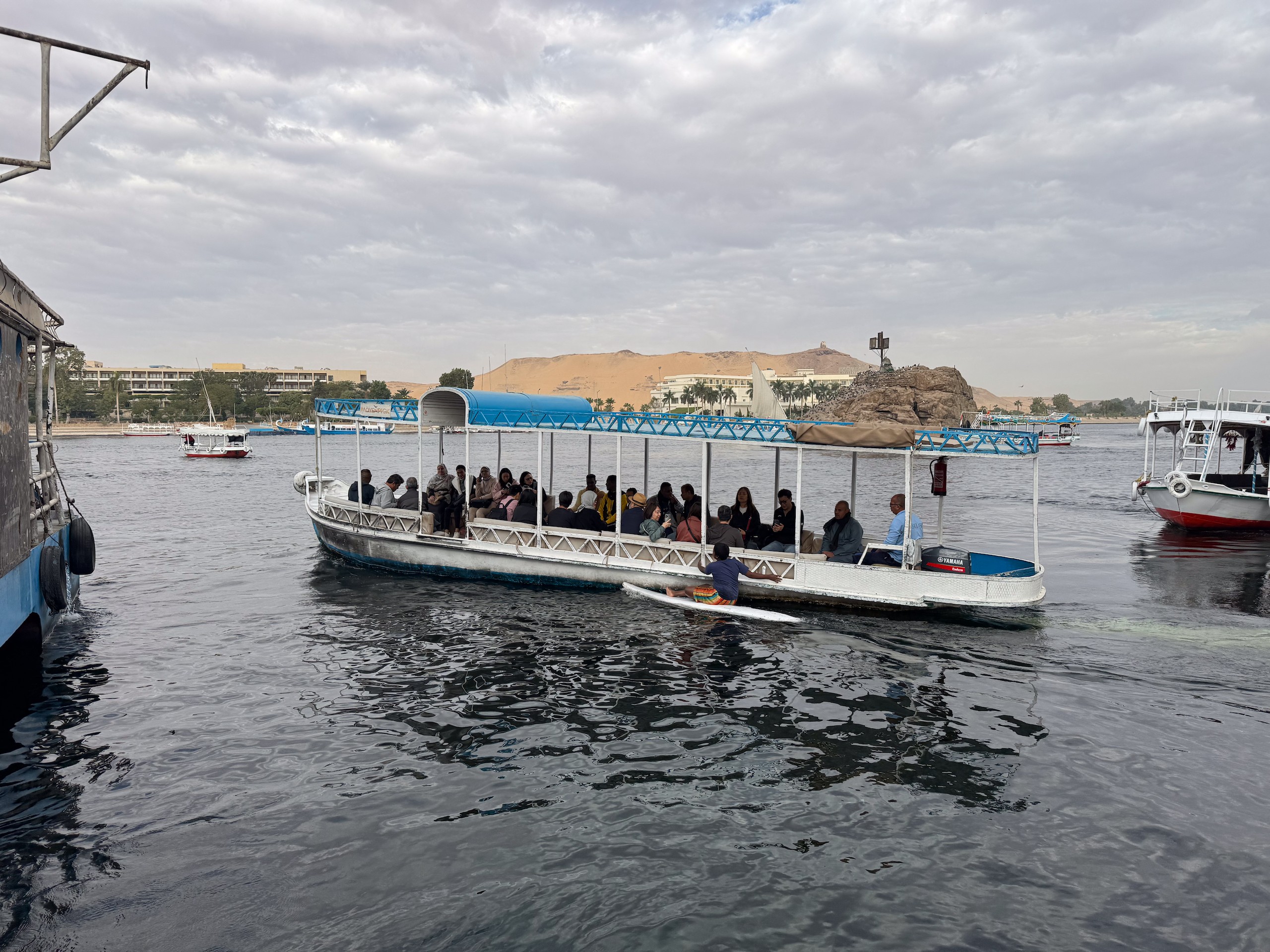 Es geht zunächst auf dem Nil vorbei an dem Felsenberg Qubbet el-Hawa ins Naturschutzgebiet Salouga und Ghaza Nature Reserve. Die Landschaft ist durchzogen von Granitfelsen und Schilf. Hier sind noch viele andere Boote unterwegs und von einem Boot ist ein Kind ins Wasser gefallen, ein zweiter Passagier ist aber direkt hinterher gesprungen und alles ist noch gut ausgegangen. Dann kommen einige kleine Kinder auf ebenso kleinen Surfbrettern angepaddelt und hängen sich an die Touristenboote, so auch bei uns, und trällern in erster Linie Lieder von Shakira. Aber sie werden nicht wirklich lästig.