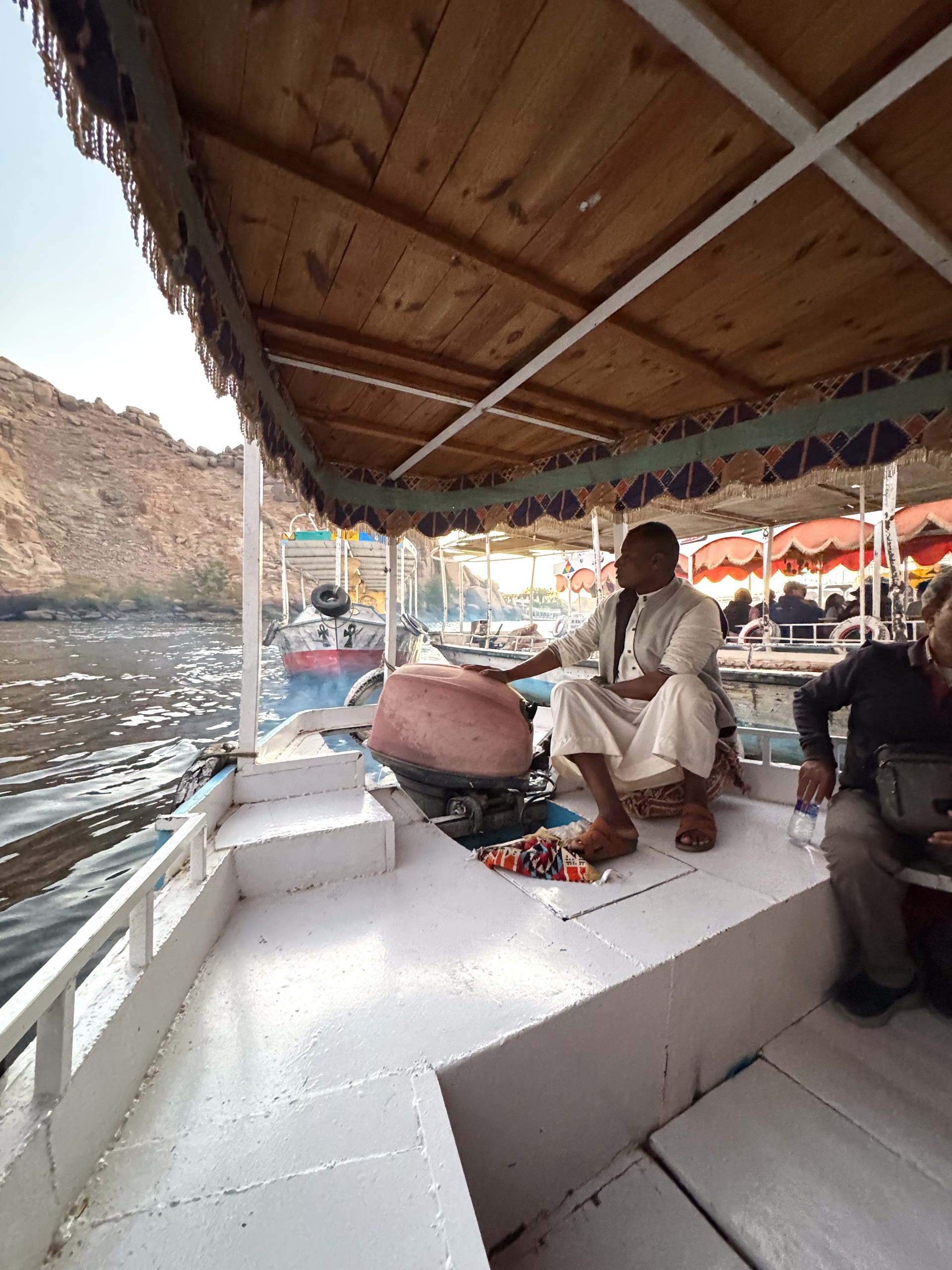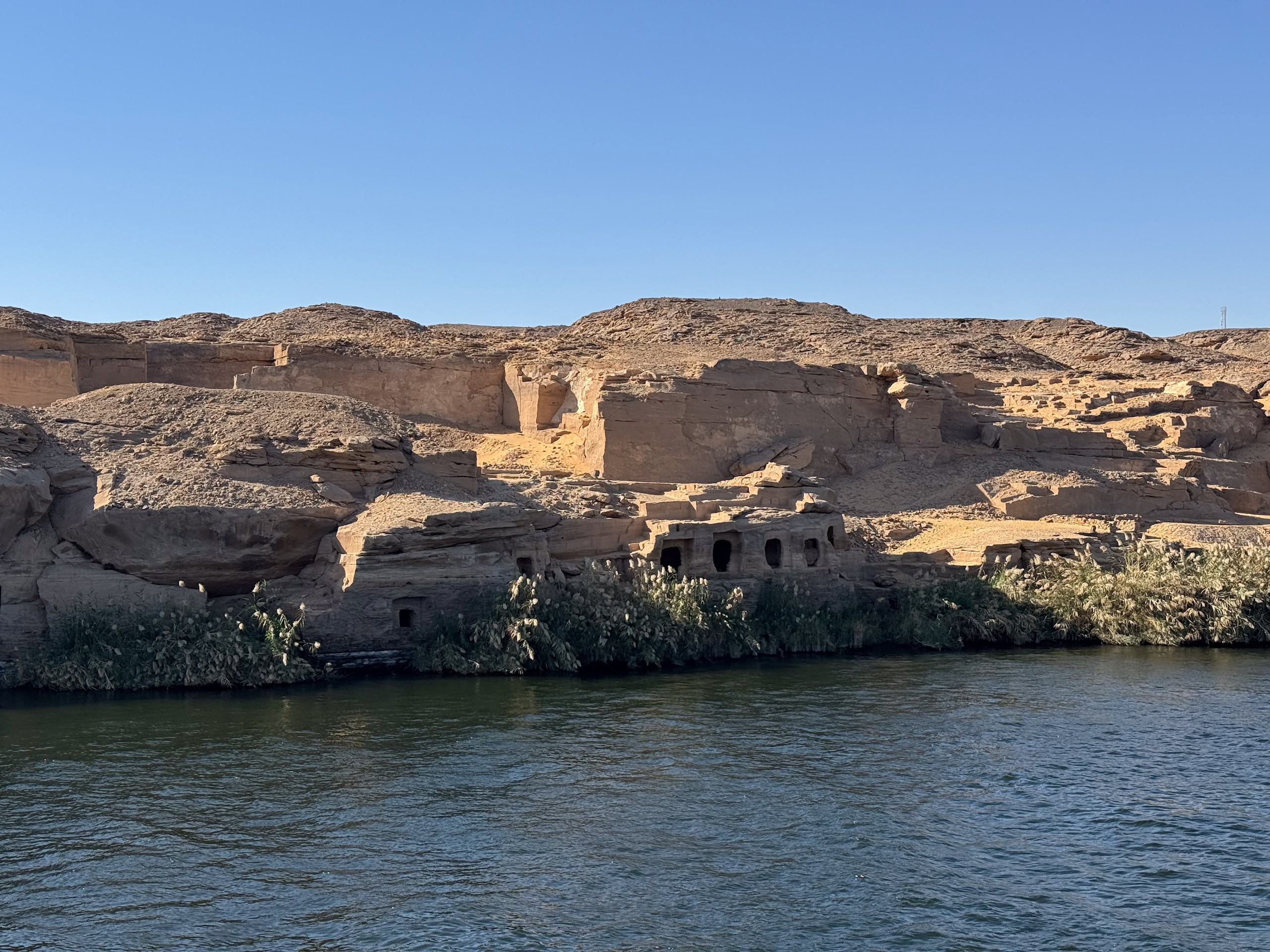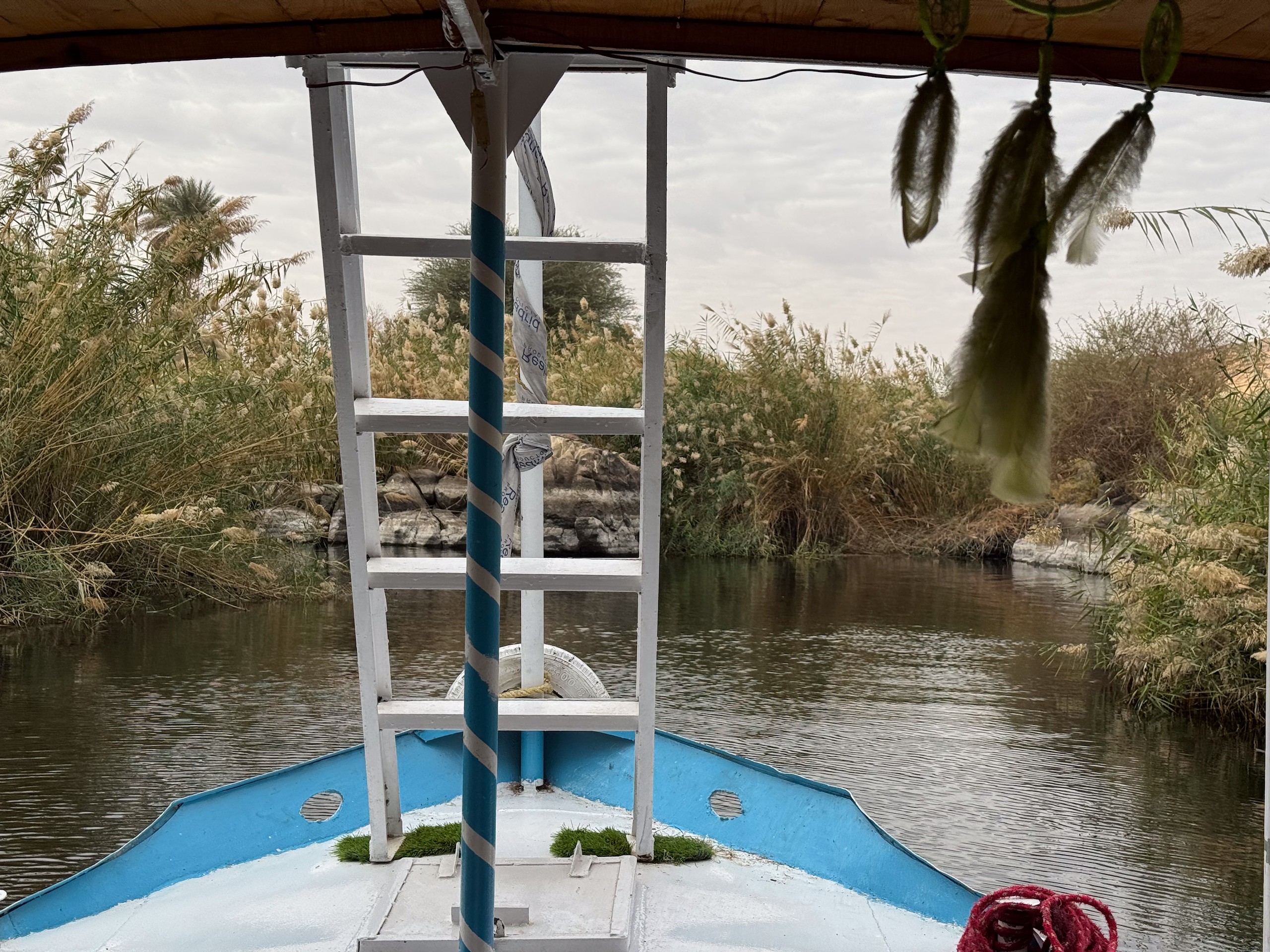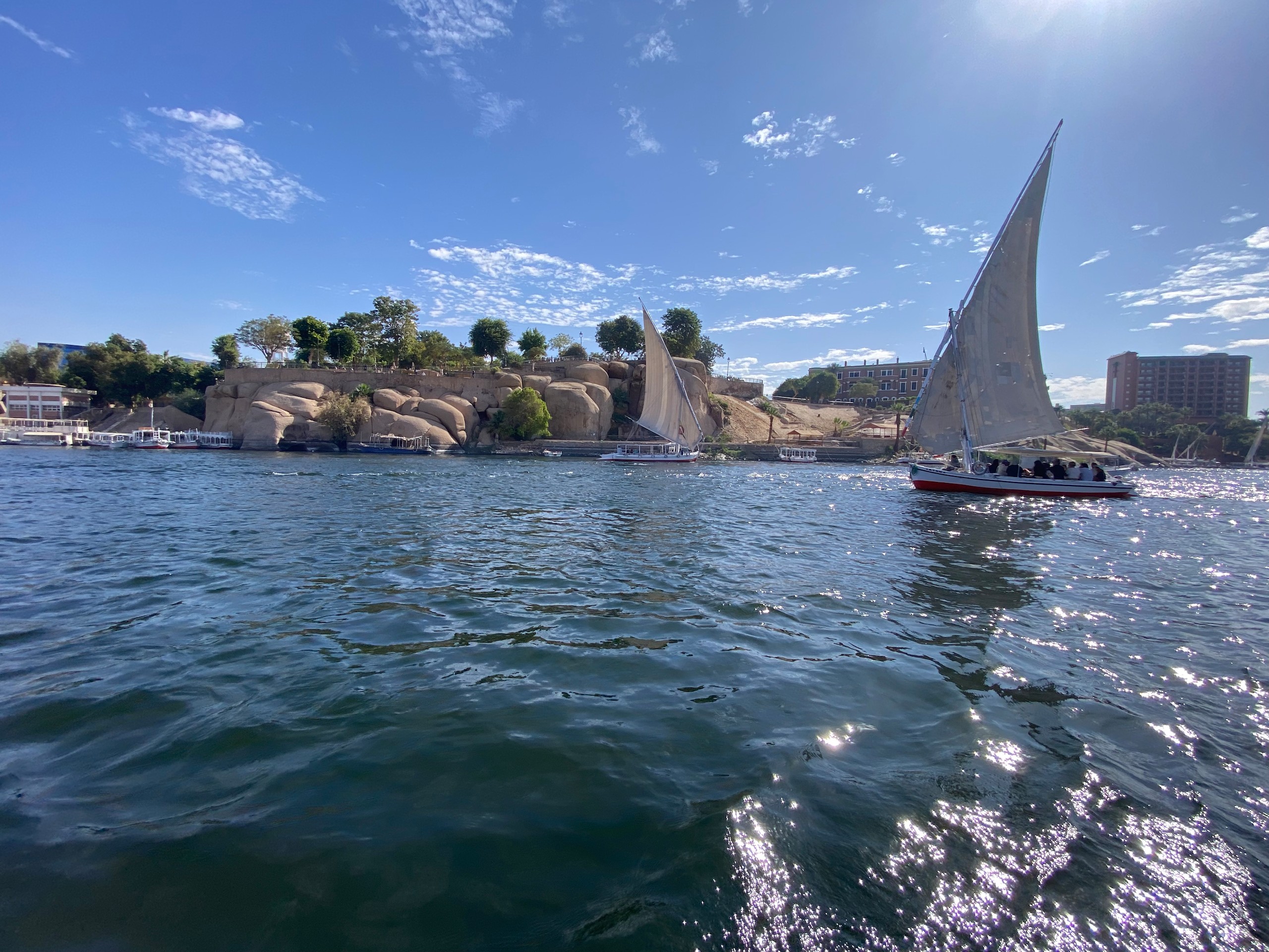Es geht zunächst auf dem Nil vorbei an dem Felsenberg Qubbet el-Hawa ins Naturschutzgebiet Salouga und Ghaza Nature Reserve. Die Landschaft ist durchzogen von Granitfelsen und Schilf. Hier sind noch viele andere Boote unterwegs und von einem Boot ist ein Kind ins Wasser gefallen, ein zweiter Passagier ist aber direkt hinterher gesprungen und alles ist noch gut ausgegangen. Dann kommen einige kleine Kinder auf ebenso kleinen Surfbrettern angepaddelt und hängen sich an die Touristenboote, so auch bei uns, und trällern in erster Linie Lieder von Shakira. Aber sie werden nicht wirklich lästig.