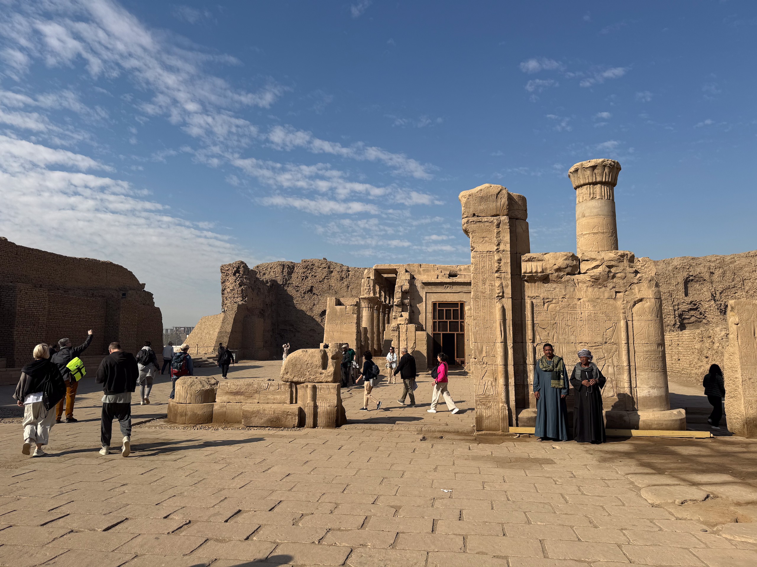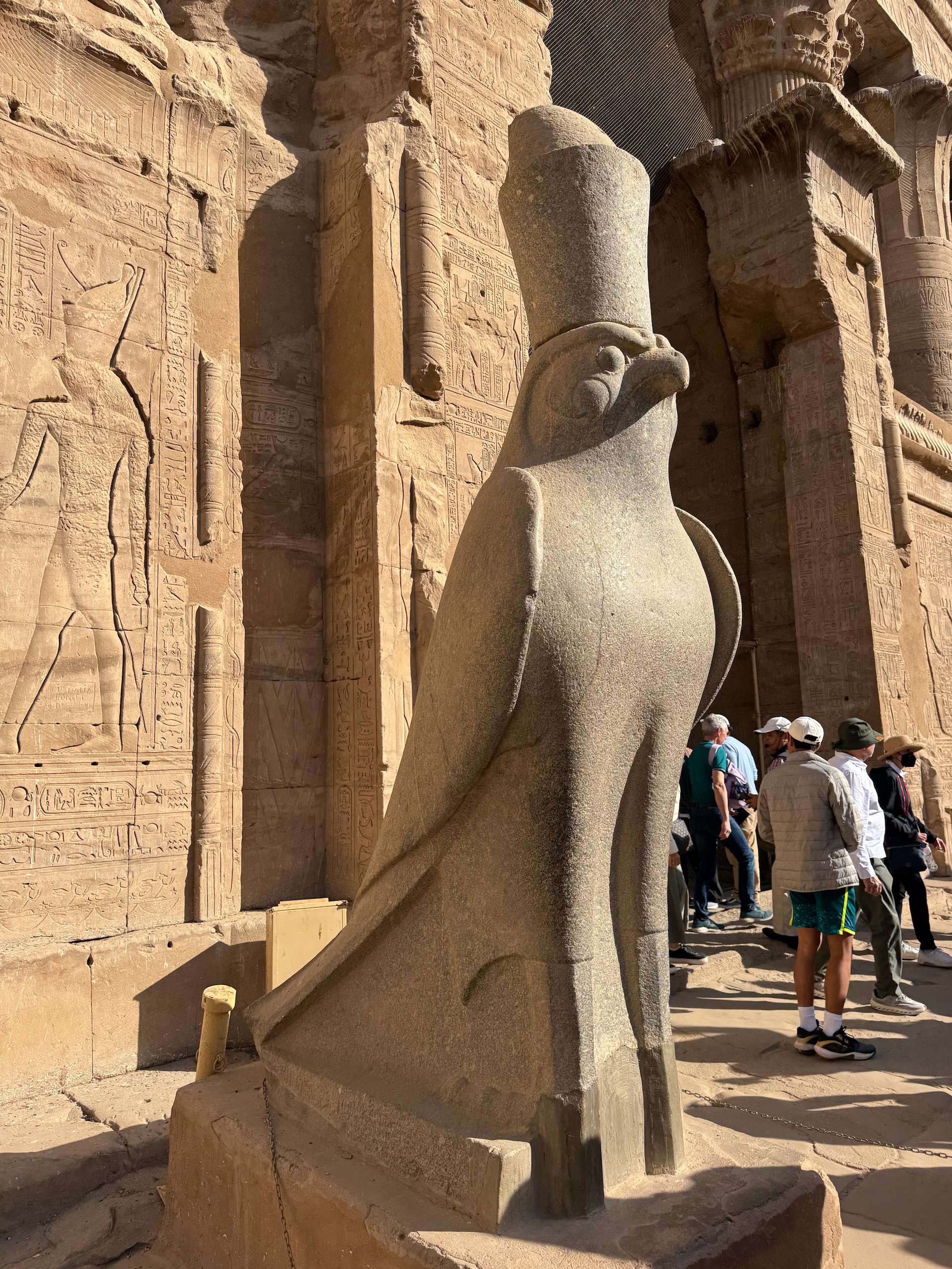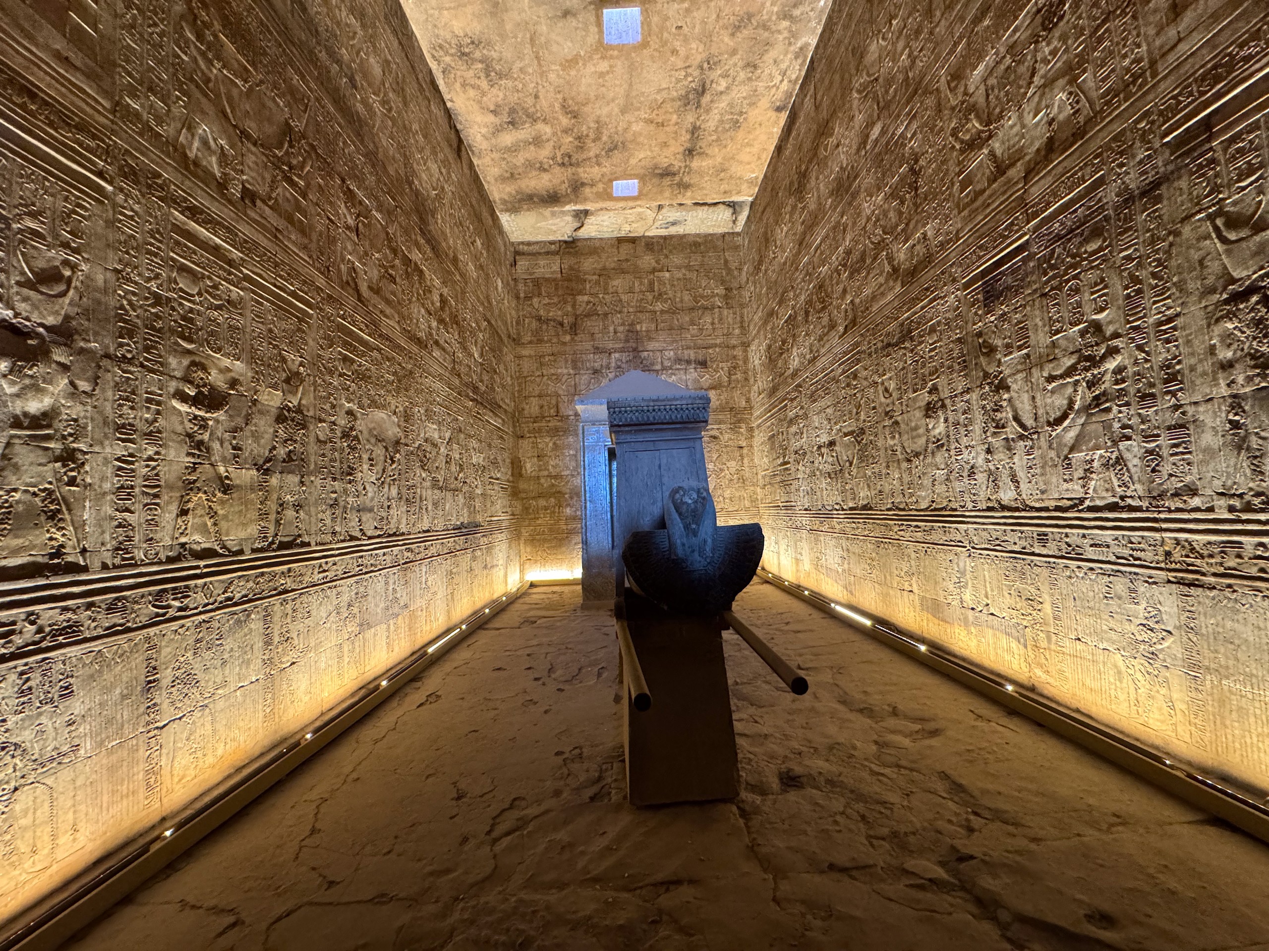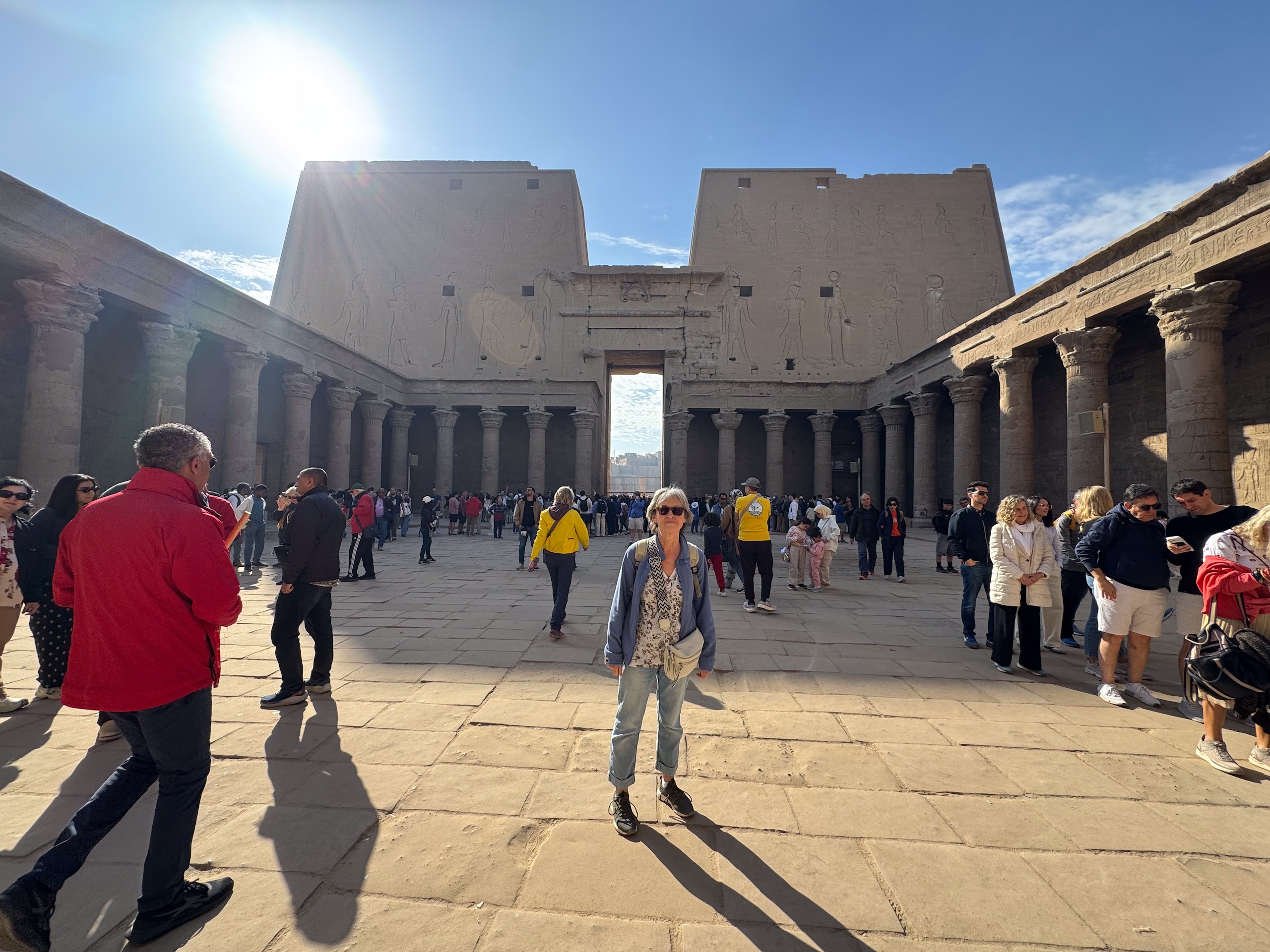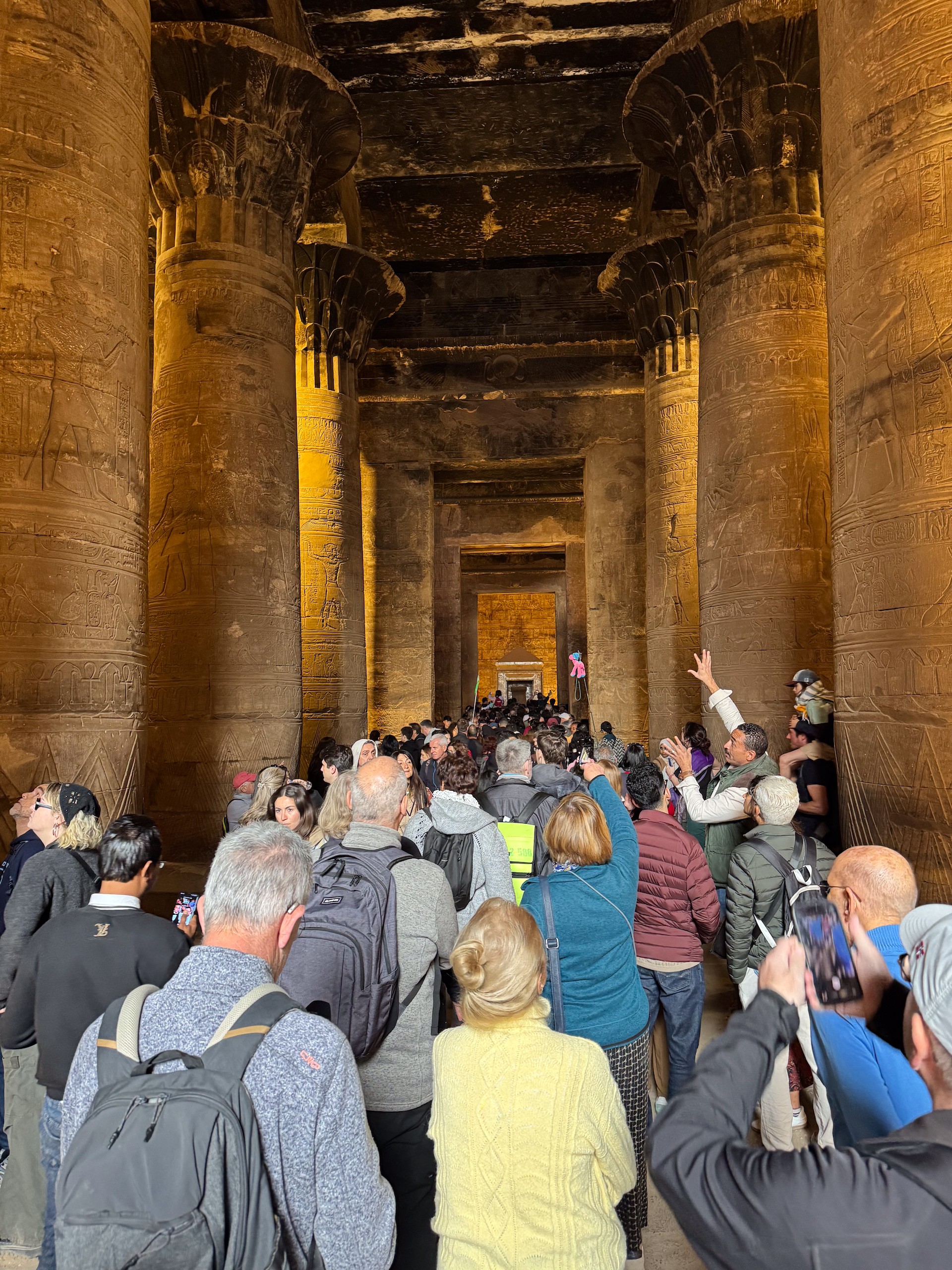 Um das Allerheiligste, den Raum Gottes am Ende des Tempelinneren zu sehen, muss man sich in eine riesige Menschentraube quetschen, um einen Blick auf die jetzt dort stehende göttliche Barke zu werfen. Diese Menschenmassen, die hier an allen Sehenswürdigkeiten sind, hängen natürlich mit den vielen Nil-Kreuzfahrtschiffen zusammen, die jeden Tag hier zur gleichen Zeit anlanden, so wie wir natürlich auch.