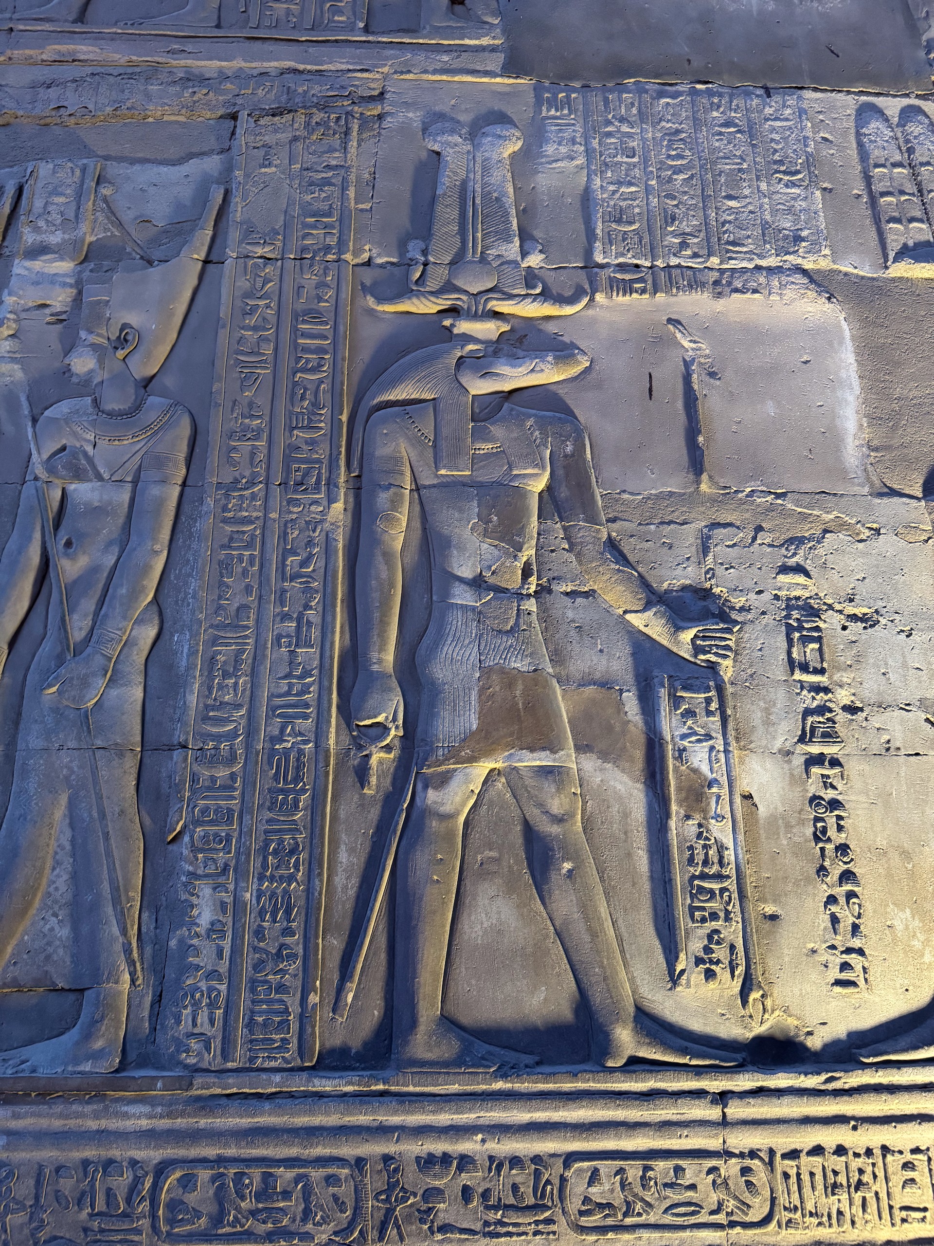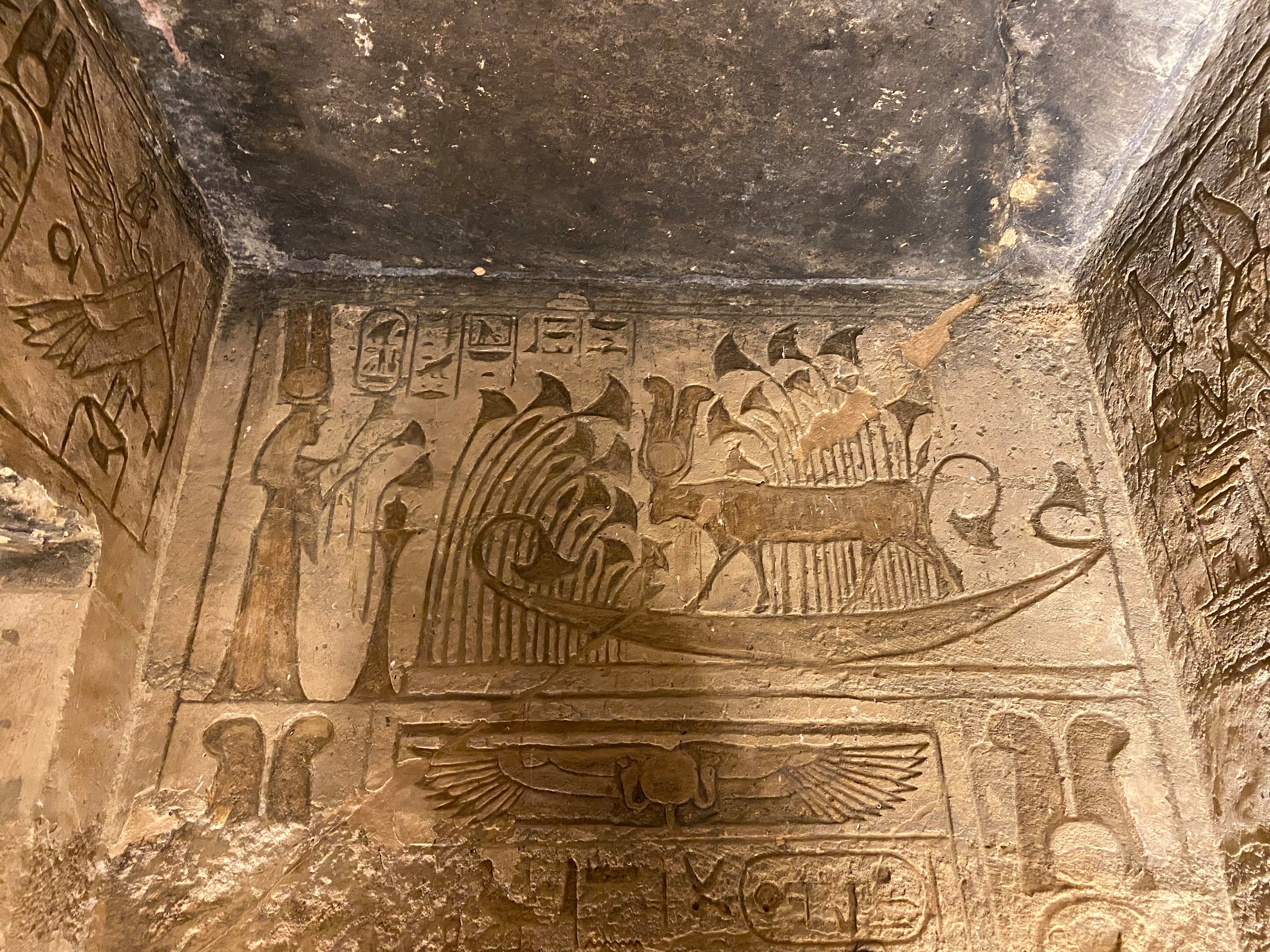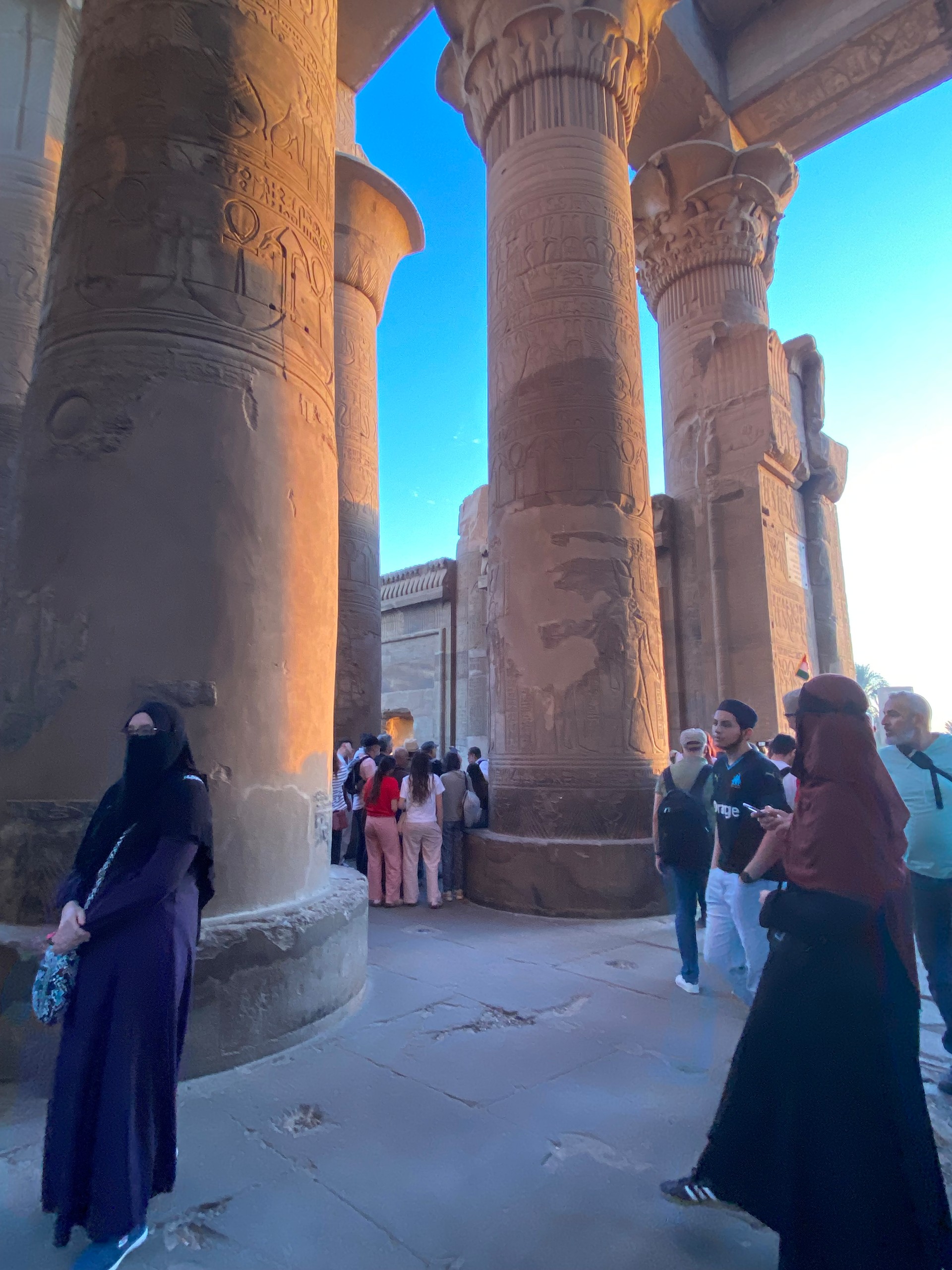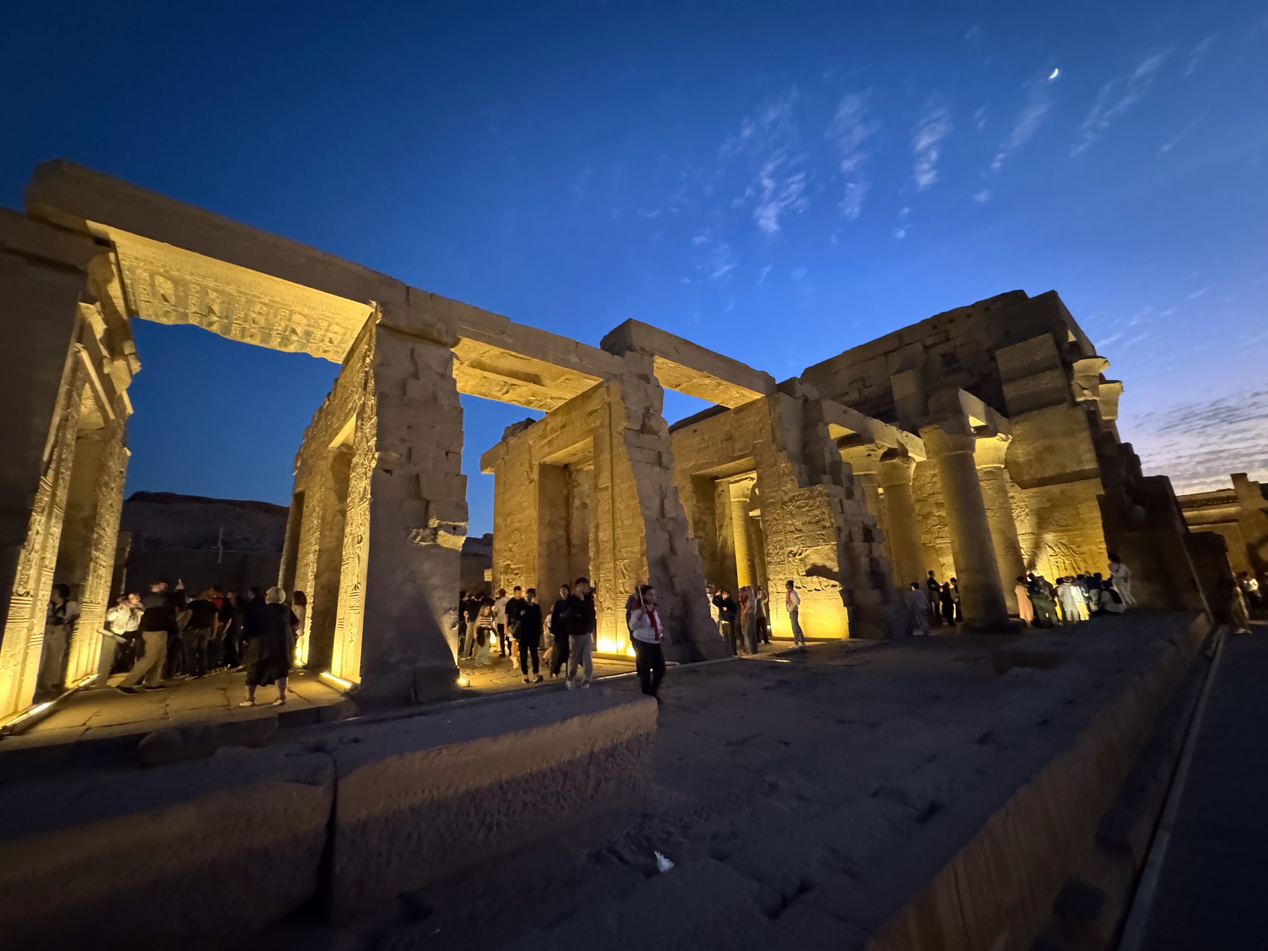 Um das Allerheiligste, den Raum Gottes am Ende des Tempelinneren zu sehen, muss man sich in eine riesige Menschentraube quetschen, um einen Blick auf die jetzt dort stehende göttliche Barke zu werfen. Diese Menschenmassen, die hier an allen Sehenswürdigkeiten sind, hängen natürlich mit den vielen Nil-Kreuzfahrtschiffen zusammen, die jeden Tag hier zur gleichen Zeit anlanden, so wie wir natürlich auch.
