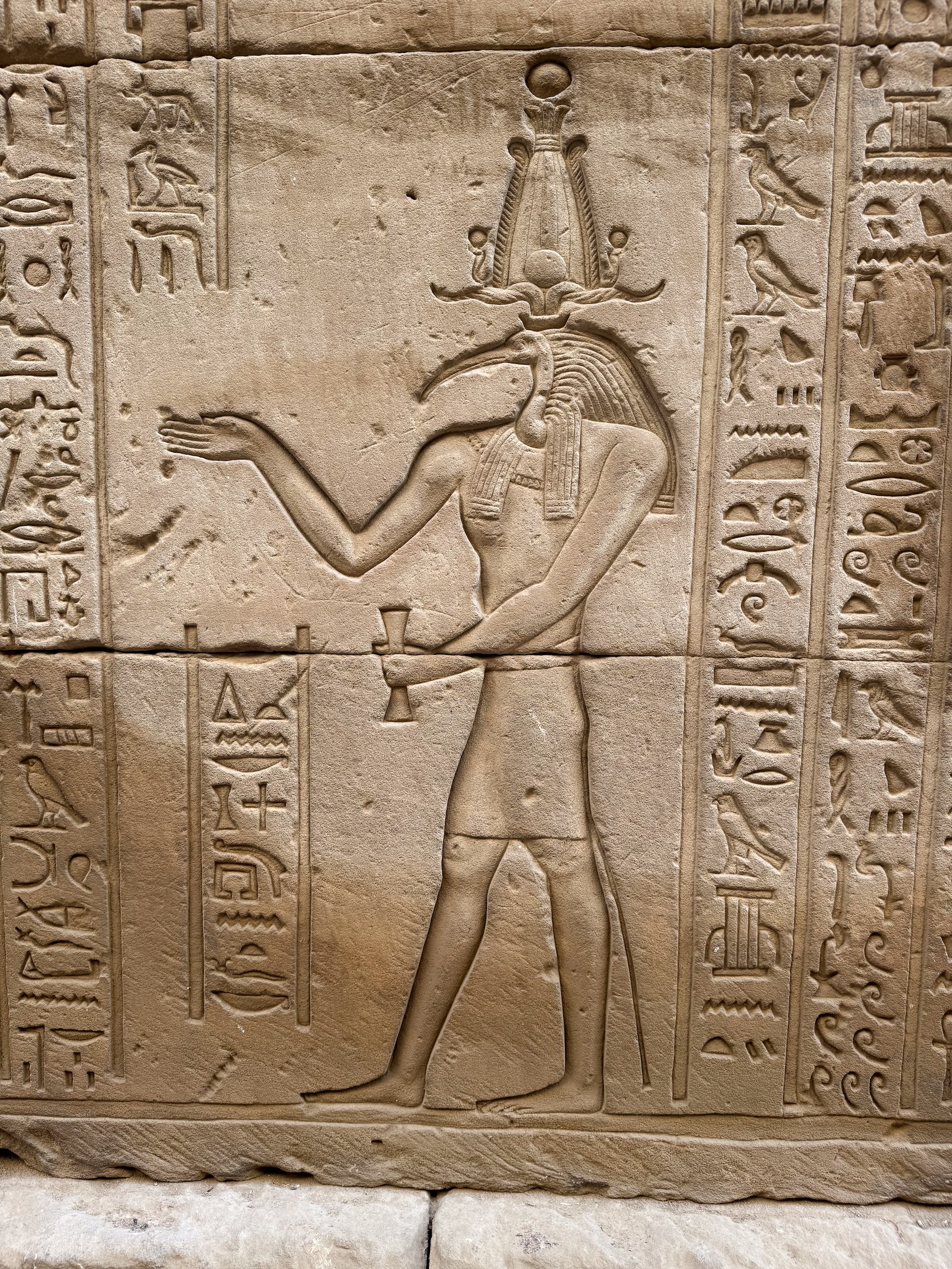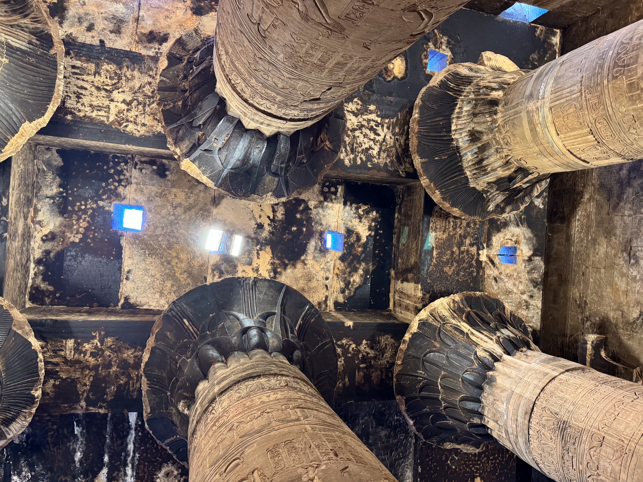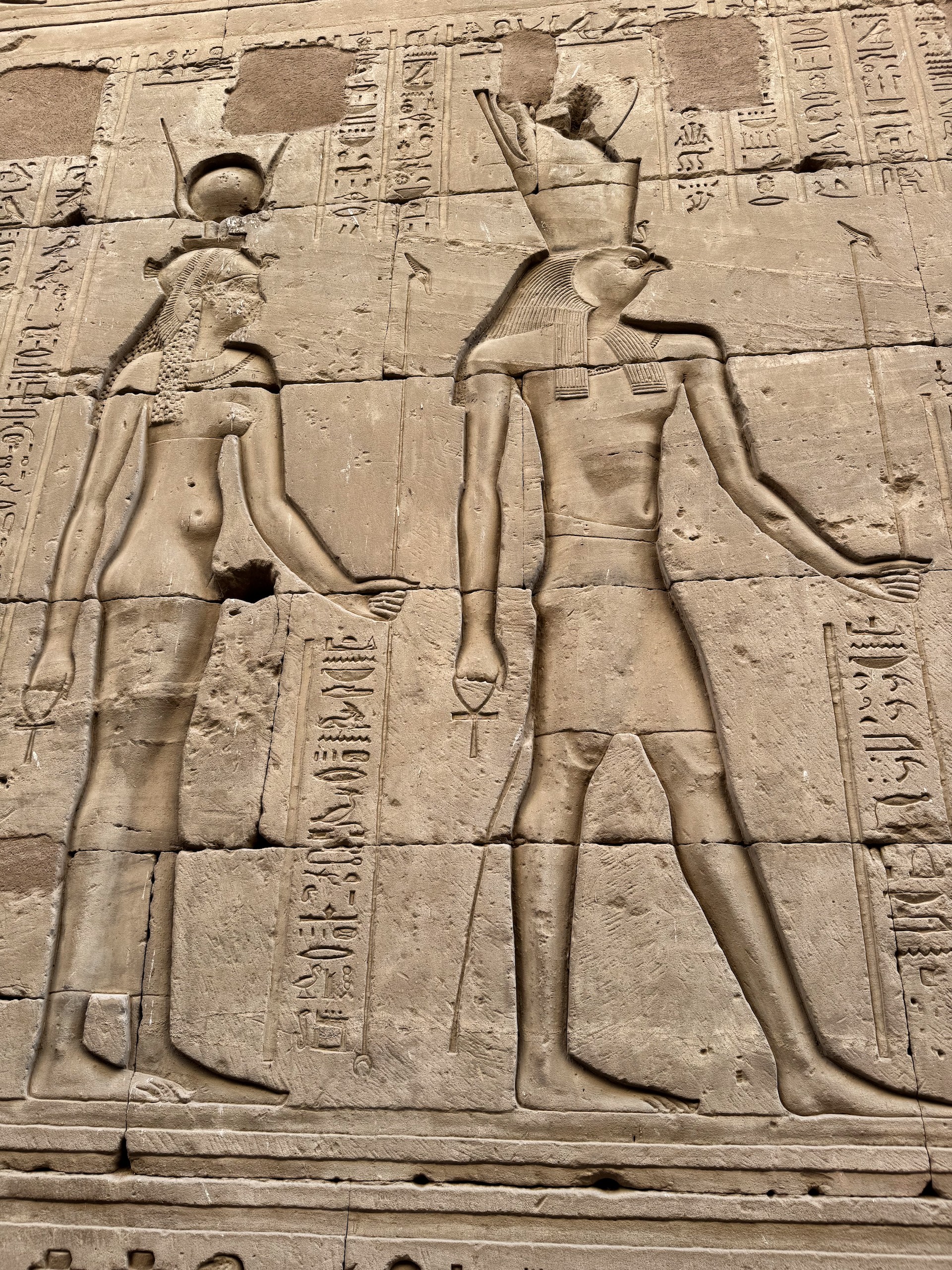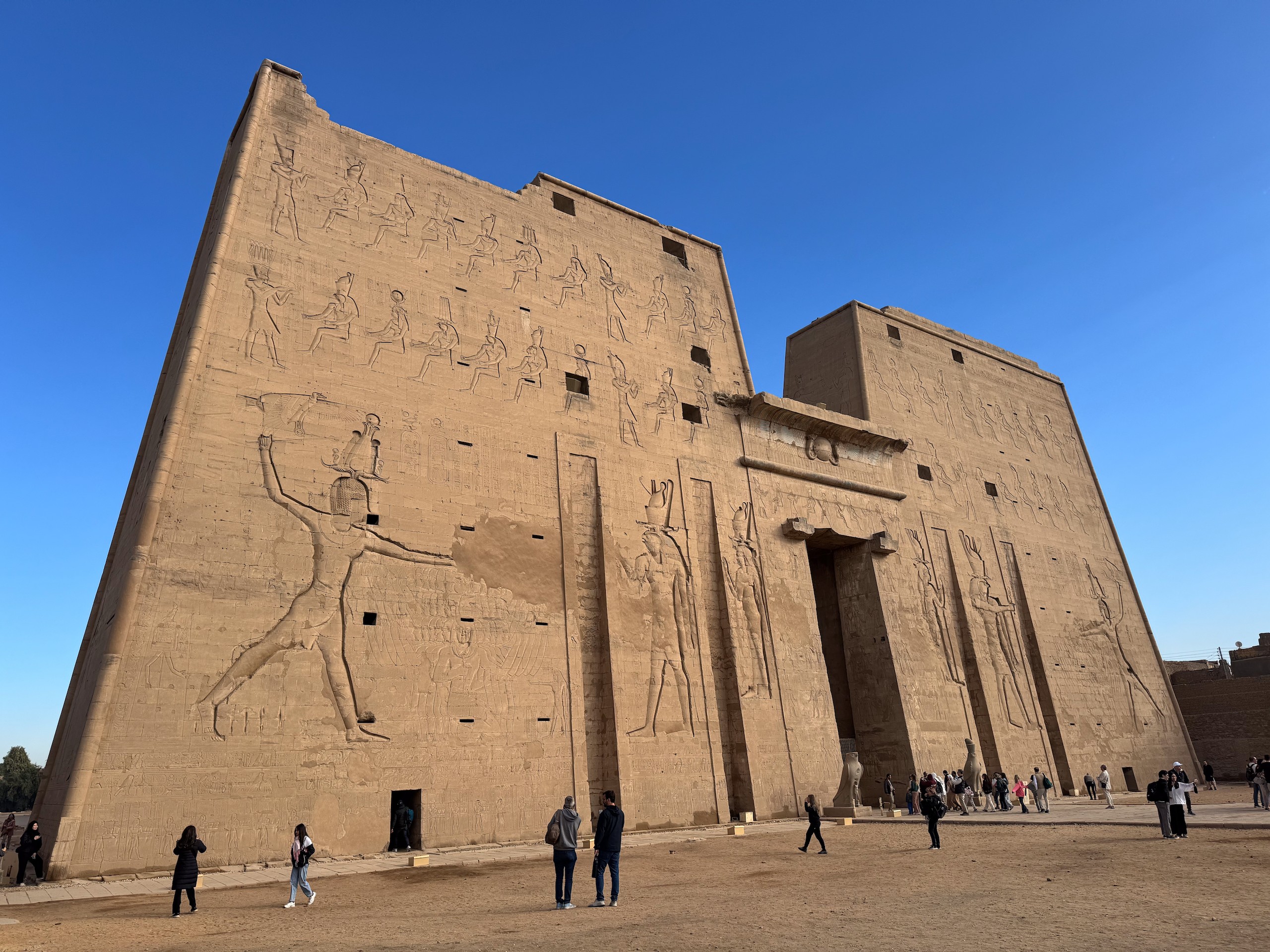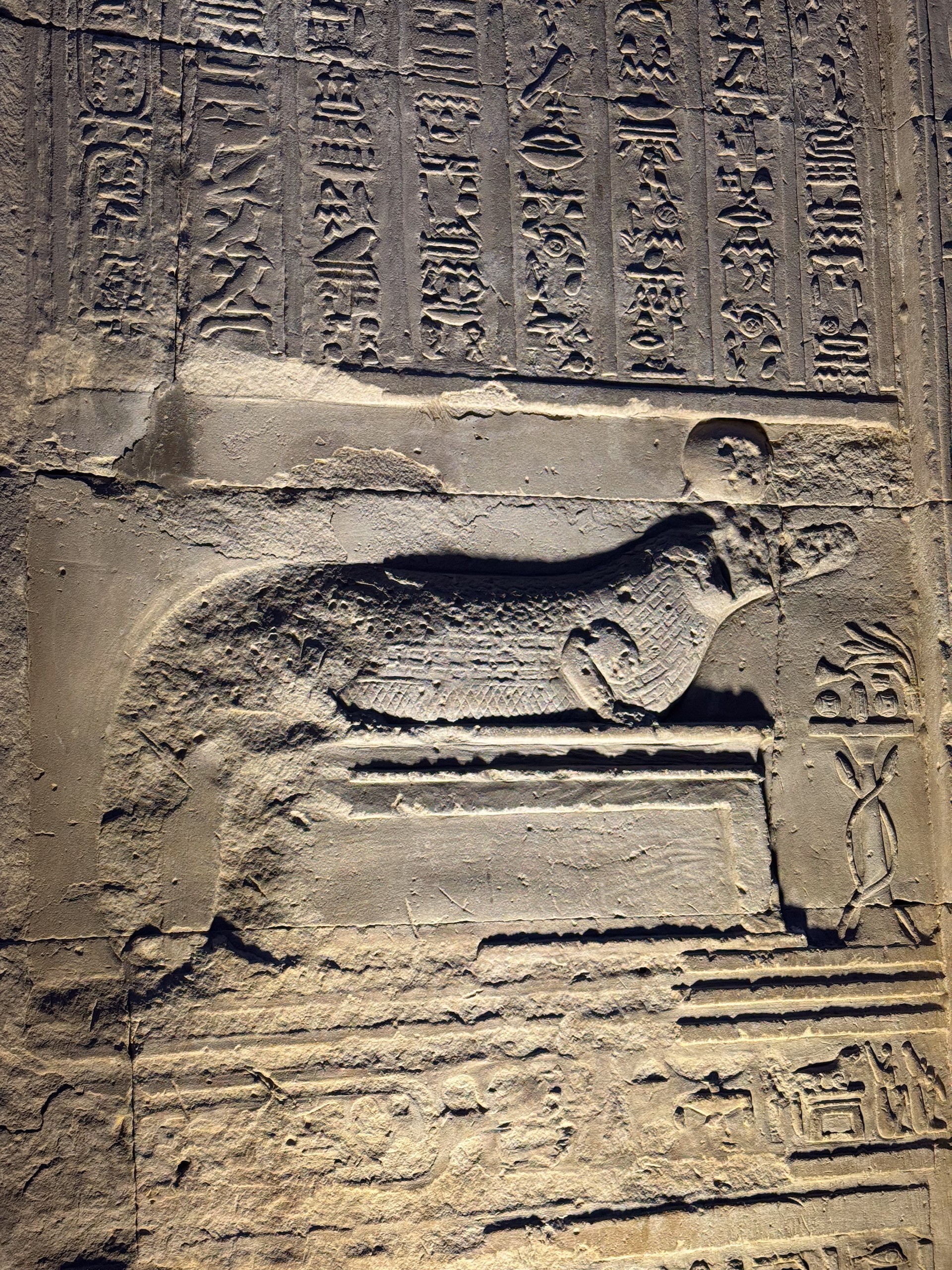 Um das Allerheiligste, den Raum Gottes am Ende des Tempelinneren zu sehen, muss man sich in eine riesige Menschentraube quetschen, um einen Blick auf die jetzt dort stehende göttliche Barke zu werfen. Diese Menschenmassen, die hier an allen Sehenswürdigkeiten sind, hängen natürlich mit den vielen Nil-Kreuzfahrtschiffen zusammen, die jeden Tag hier zur gleichen Zeit anlanden, so wie wir natürlich auch.