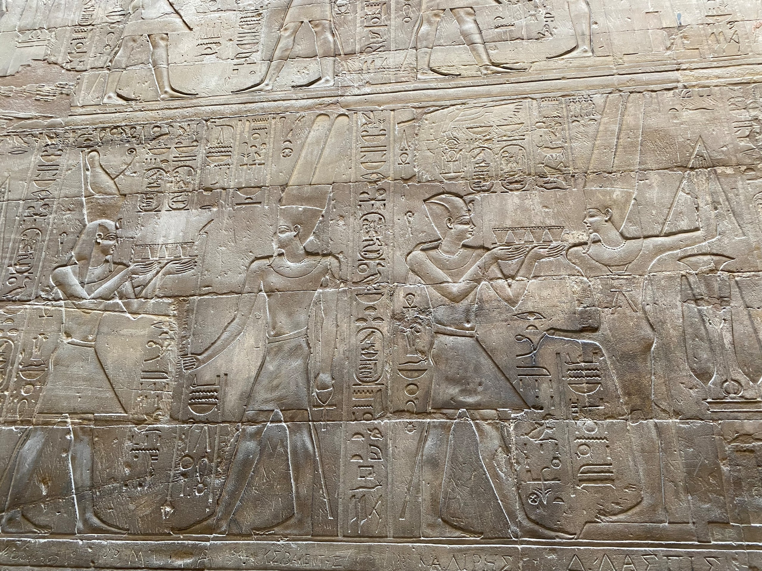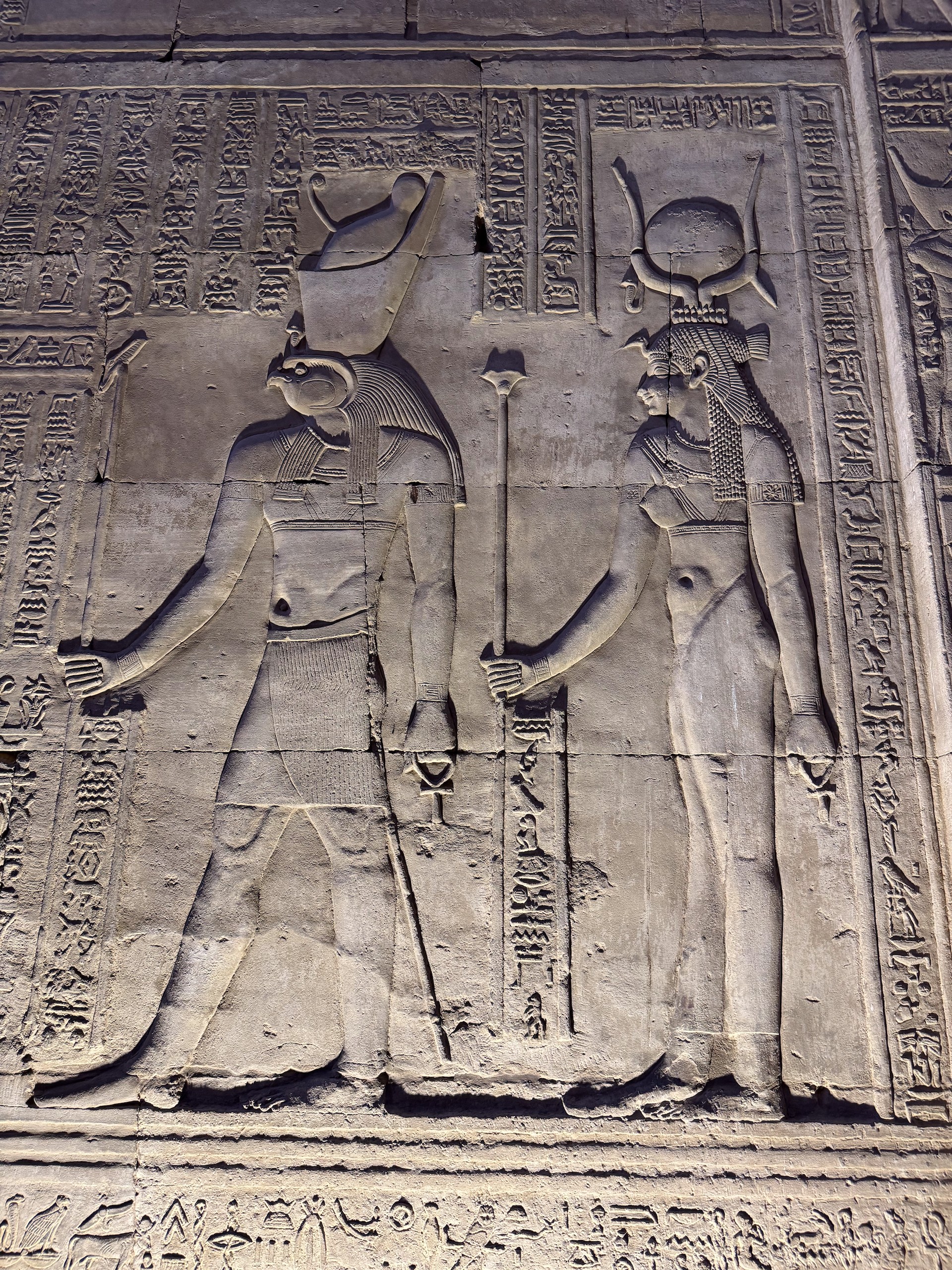 Hier an der Tempelanlage treffen wir auf den Rest unserer Gruppe, die aber auf einem anderen Schiff untergebracht sind. Auch sie sind mit ihrer Kategorie, die etwas einfacher ist als unsere, nicht zufrieden. Keine Ahnung, wie ihr Schiff aussieht. Jedenfalls besichtigen wir unter Mahmud's Führung den am besten erhaltenen Tempel Ägyptens. Auch hier bestaunen wir wieder die Unmengen an Wandzeichnungen. Schön, dass uns Mahmud auch die Geschichten zu einigen Zeichnungen erklärt.