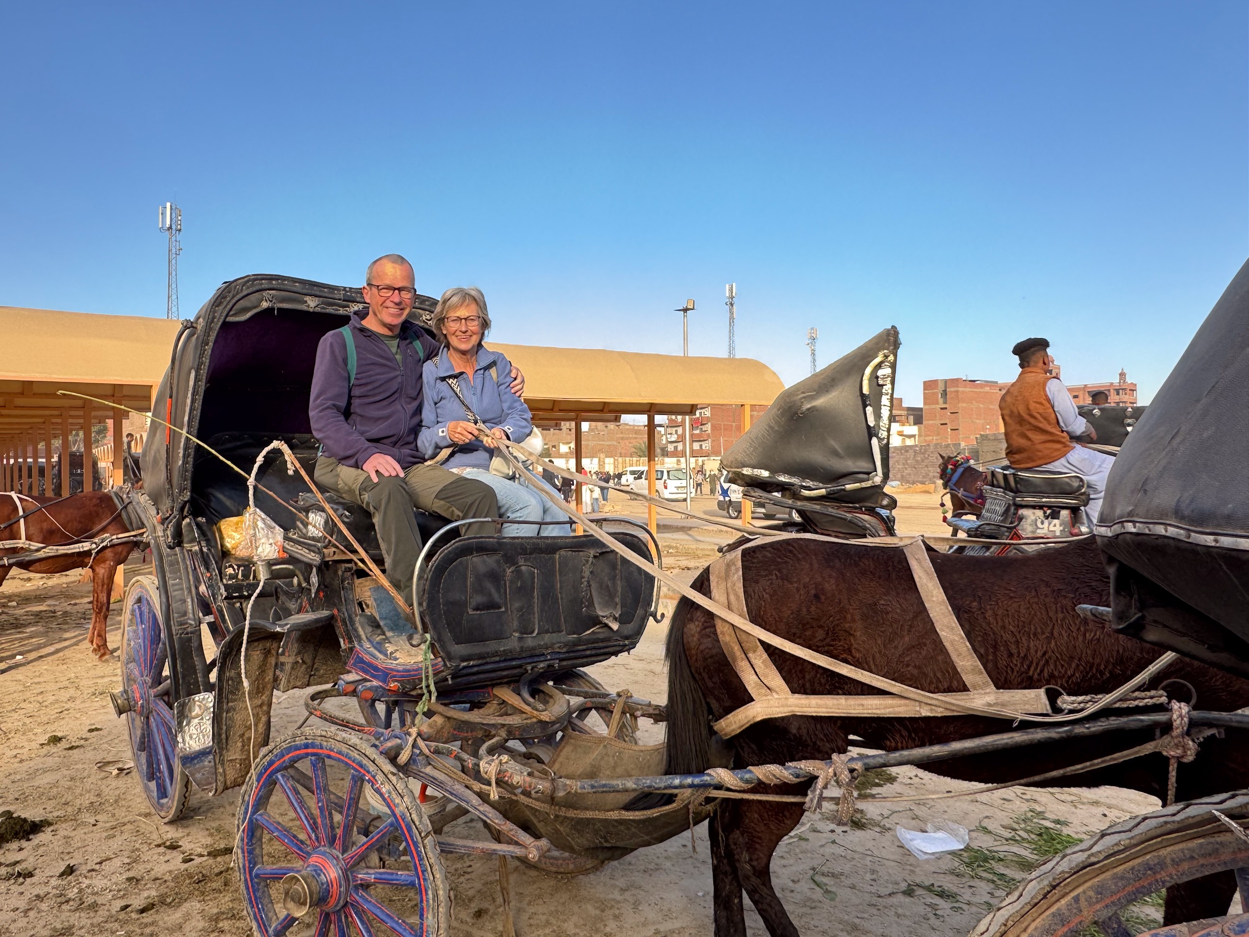 Also im Schweinsgalopp zur Rezeption und dort erklärt uns Mahmud, dass er mehrfach an der Rezeption Bescheid gegeben hat, dass man uns über den früheren Start informieren sollte. Nun ja, hat ja gut geklappt. Als wir unser Schiff verlassen, stehen an der Straße jede Menge Pferdekutschen, zum Teil wirklich abenteuerlich alt und runtergekommen. Wir fahren jetzt tatsächlich mit einer dieser Pferdekutschen zum Tempel von Horus.