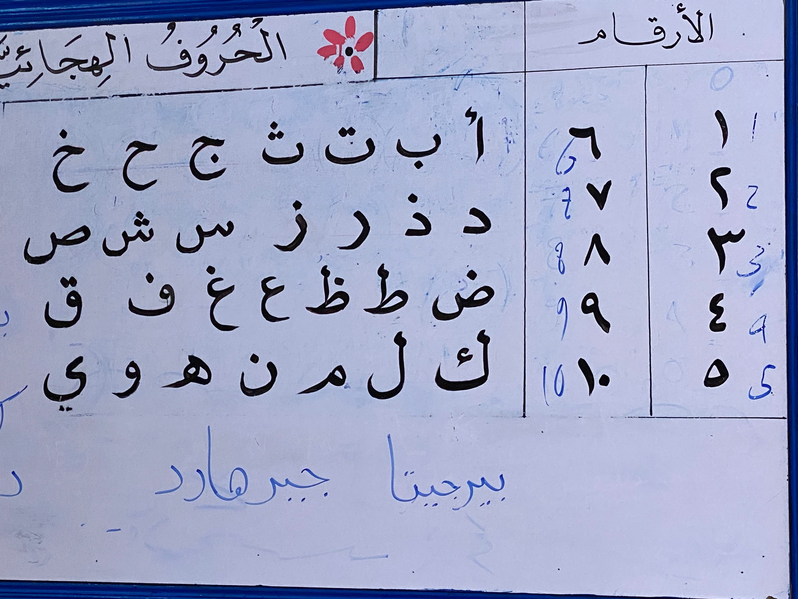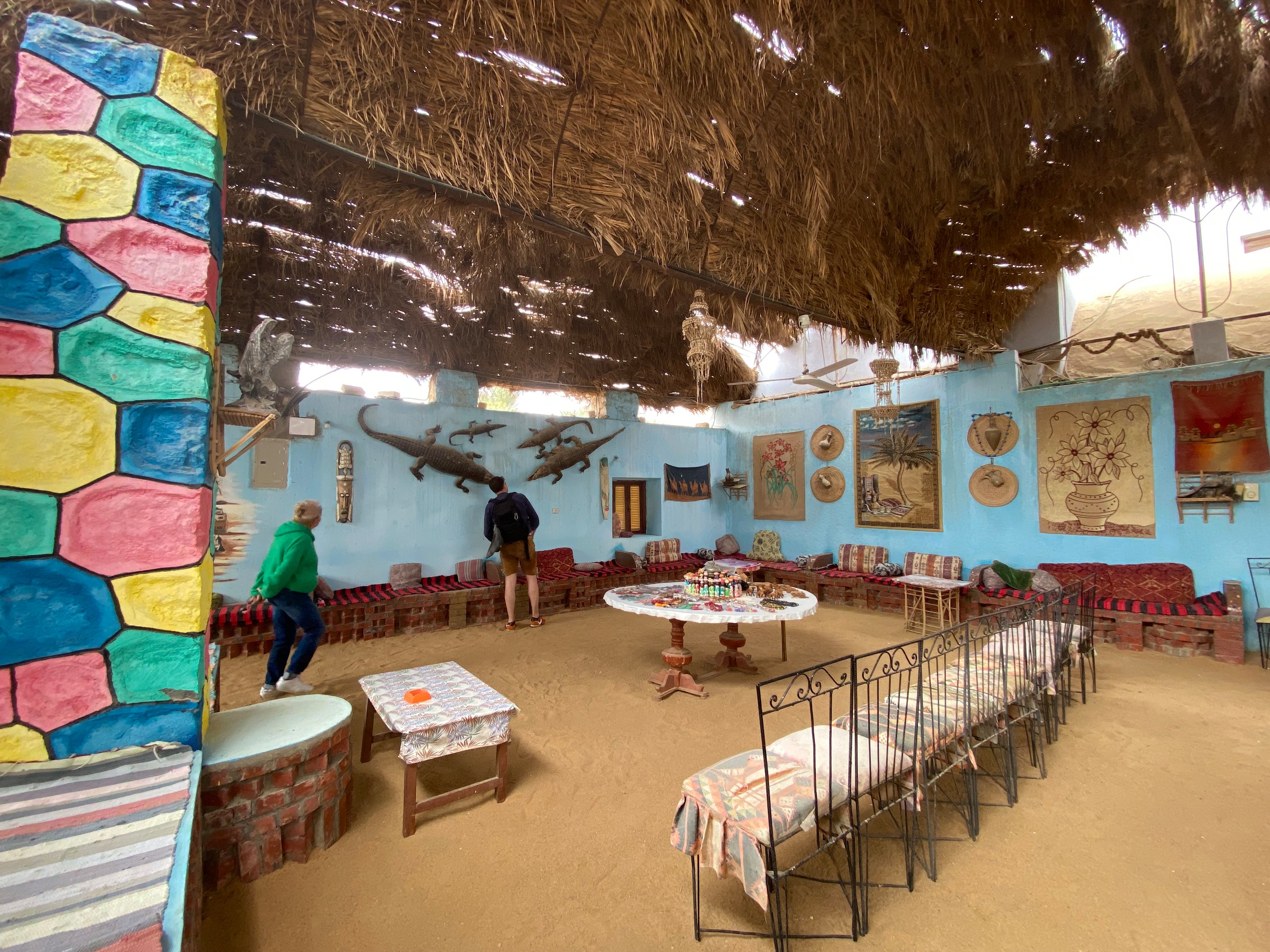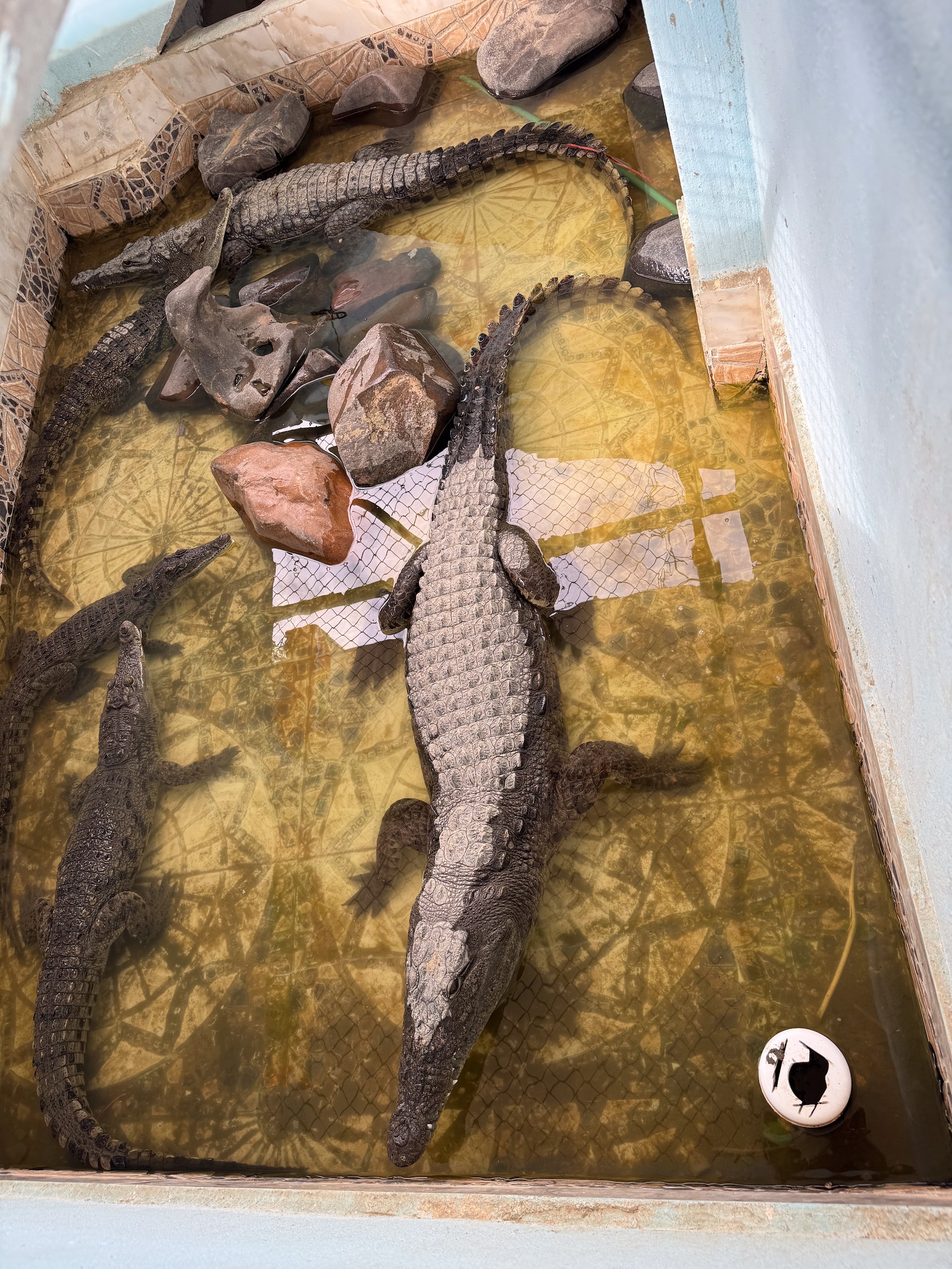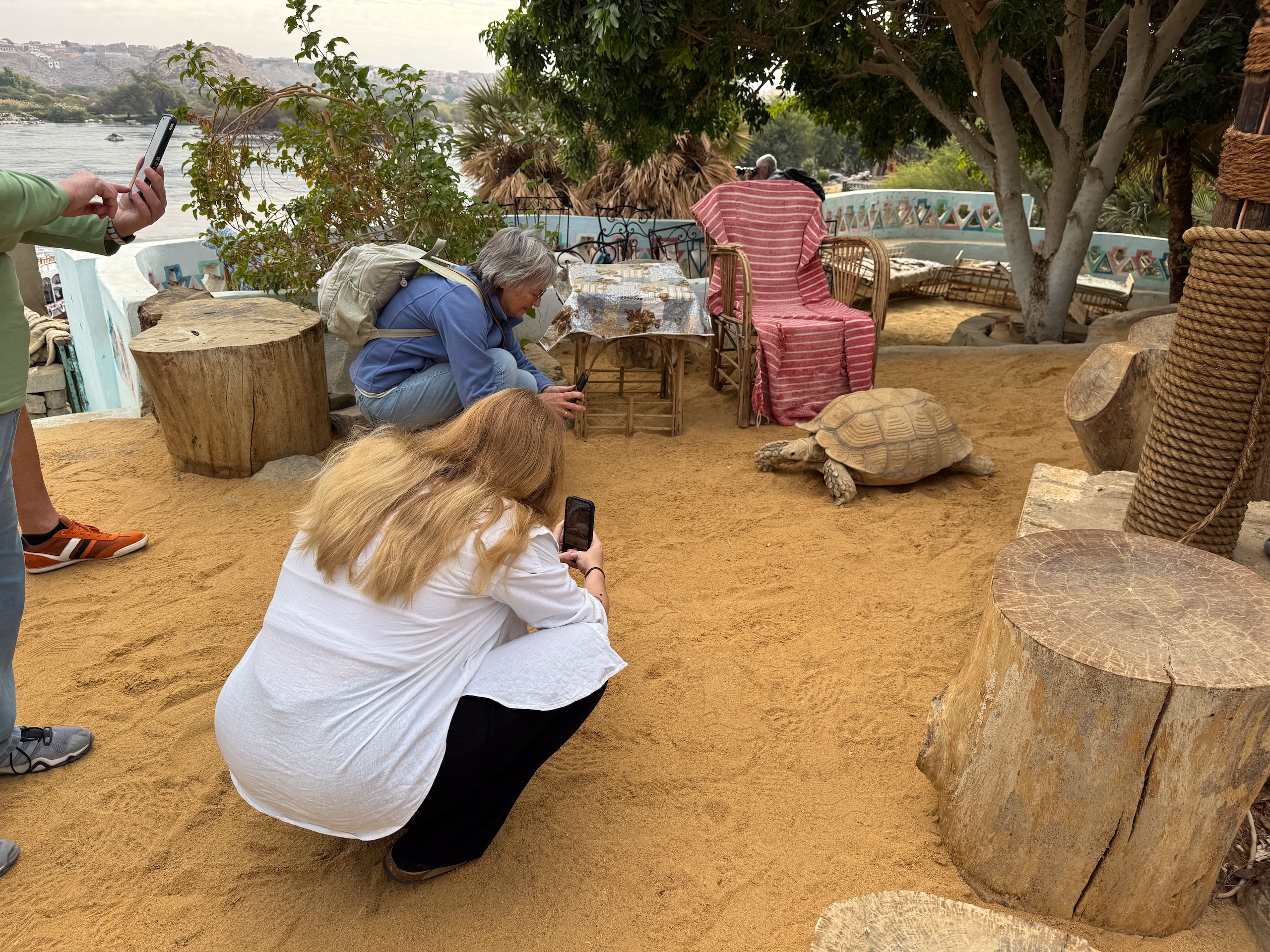 Hier besuchen wir eine Familie, d.h. wir können in ihrem Haus eine Tasse frischen Tee trinken und uns ihre Krokodilzucht ansehen. Eine recht große Schildkröte läuft hier auch noch herum. Ein paar Meter weiter besuchen wir dann eine Schule und bekommen das arabische Alphabet und die Zahlen erklärt. Auch die Nubische Sprache erklärt man uns, wobei es wohl keine Nubische Schriftform gibt. Wir haben alle viel Spass und kennen jetzt unsere Namen in arabischen Schriftzeichen ... zumindest halbwegs.