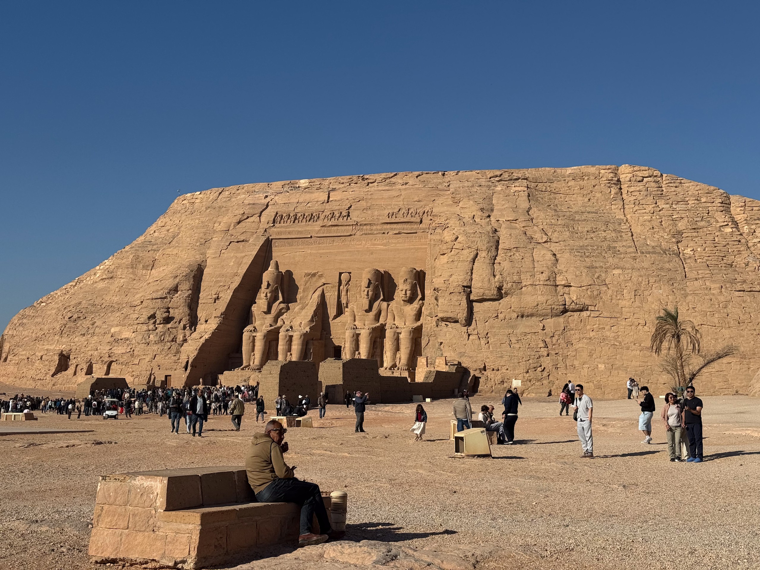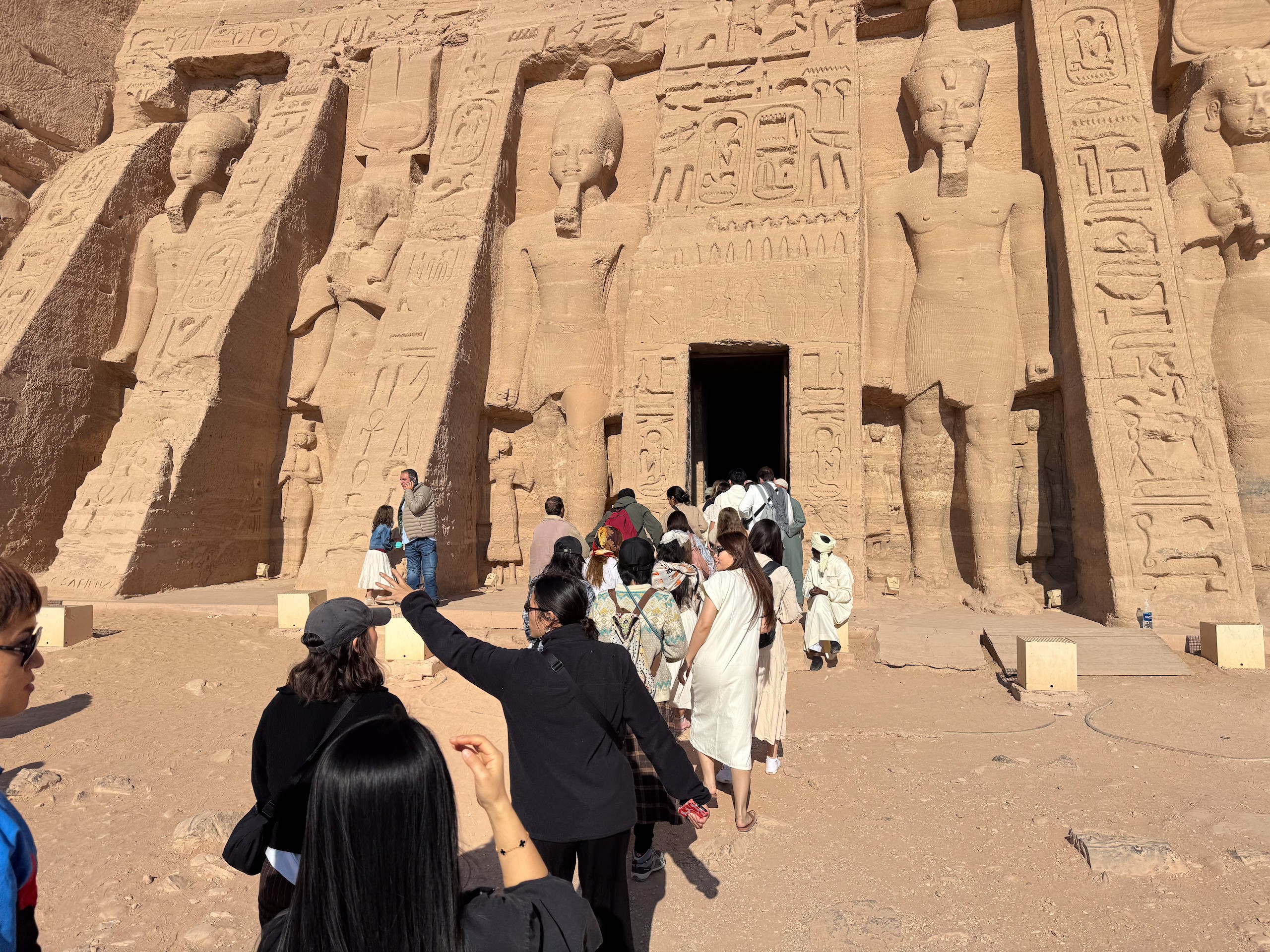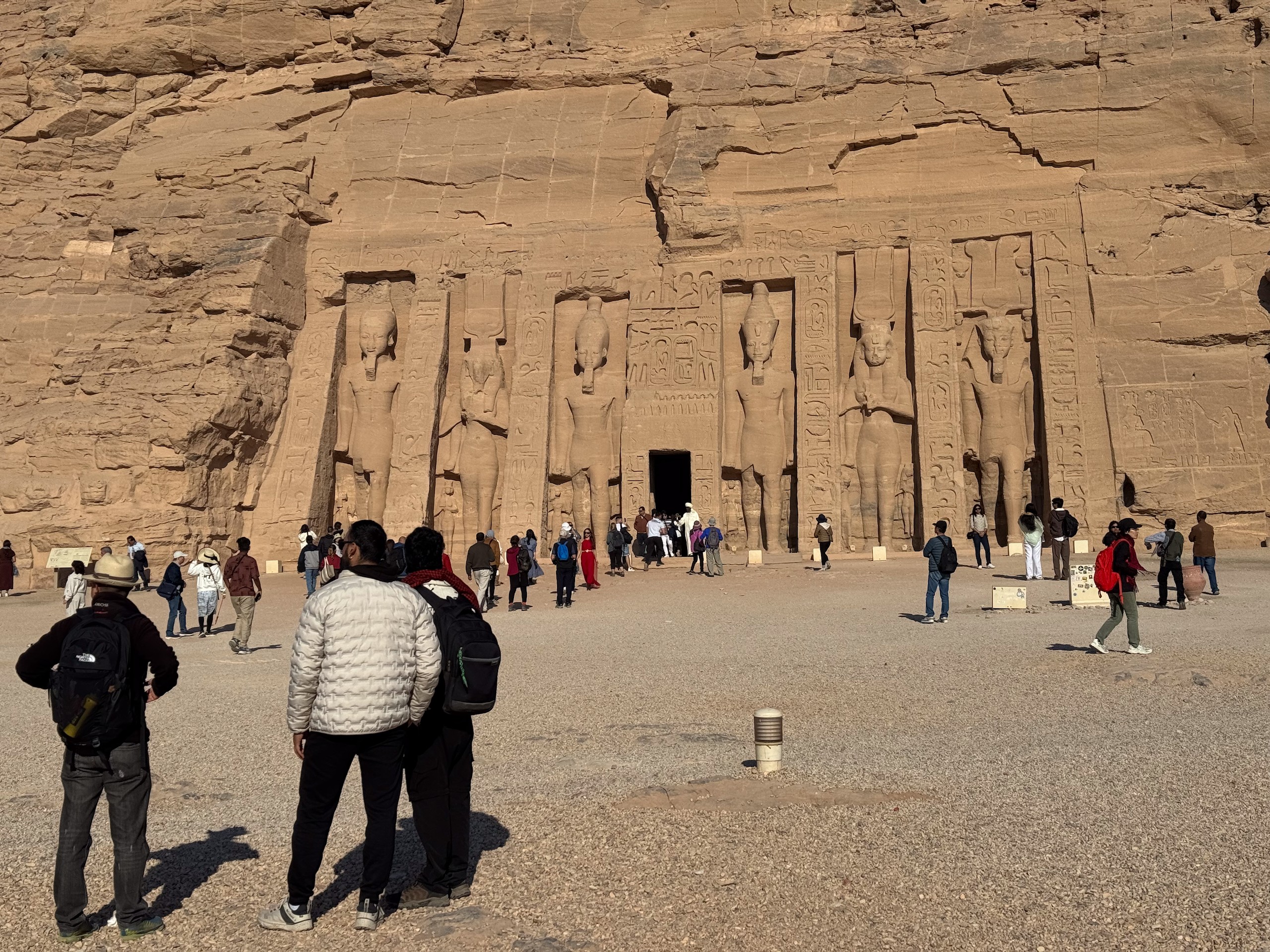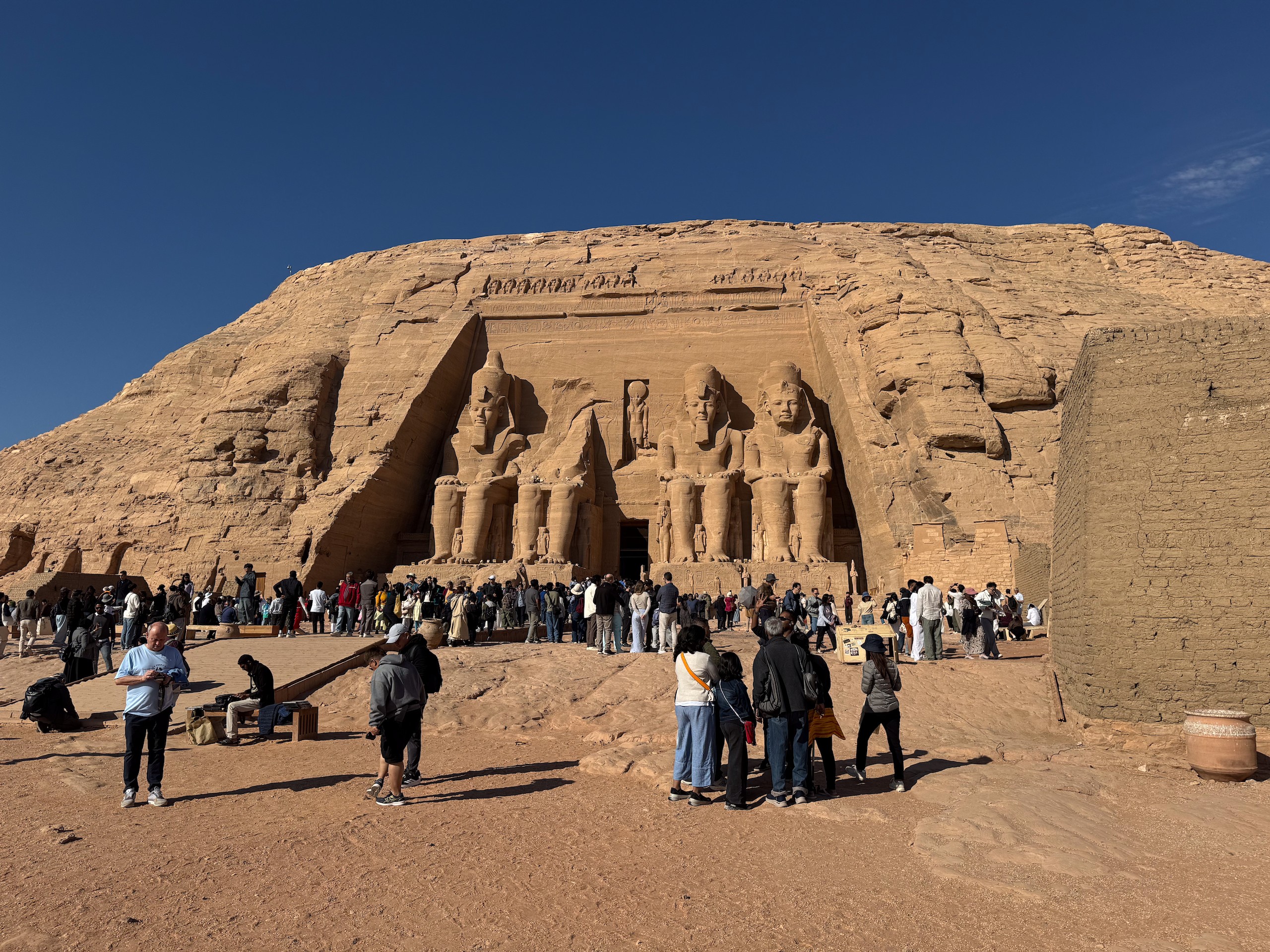 Dann geht es schnell weiter, wir erreichen den Parkplatz als Zwischenstopp aber leider nicht wie geplant zum Sonnenaufgang. Knapp verpasst, trotzdem machen alle die obligatorischen Fotos in der Wüste und dann geht es flott weiter. Als wir um zirka 8.30 Uhr Abu Simbel erreichen, ist schon jede Menge los. Erstaunlich, wie viele Menschen sich dafür so zeitig aus dem Bett gequält haben.