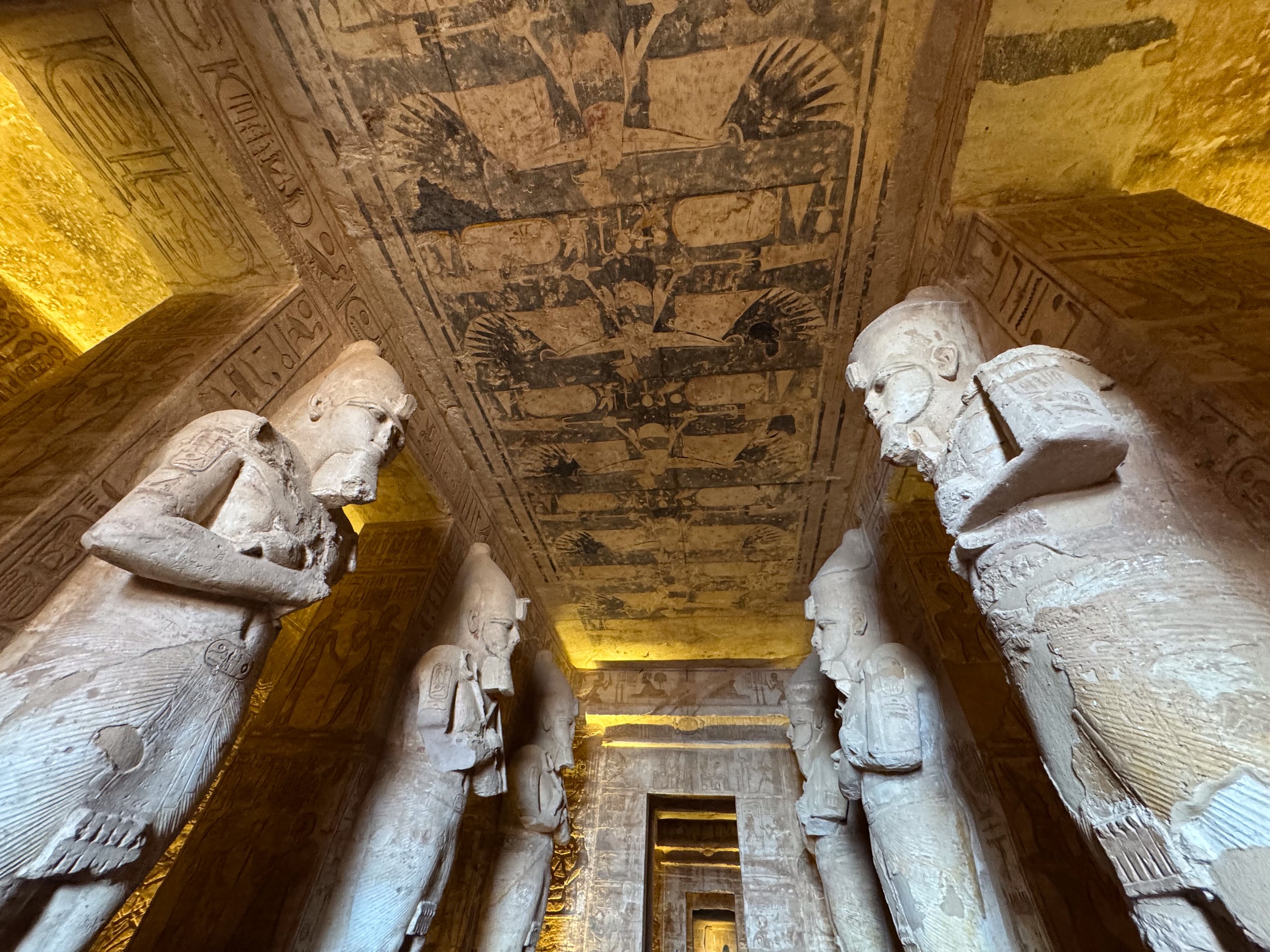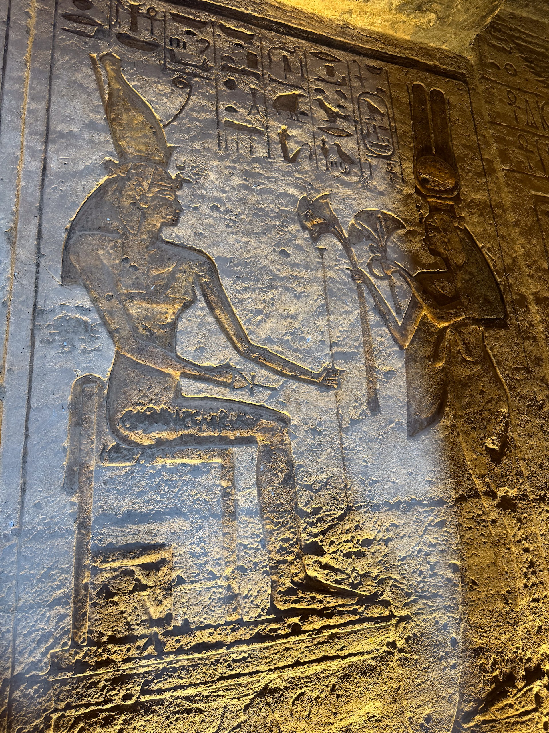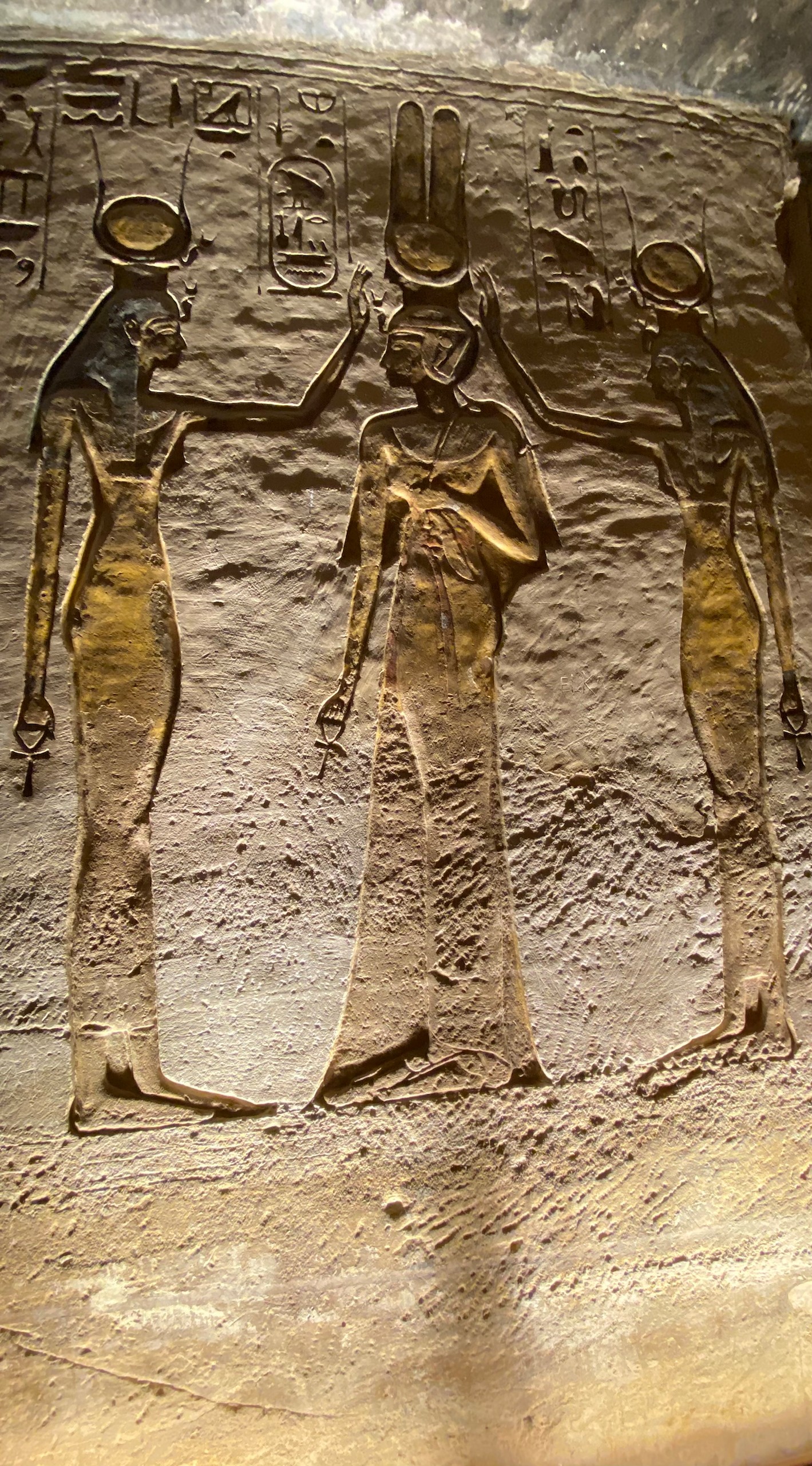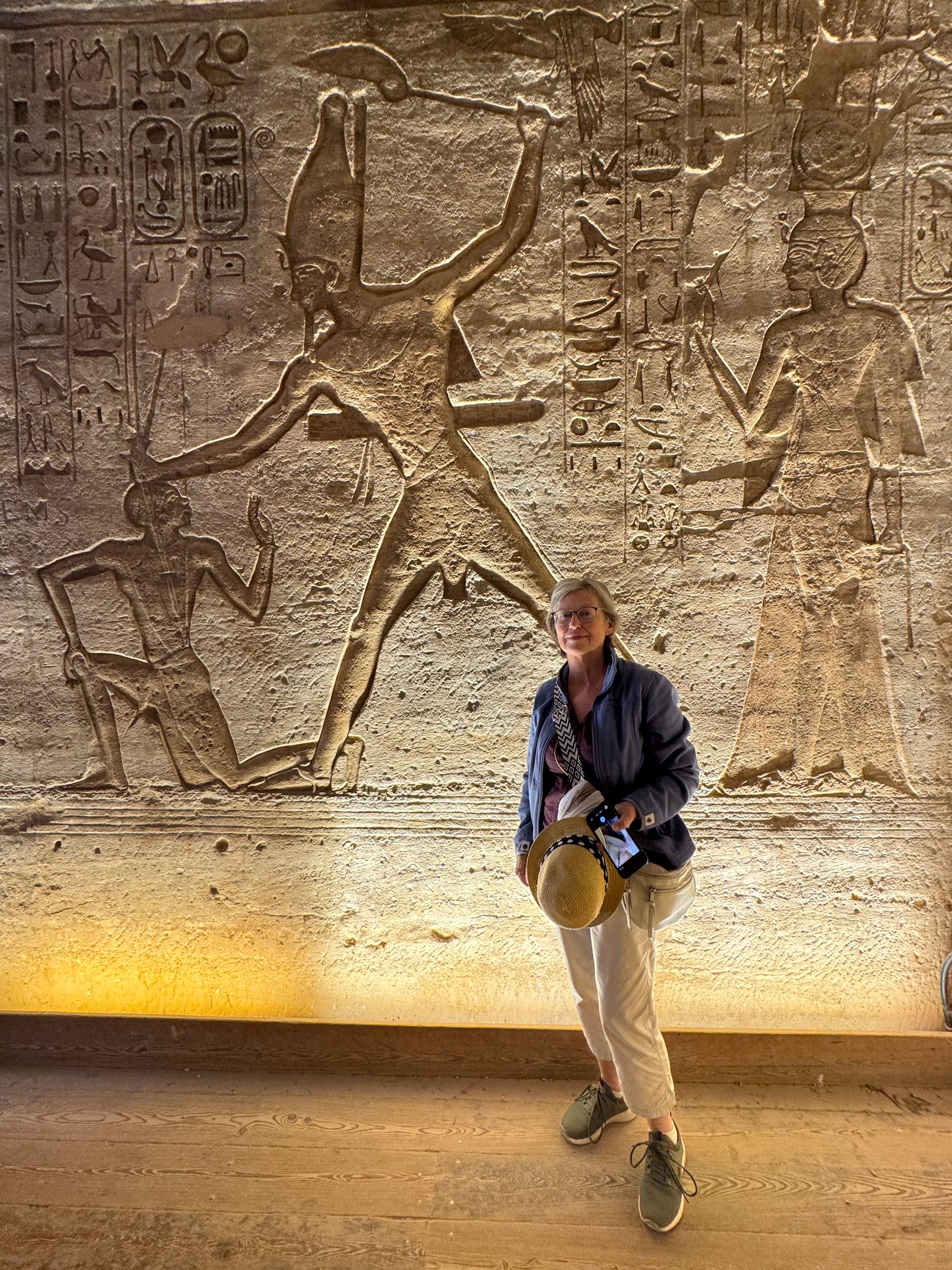 So hat man in der Zeit von 1963 bis 1968 alles in Kleinteile zerlegt und 63 Meter höher wieder aufgebaut. Dazu mussten künstliche Hügel angelegt werden, die von hinten wie unsere Zechenberge aussehen. Ursprünglich waren die Tempel in Felsen geschlagen. Ich könnte ewig weiter erzählen, aber das führt zu weit. Jedenfalls ist eine der vier Ramsesstatuen zerstört. Das ist aber bereits zu seinen Lebzeiten des Pharaos durch ein Erdbeben passiert, man hat es Ramses aber nie gesagt, weil das ein schlechtes Omen war. Ob das berechtigt war, weiß ich aber nicht.