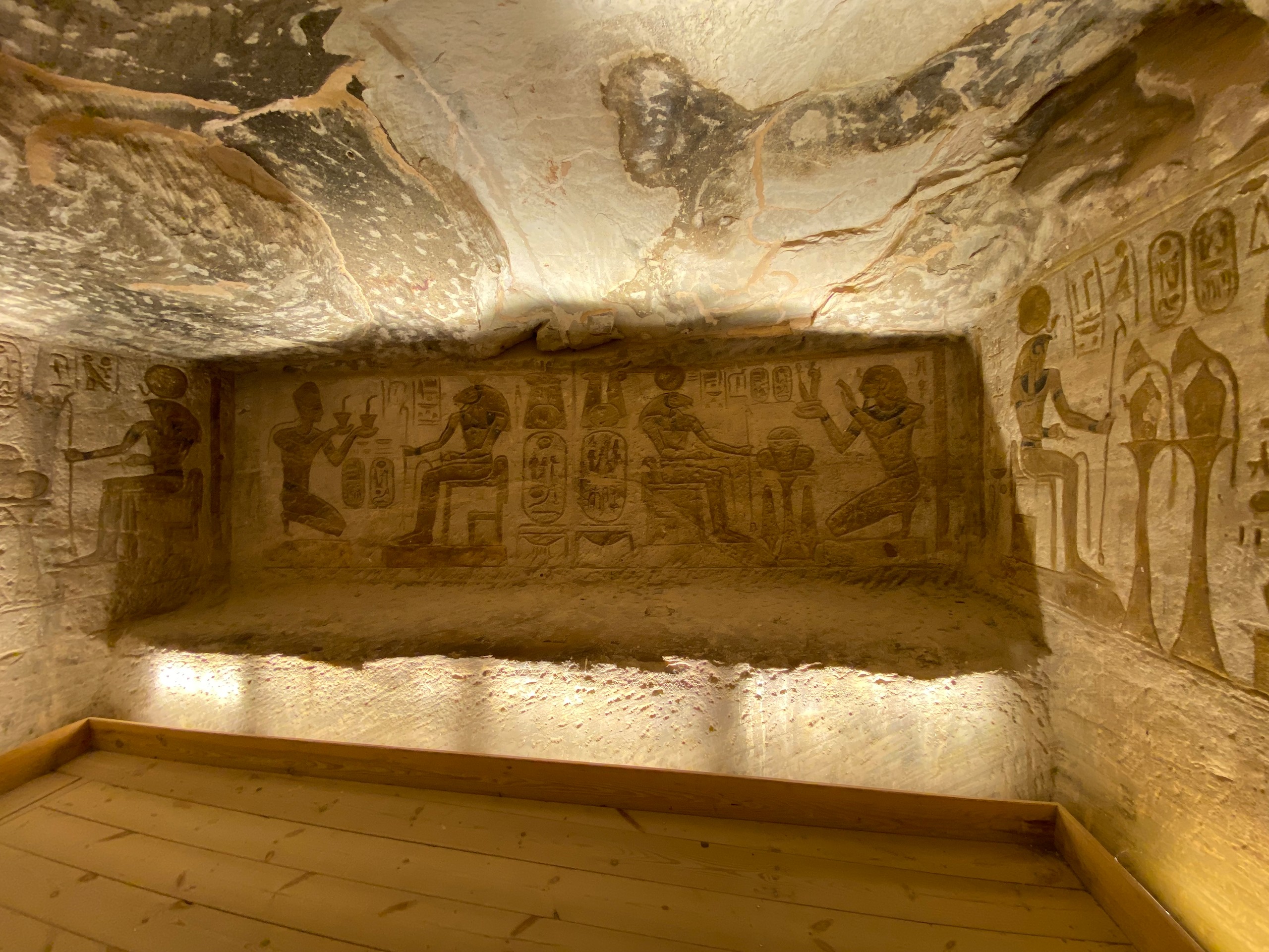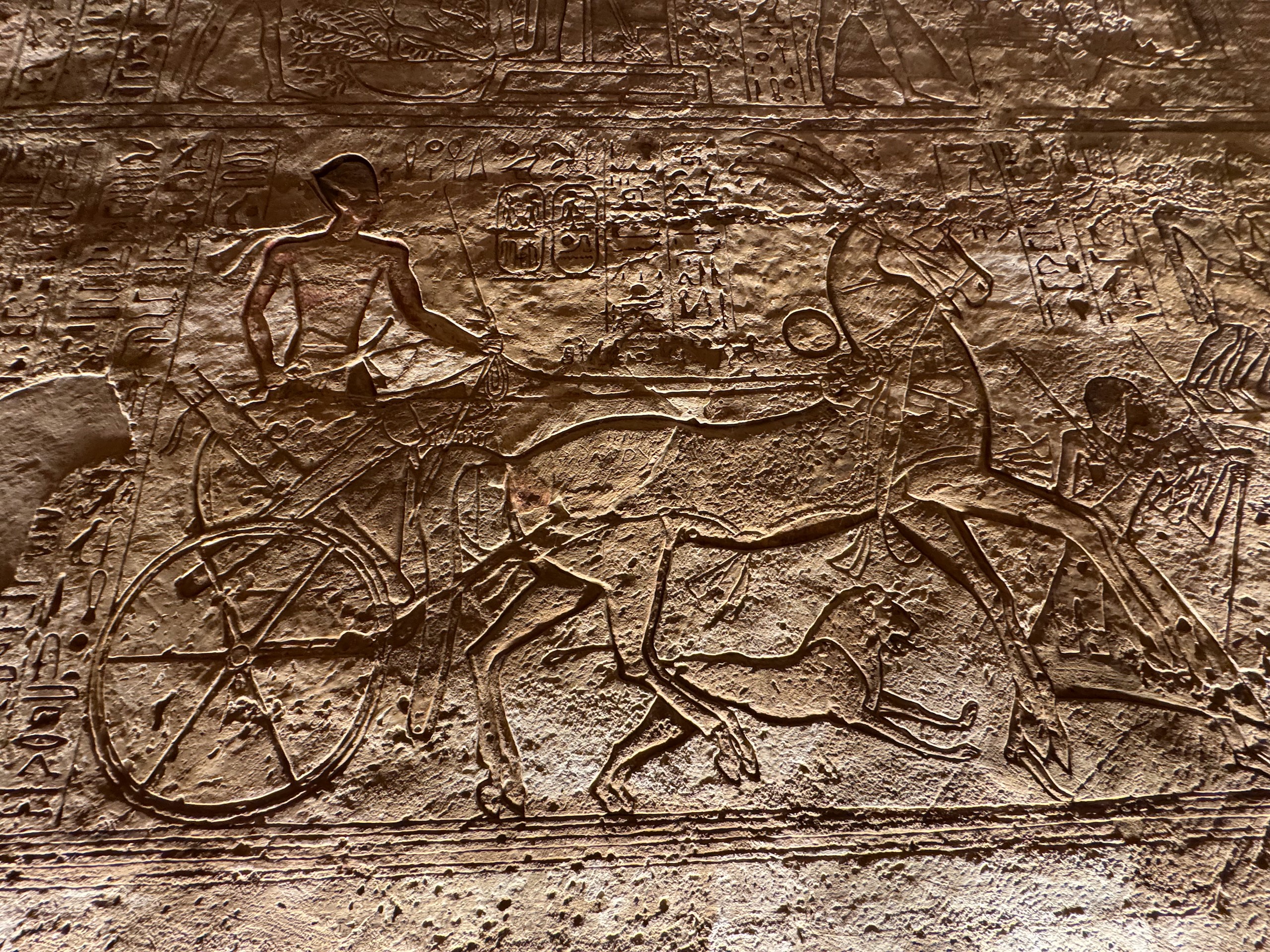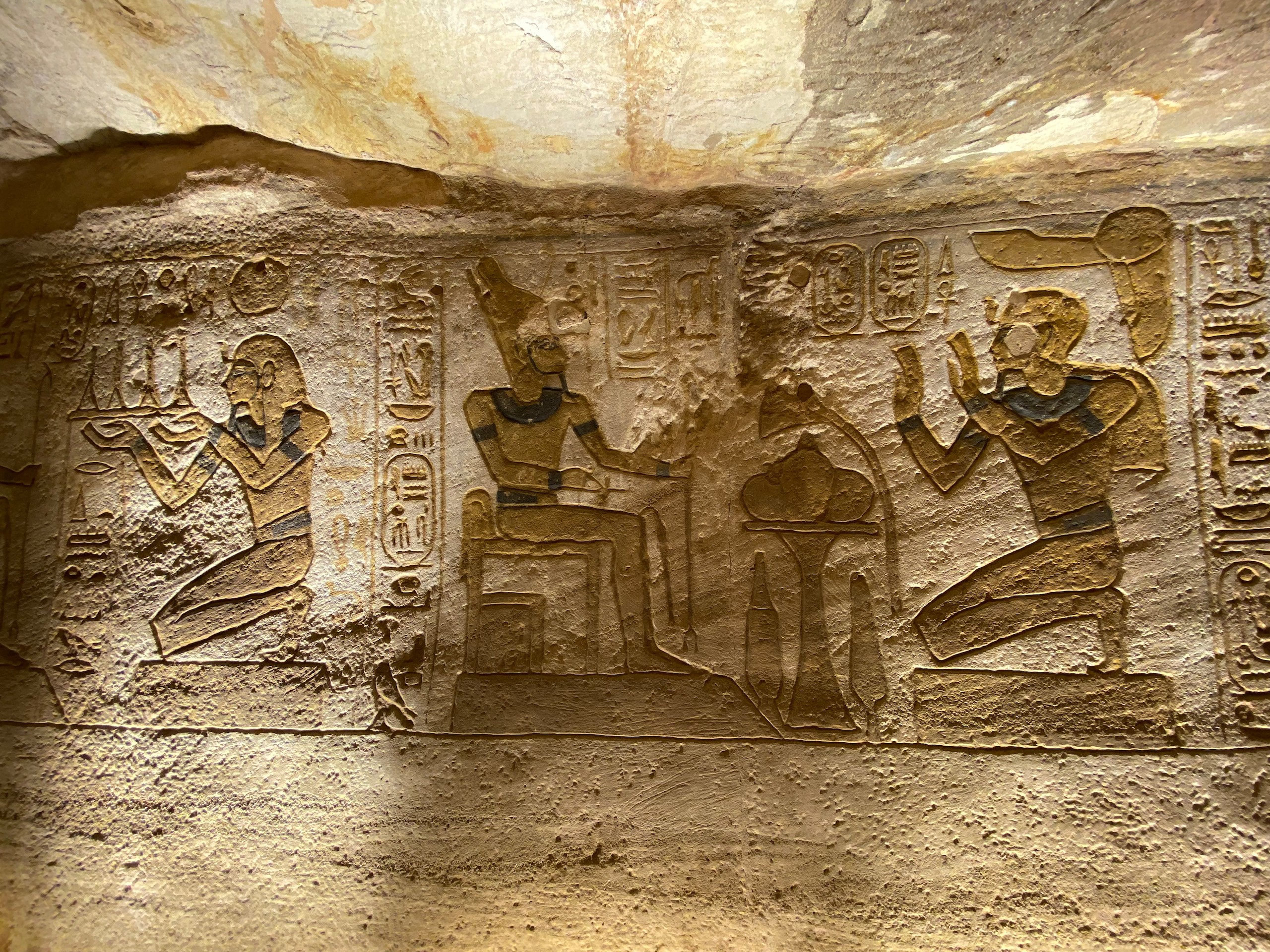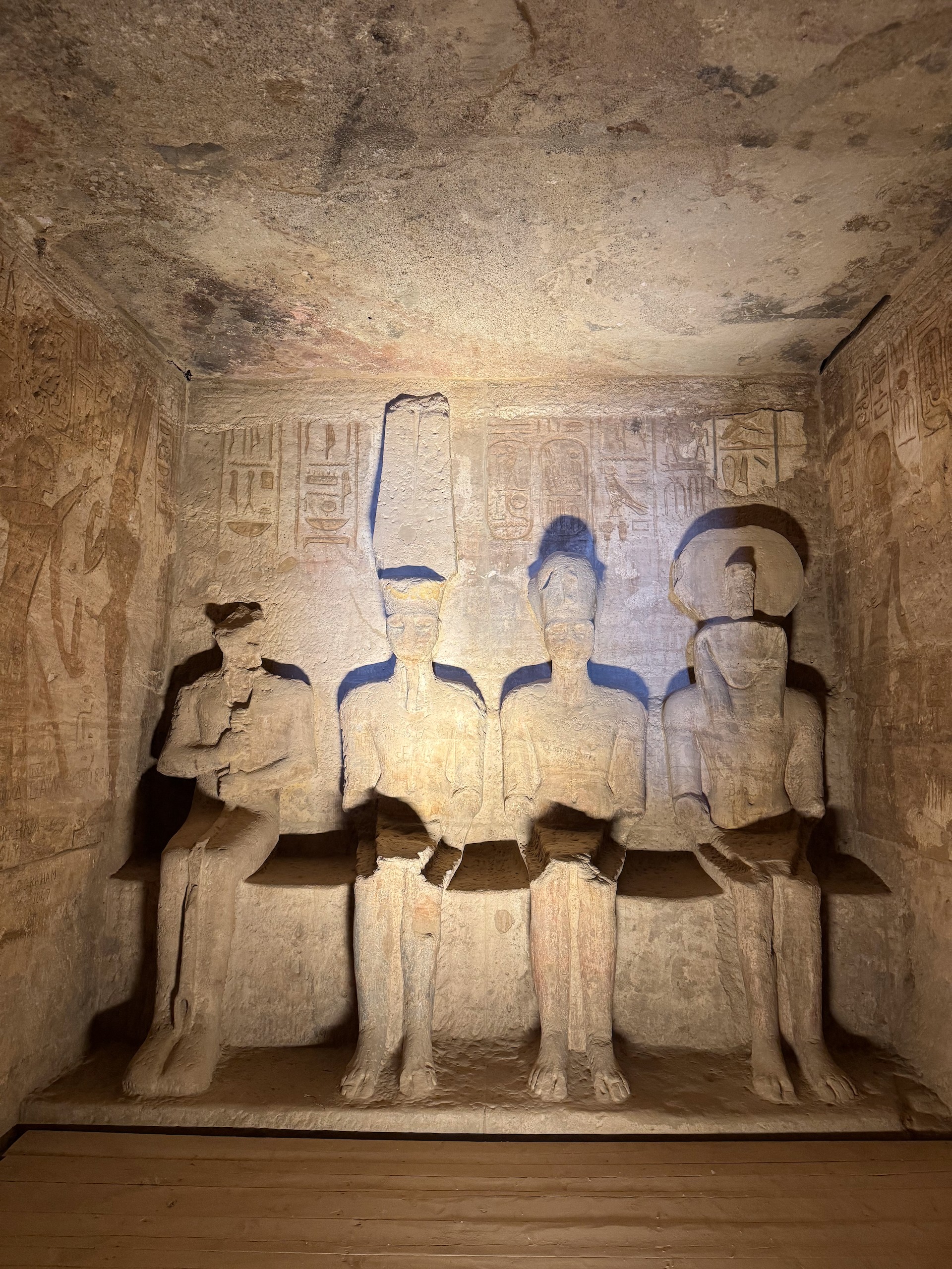 So hat man in der Zeit von 1963 bis 1968 alles in Kleinteile zerlegt und 63 Meter höher wieder aufgebaut. Dazu mussten künstliche Hügel angelegt werden, die von hinten wie unsere Zechenberge aussehen. Ursprünglich waren die Tempel in Felsen geschlagen. Ich könnte ewig weiter erzählen, aber das führt zu weit. Jedenfalls ist eine der vier Ramsesstatuen zerstört. Das ist aber bereits zu seinen Lebzeiten des Pharaos durch ein Erdbeben passiert, man hat es Ramses aber nie gesagt, weil das ein schlechtes Omen war. Ob das berechtigt war, weiß ich aber nicht.