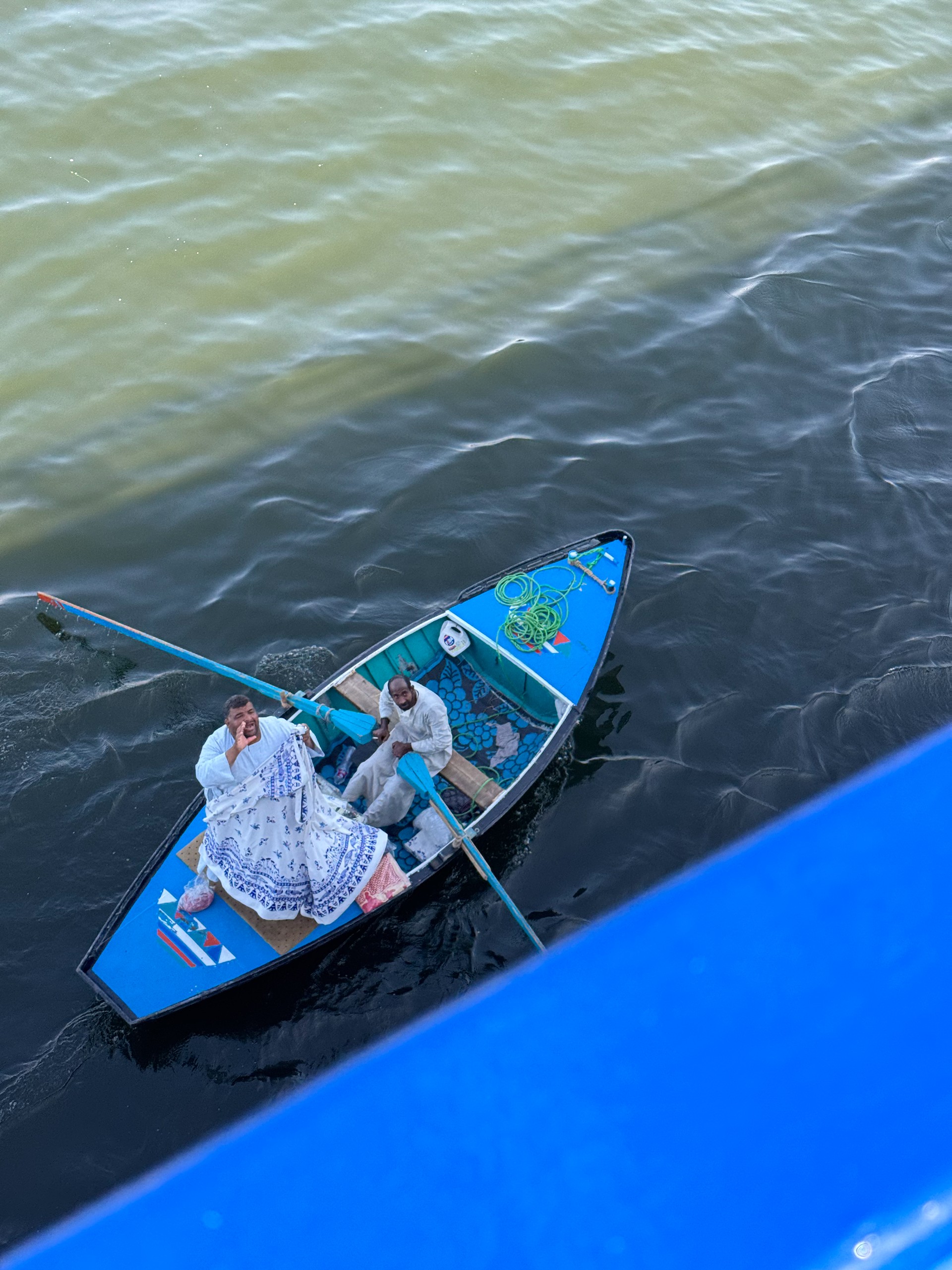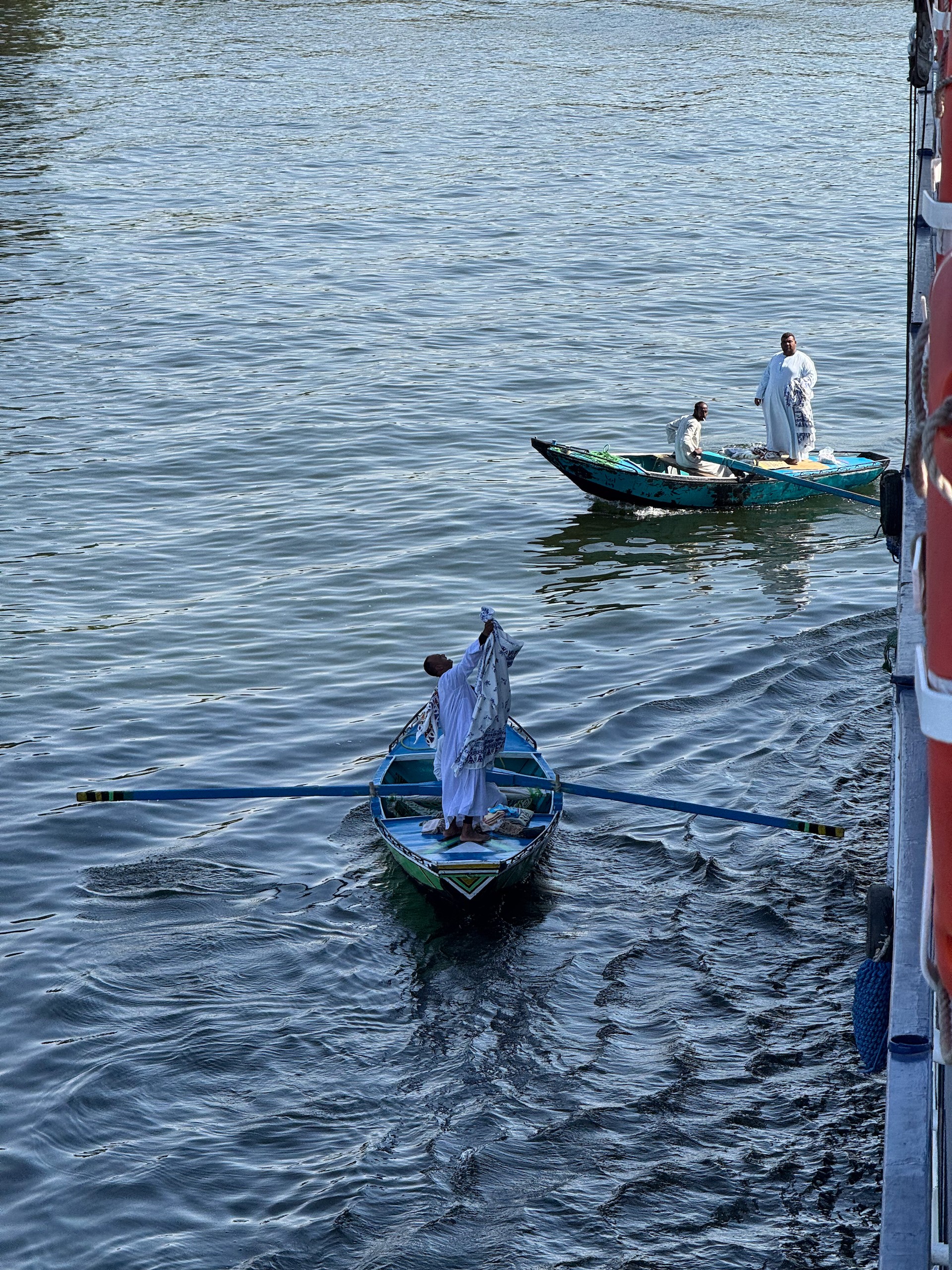 Während wir alle hier parken, kommen fliegende (eigentlich in dem Fall rudernde) Händler, die versuchen, Tücher und Tischdecken an den Mann zu bringen. Da wird über 4 Etagen gefeilscht, die Ware zum anschauen auf das Sonnendeck oder in die entsprechenden Zimmer geworfen und das Geld in einem anderen Päckchen zurück auf’s Boot geworfen. Da wir gerade vor Esna liegen, hören wir gleichzeitig den Muezzin von allen Türmen zum Gebet rufen. Das ist eine unglaubliche Geräuschkulisse.