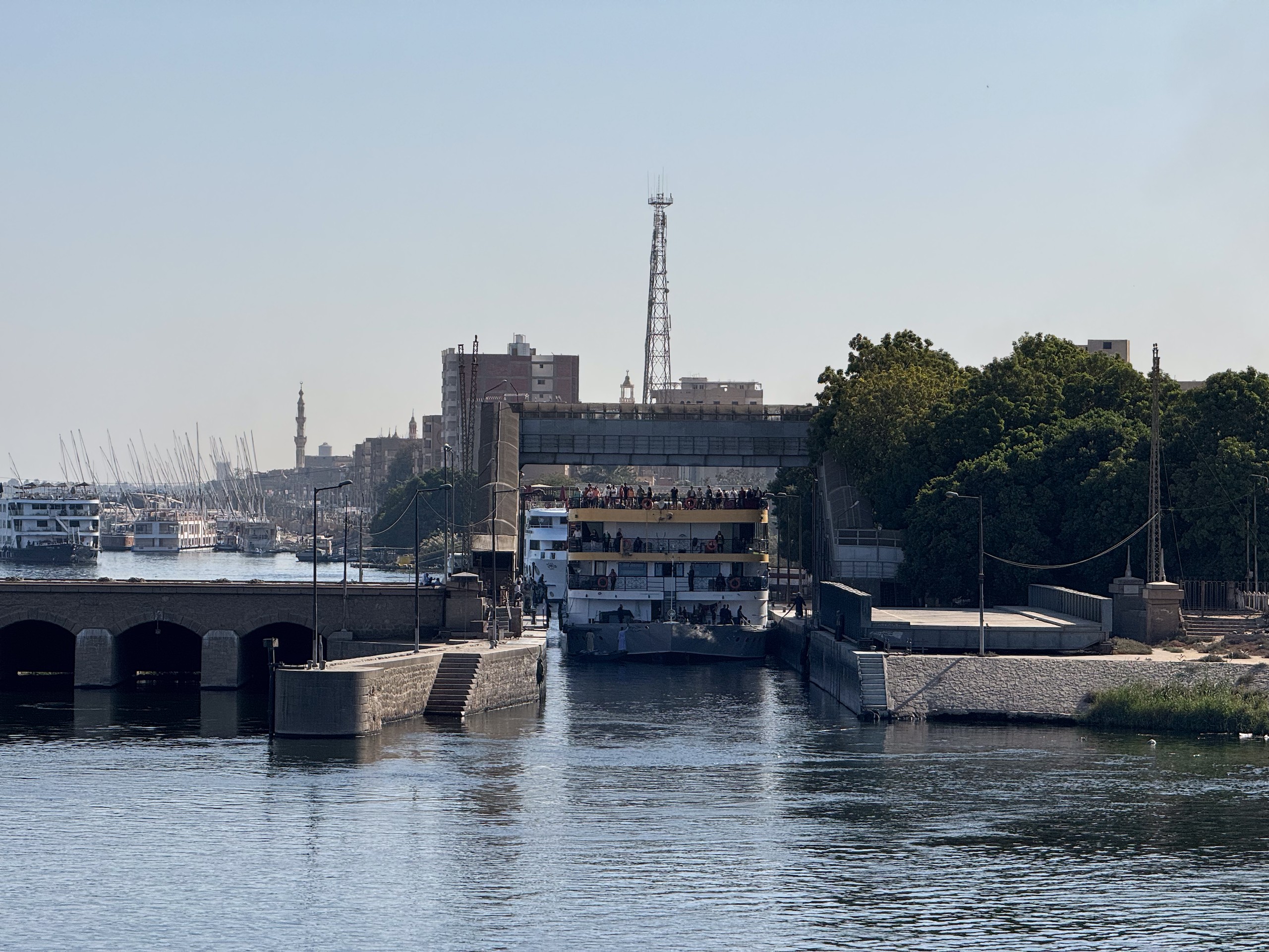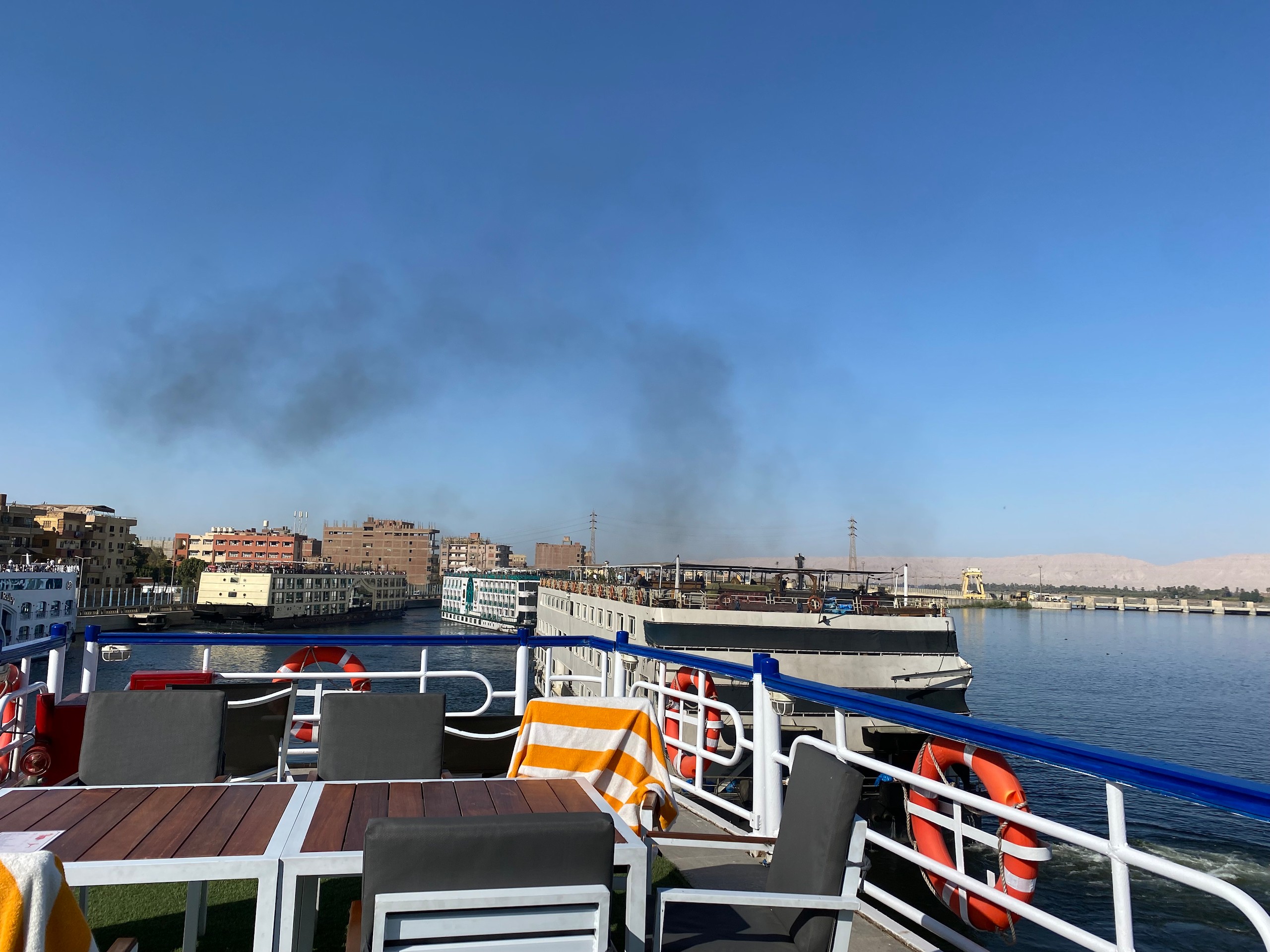 Heute haben wir erst mal ausgeschlafen, obwohl ich durch diverse Motorengeräusche des Nachbarschiffes bereits früher wach bin. Ich fühle mich irgendwie, als ob ich in einer Fabrikhalle liege. Heute Vormittag sitzen wir gemütlich auf dem Sonnendeck. Wir beobachten die Karawane der Kreuzfahrtschiffe. Zeitweise zähle ich 17 Stück in Sichtweite. Da wir hier vor Luxor durch eine Schleuse müssen, parken wir zeitweise in großen Gruppen, bevor es langsam Richtung Schleuse von Esna geht.