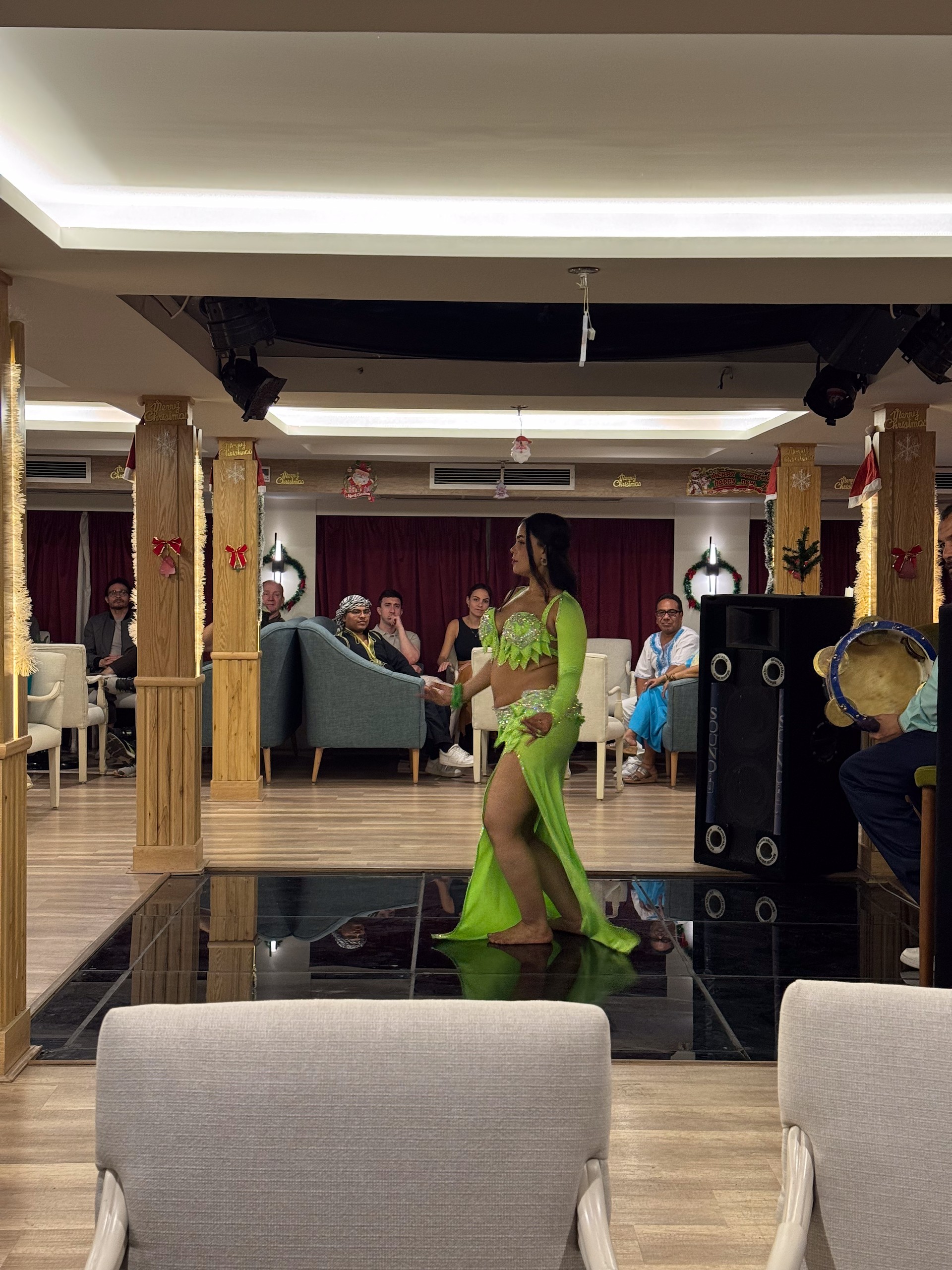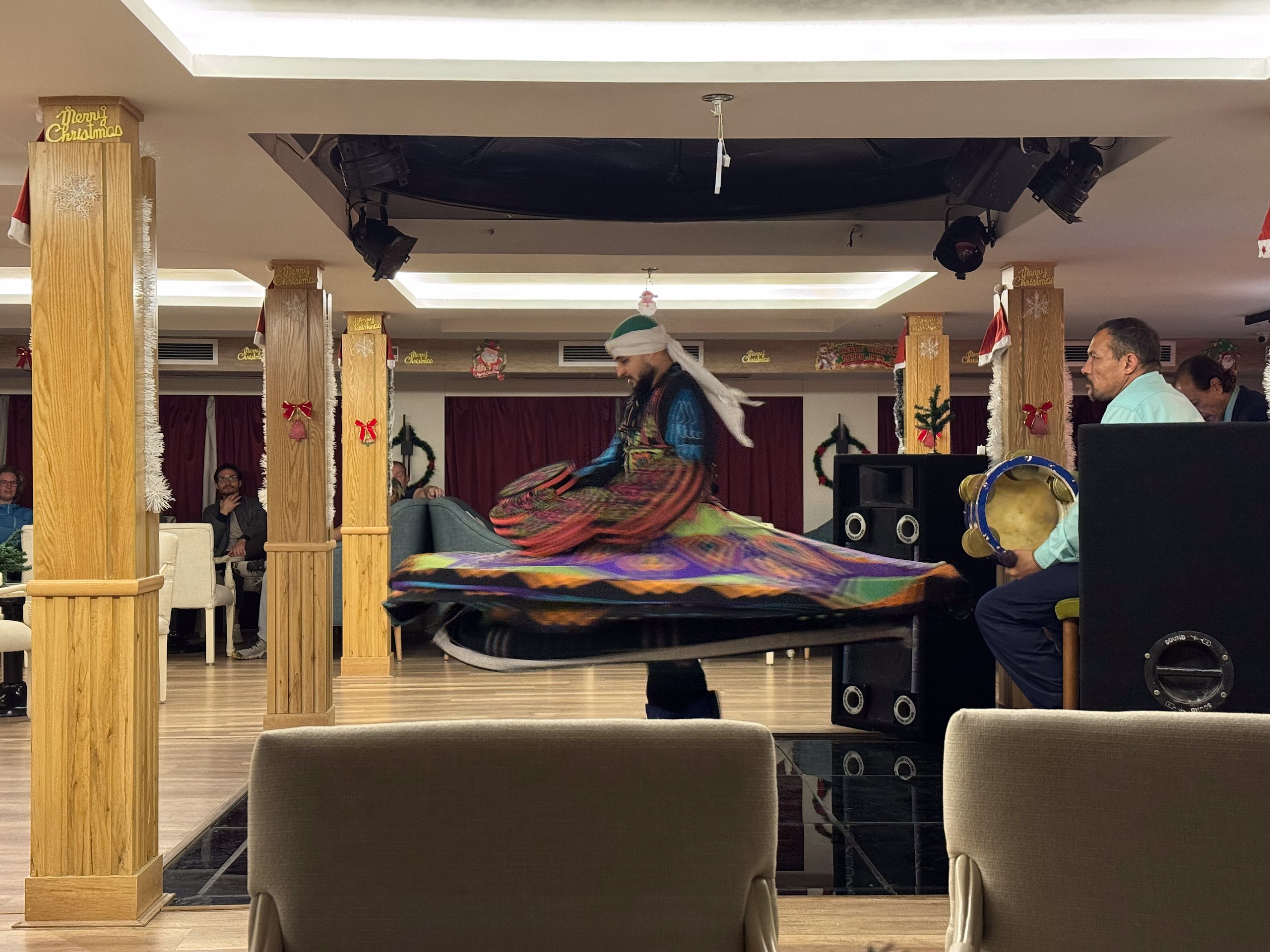 Nach einem ausgiebigem Weihnachtsessen, für das man sich richtig viel Mühe gemacht hat, haben wir uns gestern um 23.00 Uhr noch die Tänze angeschaut. Erst kam ein Derwisch, der einen beeindruckenden Tanura-Tanz (Drehtanz) aufgeführt hat, danach kam noch die Bauchtänzerin. Die hatte allerdings kein typisches Kleid an und kam für mich irgendwie billig rüber. Das haben wir dann auch nicht mehr zu Ende angesehen und sind schlafen gegangen.