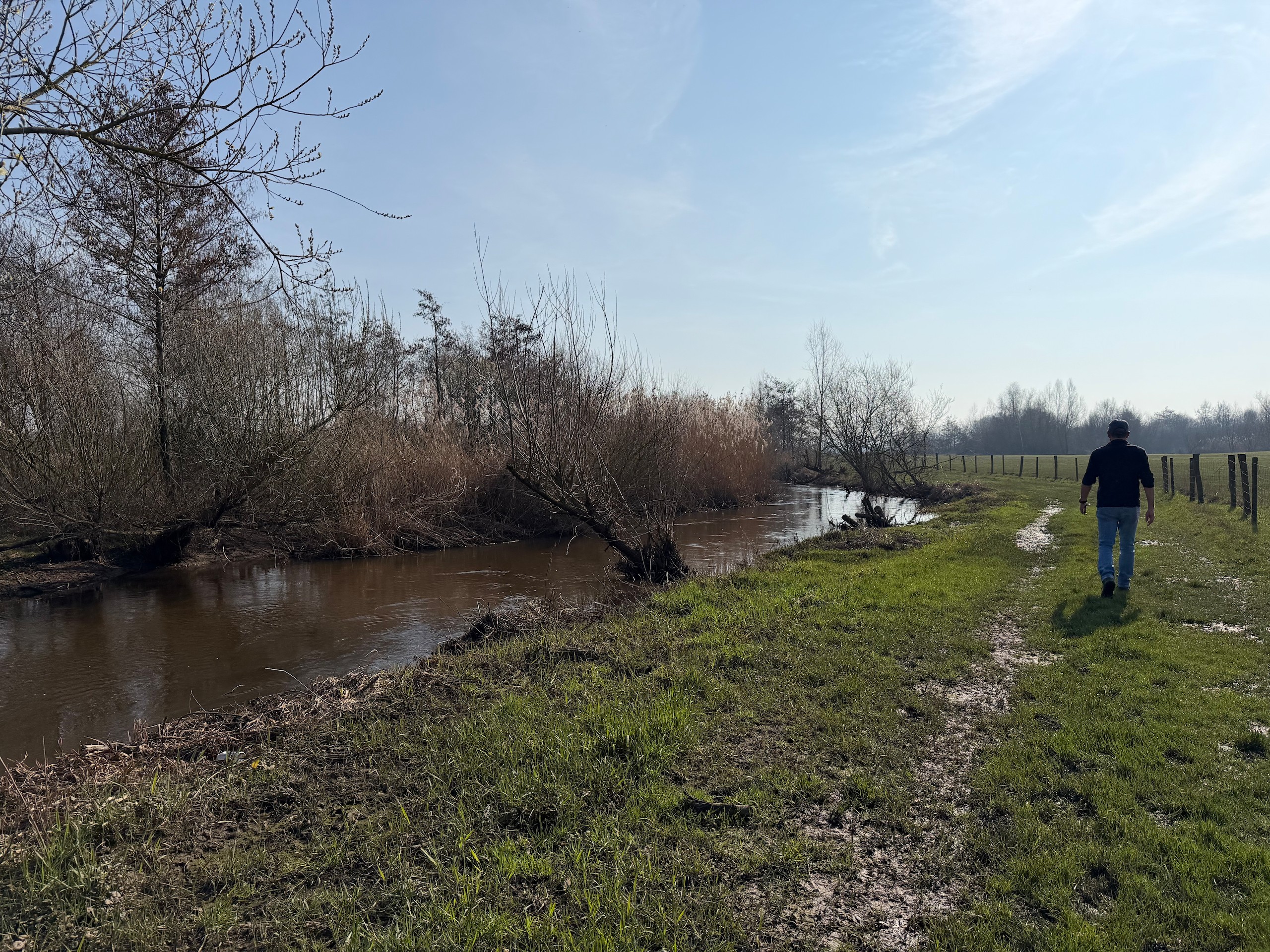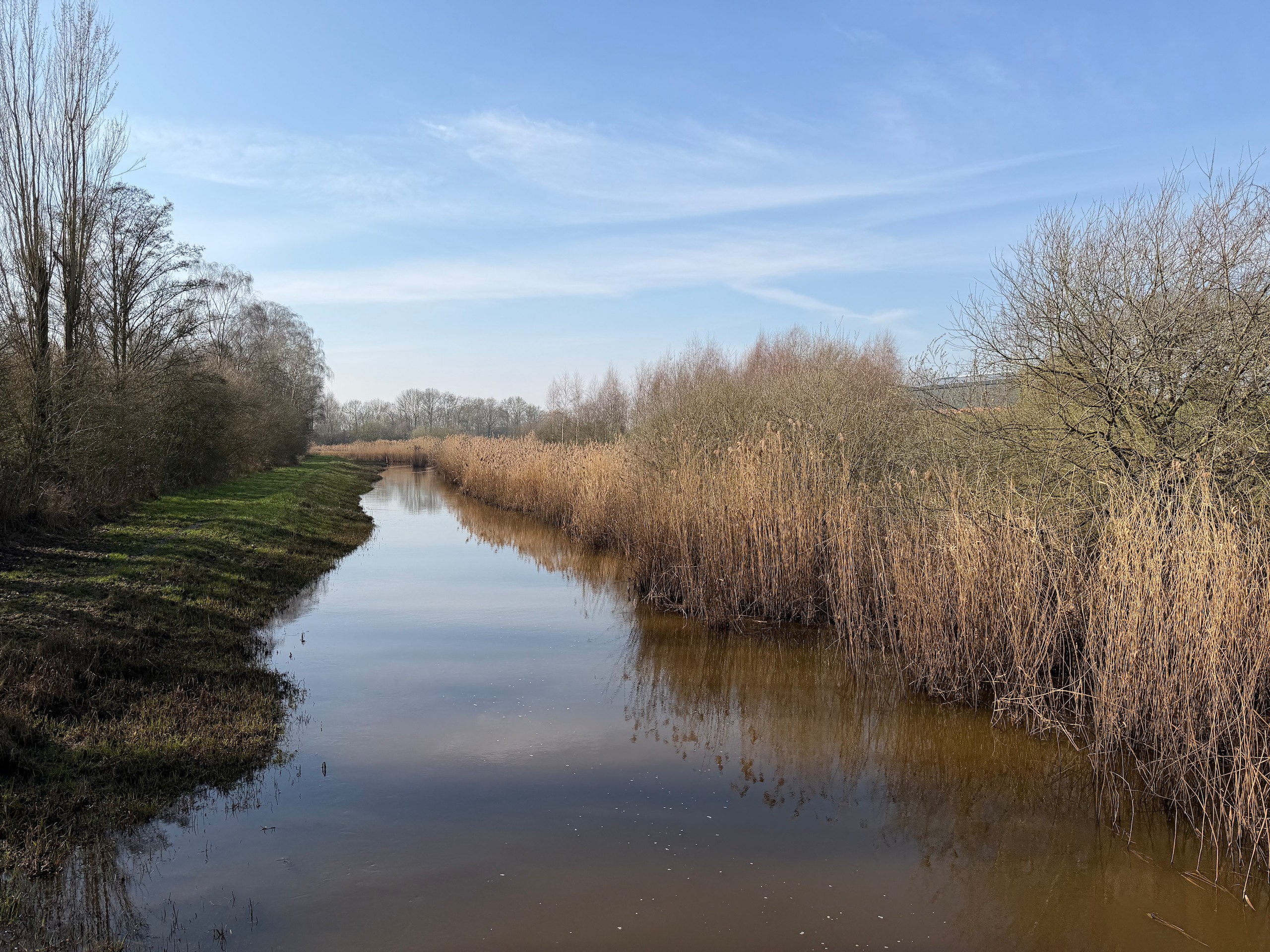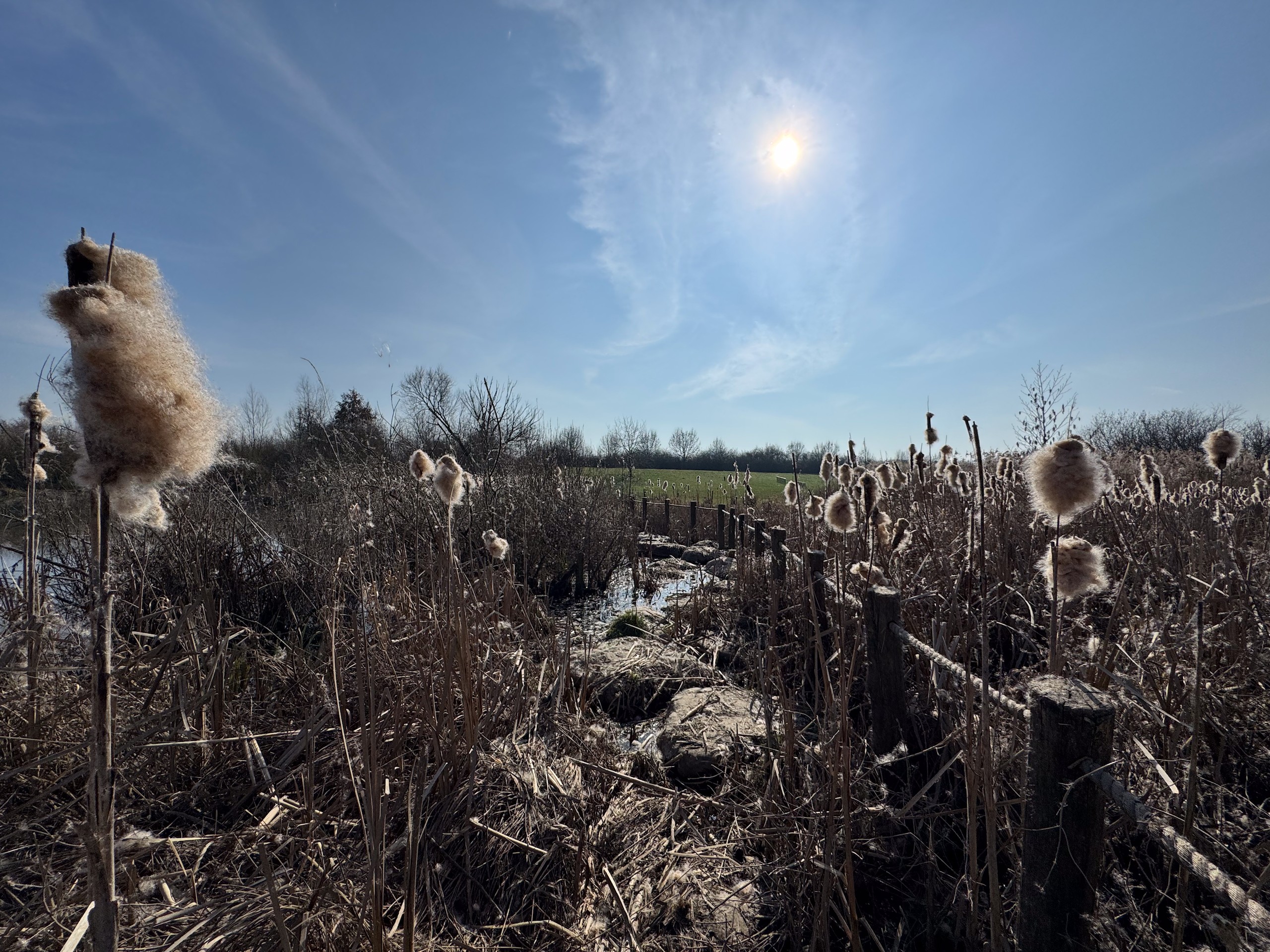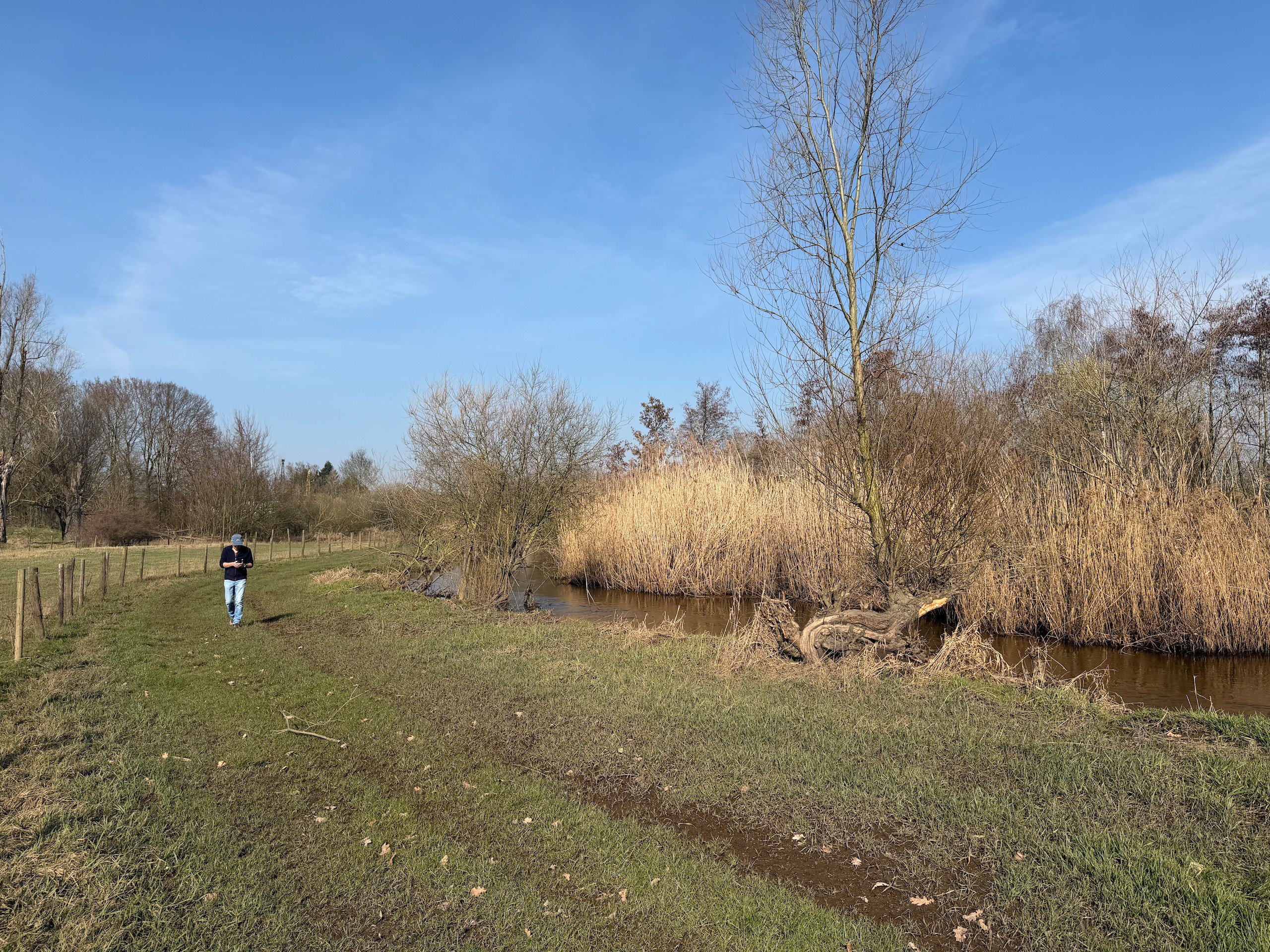 Das schöne Wetter lockt uns dann noch auf einen kleinen Spaziergang. Und zwar machen wir uns auf den Weg vom Hafen Hanssum nach Buggenum, einem kleinen Örtchen nicht ganz vier Kilometer entfernt. Die Wanderung haben wir uns bei Komoot rausgesucht und haben dann leider das Problem, dass ein Teil des Streckenabschnitts wegen irgendwelcher Arbeiten gesperrt ist. Der Anfang der Wanderung direkt hinter Hanssum ist allerdings eh der schönere Teil. Hier geht es durch ein kleines Feuchtgebiet mit umfangreicher Vogelwelt.