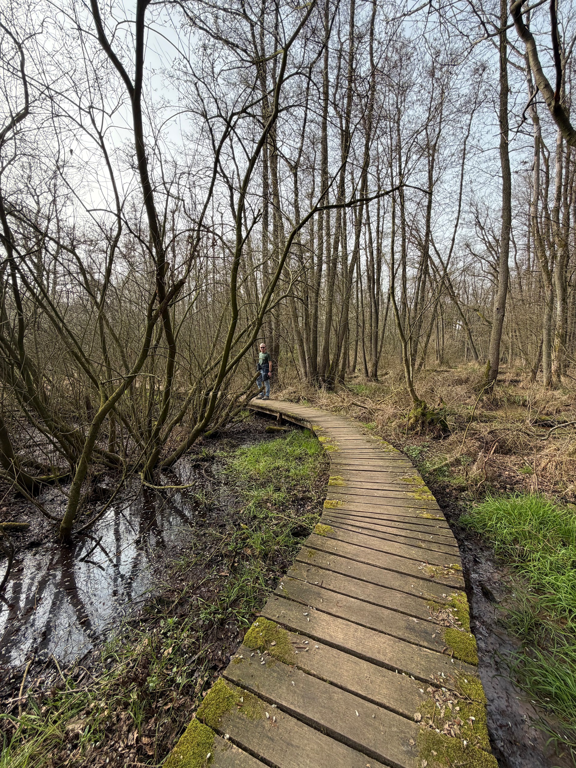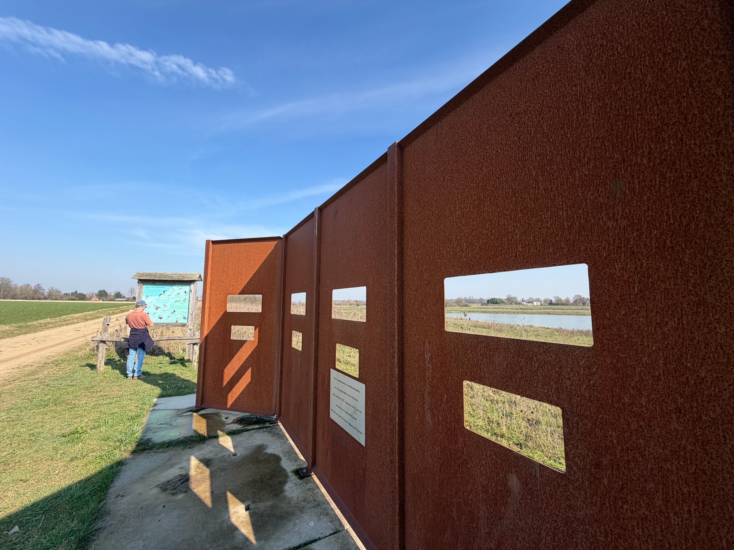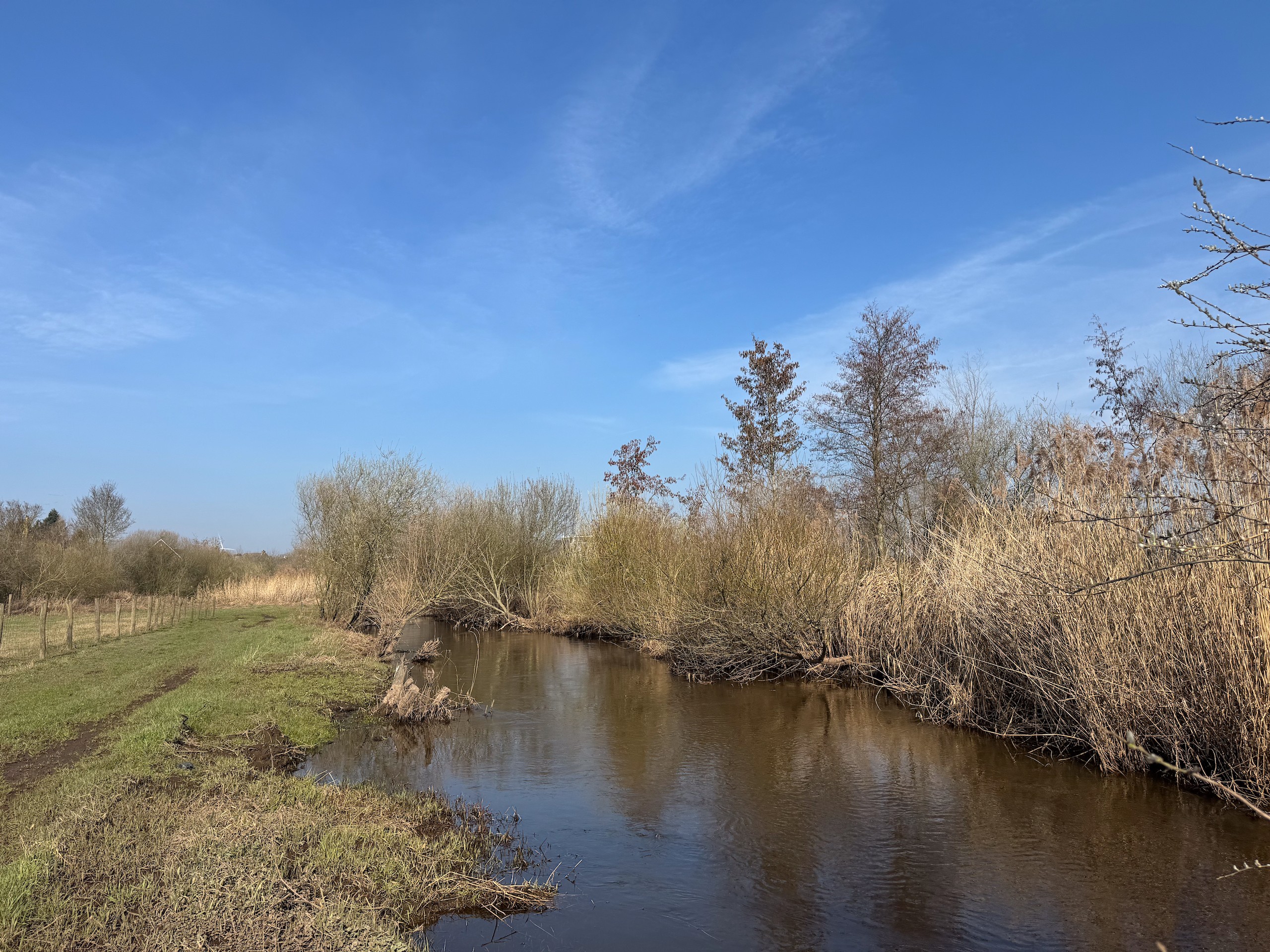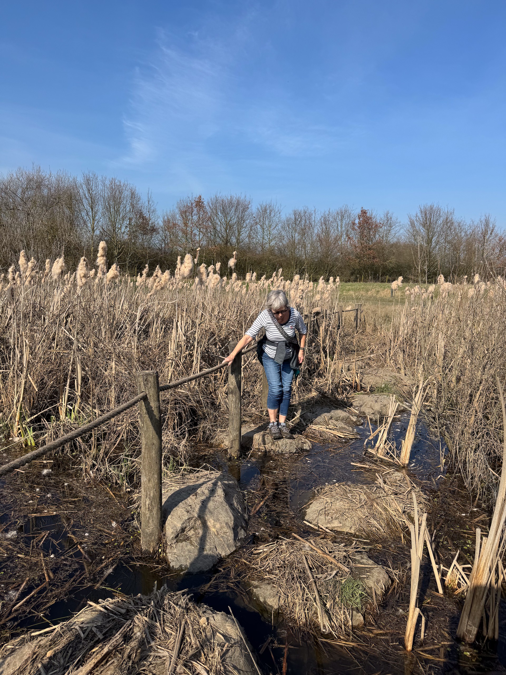 Das schöne Wetter lockt uns dann noch auf einen kleinen Spaziergang. Und zwar machen wir uns auf den Weg vom Hafen Hanssum nach Buggenum, einem kleinen Örtchen nicht ganz vier Kilometer entfernt. Die Wanderung haben wir uns bei Komoot rausgesucht und haben dann leider das Problem, dass ein Teil des Streckenabschnitts wegen irgendwelcher Arbeiten gesperrt ist. Der Anfang der Wanderung direkt hinter Hanssum ist allerdings eh der schönere Teil. Hier geht es durch ein kleines Feuchtgebiet mit umfangreicher Vogelwelt.
