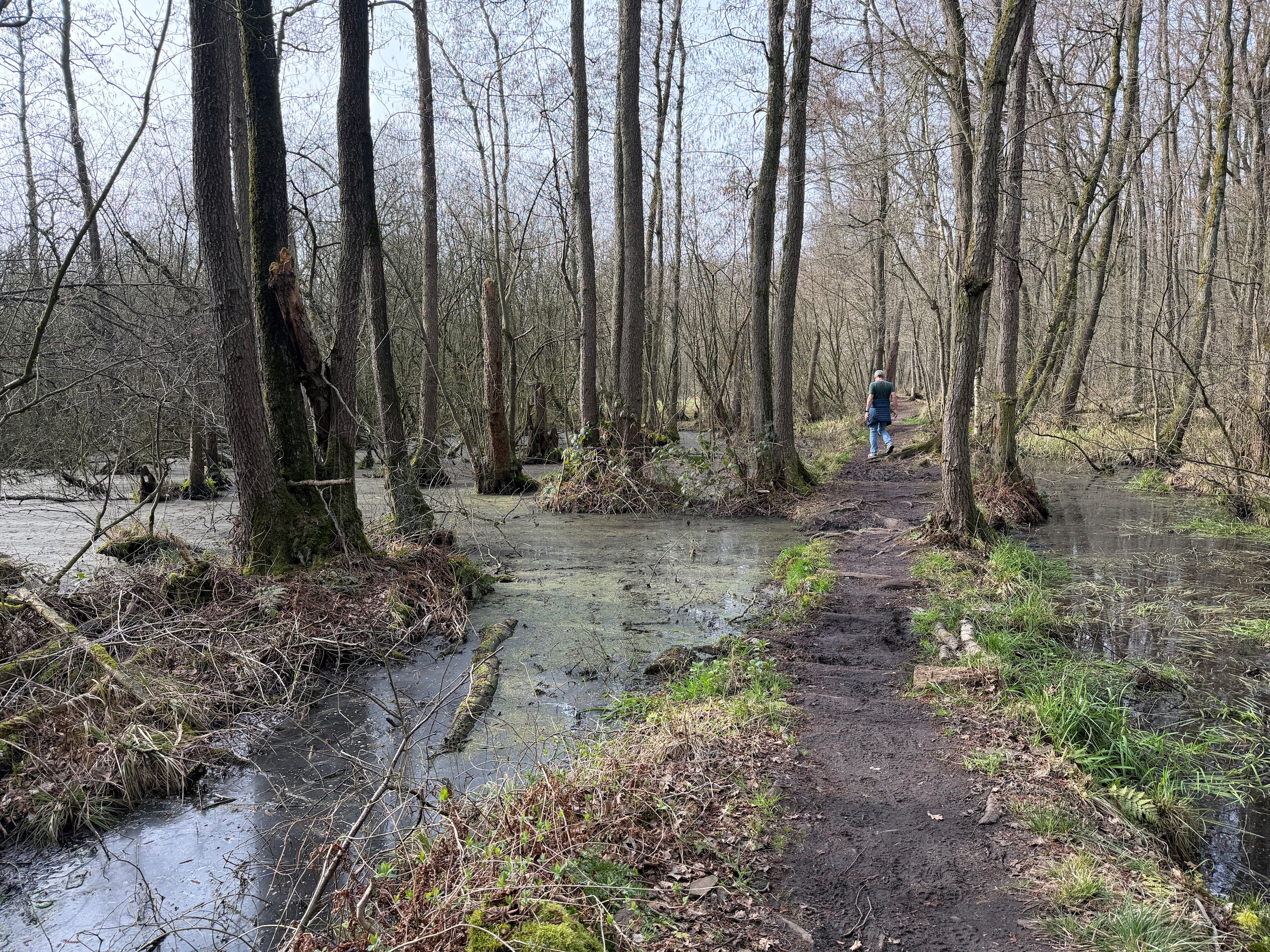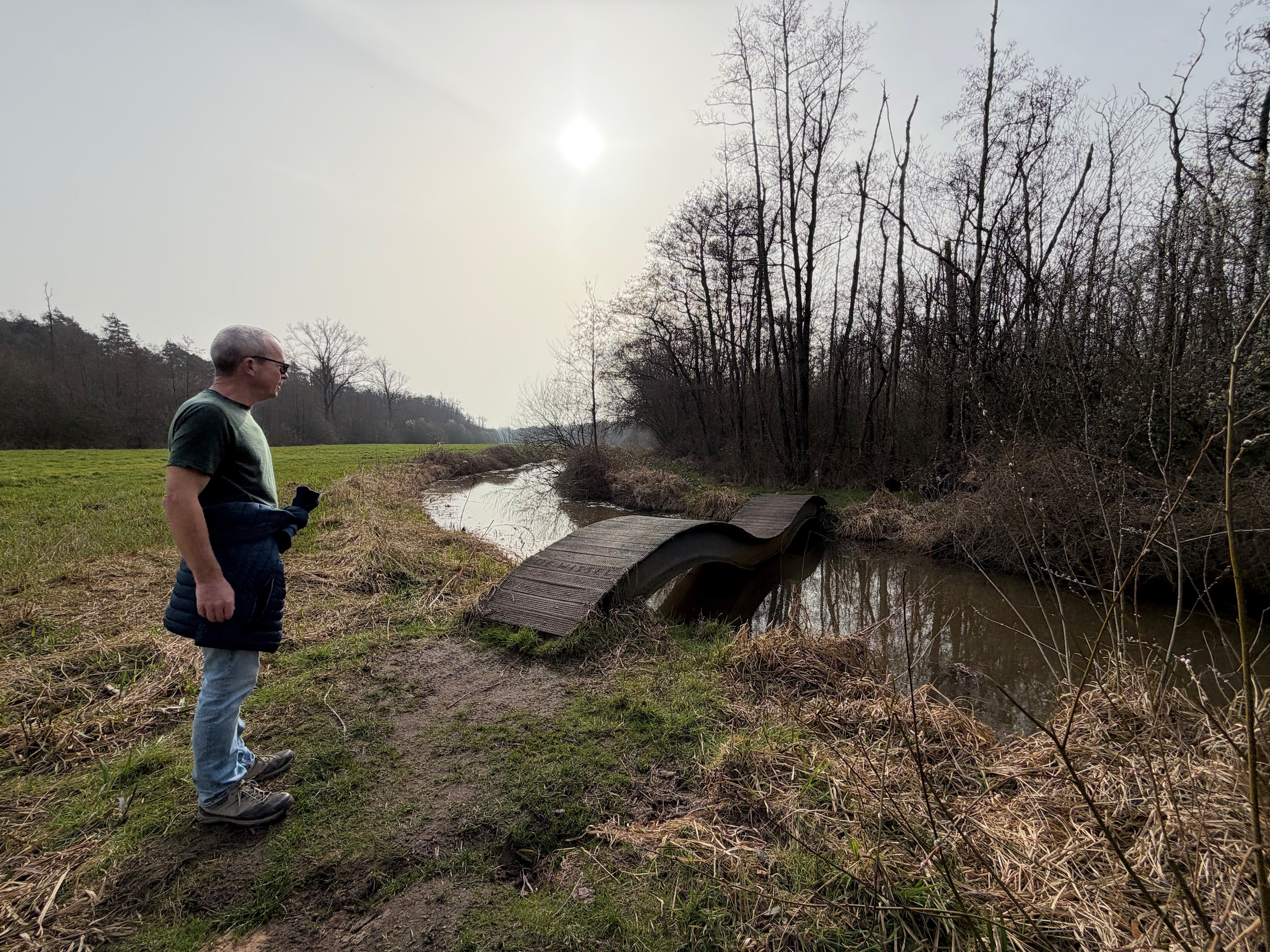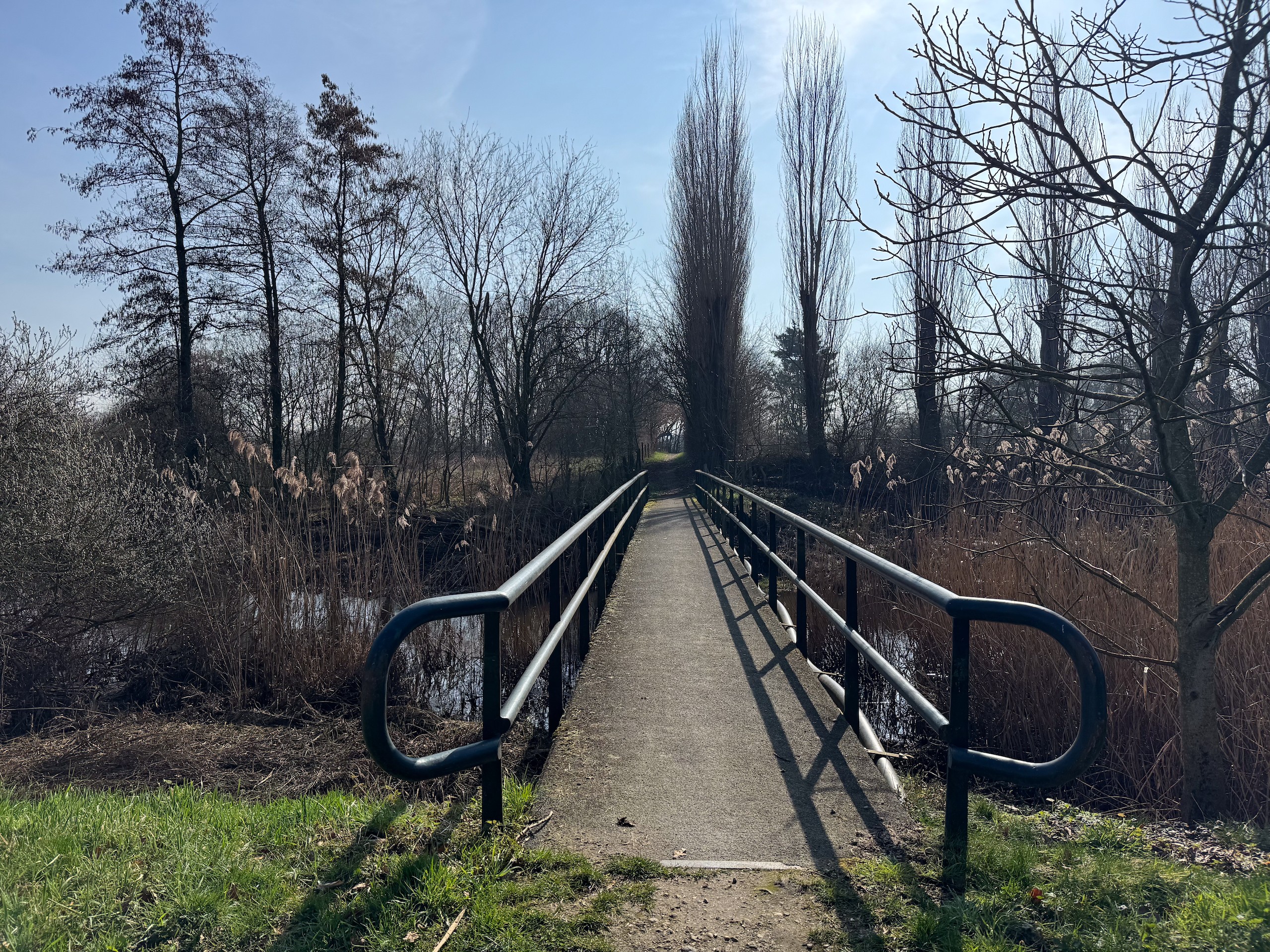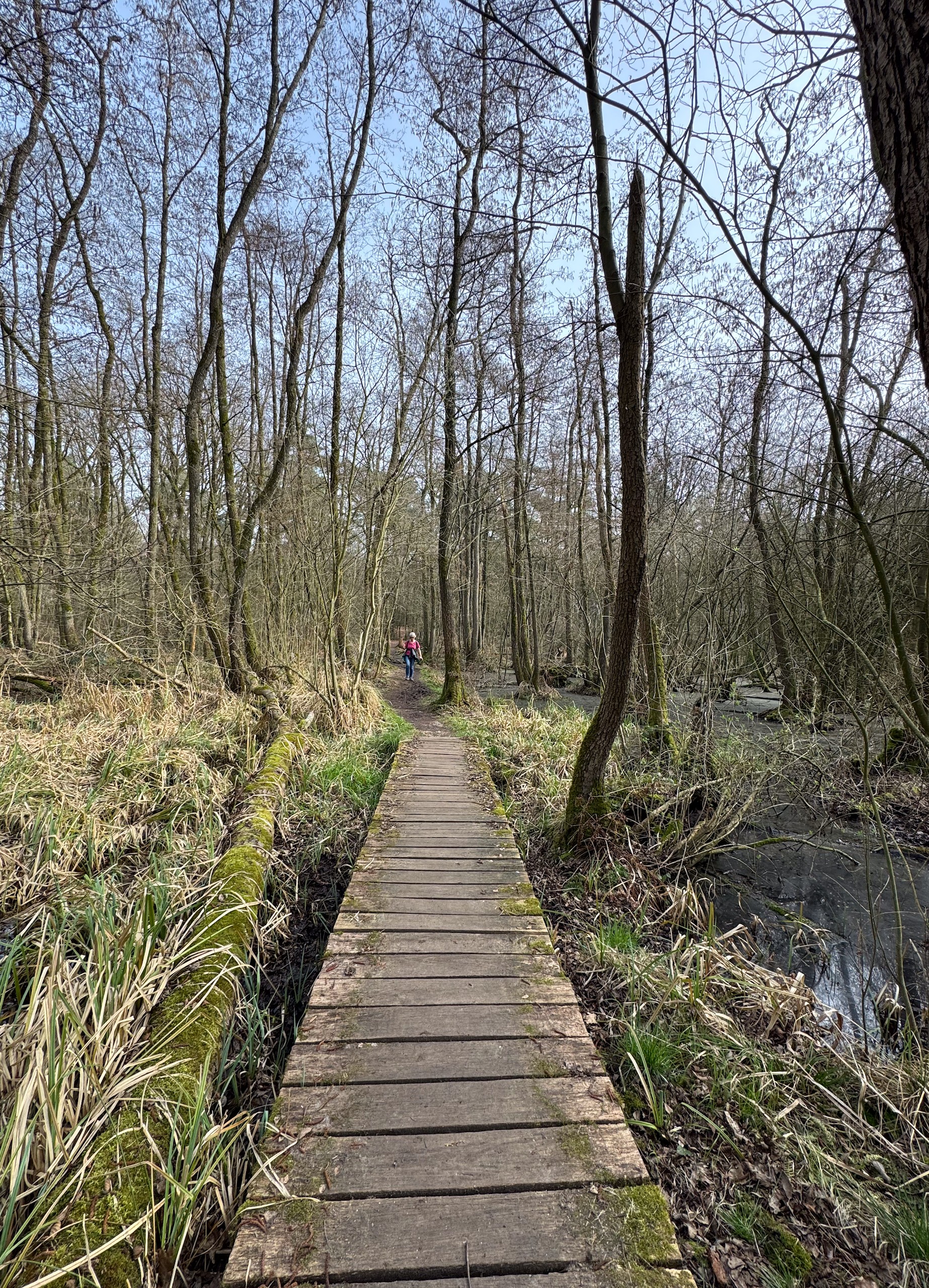 Das schöne Wetter lockt uns dann noch auf einen kleinen Spaziergang. Und zwar machen wir uns auf den Weg vom Hafen Hanssum nach Buggenum, einem kleinen Örtchen nicht ganz vier Kilometer entfernt. Die Wanderung haben wir uns bei Komoot rausgesucht und haben dann leider das Problem, dass ein Teil des Streckenabschnitts wegen irgendwelcher Arbeiten gesperrt ist. Der Anfang der Wanderung direkt hinter Hanssum ist allerdings eh der schönere Teil. Hier geht es durch ein kleines Feuchtgebiet mit umfangreicher Vogelwelt.