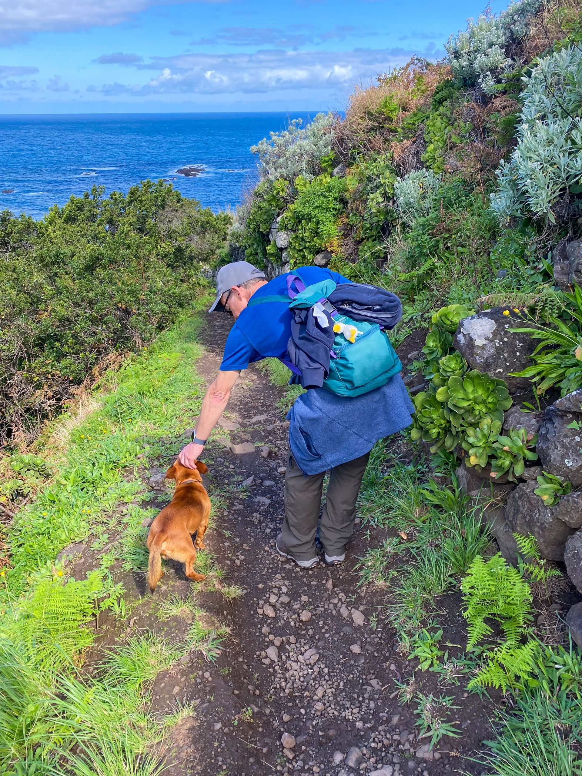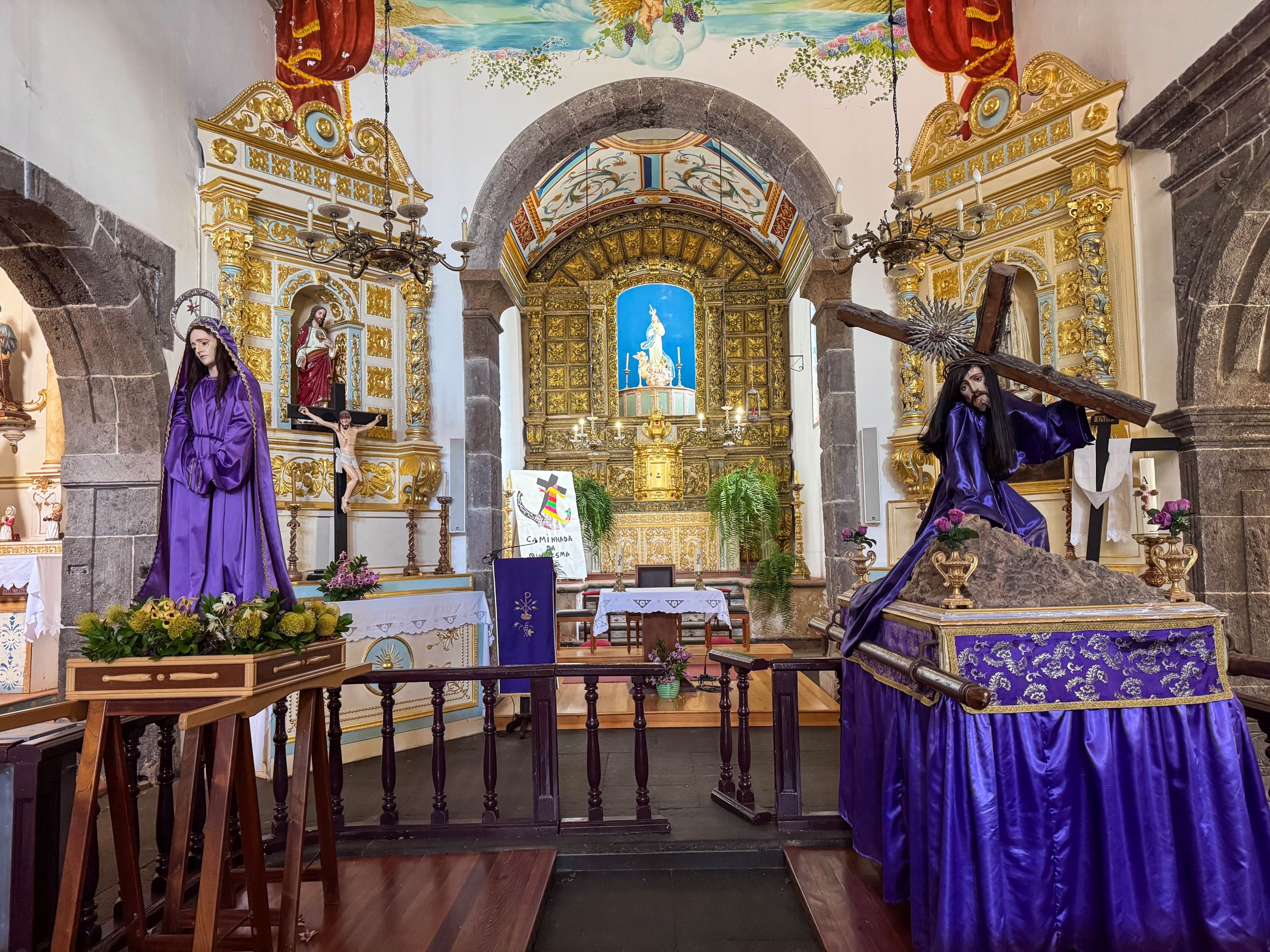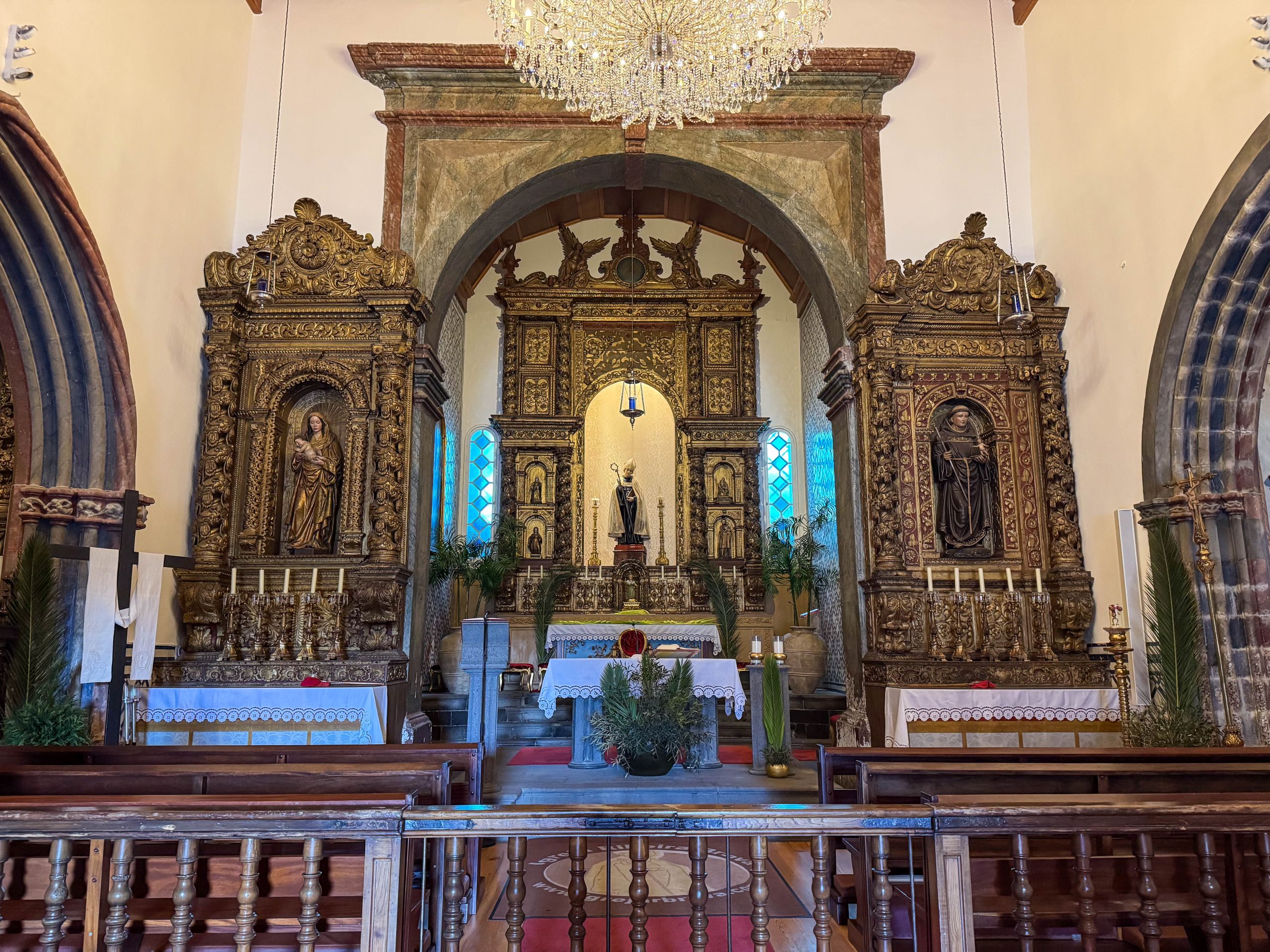 Heute laufen wir dann ein Stück vom alten Königsweg an der hohen Steilküste entlang. Das entspricht der Route 29 „Von Ponta Delgada nach São Cristovão“ im Rother Wanderführer. Eine tolle, ungefähr 14 Kilometer lange Wanderung mit 750 Höhenmetern und super Aussicht über die Steilküste. Die Wanderung ist fußläufig von unserer Unterkunft zu erreichen und unterwegs schauen wir uns dann auch noch die auf dem Weg liegende Igreja Matriz da Ponta Delgada an.