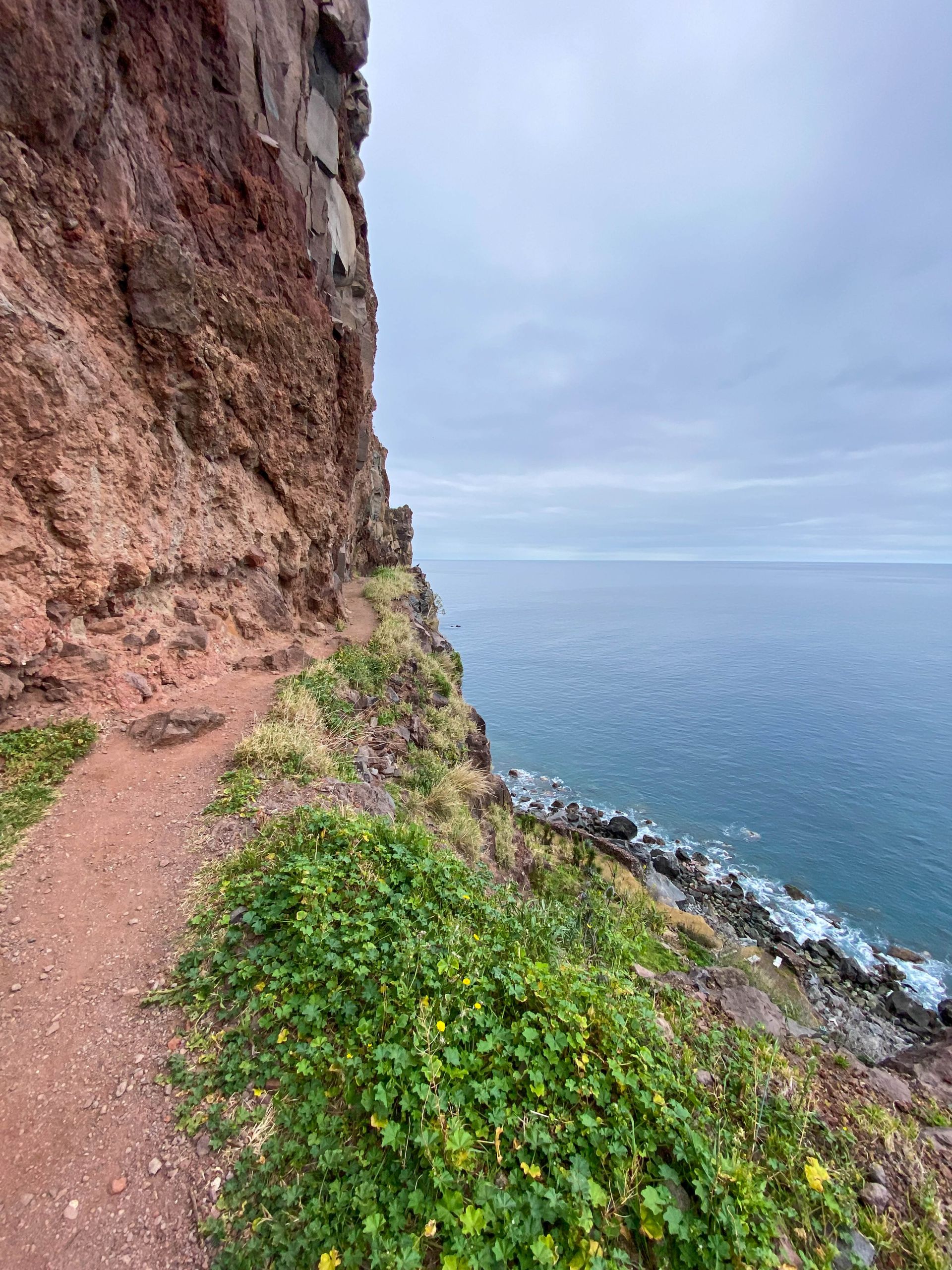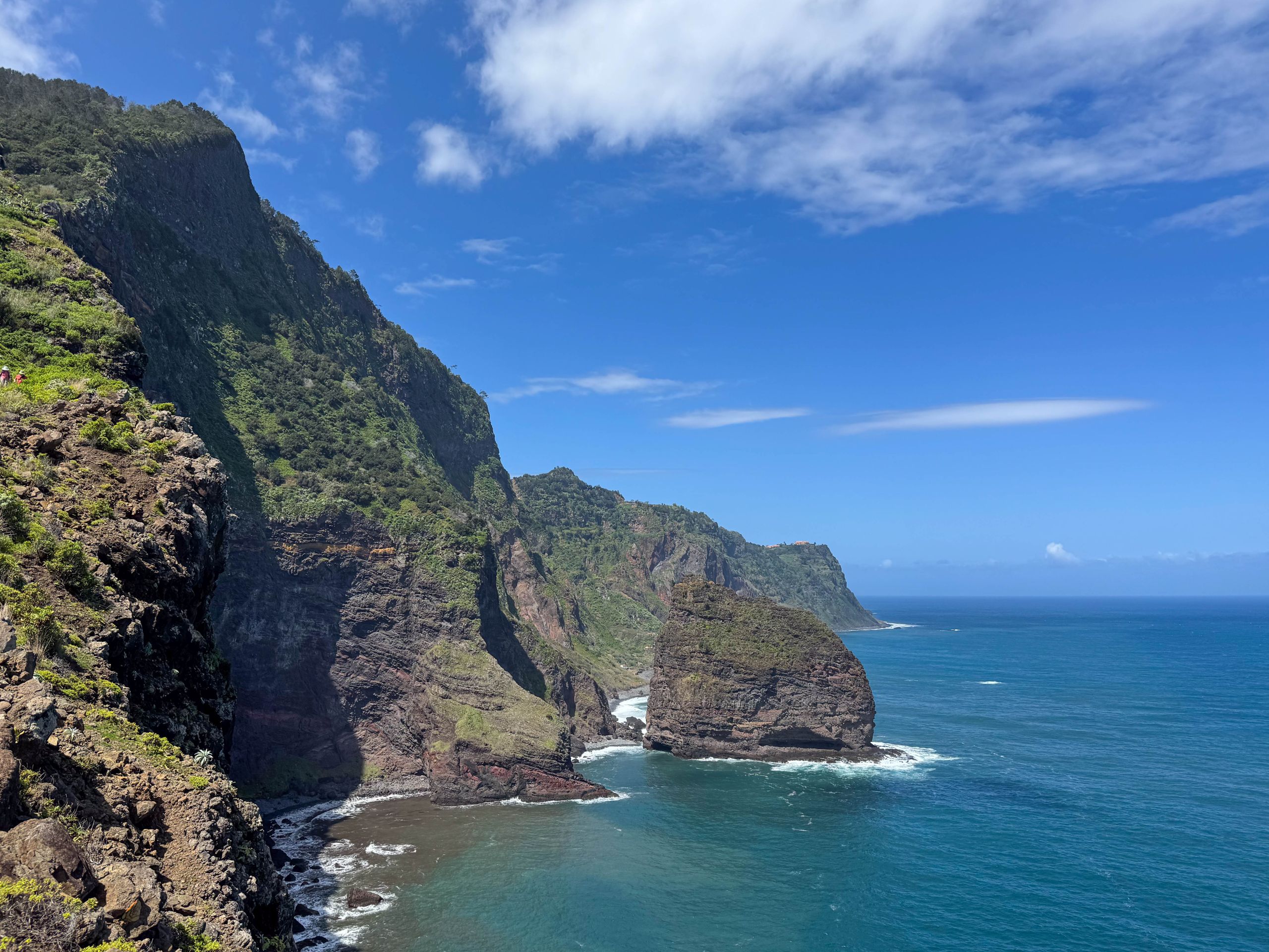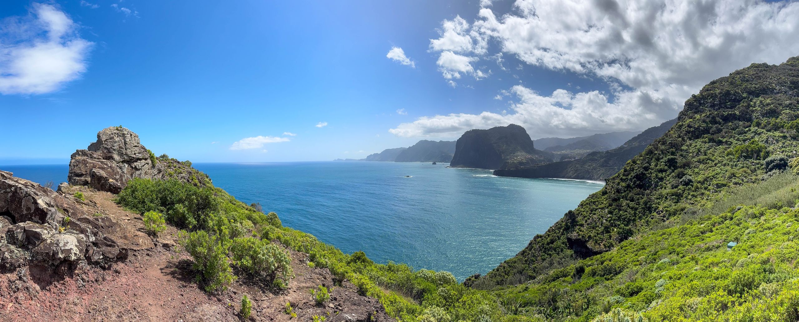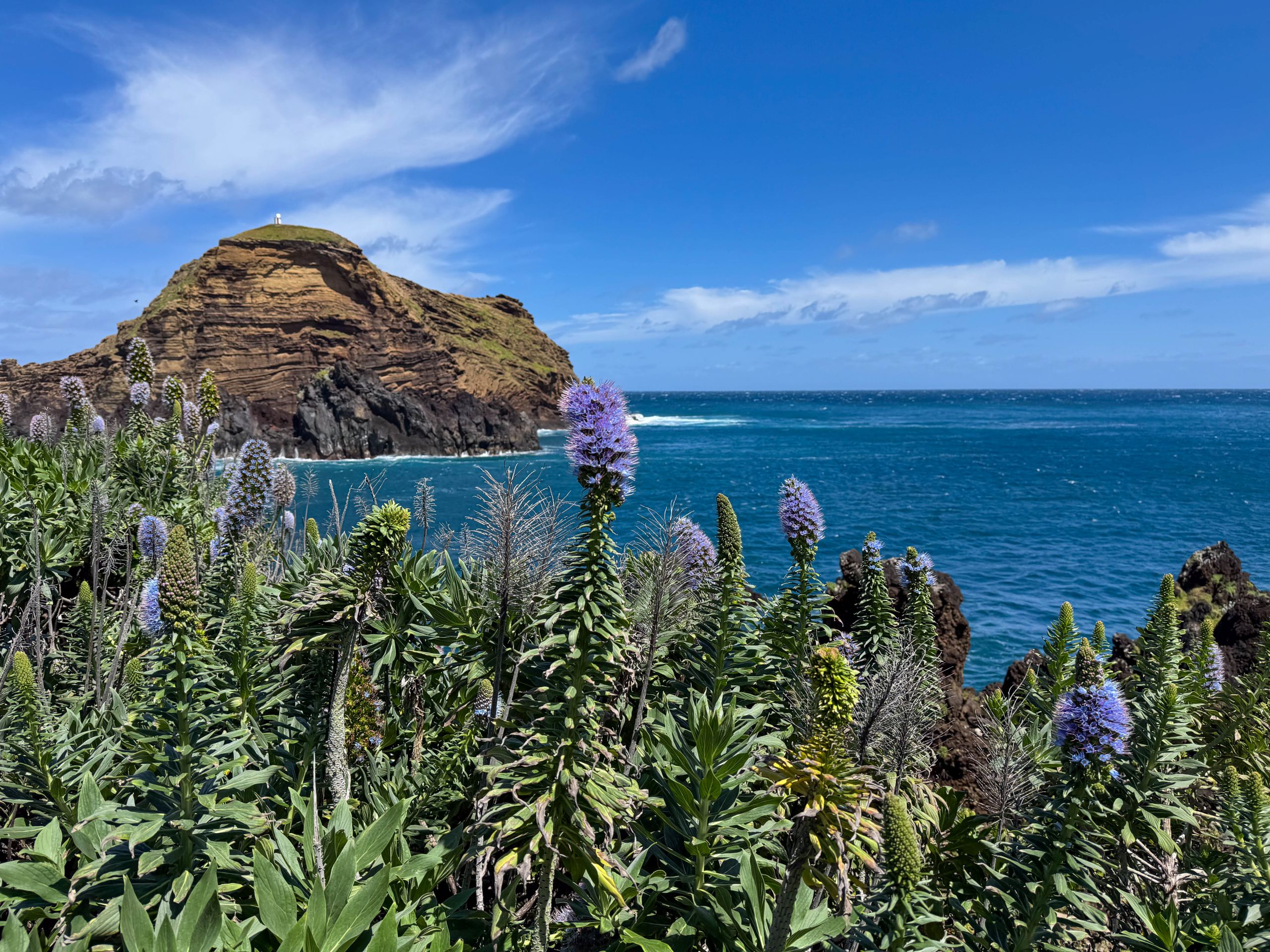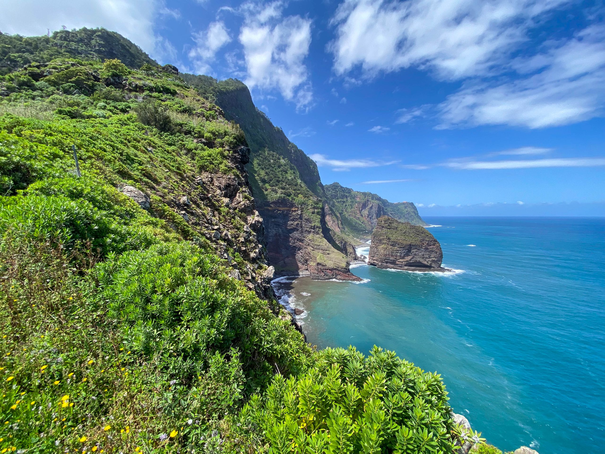 Eine ausgesetzte Etappe am Anfang erfordert dann ein wenig Überwindung meinerseits, aber dann geht’s die 370 Höhenmeter ohne Probleme steil hinunter. Das Ziel, die Felsnase der Ponta do Clérigo, ist aber lohnenswert. Hier hat man einen tollen Ausblick auf den Ort Faial, den Adlerfelsen und auf das Cap São Lourenço. Auf der anderen Seite sieht man die Insel Rocha do Navio.