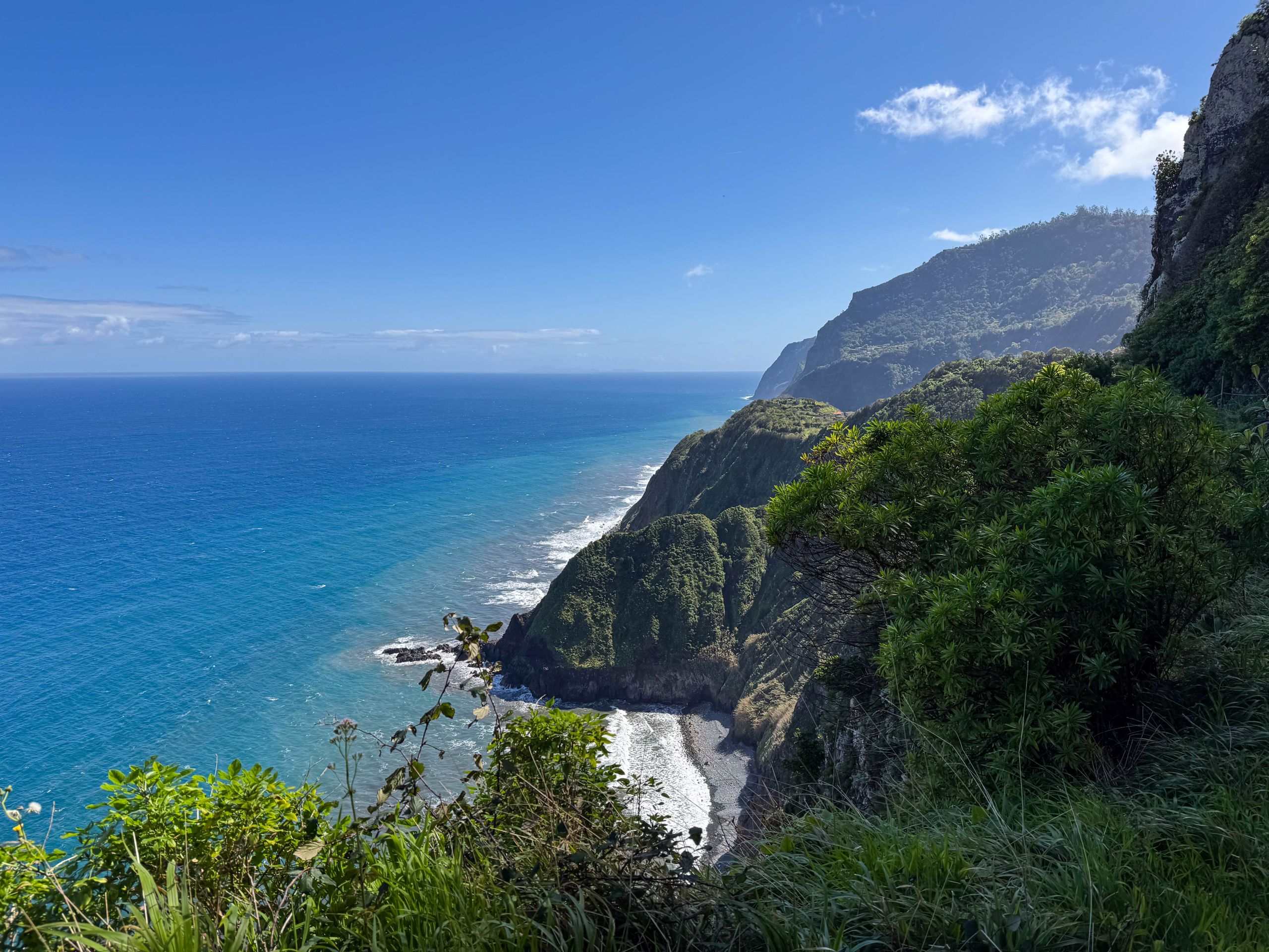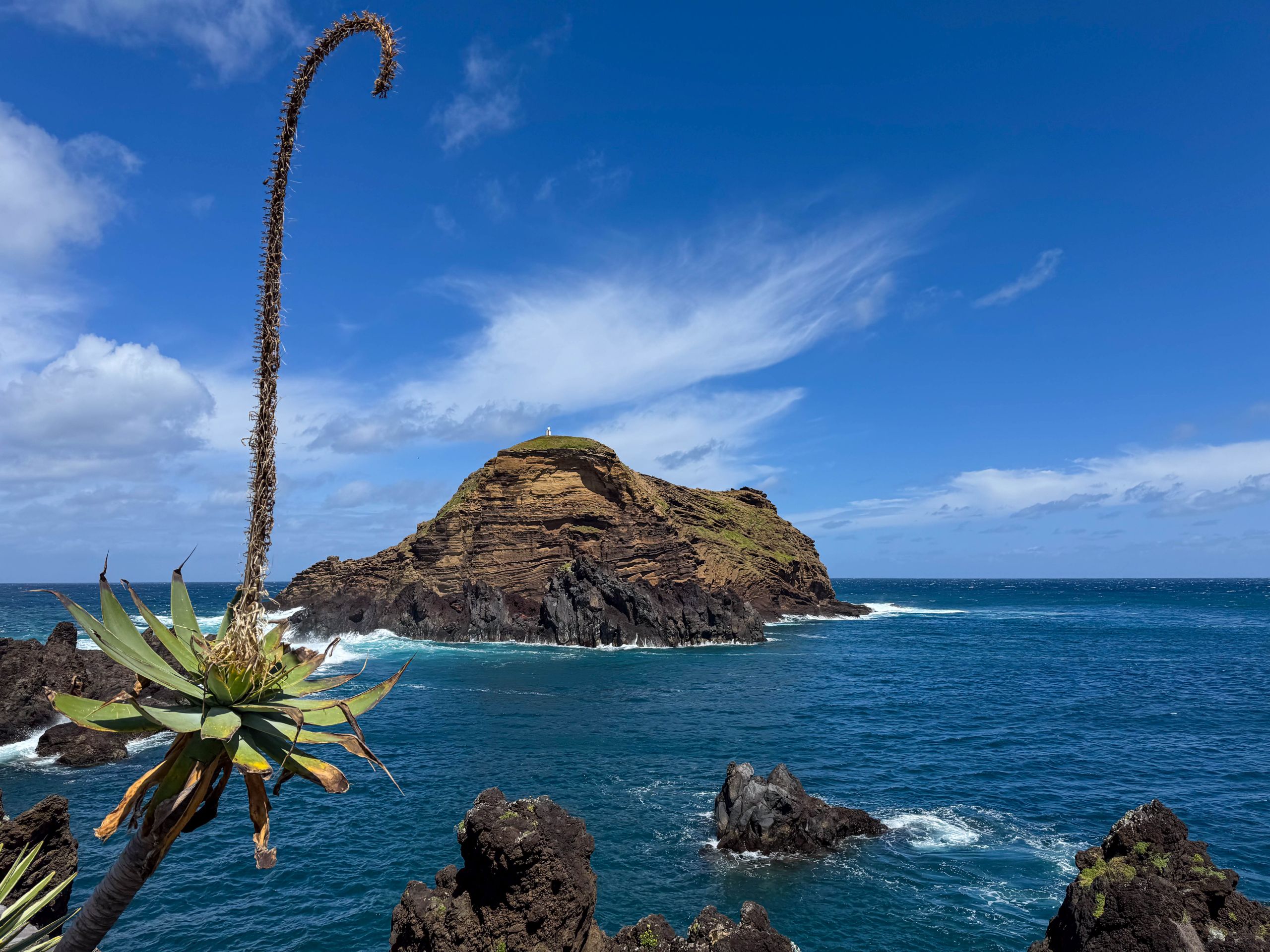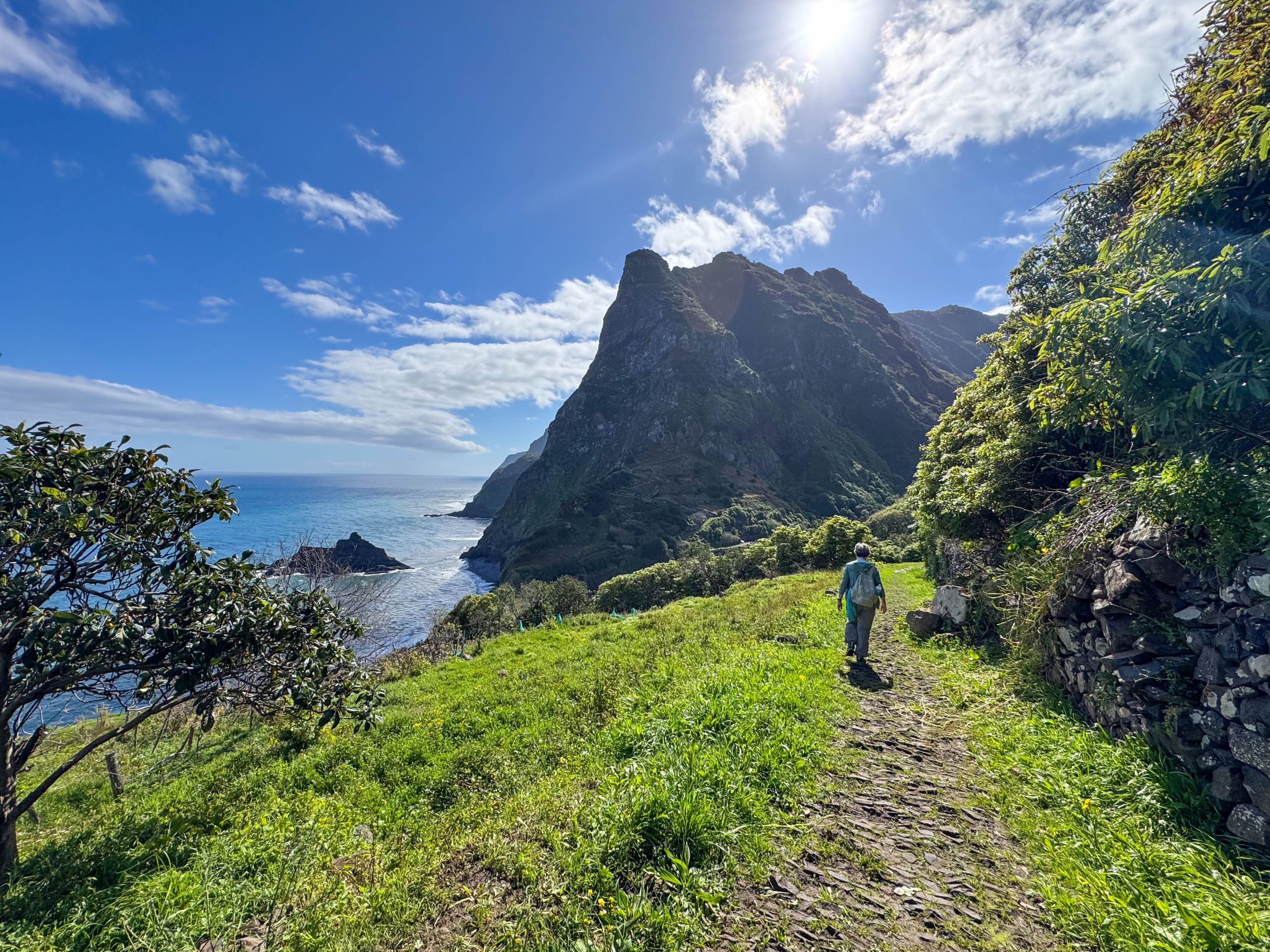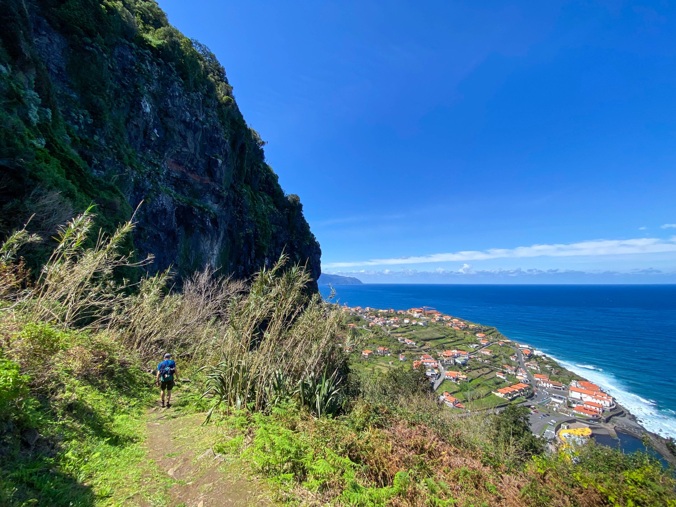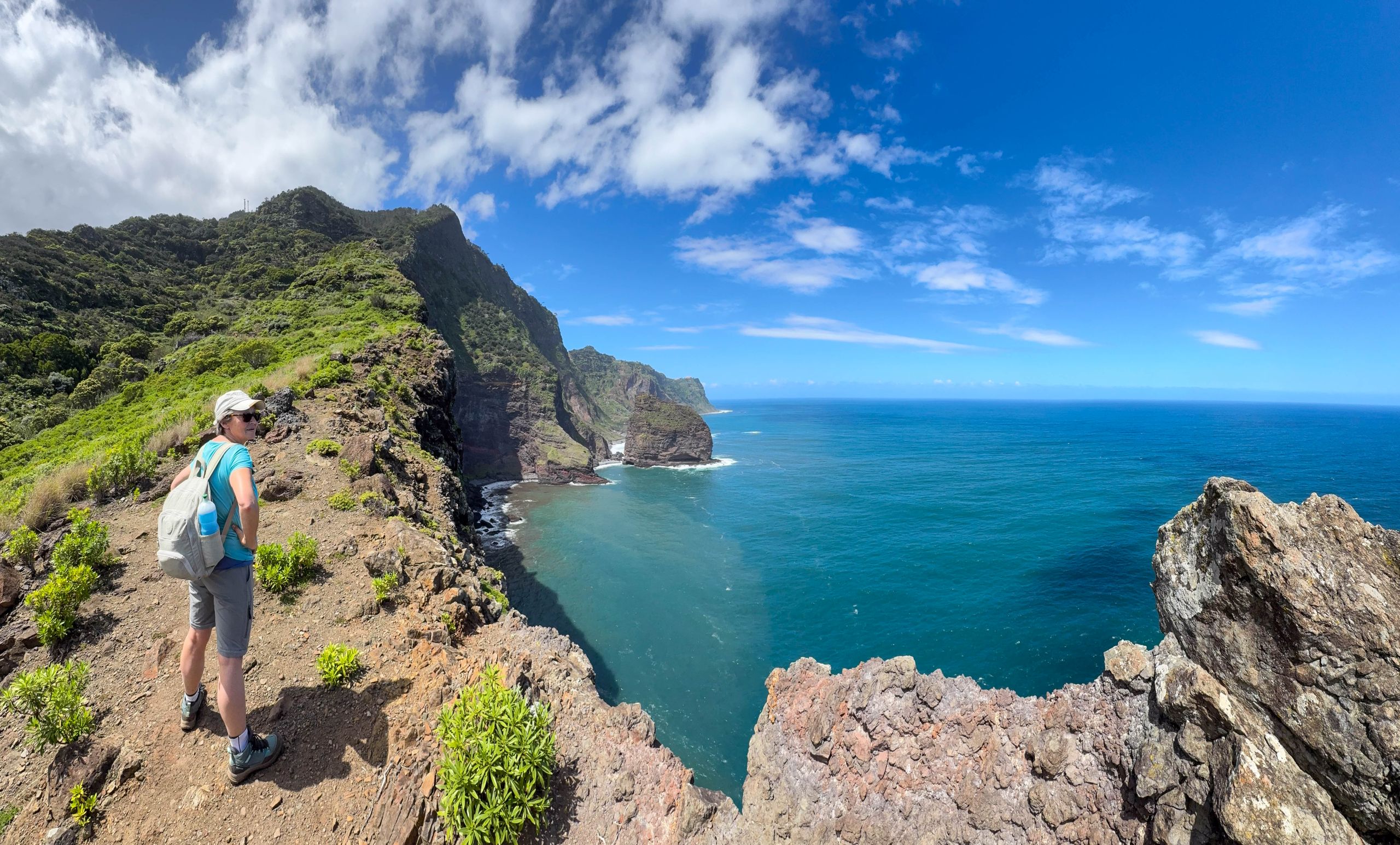 Eine ausgesetzte Etappe am Anfang erfordert dann ein wenig Überwindung meinerseits, aber dann geht’s die 370 Höhenmeter ohne Probleme steil hinunter. Das Ziel, die Felsnase der Ponta do Clérigo, ist aber lohnenswert. Hier hat man einen tollen Ausblick auf den Ort Faial, den Adlerfelsen und auf das Cap São Lourenço. Auf der anderen Seite sieht man die Insel Rocha do Navio.
