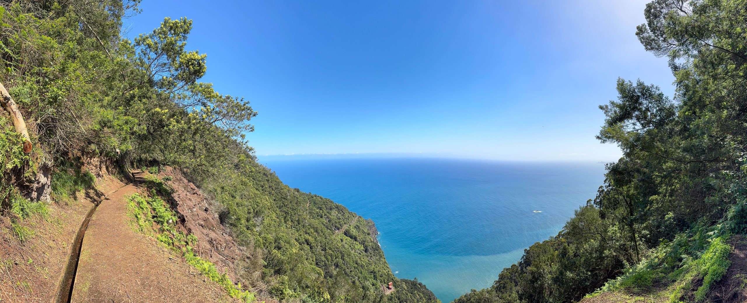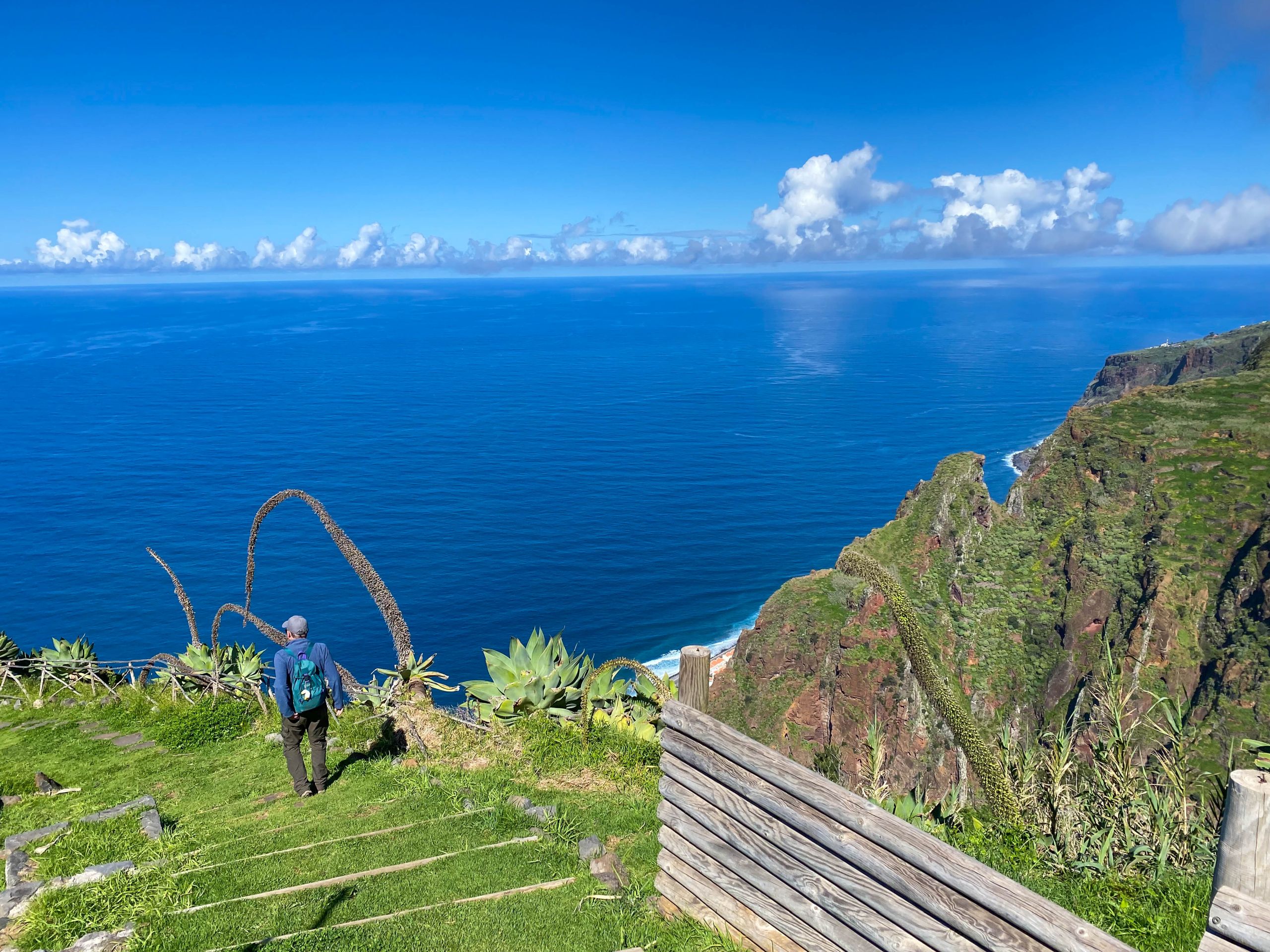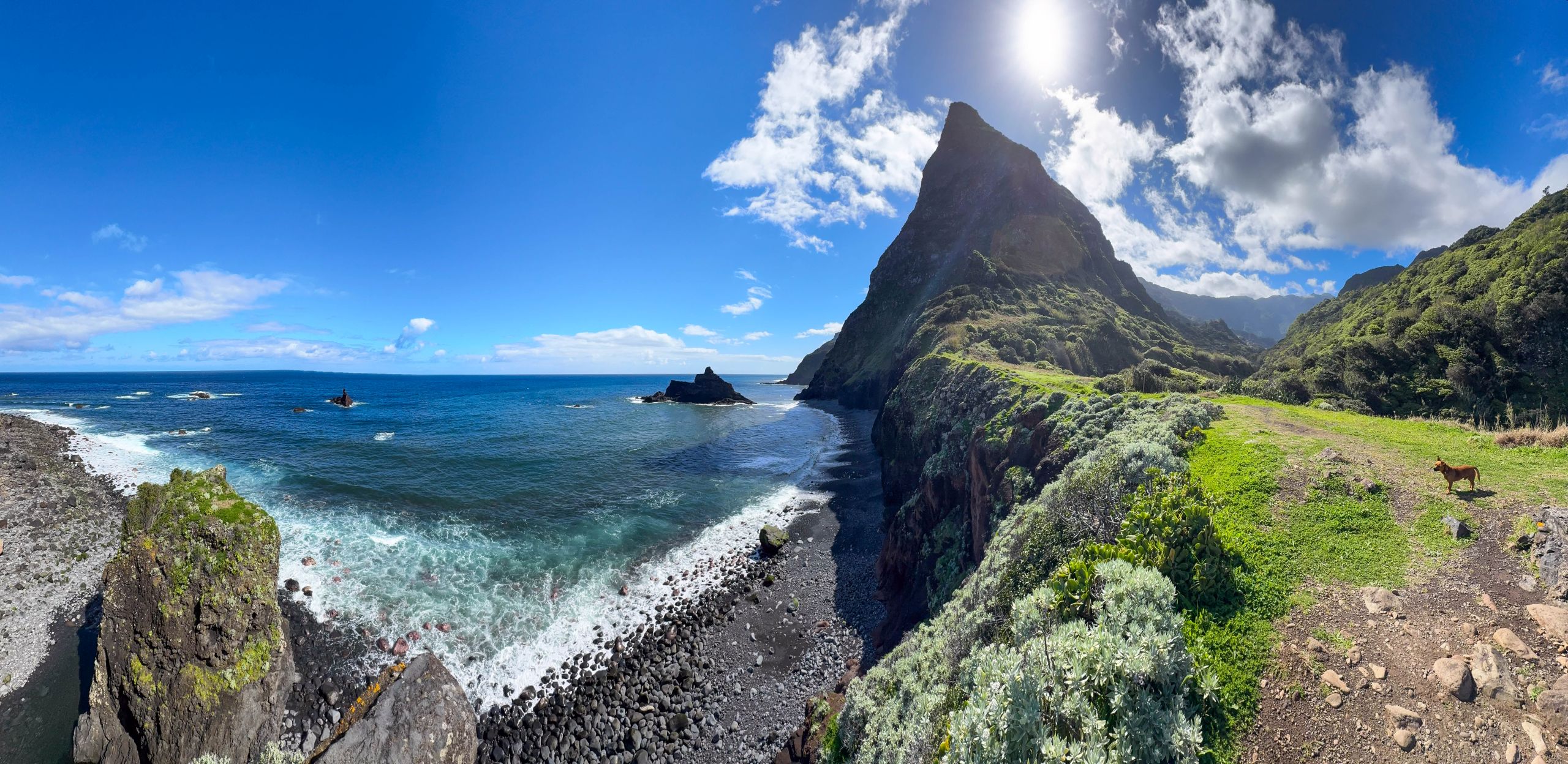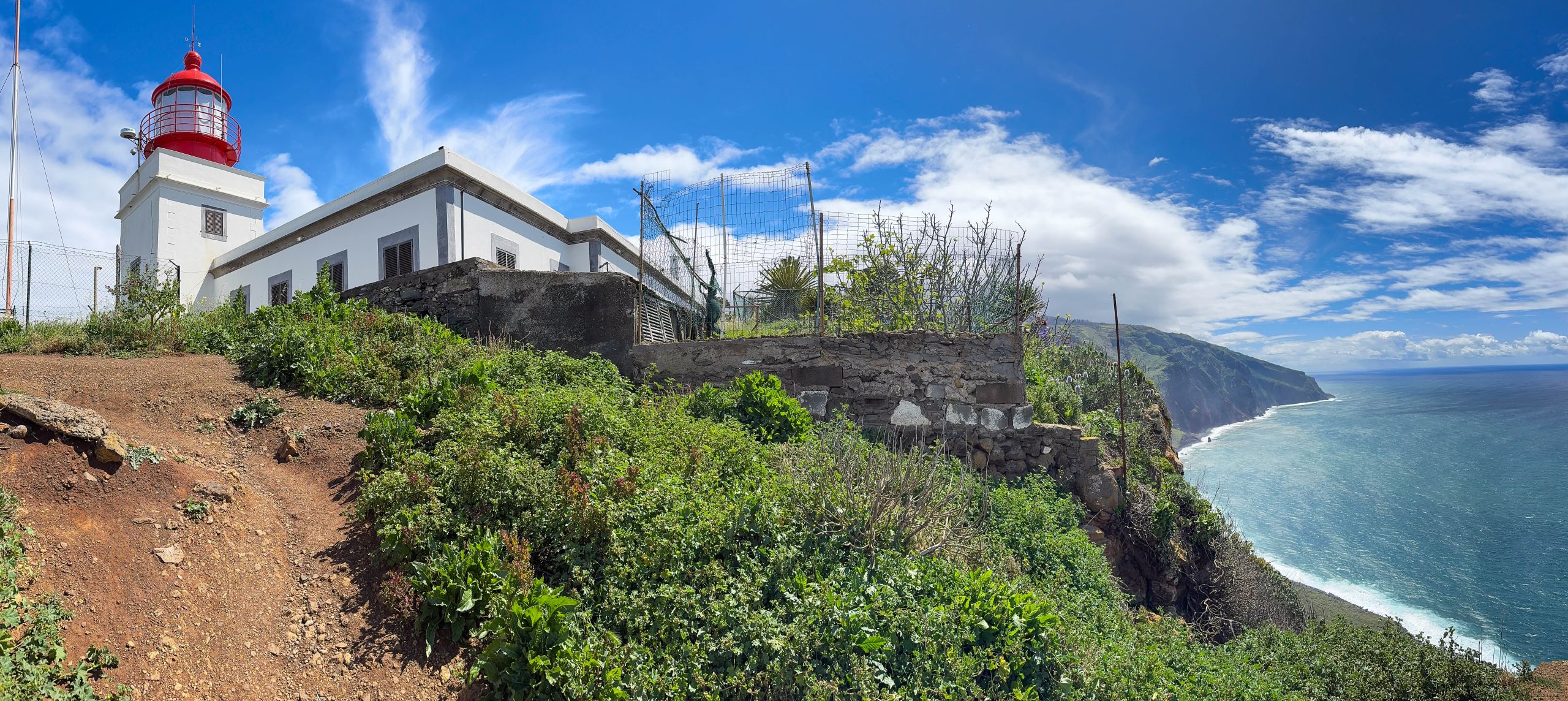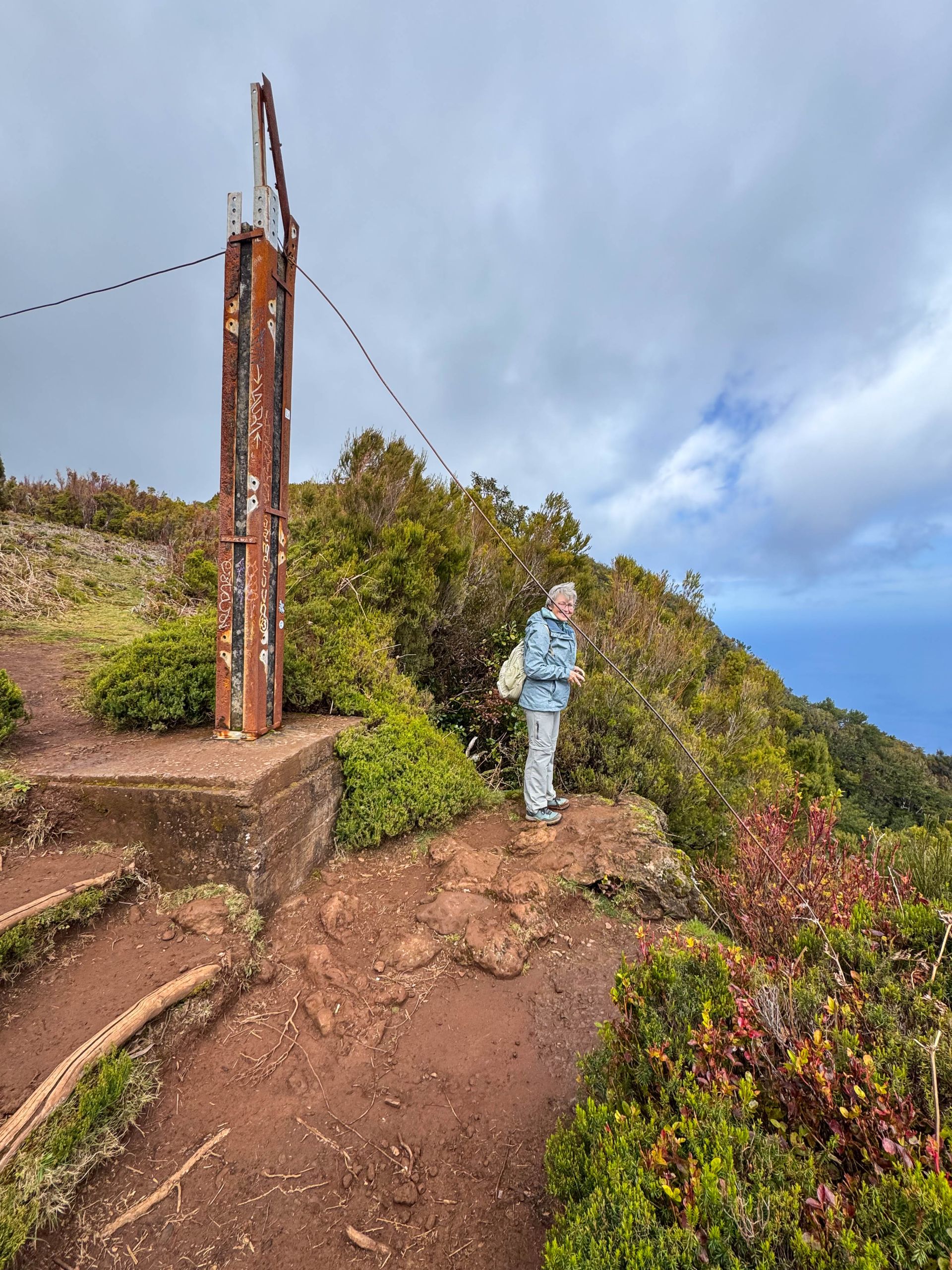 Eine ausgesetzte Etappe am Anfang erfordert dann ein wenig Überwindung meinerseits, aber dann geht’s die 370 Höhenmeter ohne Probleme steil hinunter. Das Ziel, die Felsnase der Ponta do Clérigo, ist aber lohnenswert. Hier hat man einen tollen Ausblick auf den Ort Faial, den Adlerfelsen und auf das Cap São Lourenço. Auf der anderen Seite sieht man die Insel Rocha do Navio.