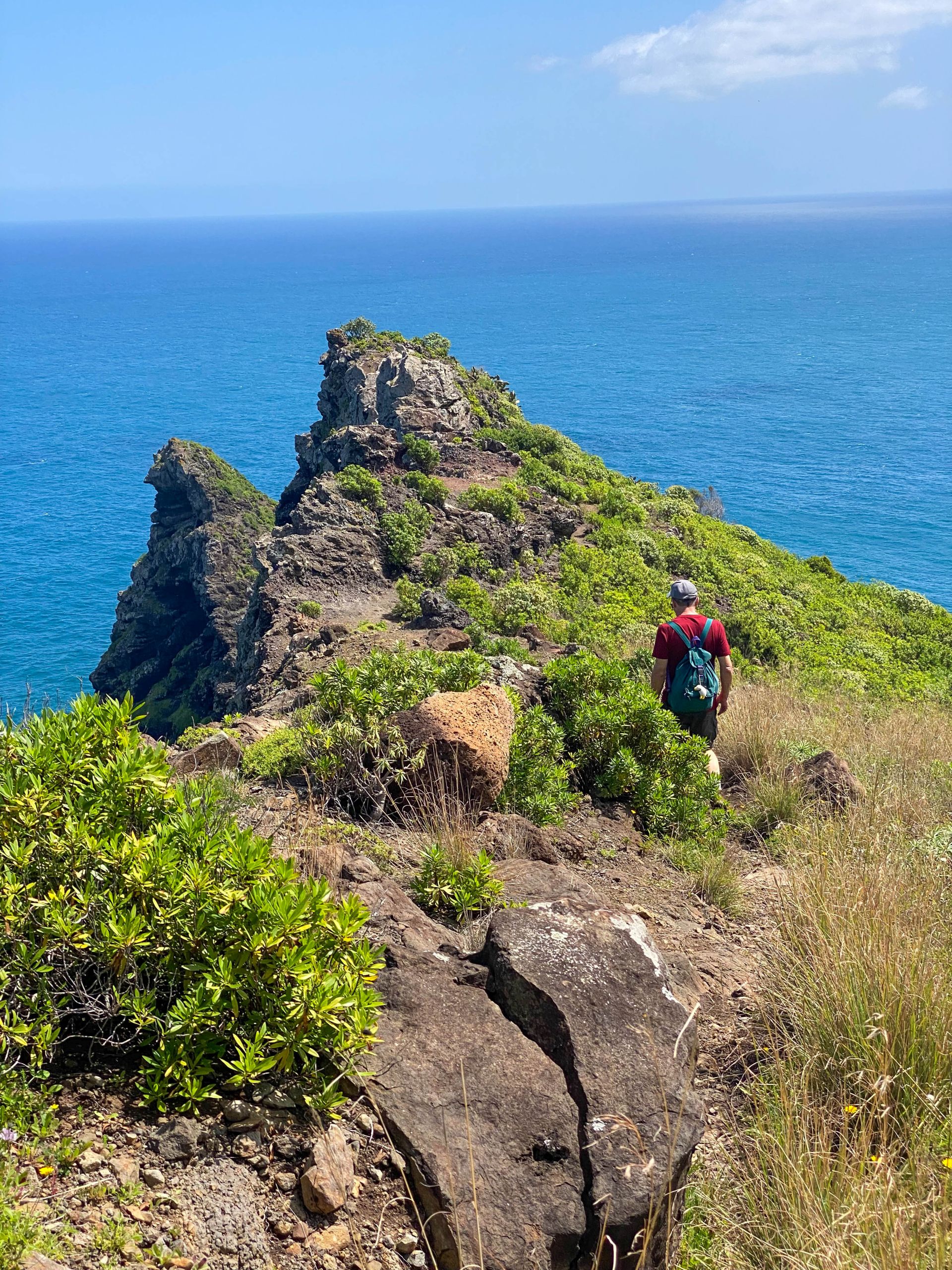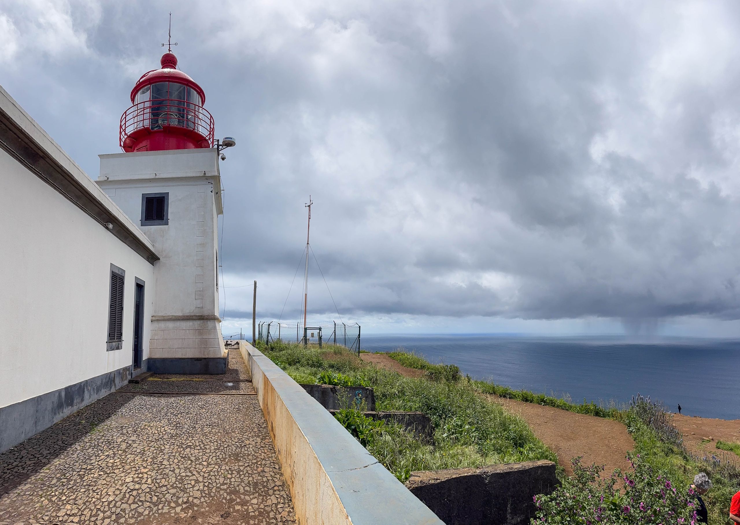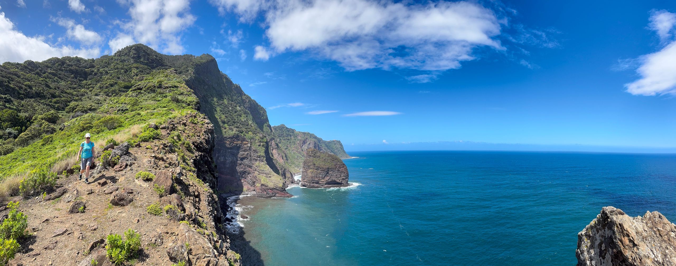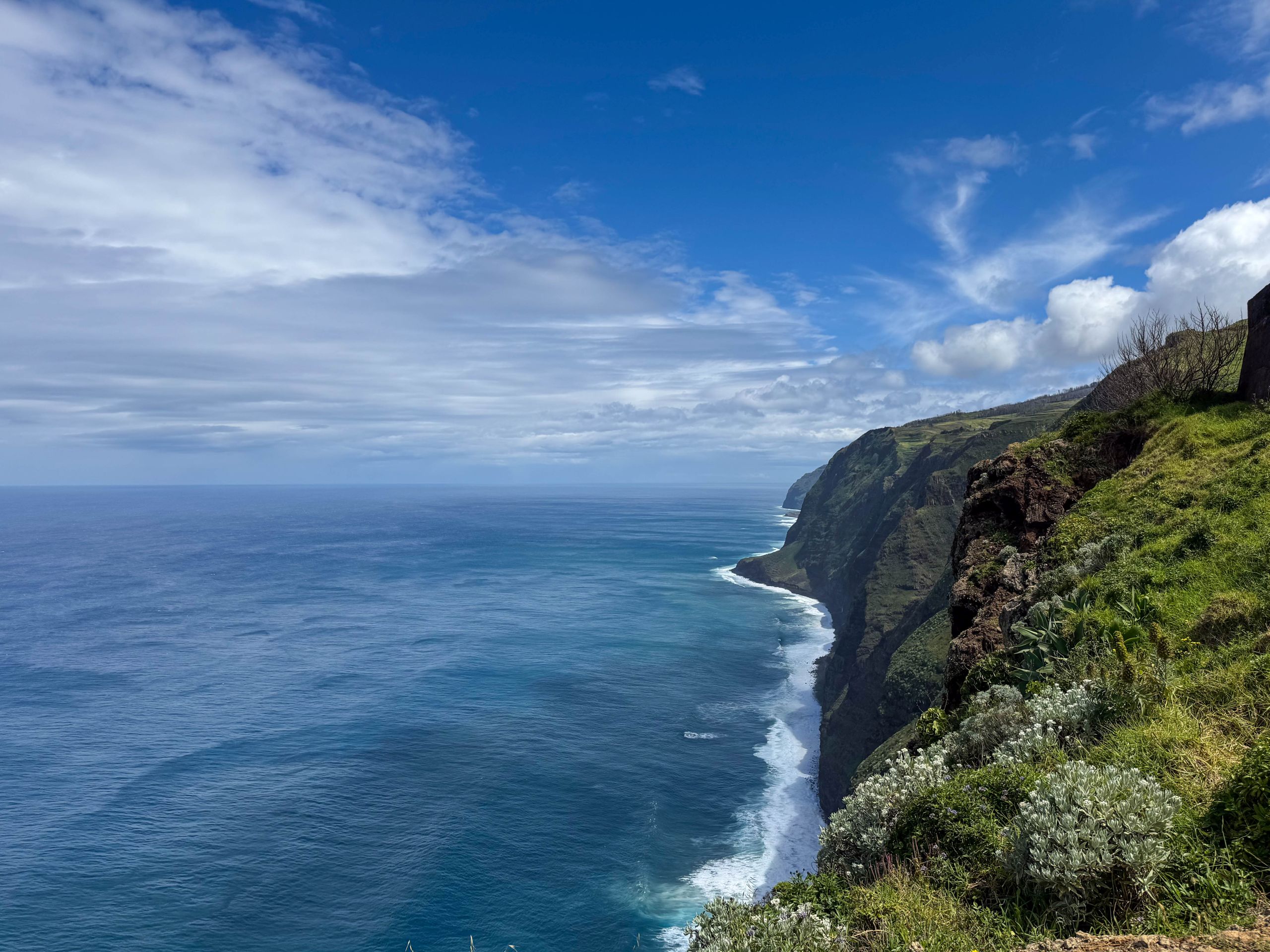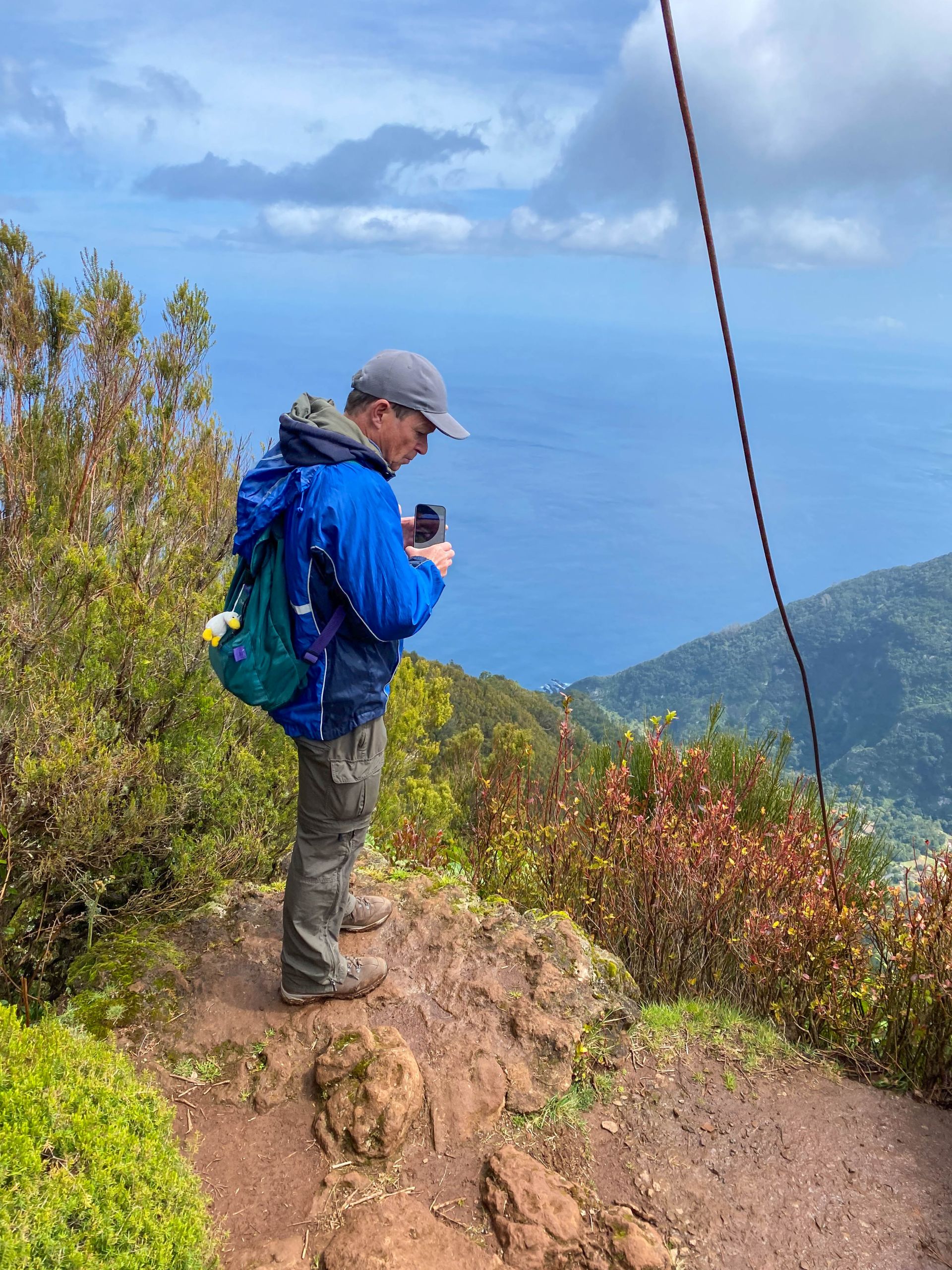 Eine ausgesetzte Etappe am Anfang erfordert dann ein wenig Überwindung meinerseits, aber dann geht’s die 370 Höhenmeter ohne Probleme steil hinunter. Das Ziel, die Felsnase der Ponta do Clérigo, ist aber lohnenswert. Hier hat man einen tollen Ausblick auf den Ort Faial, den Adlerfelsen und auf das Cap São Lourenço. Auf der anderen Seite sieht man die Insel Rocha do Navio.