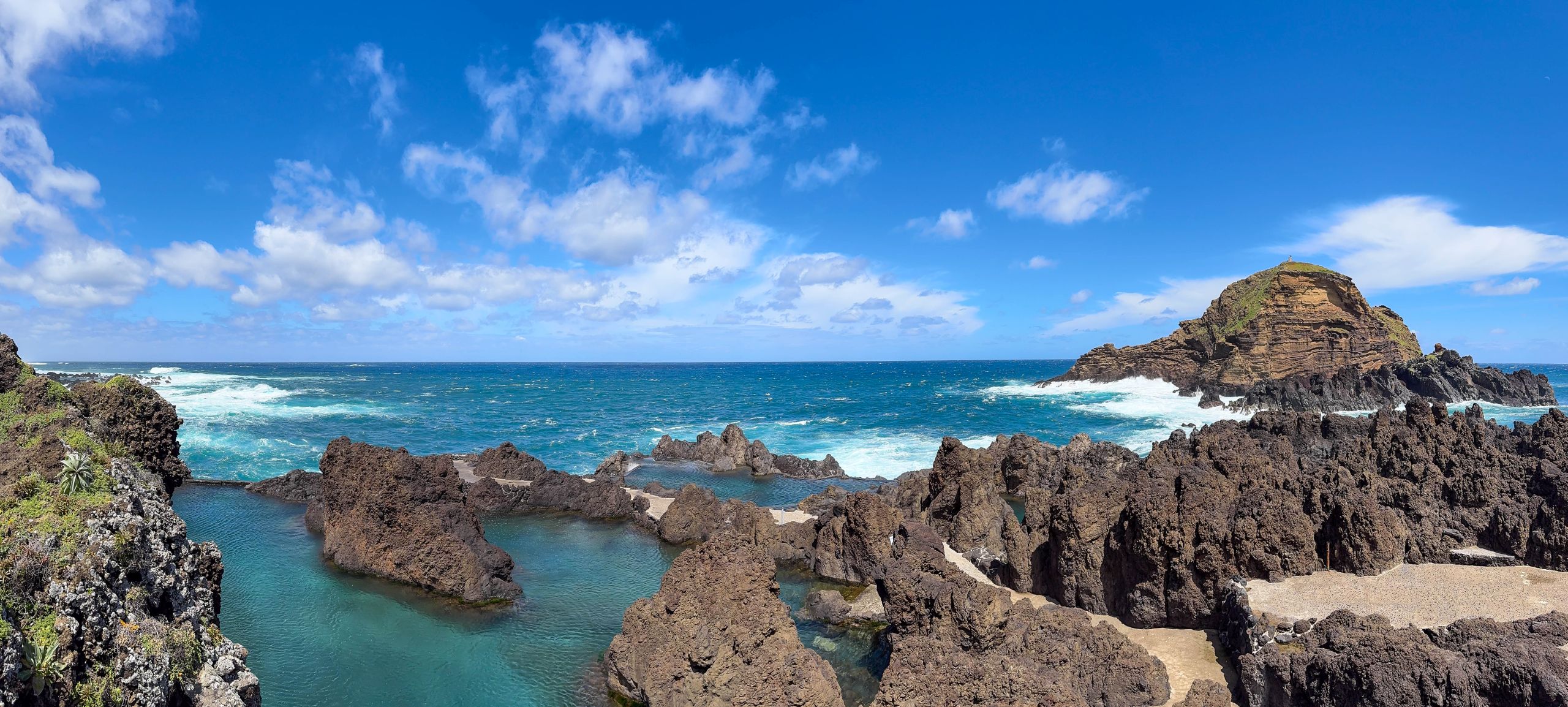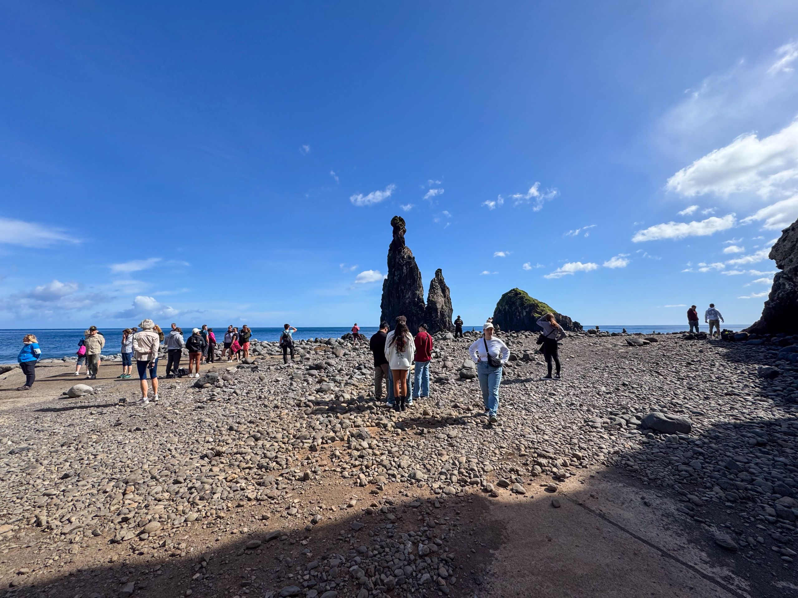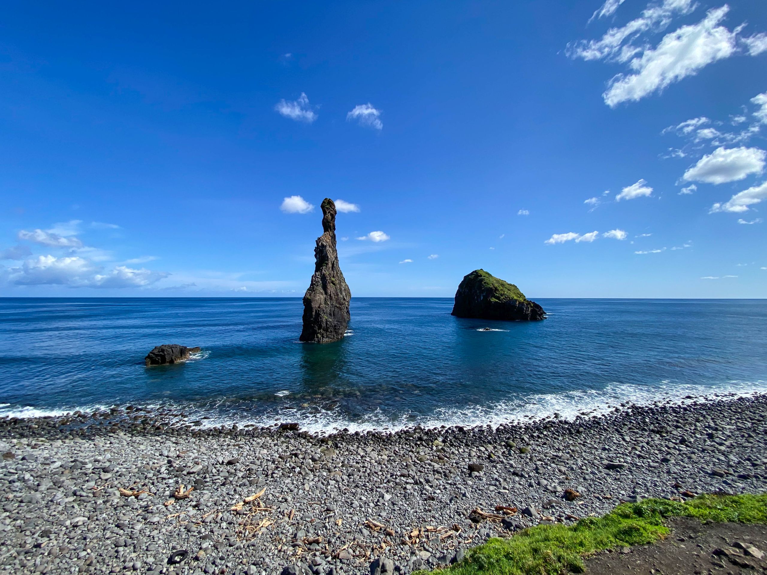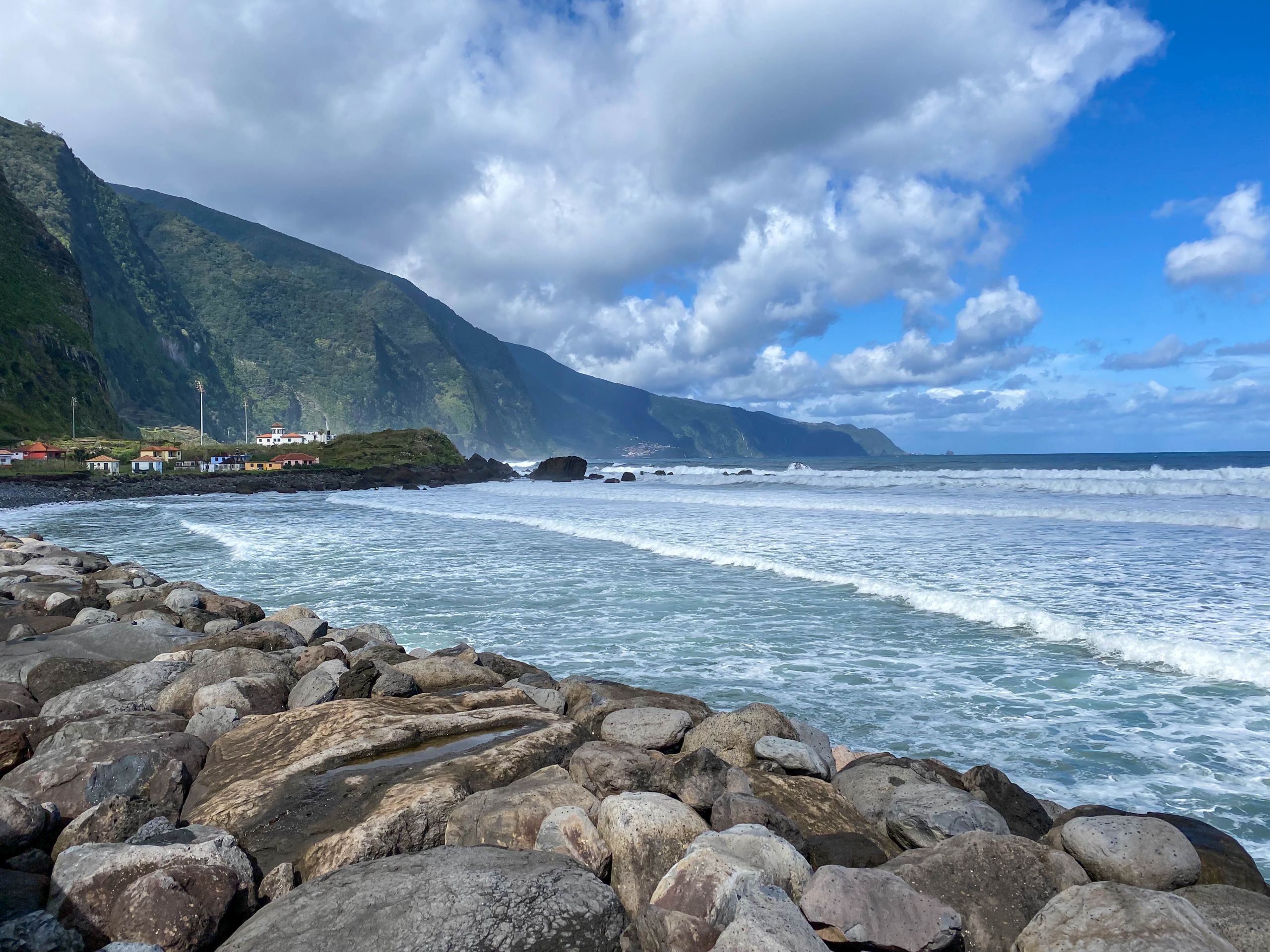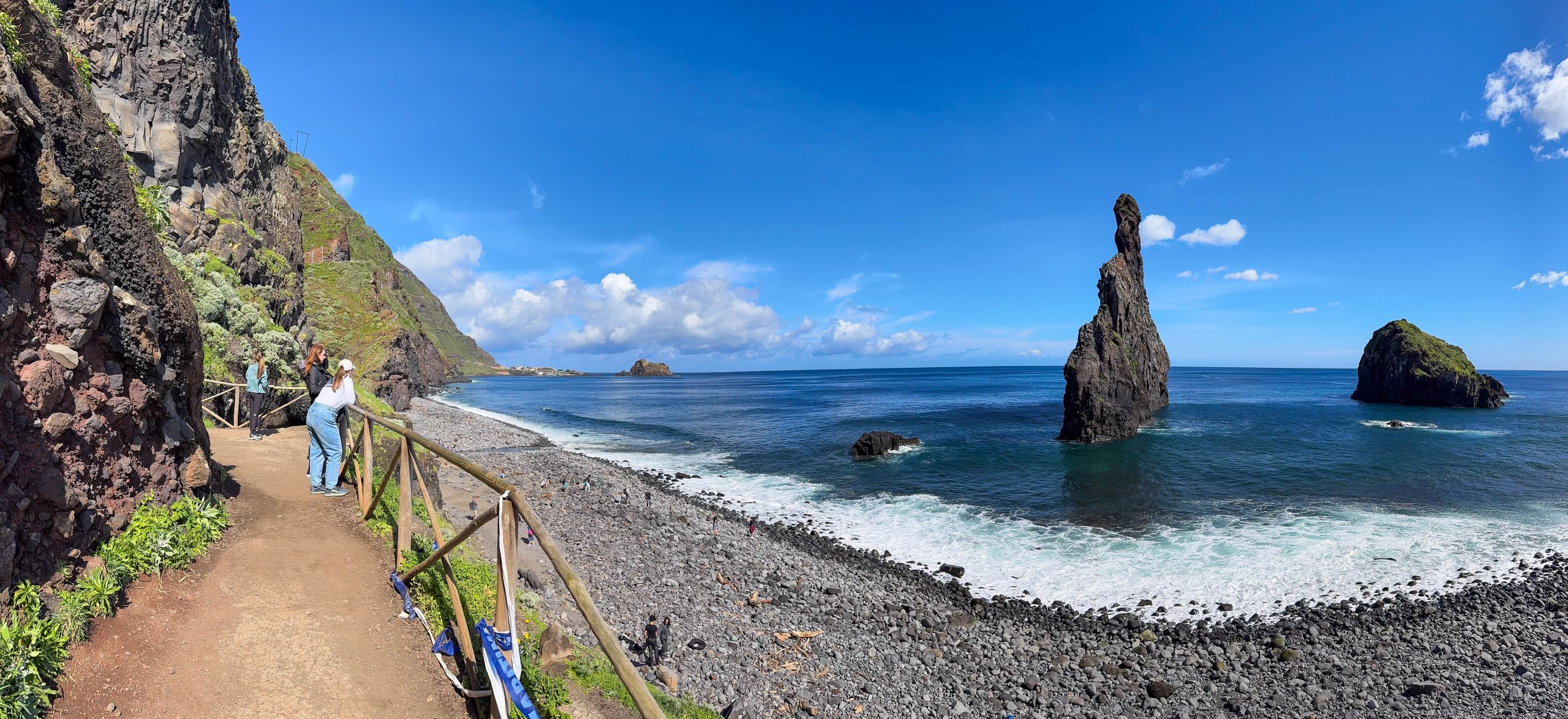 Heute Morgen empfängt uns der Tag tatsächlich das erste Mal mit Temperaturen über 20 Grad laut dem Thermometer im Auto. Allerdings wird für heute ab Mittag wieder Regen gemeldet und aus dem Grund sind wir für unsere Verhältnisse früh auf dem Weg Richtung Westen unterwegs. Wir fahren zuerst kurz an den Strand von Ribeira da Janela. Heute gibt es genug freie Parkplätze und so sehen wir uns die bekannte Felsformation an diesem Strand an und machen die obligatorischen Fotos.