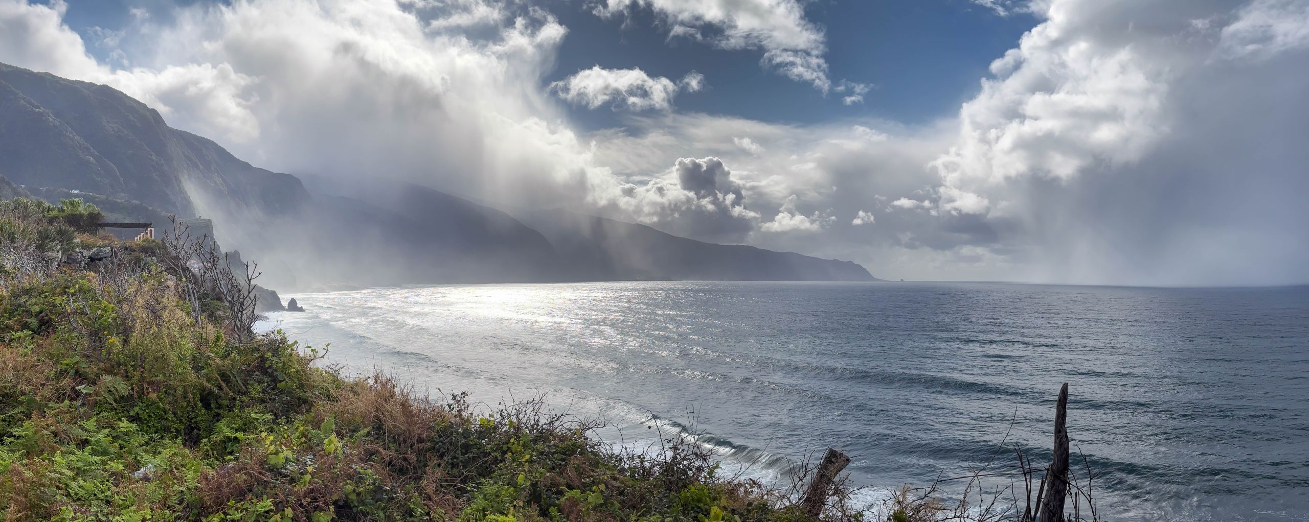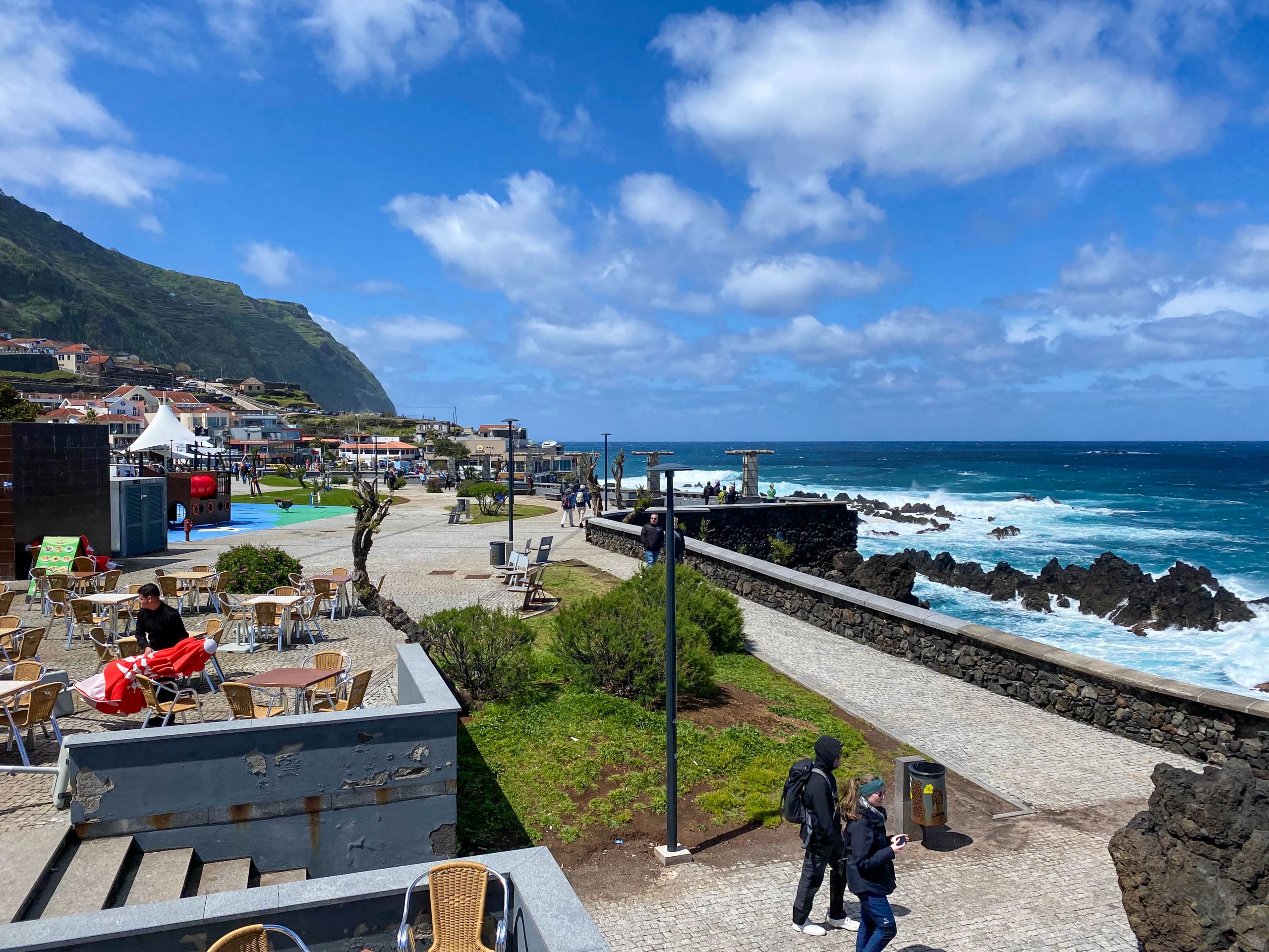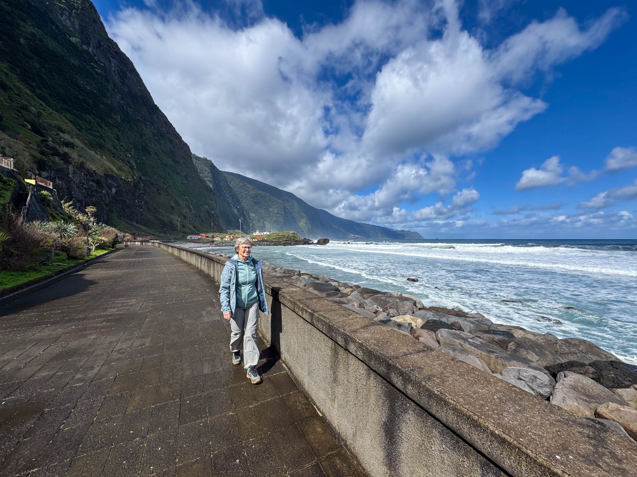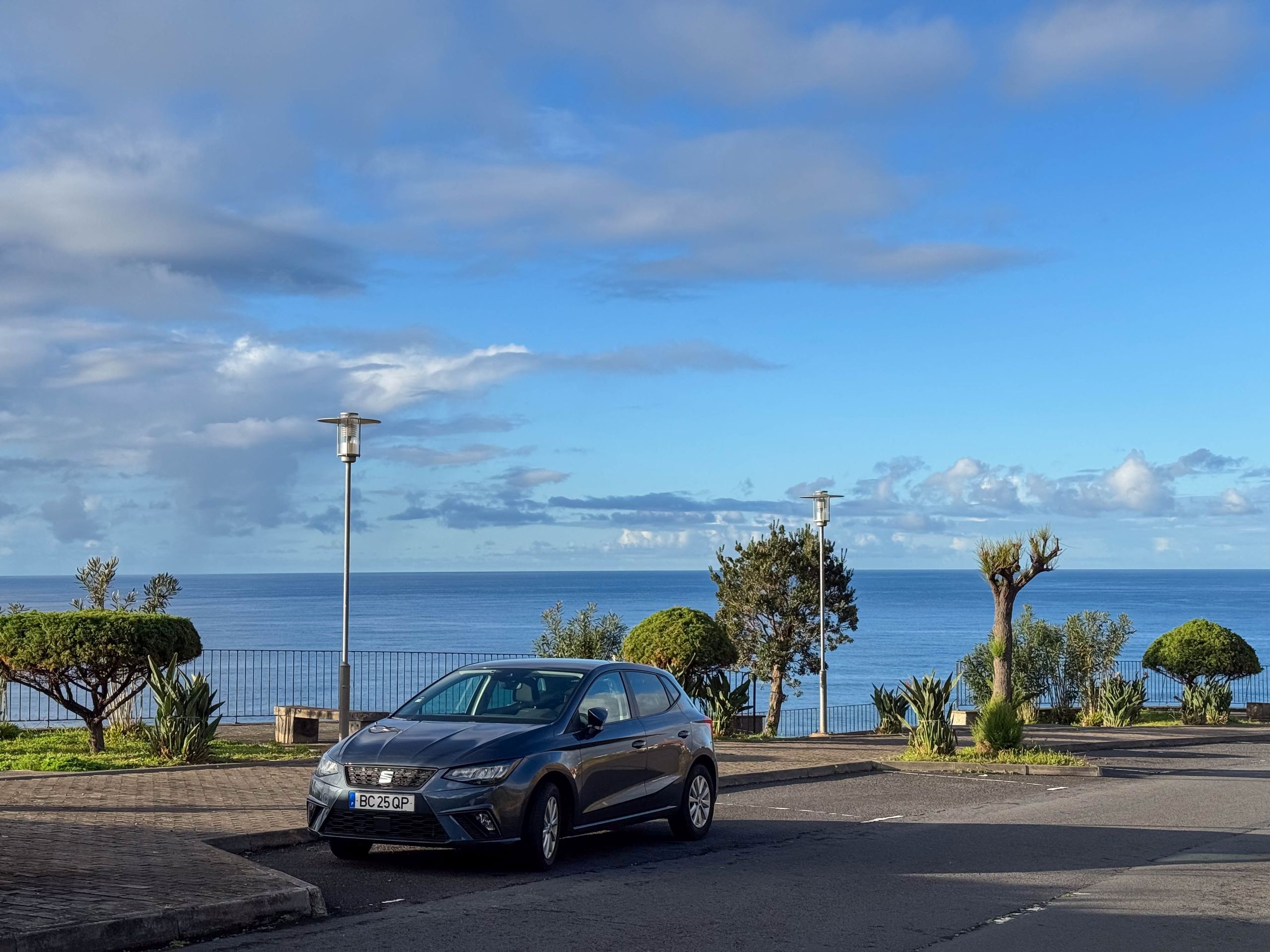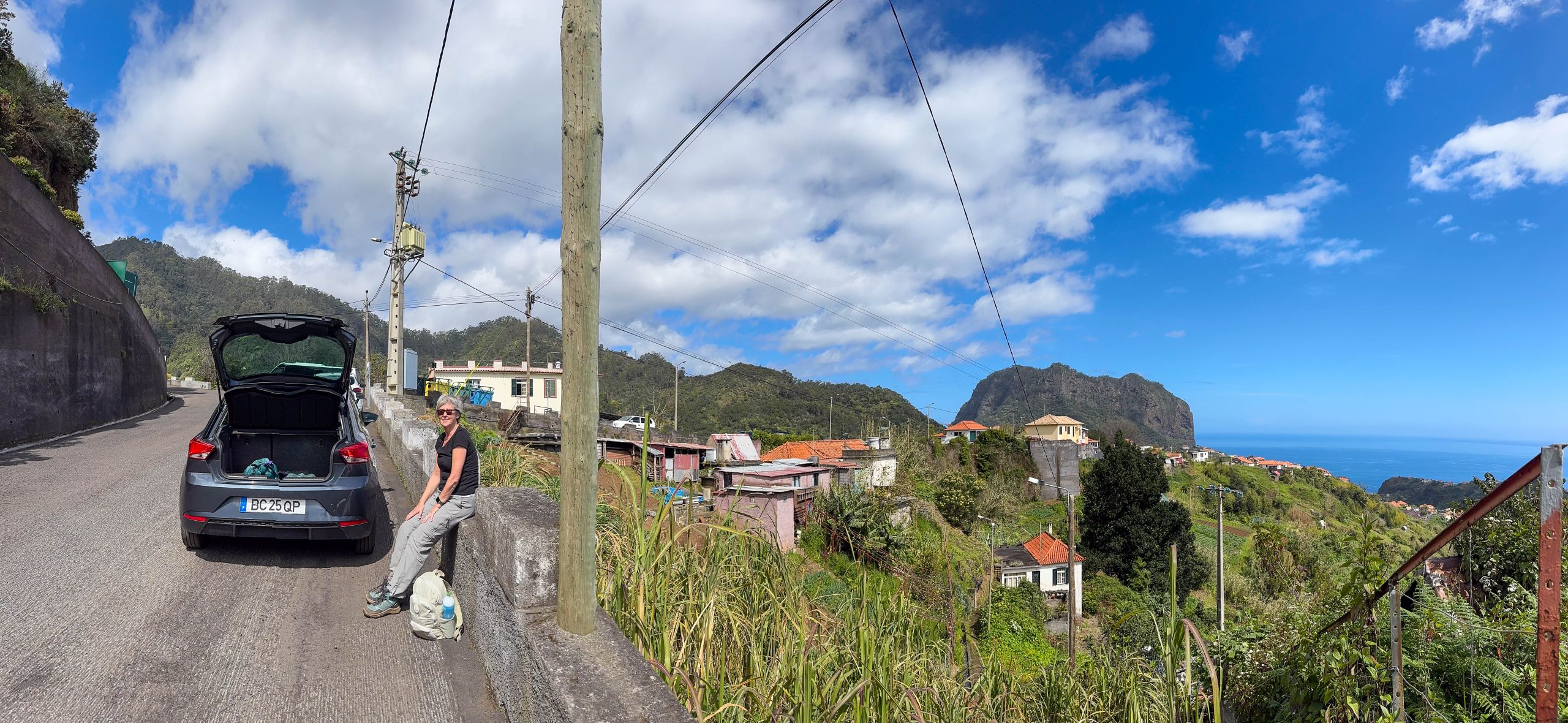 Die Nacht über war es schon ziemlich ungemütlich und auch heute Morgen regnet es regelmäßig. Daher setzen wir uns heute mal in den kleinen Seat und fahren die nördliche Küstenstraße entlang. Einen ersten Stopp machen wir an der Promenade de São Vincente und schauen den tollen Wellen zu.