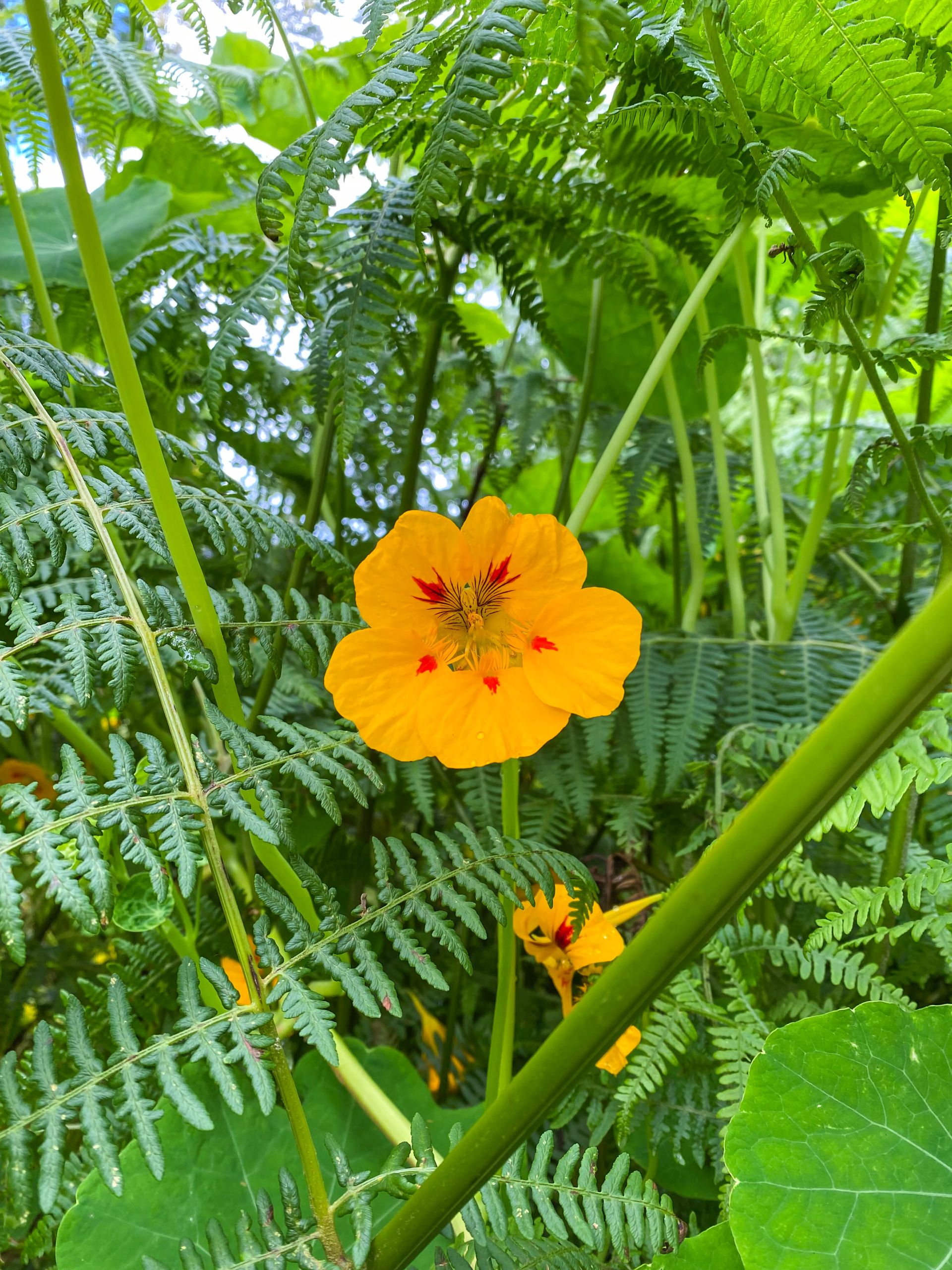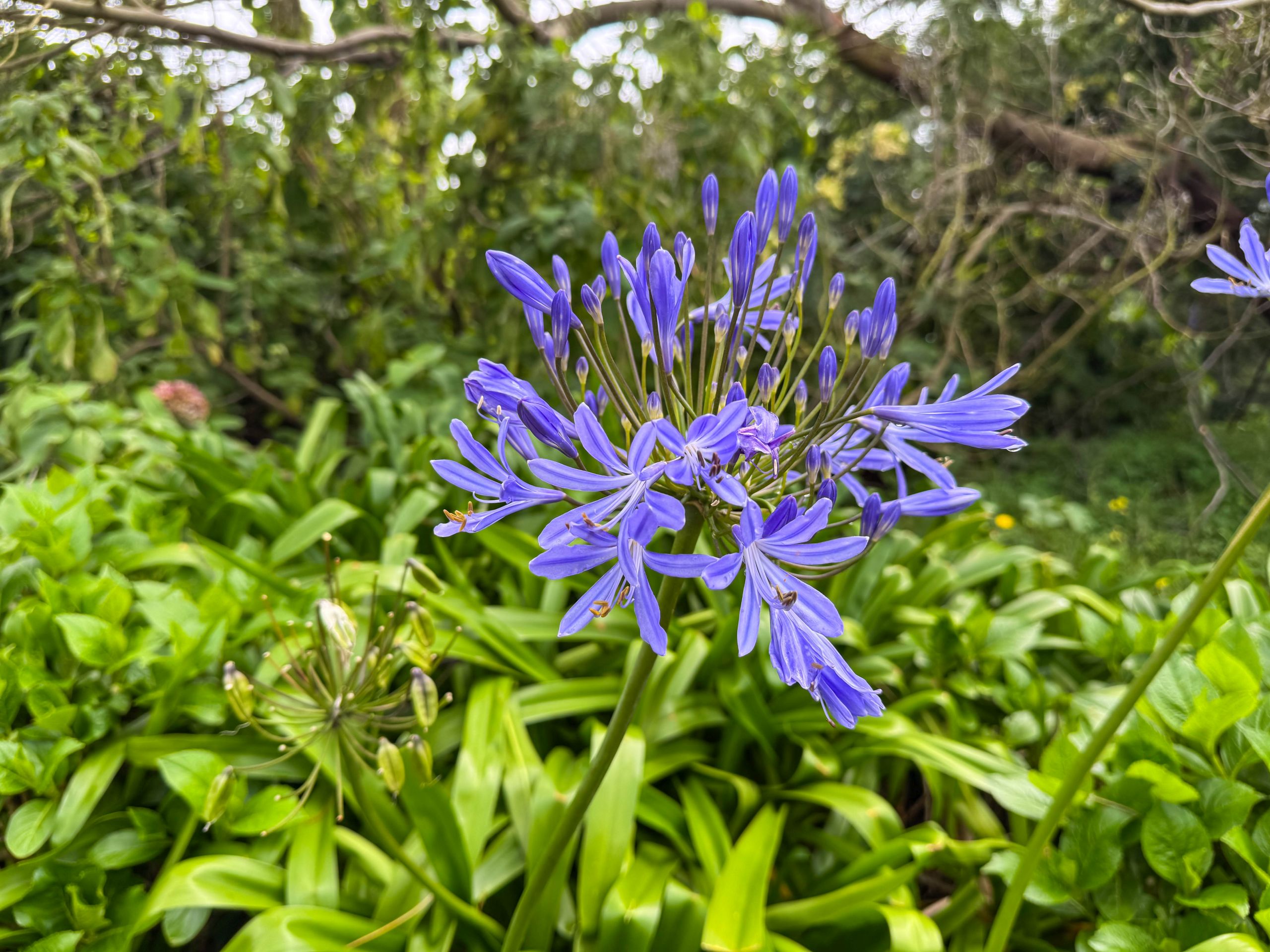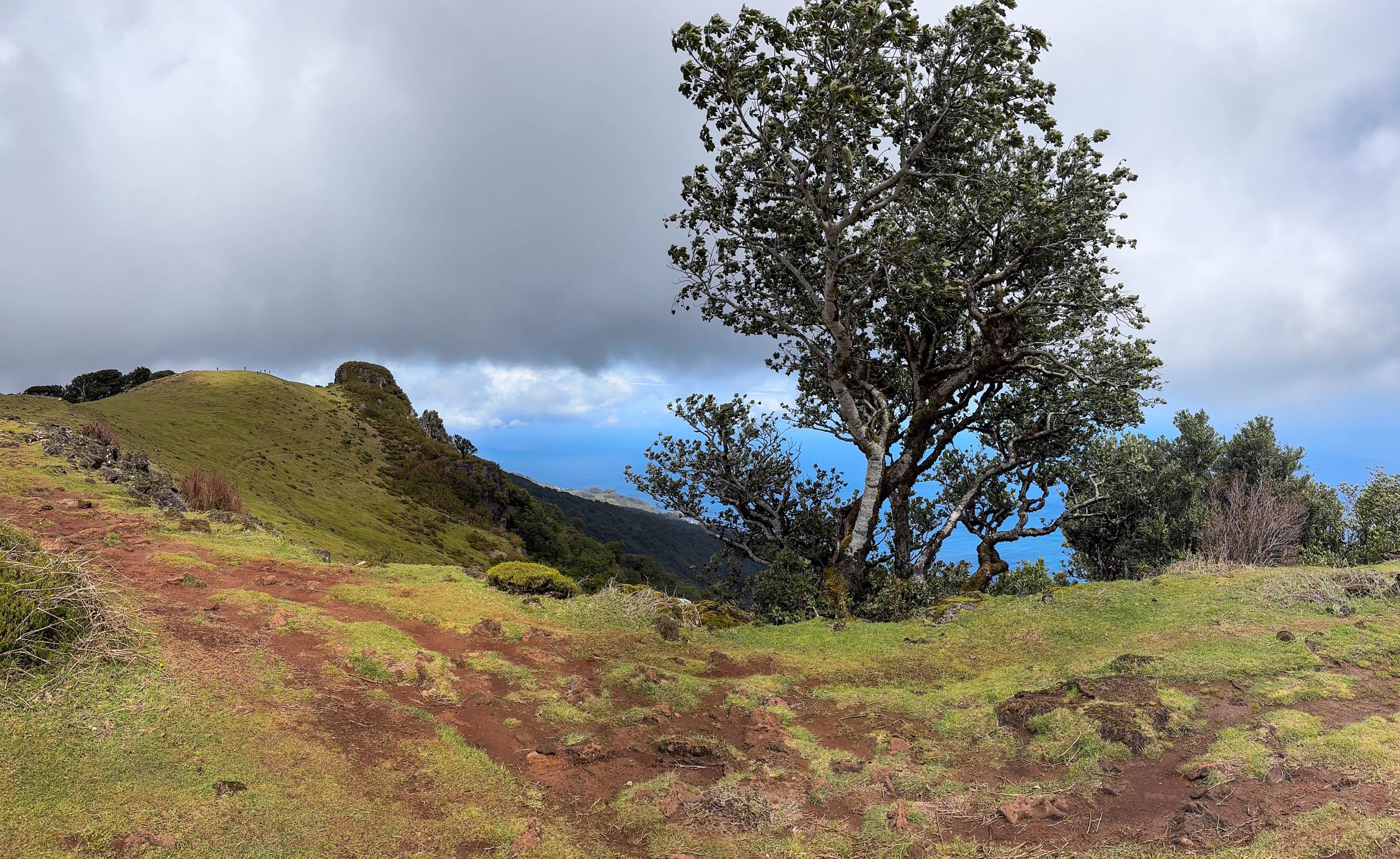 Trotzdem starten wir unsere Wanderung, die über die Hochebene führt und uns bei den teilweise sehr stürmischen Böen und immer wieder einsetzenden Regenschauern einiges abverlangt. Trotz allem ist die Natur hier wunderschön mit den vielen Stinklorbeerbäumen und Farnen. Und ab und zu gibt es auch Aussichten auf die Nordküste.