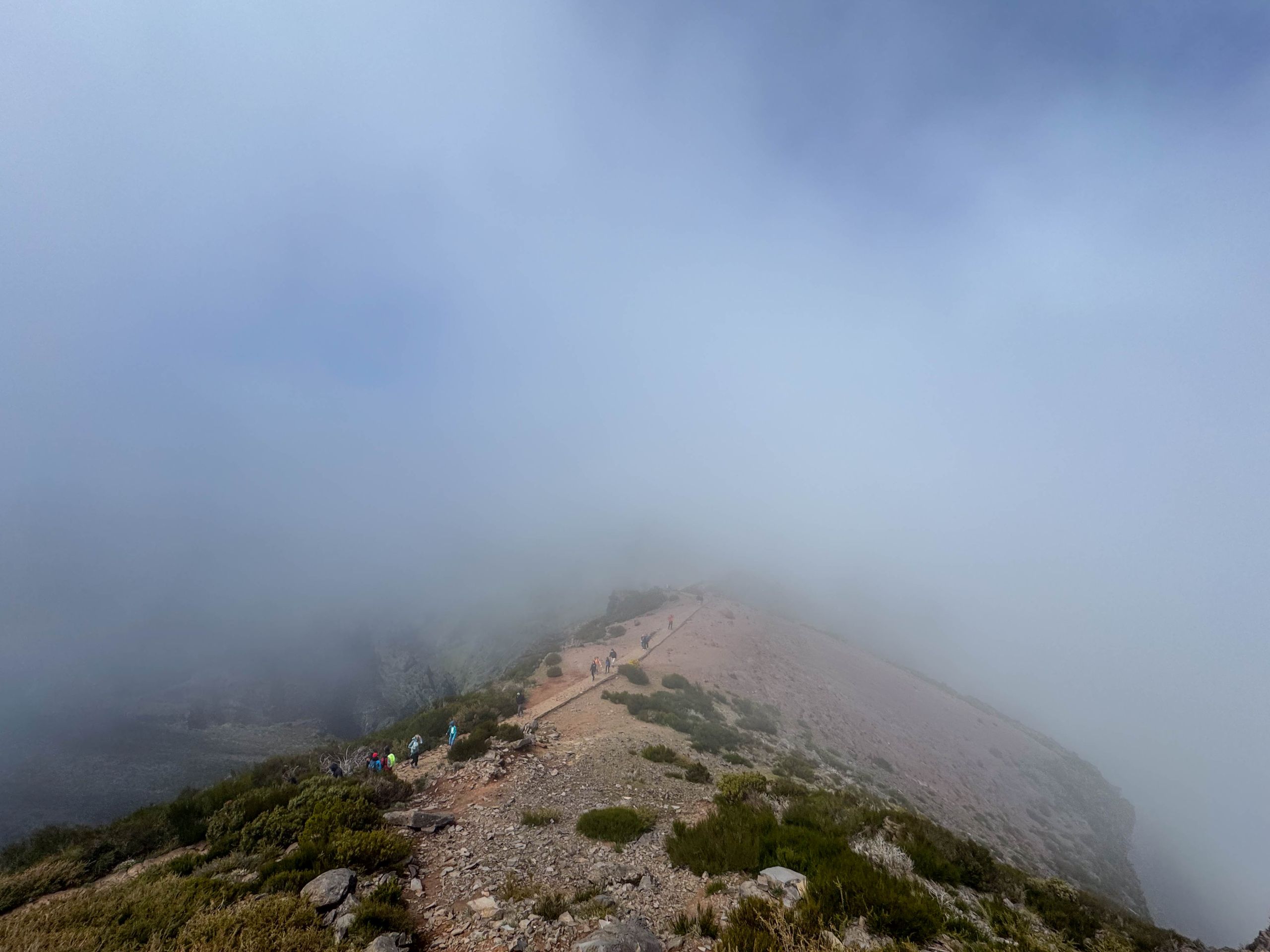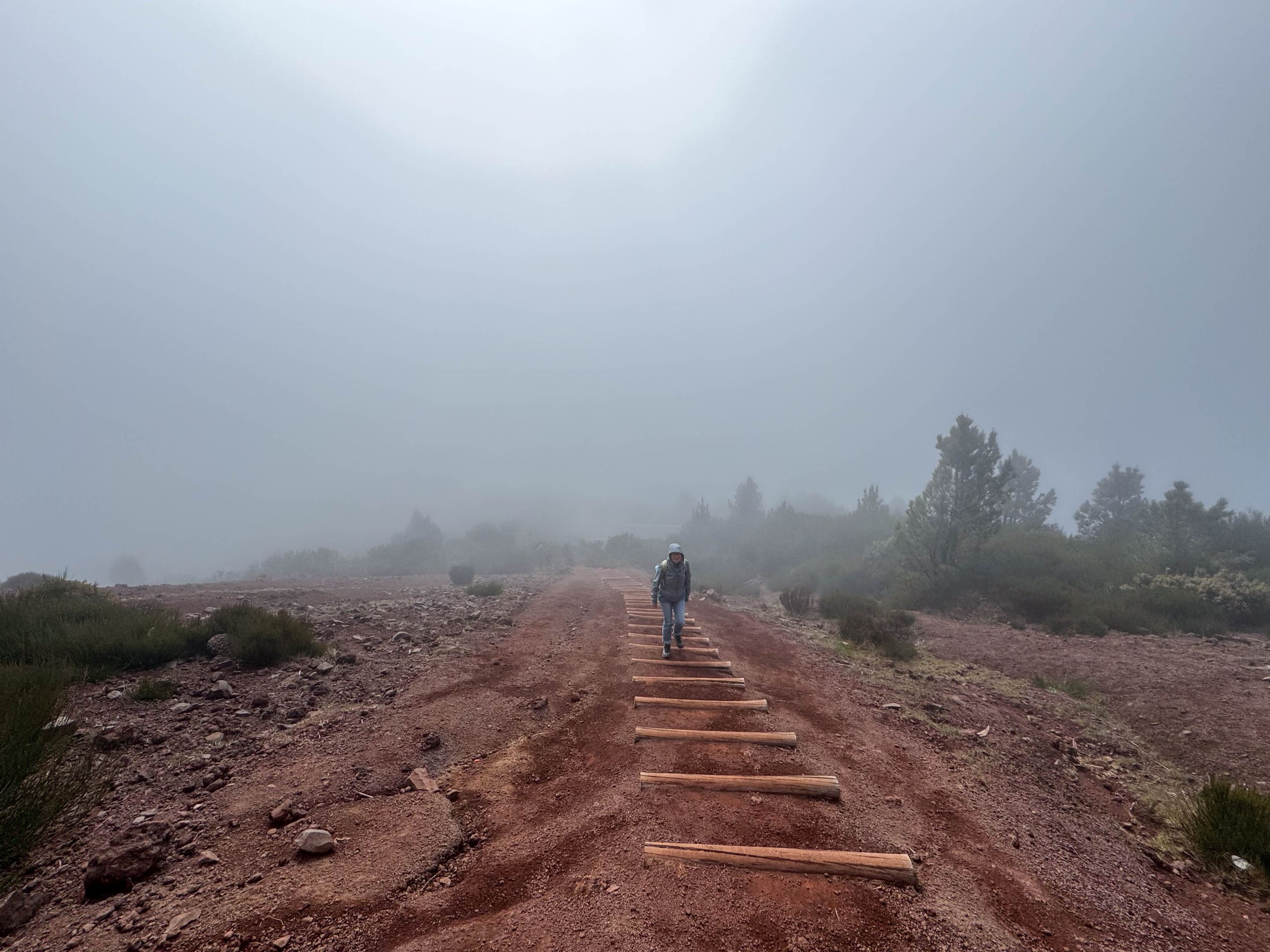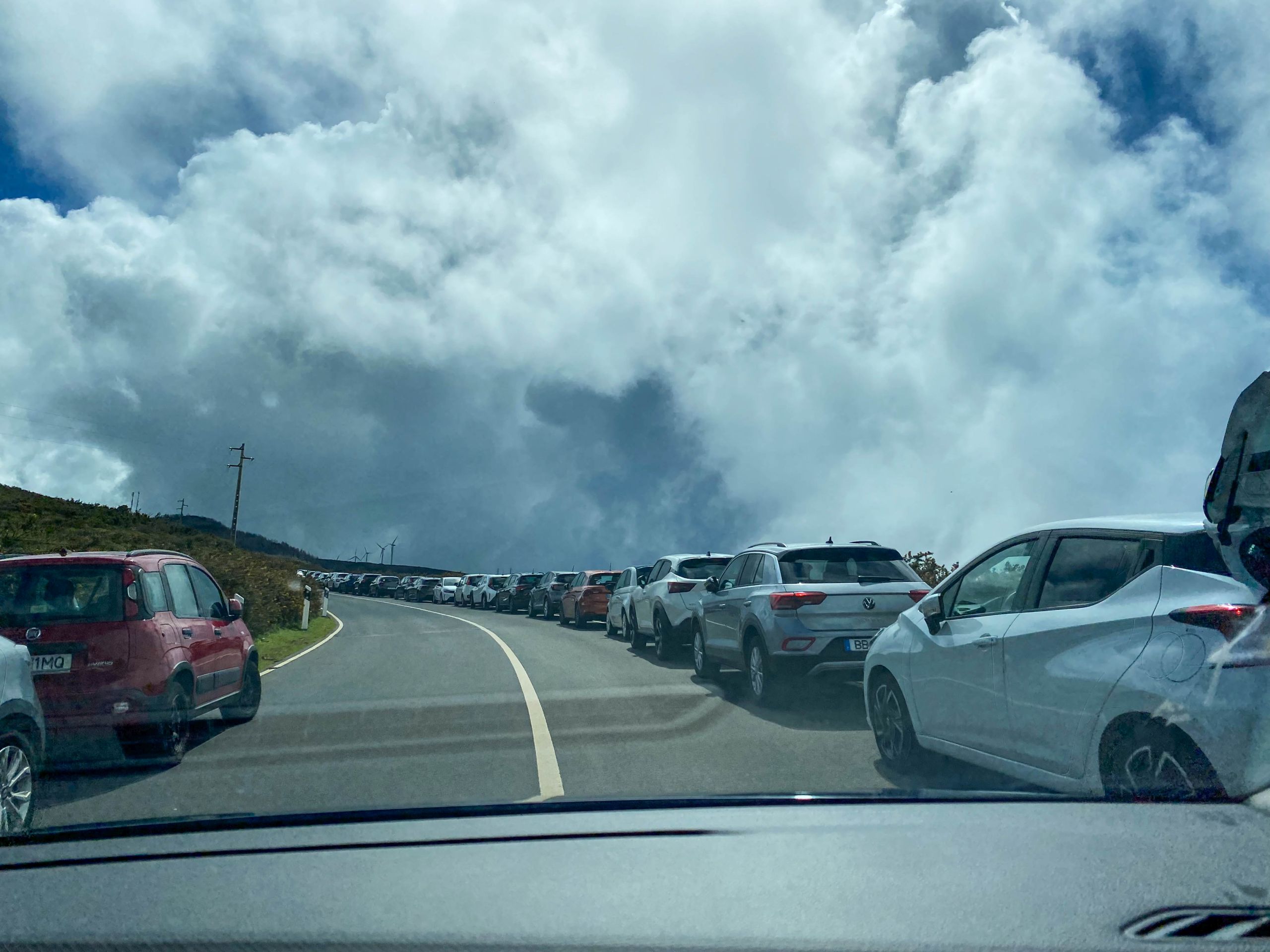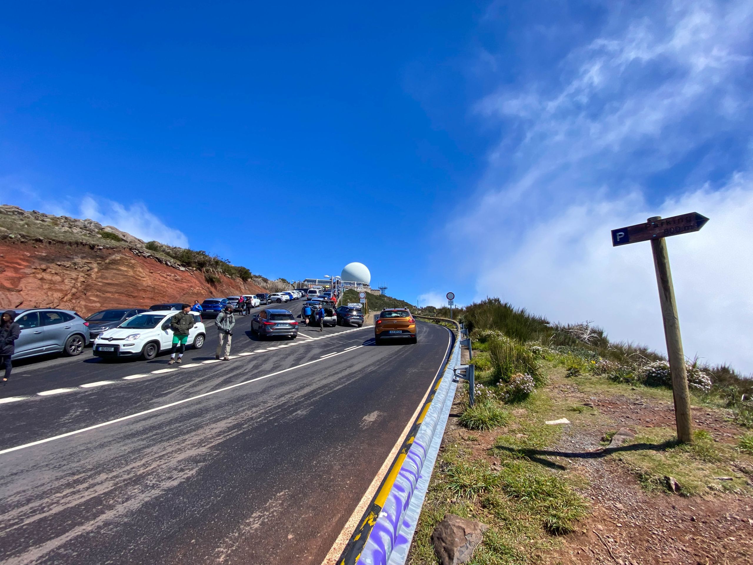 Gegen Mittag beschließen wir noch, zum Pico do Arieiro zu fahren. Als wir nach 40 Minuten Kurverei oben ankommen, ist der obere Parkplatz komplett belegt, aber dafür ist die Sonne da. So fahren wir zu dem etwas tiefer gelegenen Parkplatz und lösen einen Parkschein. Hier liegen die Temperaturen bei 4 Grad und es nieselt, da wir hier mitten in den Wolken stehen.