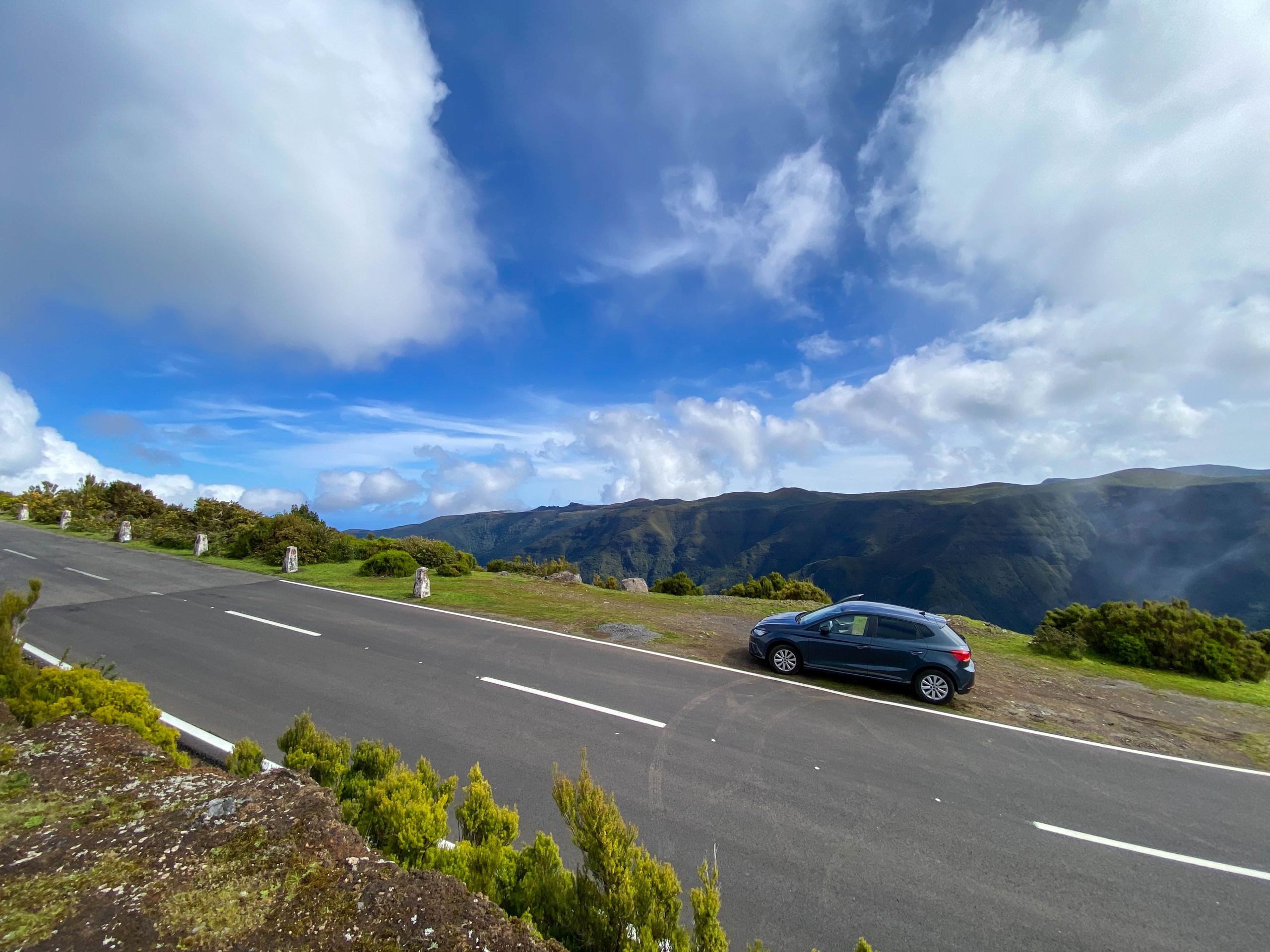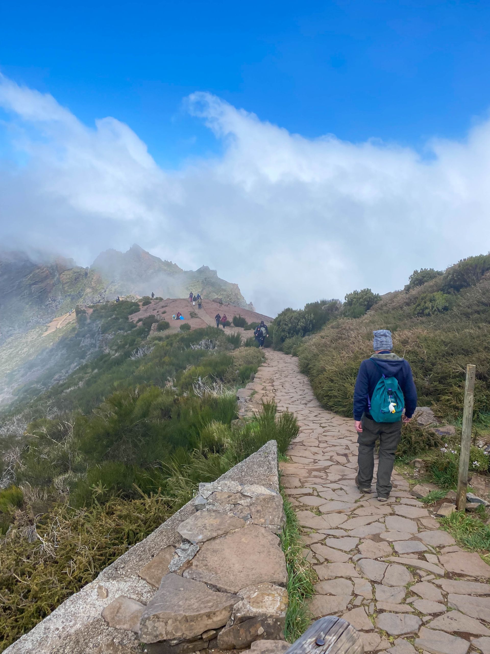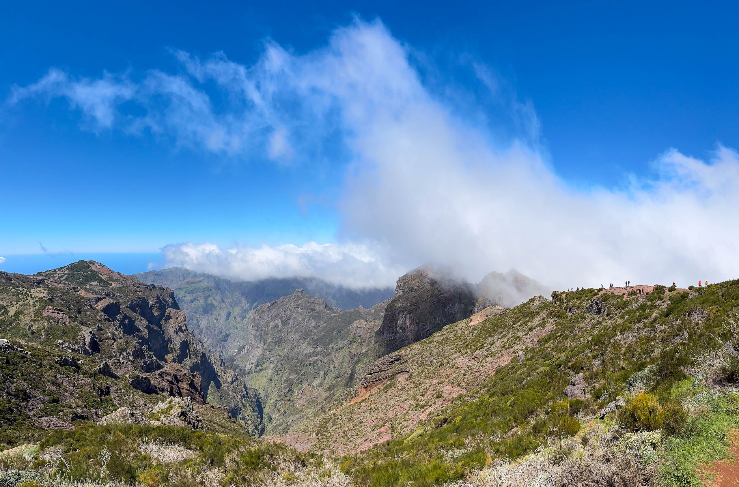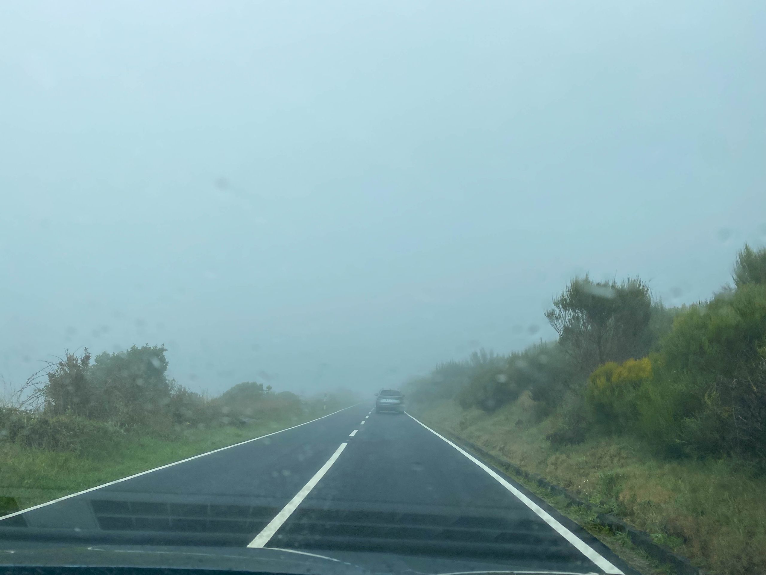 Gegen Mittag beschließen wir noch, zum Pico do Arieiro zu fahren. Als wir nach 40 Minuten Kurverei oben ankommen, ist der obere Parkplatz komplett belegt, aber dafür ist die Sonne da. So fahren wir zu dem etwas tiefer gelegenen Parkplatz und lösen einen Parkschein. Hier liegen die Temperaturen bei 4 Grad und es nieselt, da wir hier mitten in den Wolken stehen.
