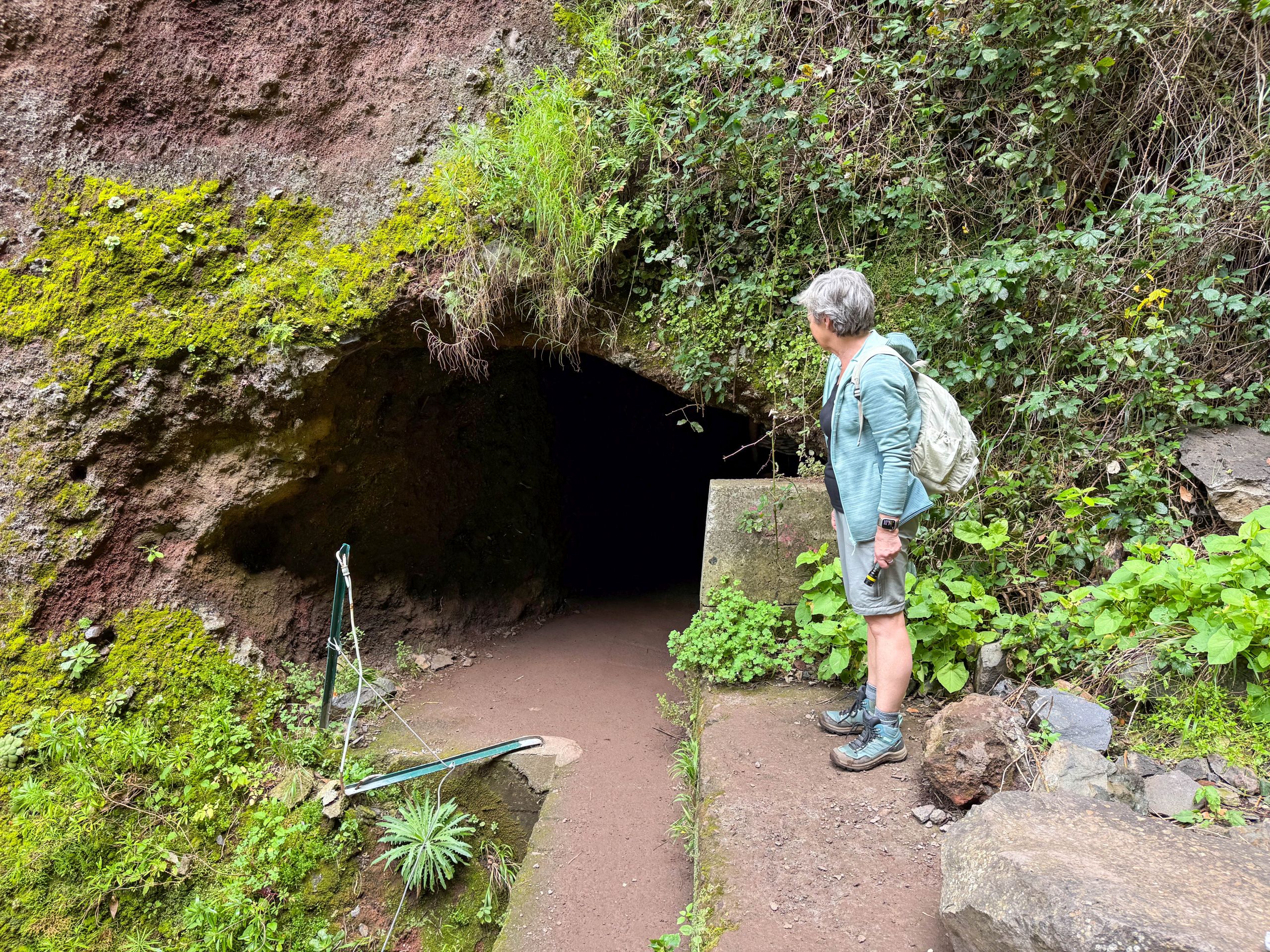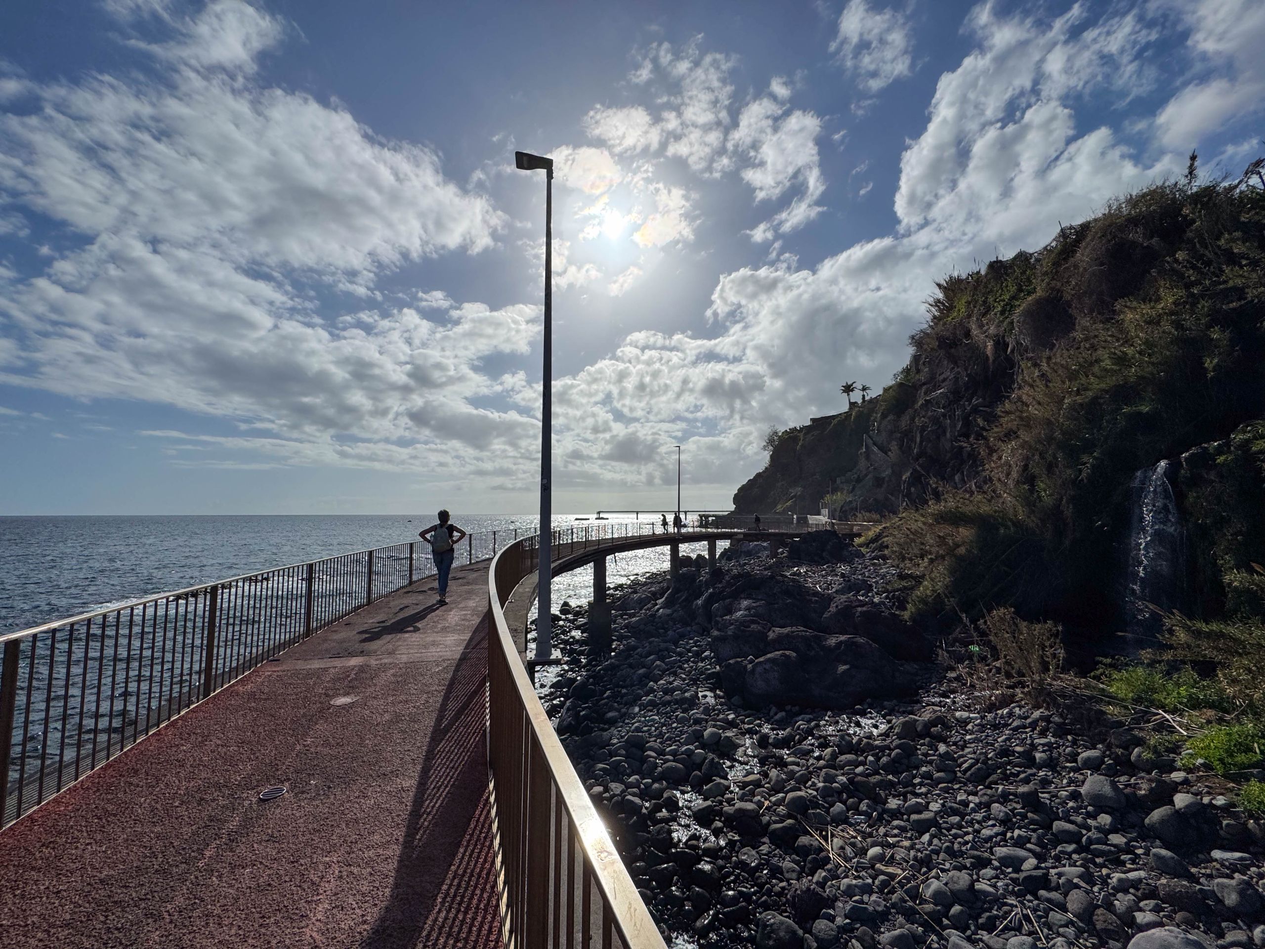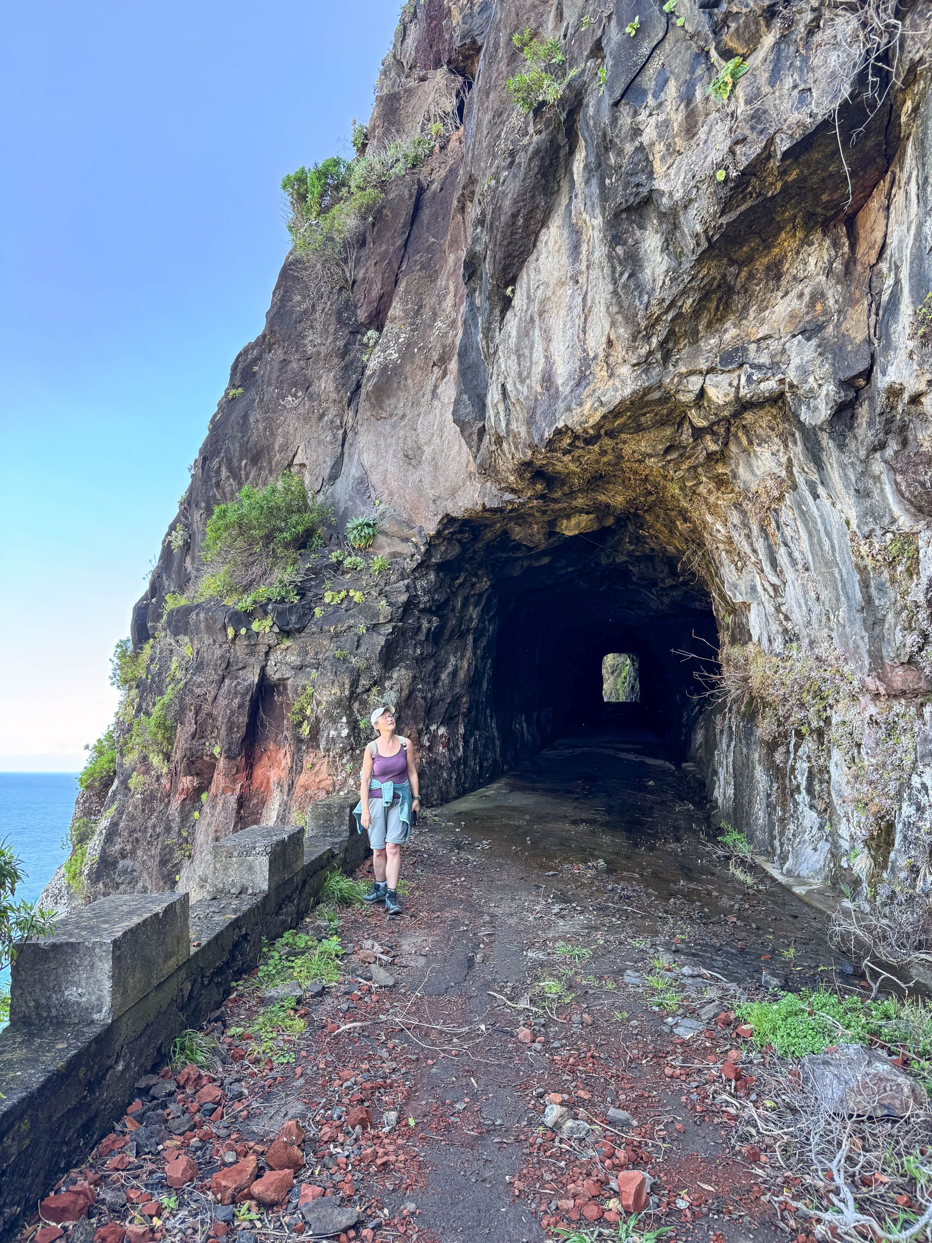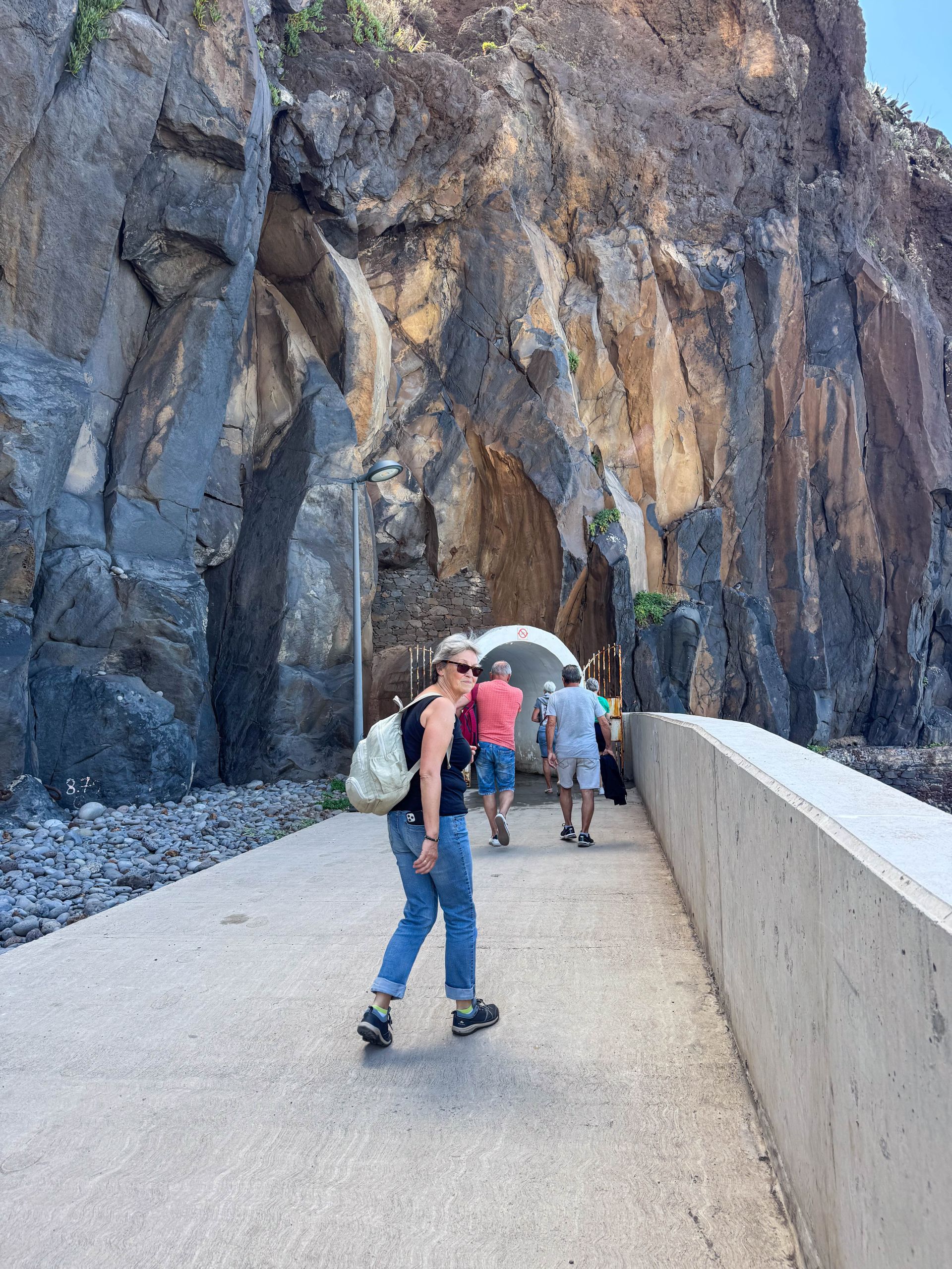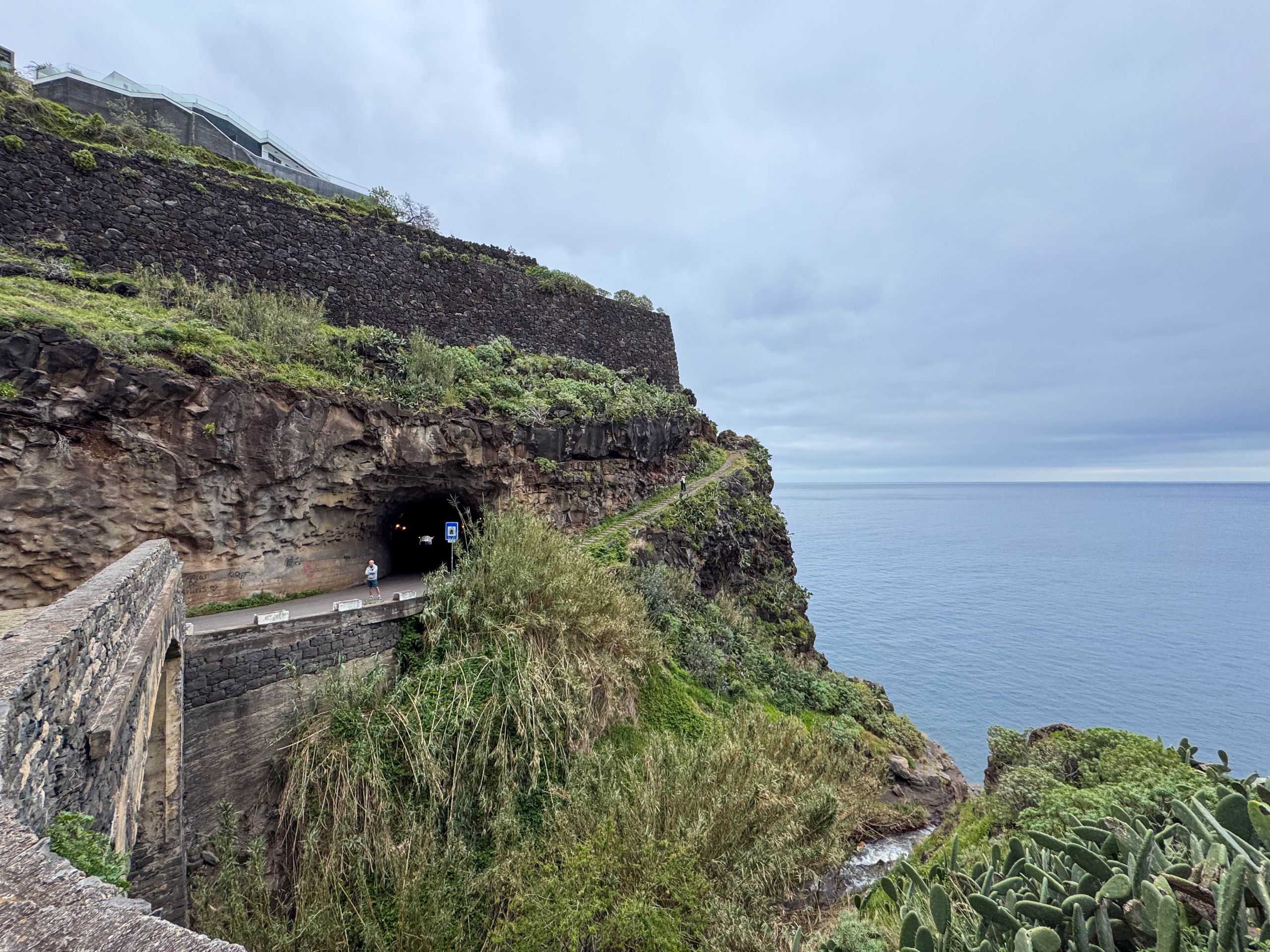 Nach einer vollkommen ruhigen Nacht im breiten, bequemen Bett mit Einzeldecken 😃 machen wir uns nach dem Frühstück zu Fuß auf den Weg nach Funchal. Da der erste Teil des Promenadenweges wegen Bauarbeiten geschlossen ist, machen wir einen Umweg bis zum nächstmöglichen Zugang hinter dem Orcahotel. Von dort spaziert man auf einem breiten Weg bis Funchal. Dabei geht es auch einmal durch einen beleuchteten Tunnel, Doca do Cavacas, in der Mitte mit Blick auf eine Grotte.